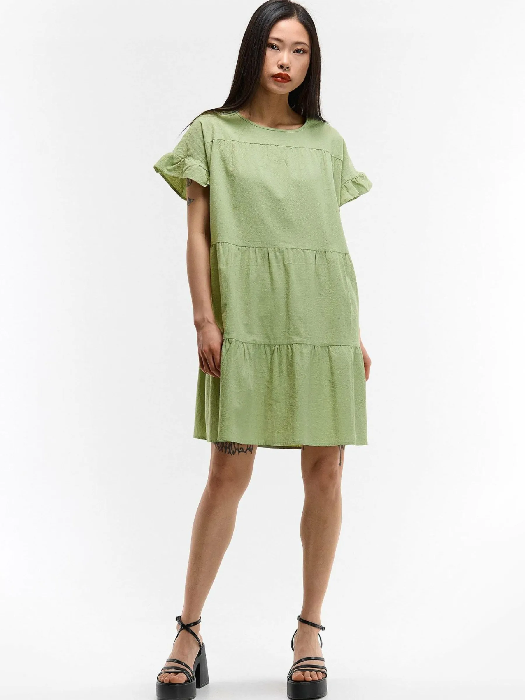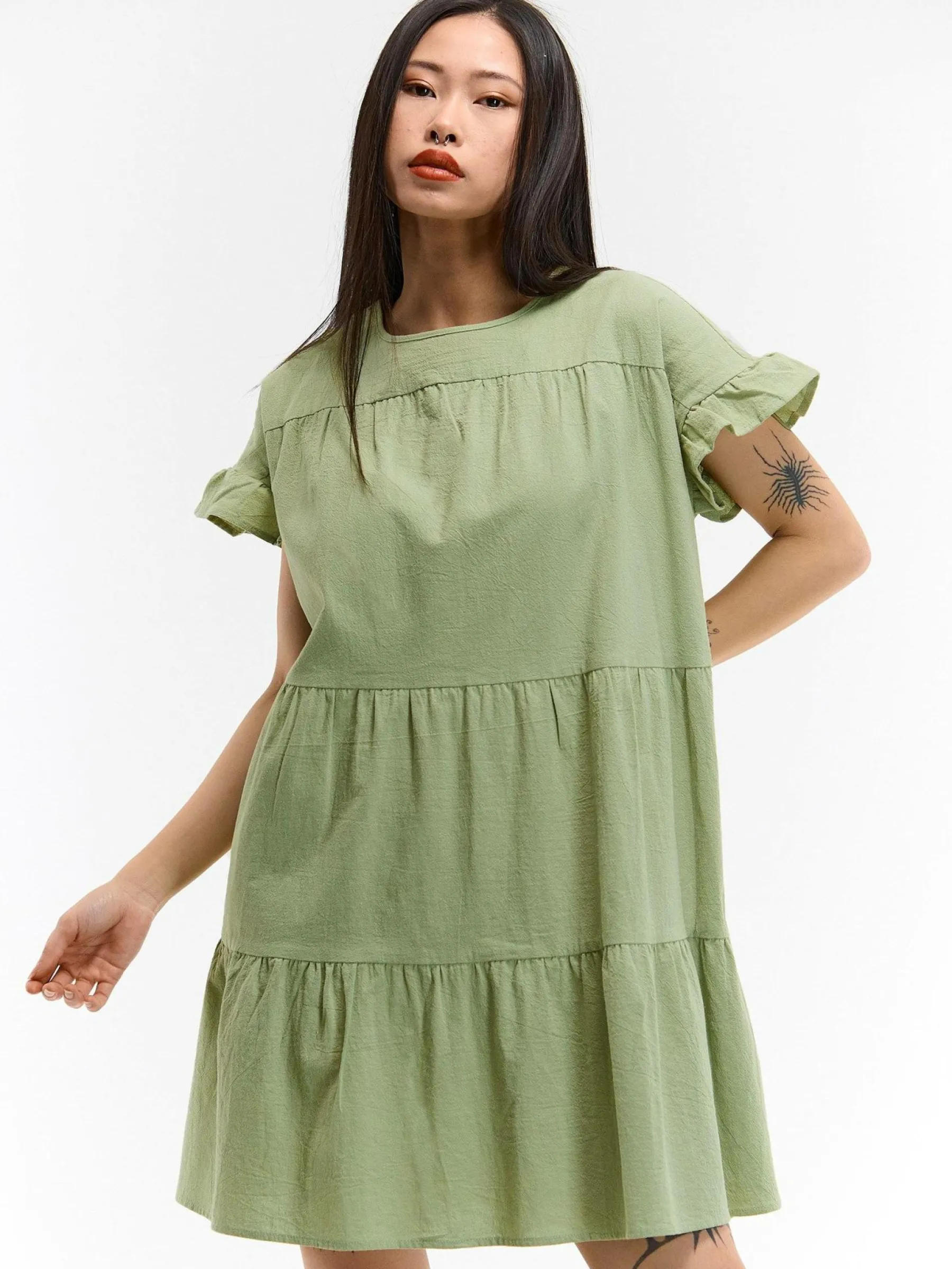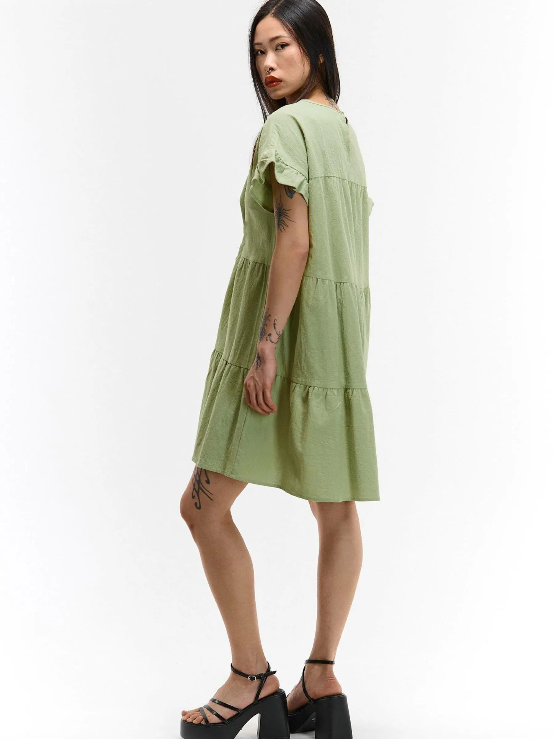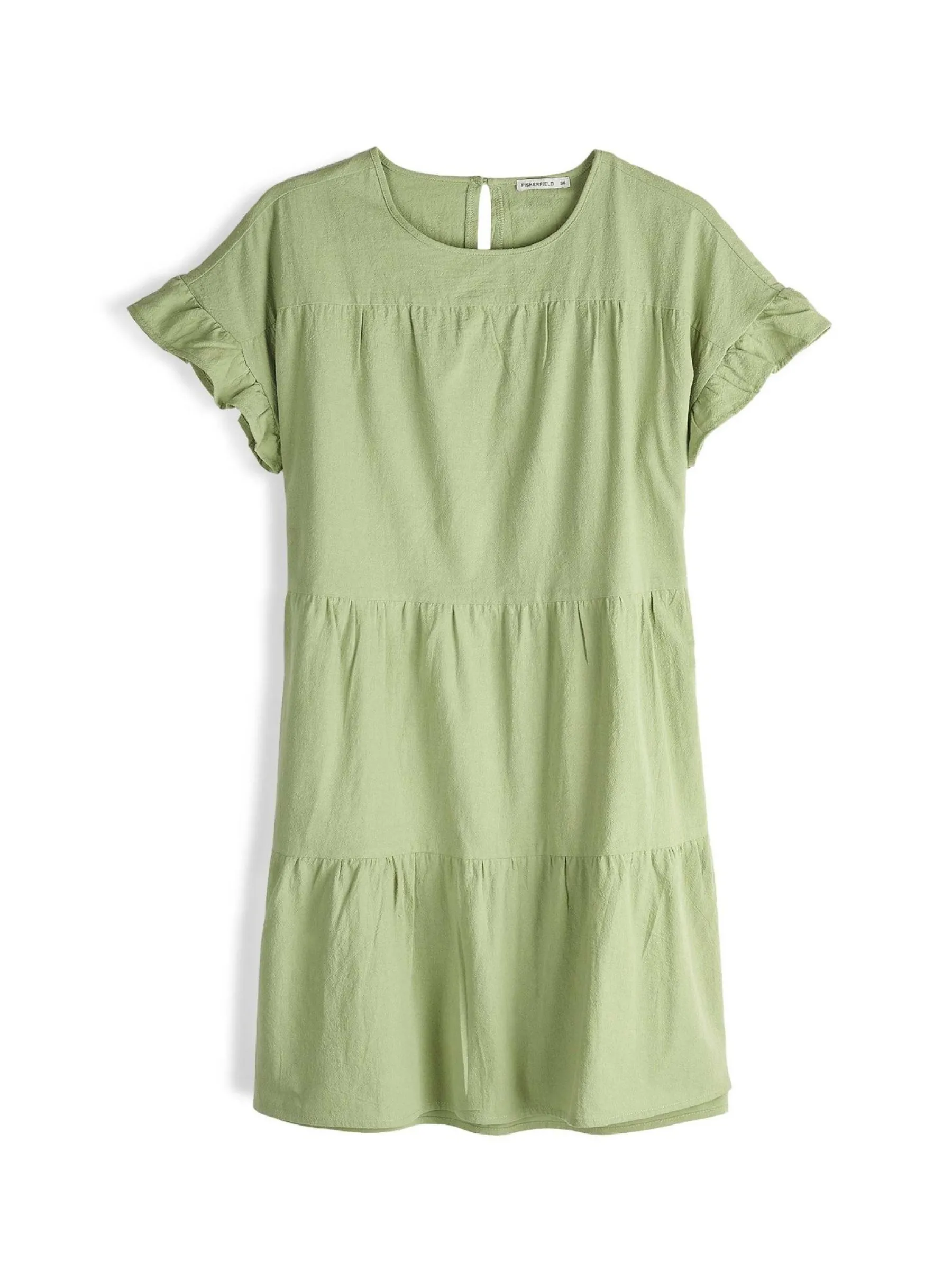 Kolor: zielonyKrój: z falbanąTyp: sukienkaRekaw: krótki rękawDługość: miniPattern style: pojedynczy kolorDetal: n…