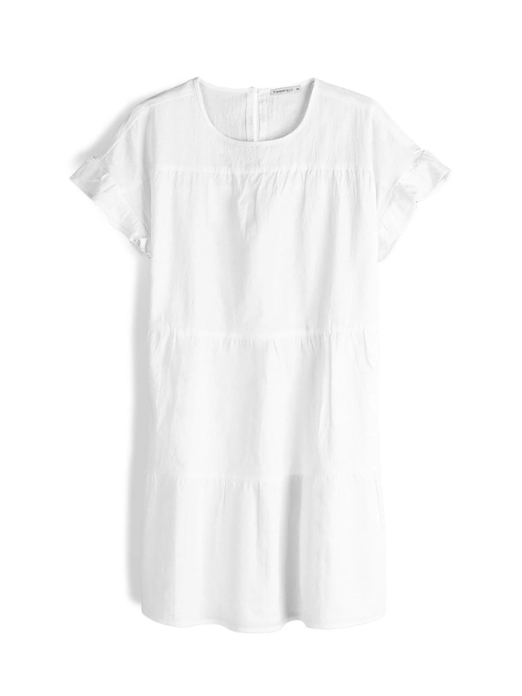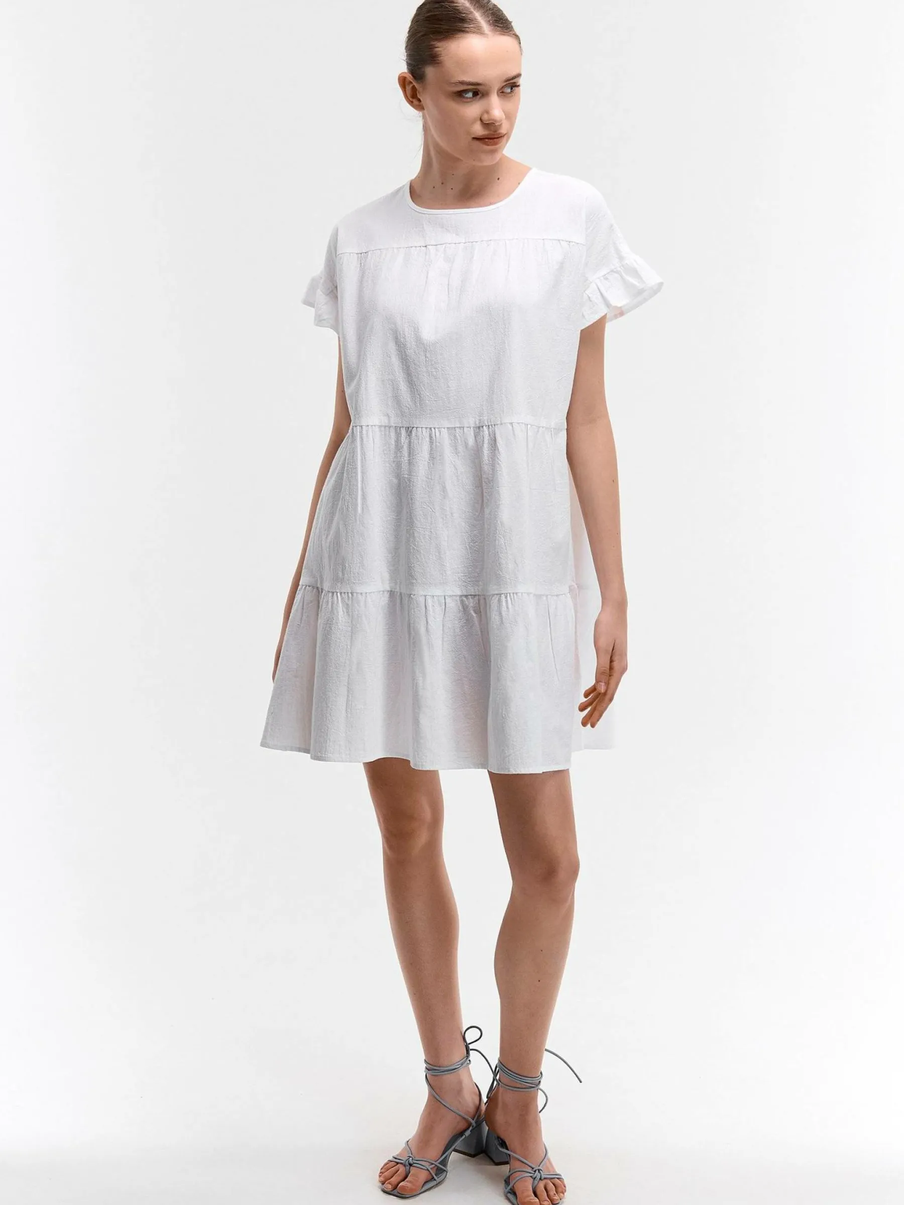 Kolor: białyKrój: z falbanąTyp: sukienkaRekaw: krótki rękawDługość: miniPattern style: pojedynczy kolorDetal: na…