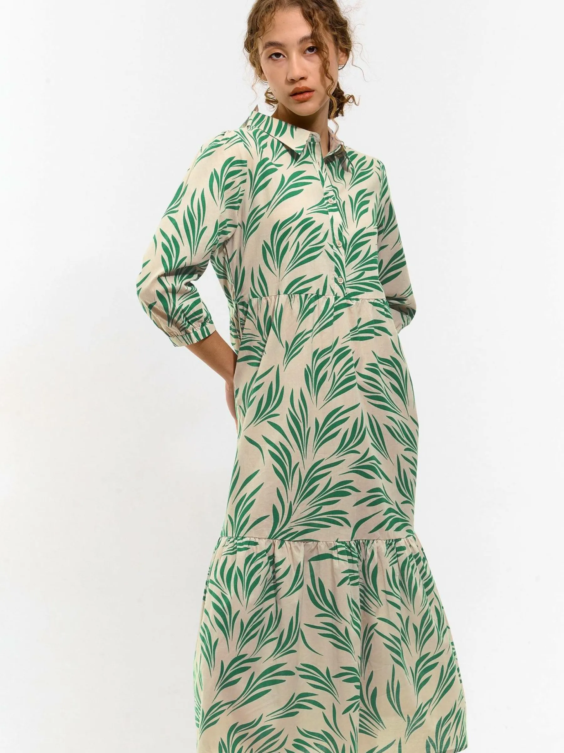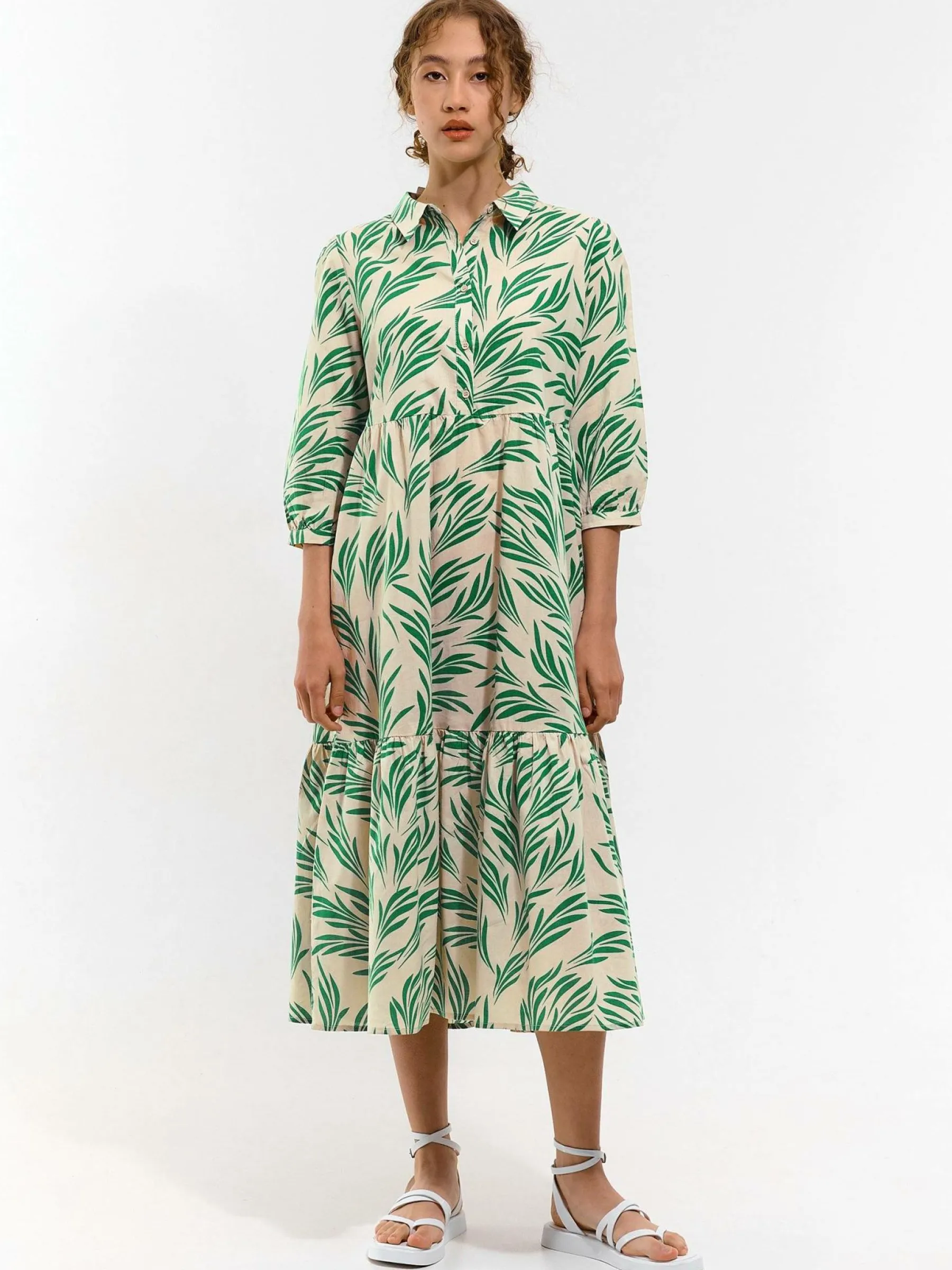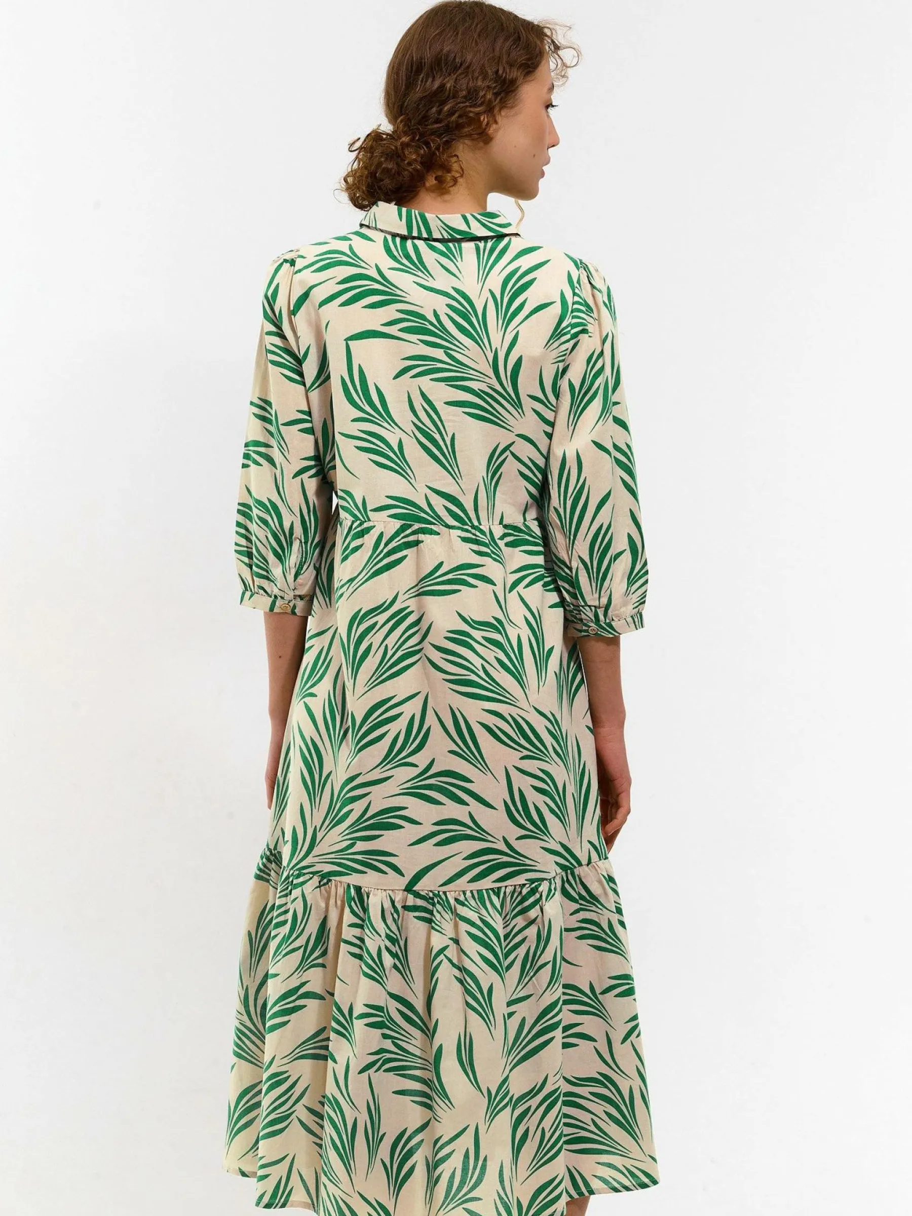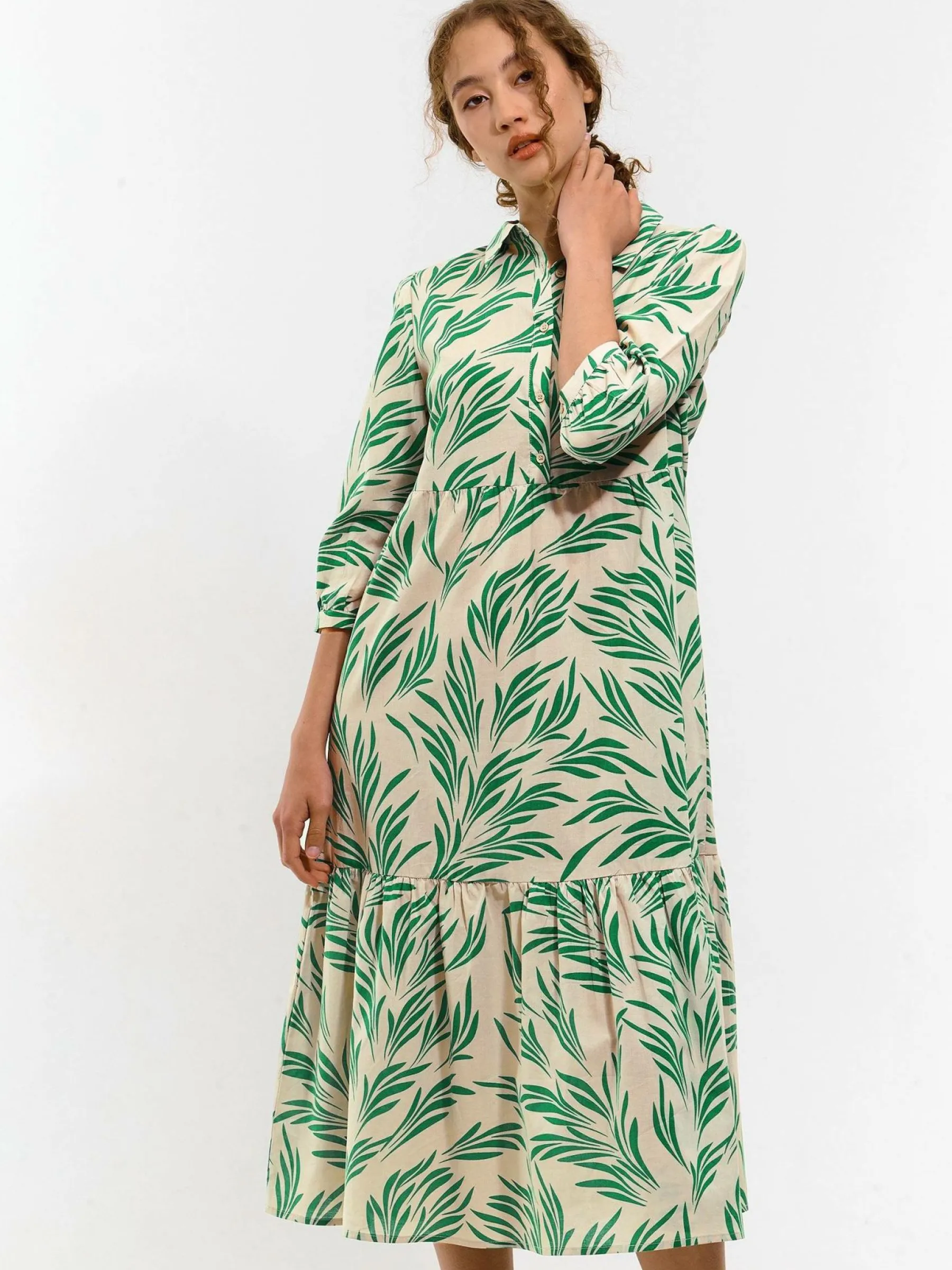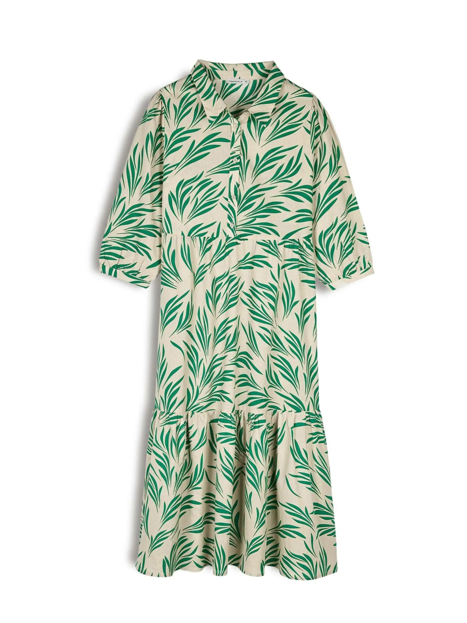 Kolor: beżowyKrój: koszulowe, z falbanąTyp: sukienkaRekaw: rękaw 3/4Długość: midiPattern style: z nadrukiemDetal:…
