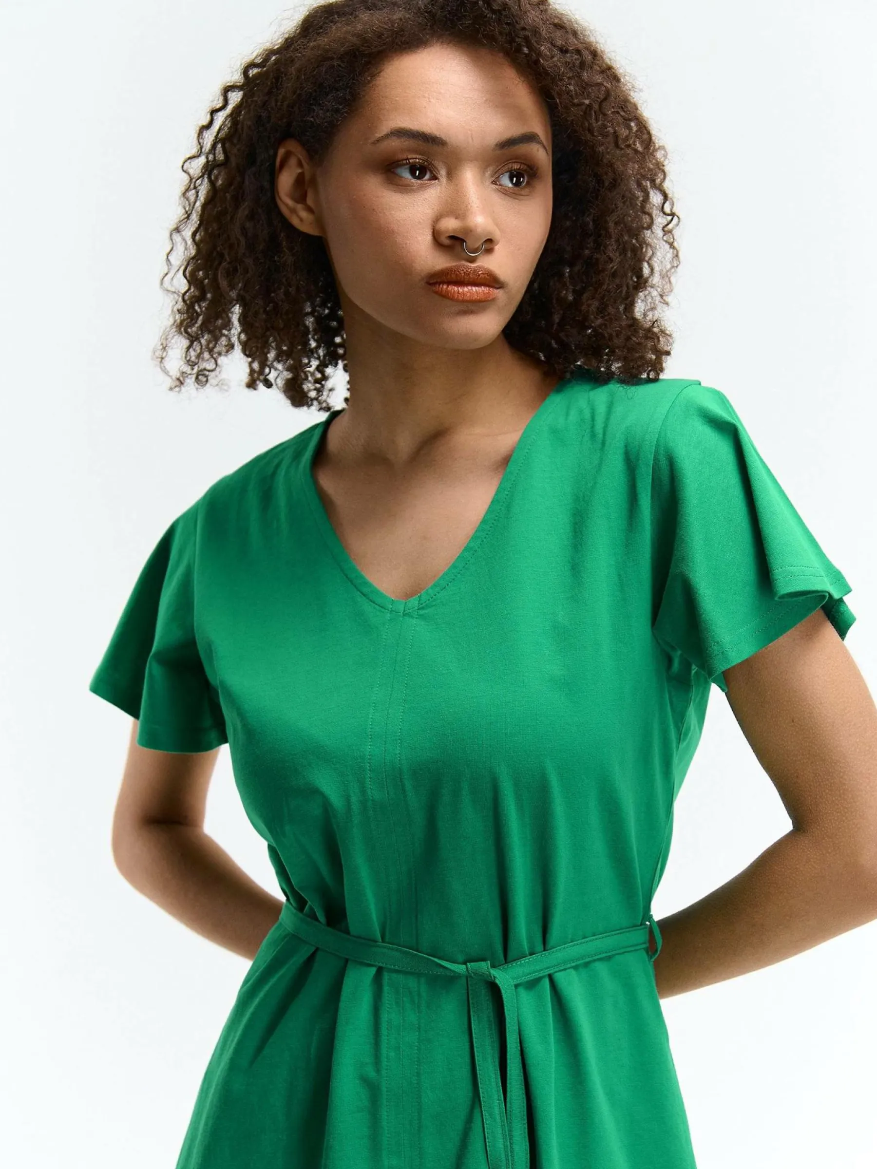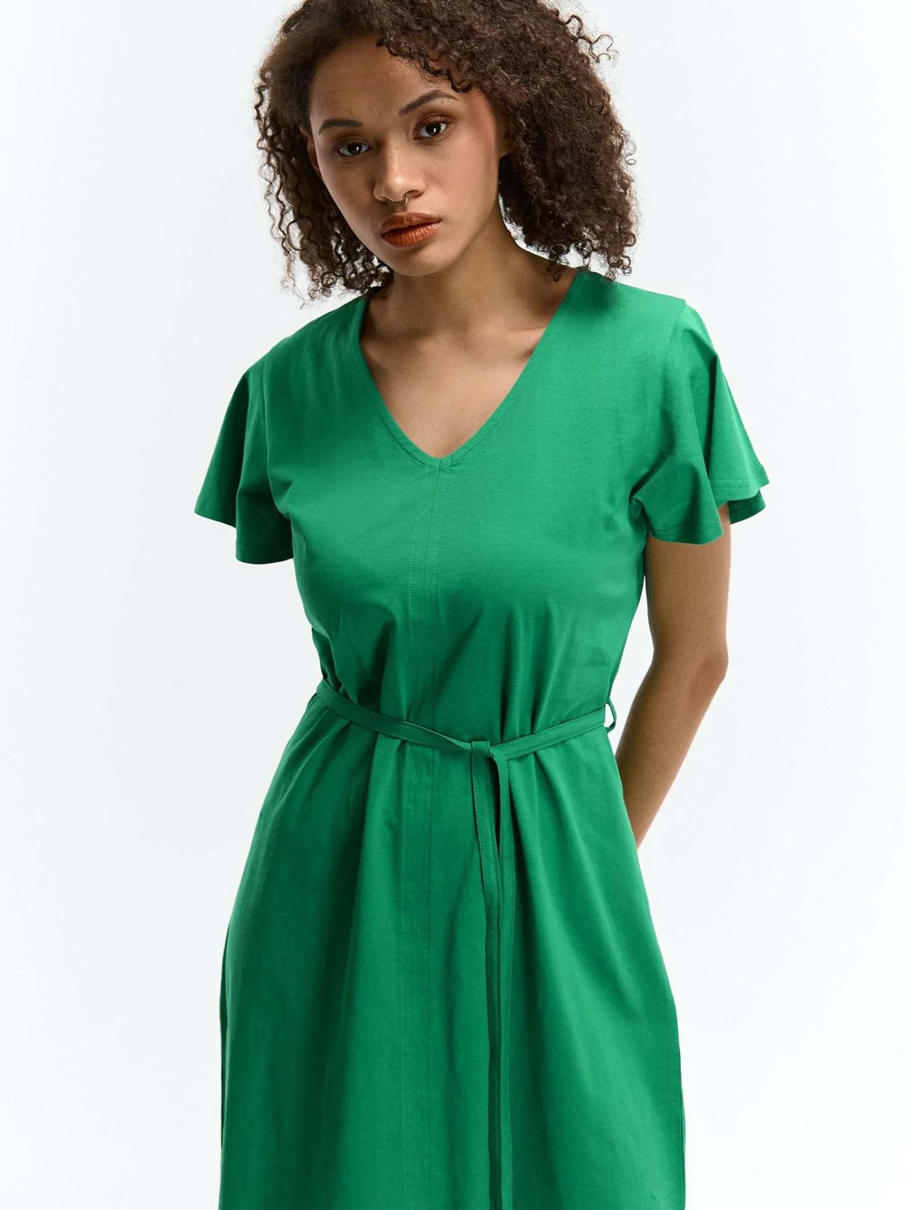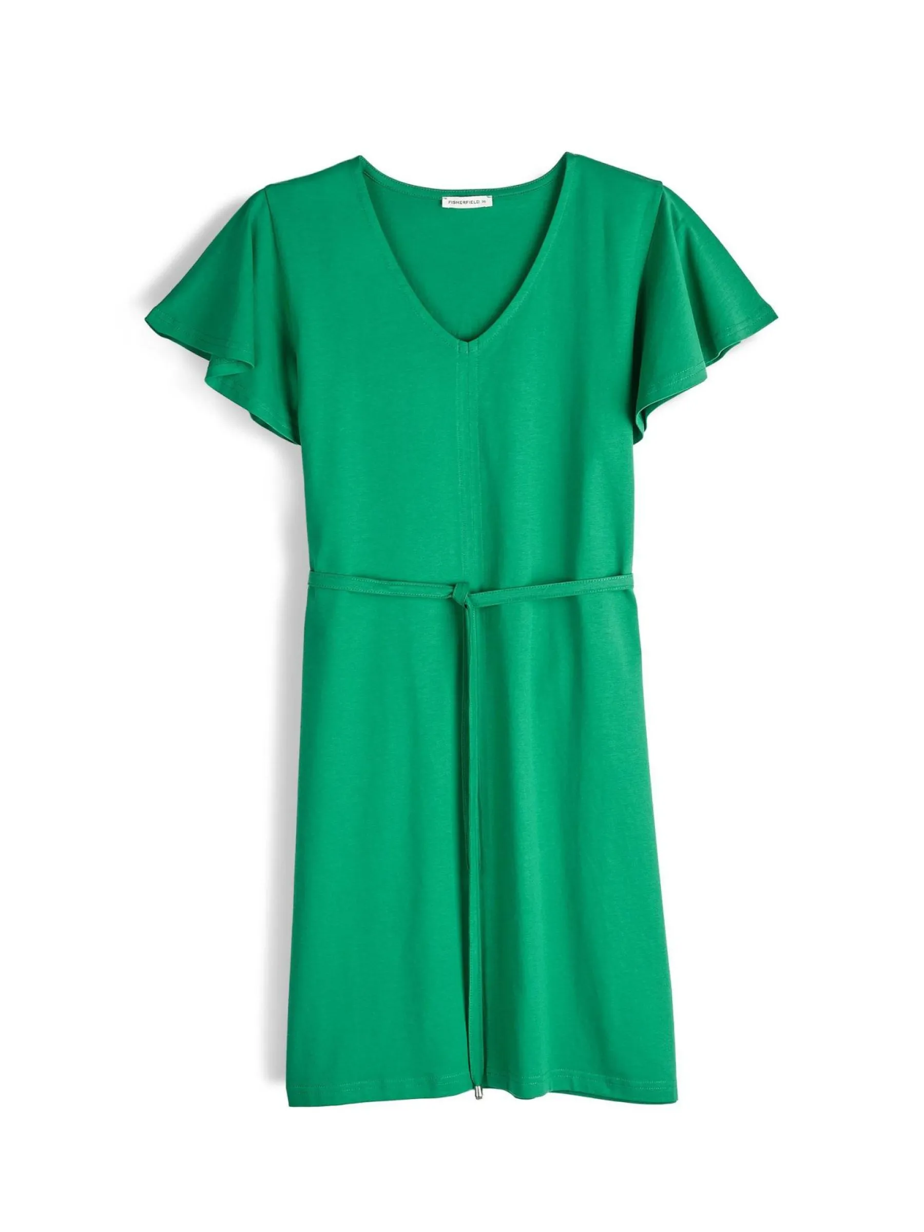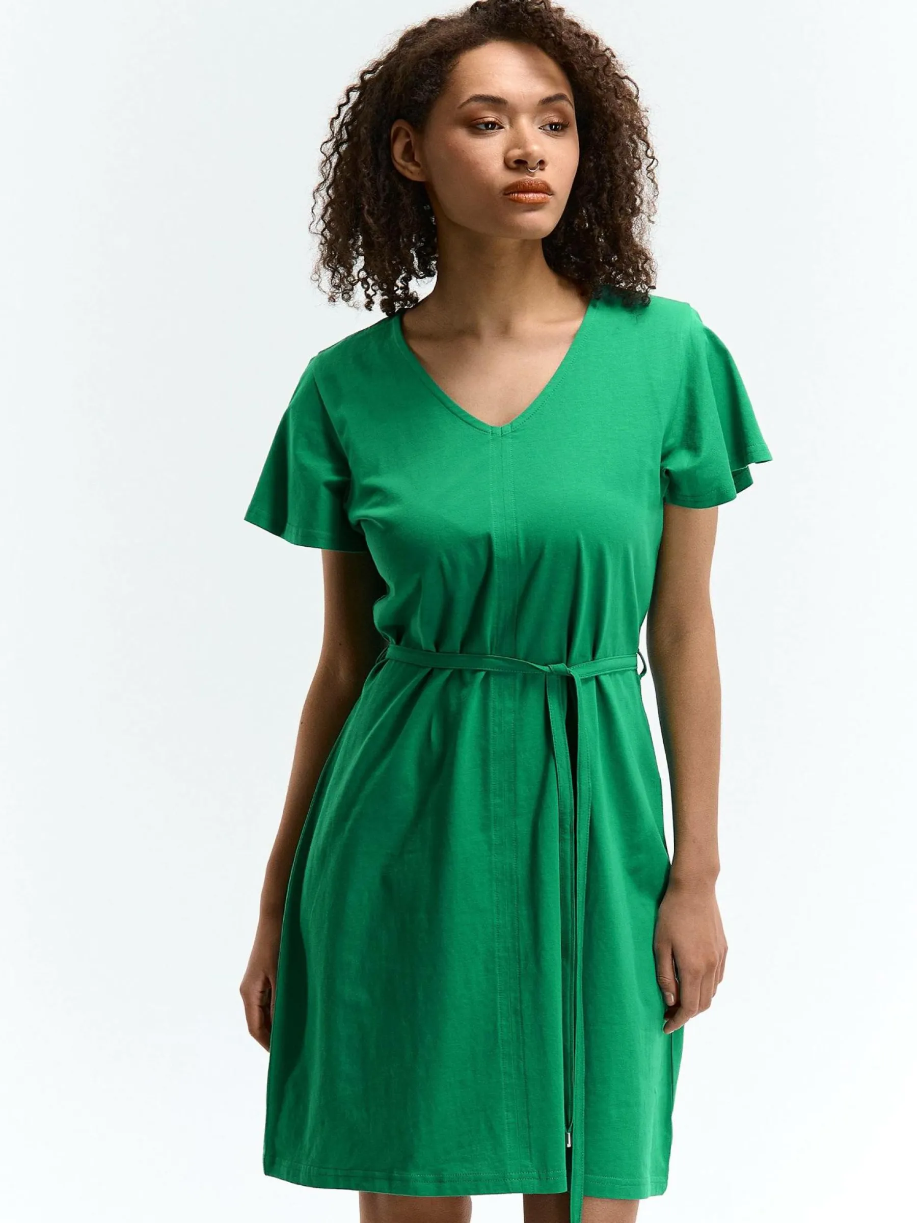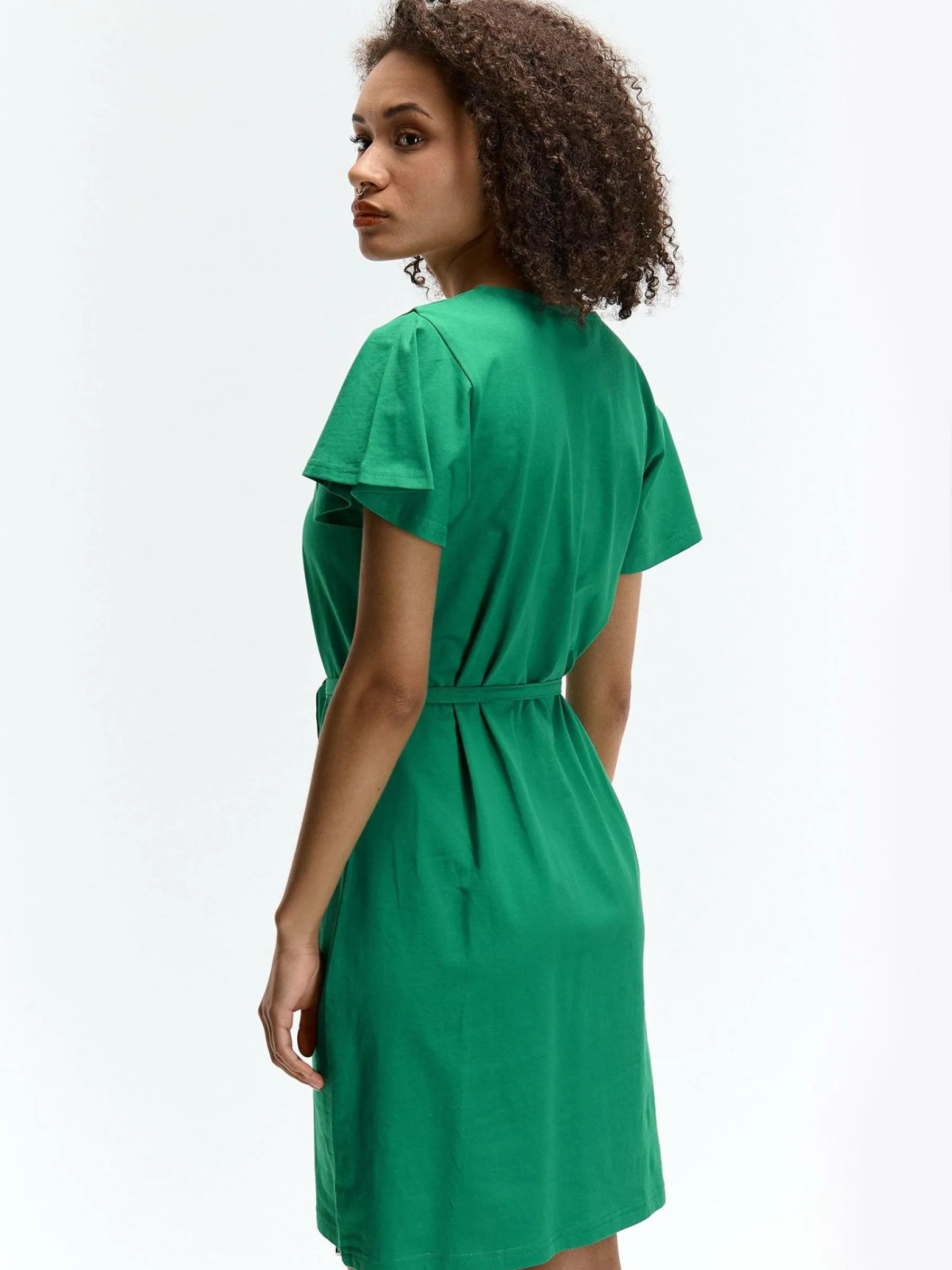 Kolor: zielonyKrój: z falbanąTyp: sukienkaRekaw: krótki rękawDługość: krótkiPattern style: pojedynczy kolorDetal…