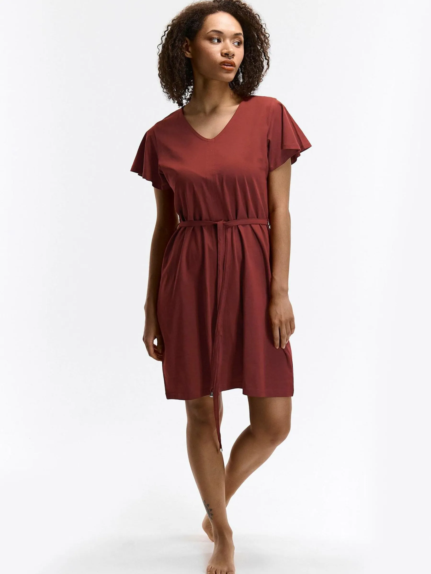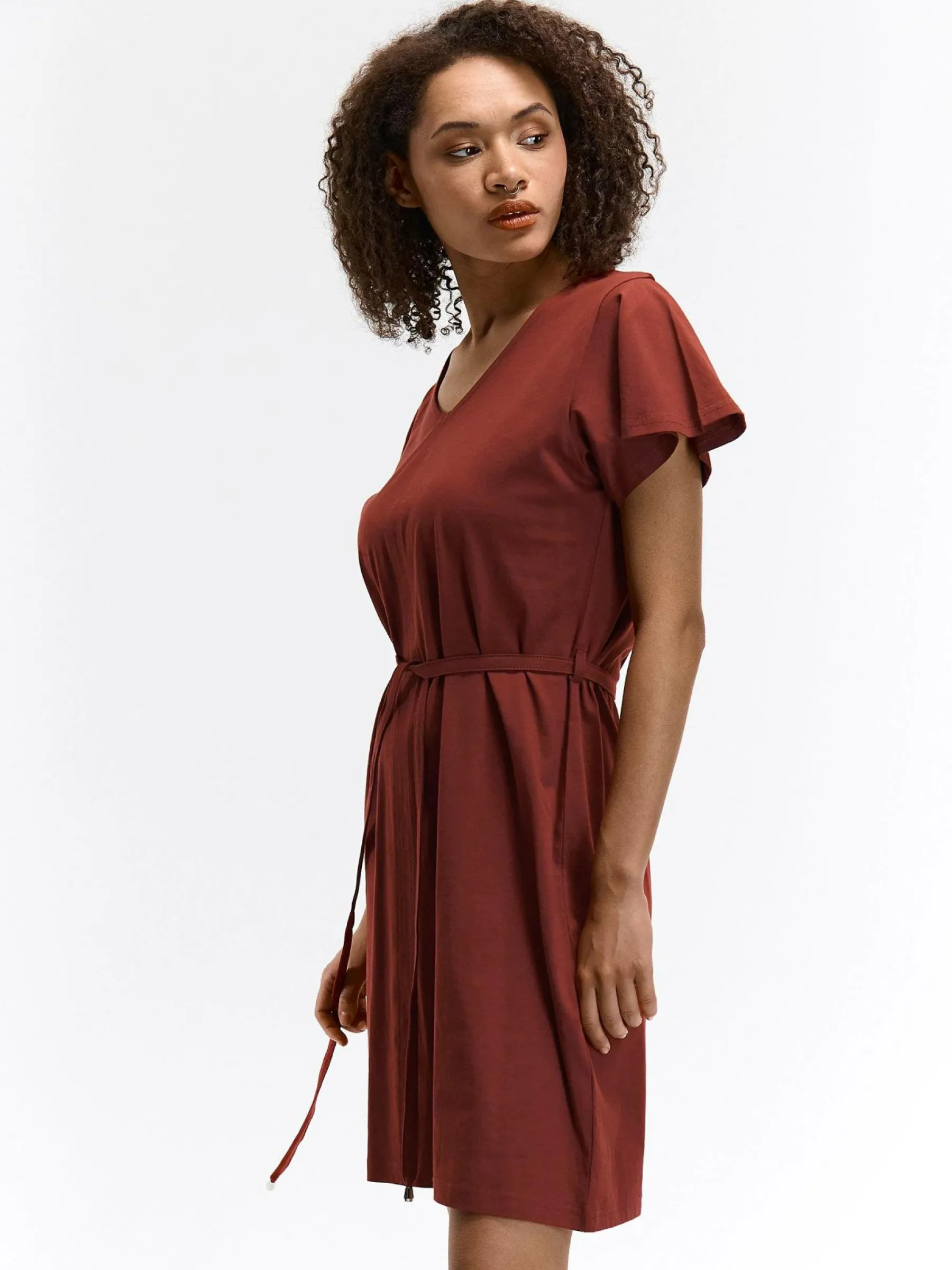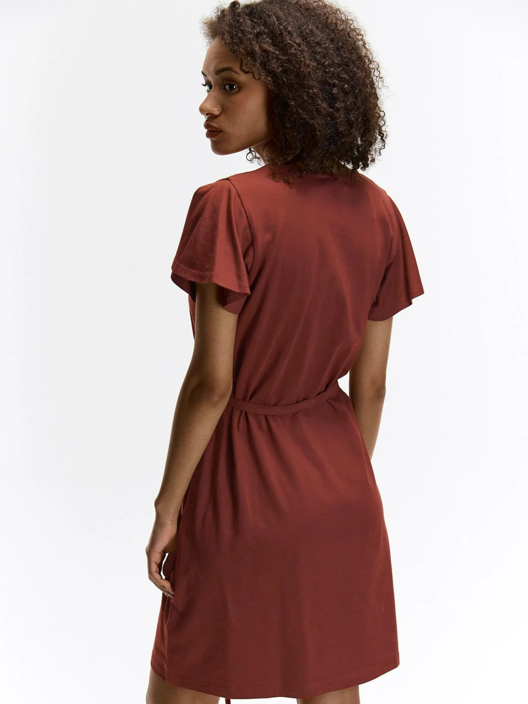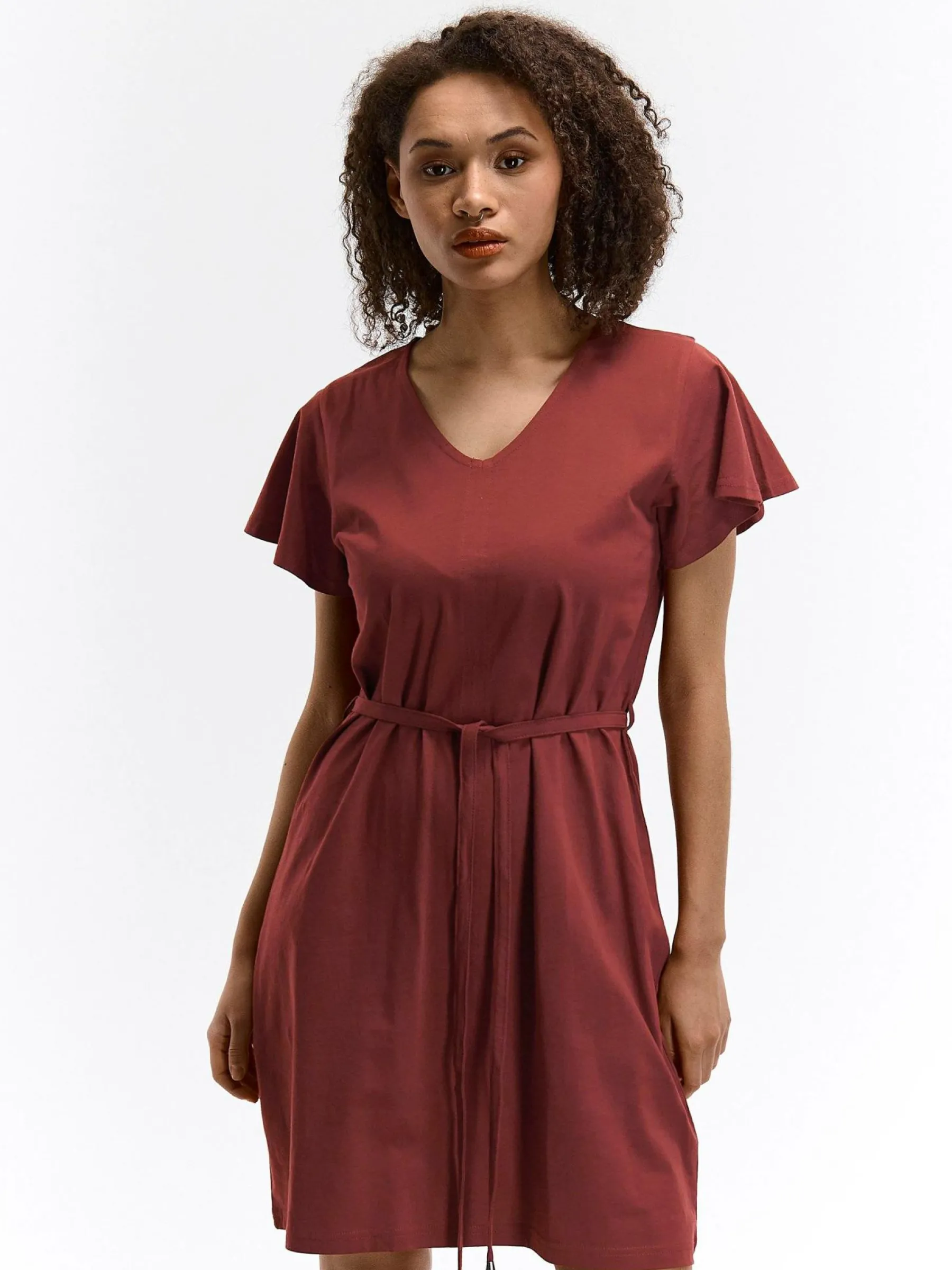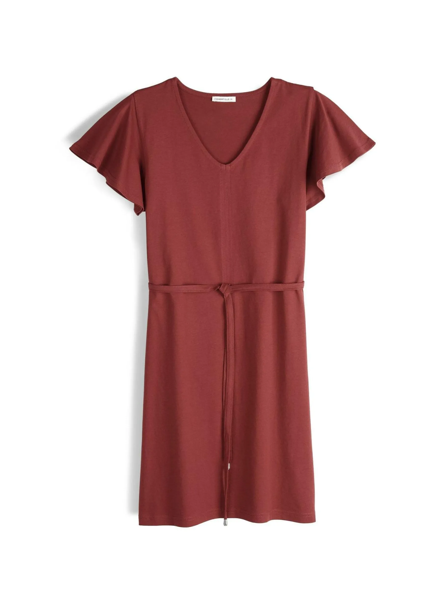 Kolor: czerwonyKrój: z falbanąTyp: sukienkaRekaw: krótki rękawDługość: miniPattern style: pojedynczy kolorDetal: …