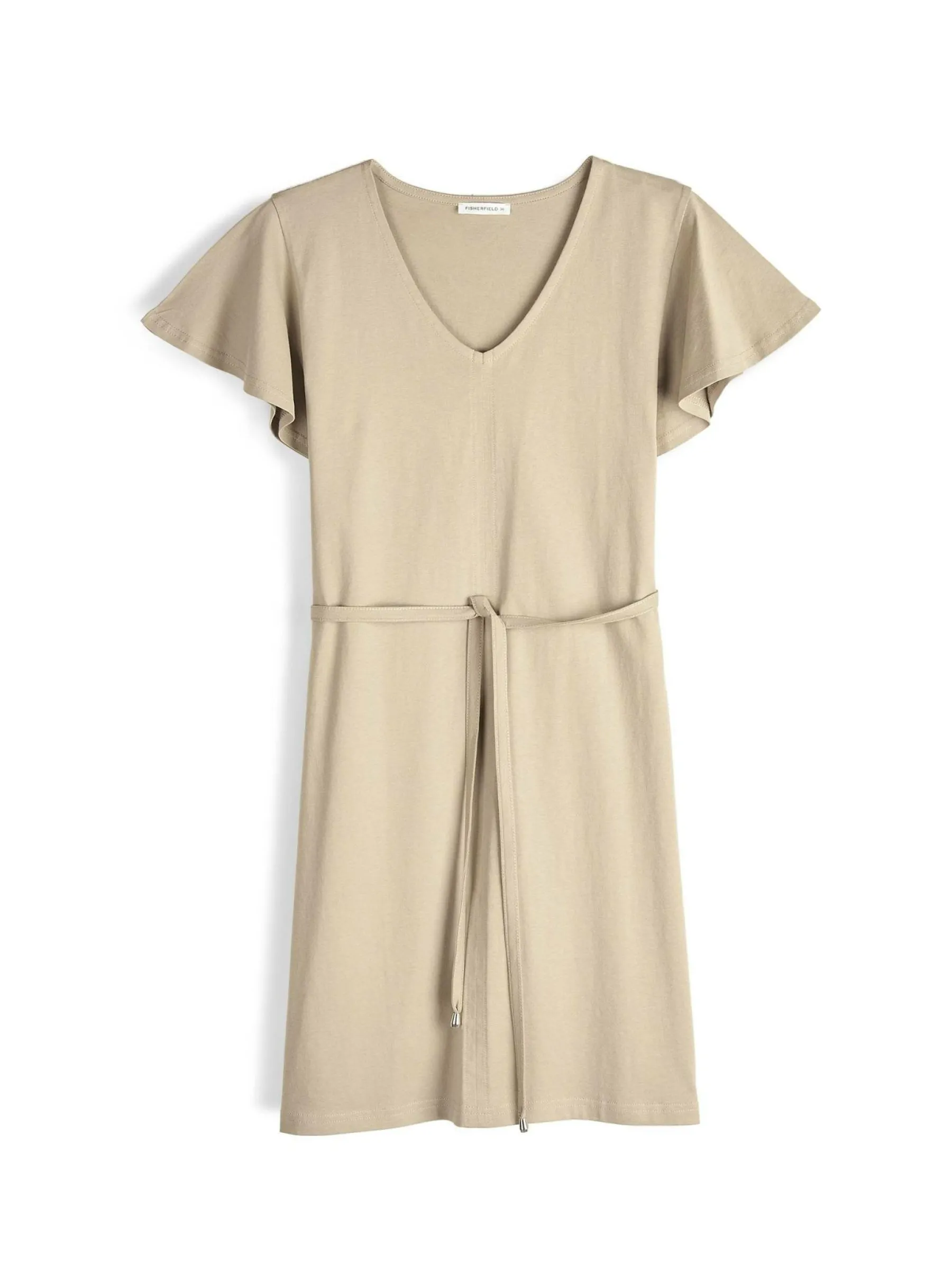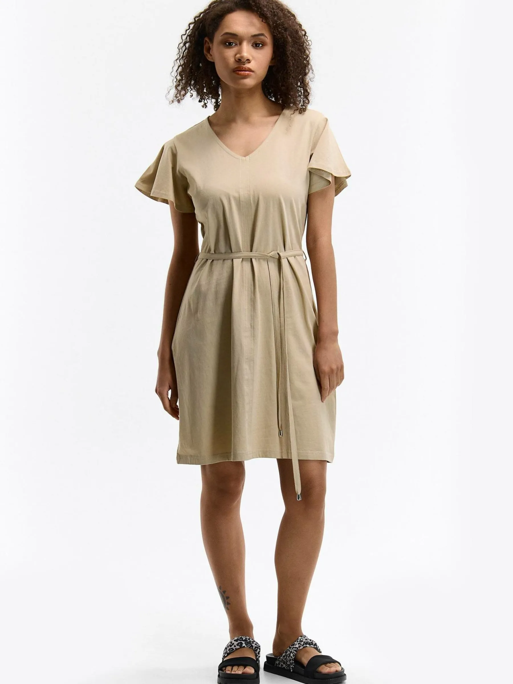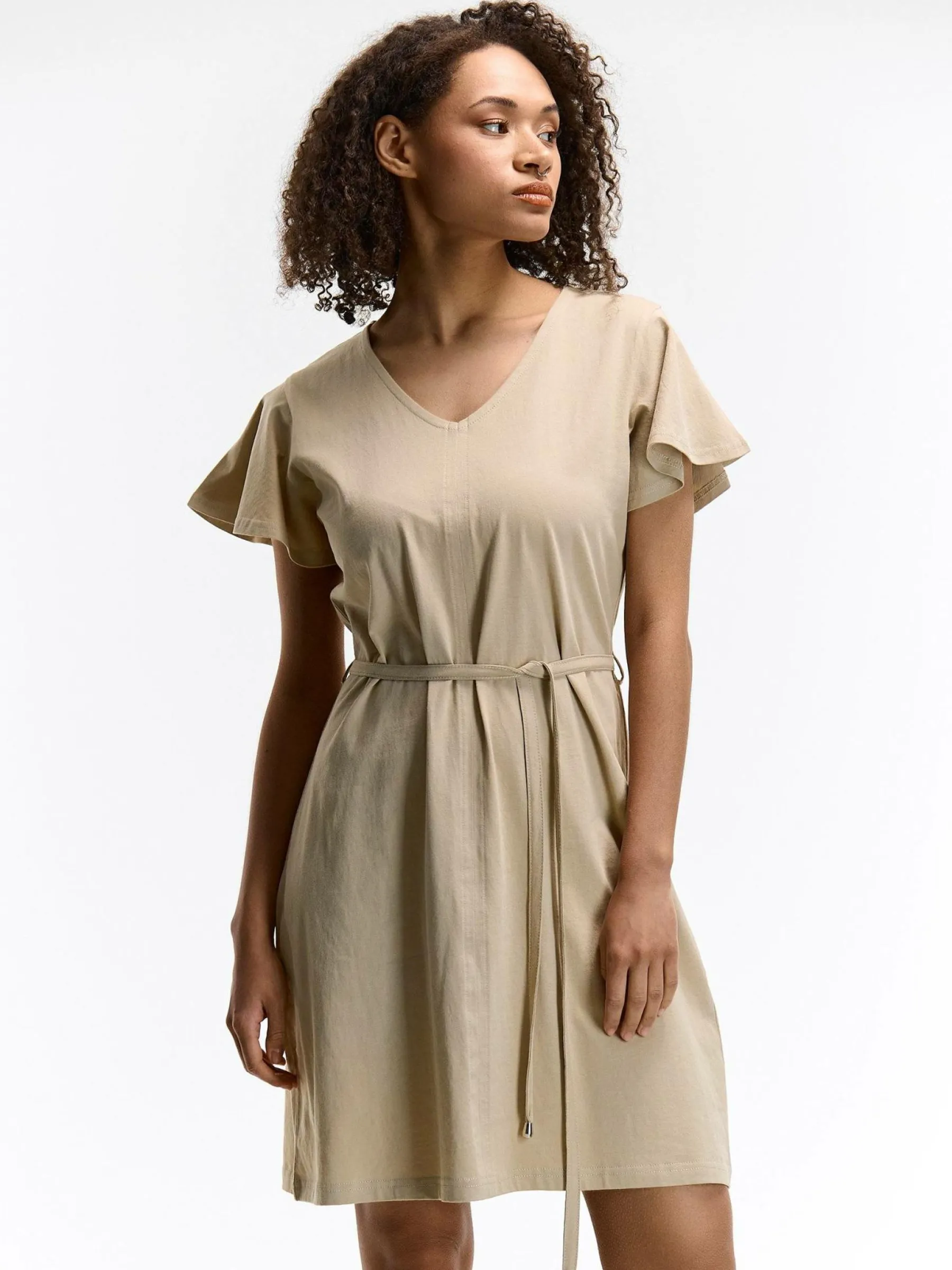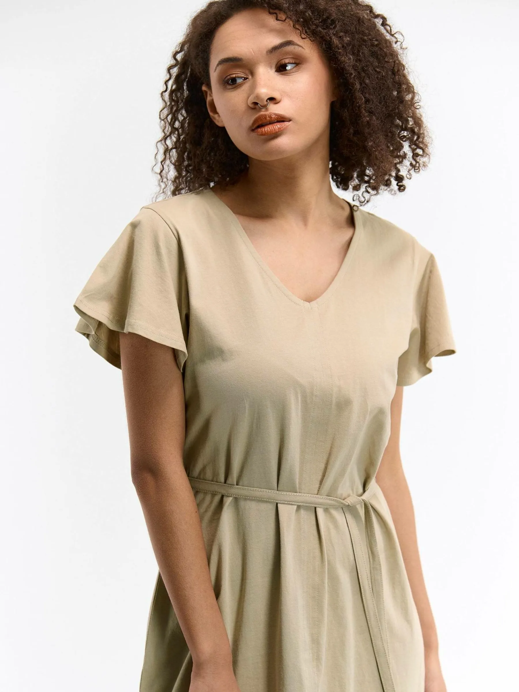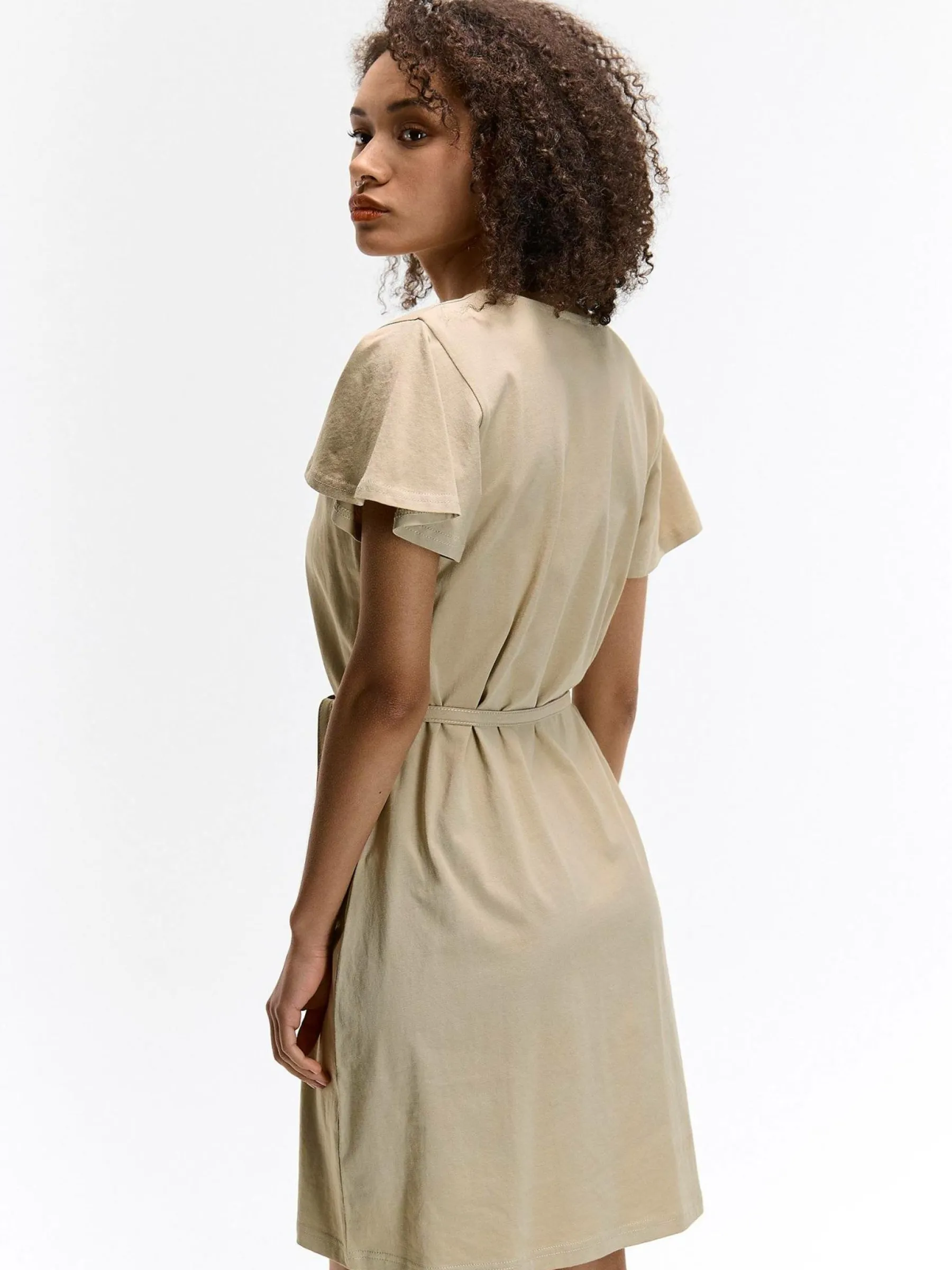 Kolor: beżowyKrój: z falbanąTyp: sukienkaRekaw: krótki rękawDługość: krótkiPattern style: pojedynczy kolorDetal…