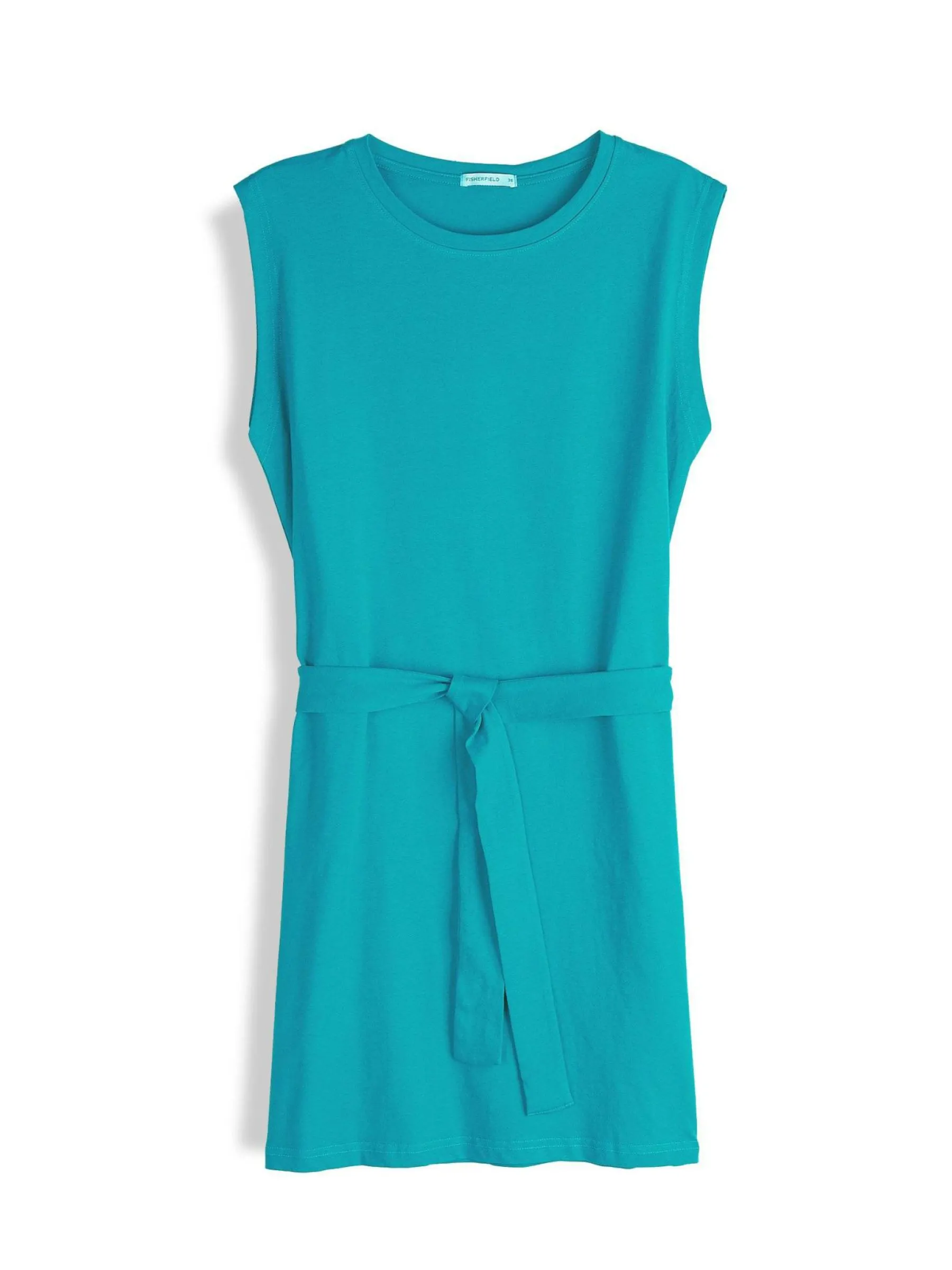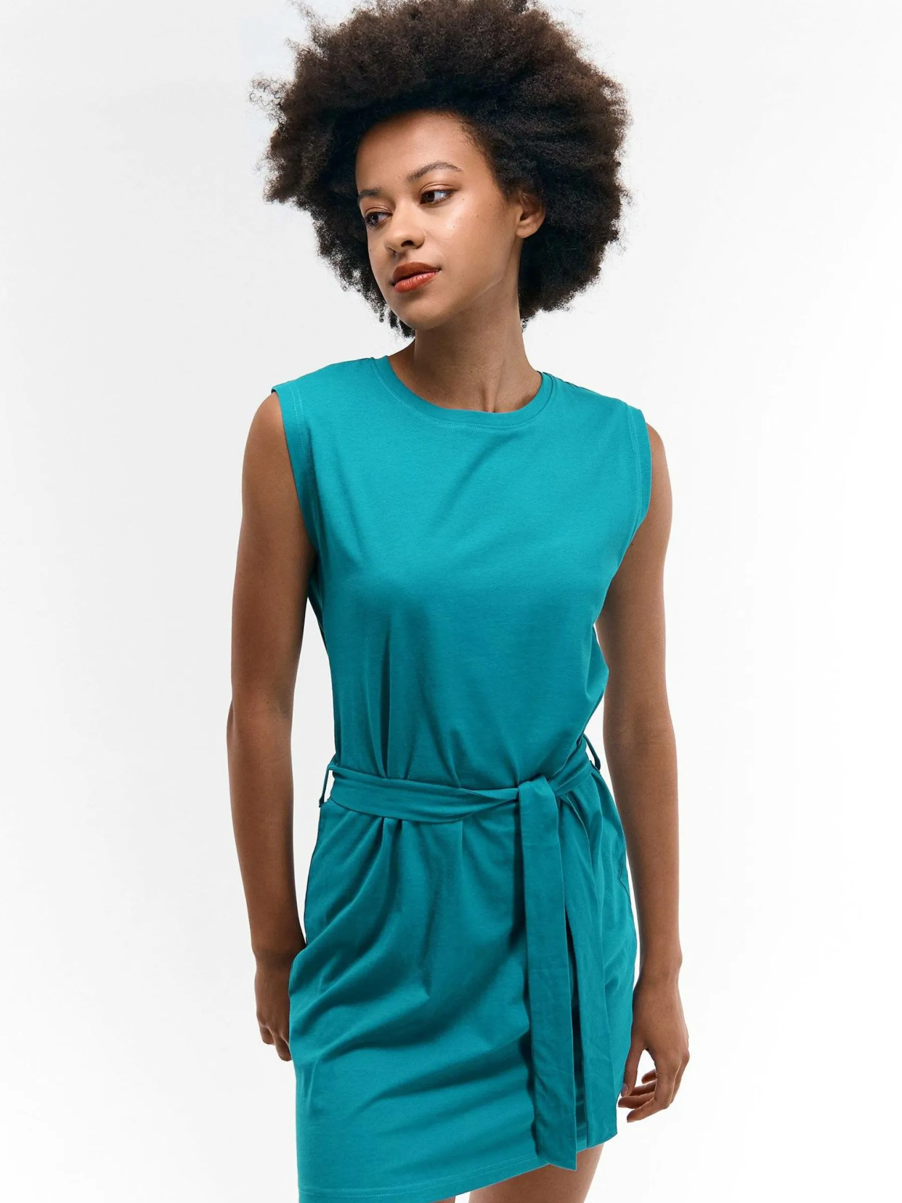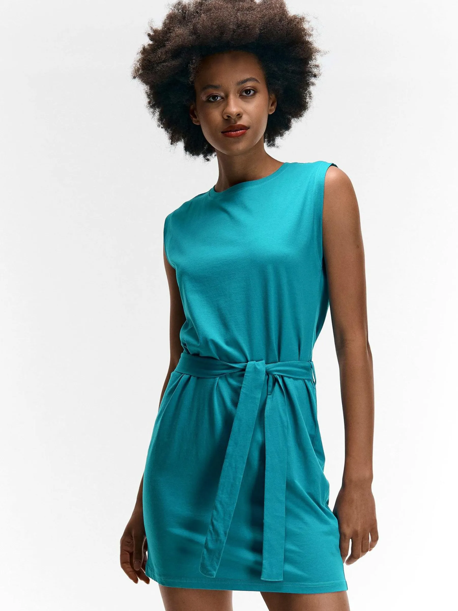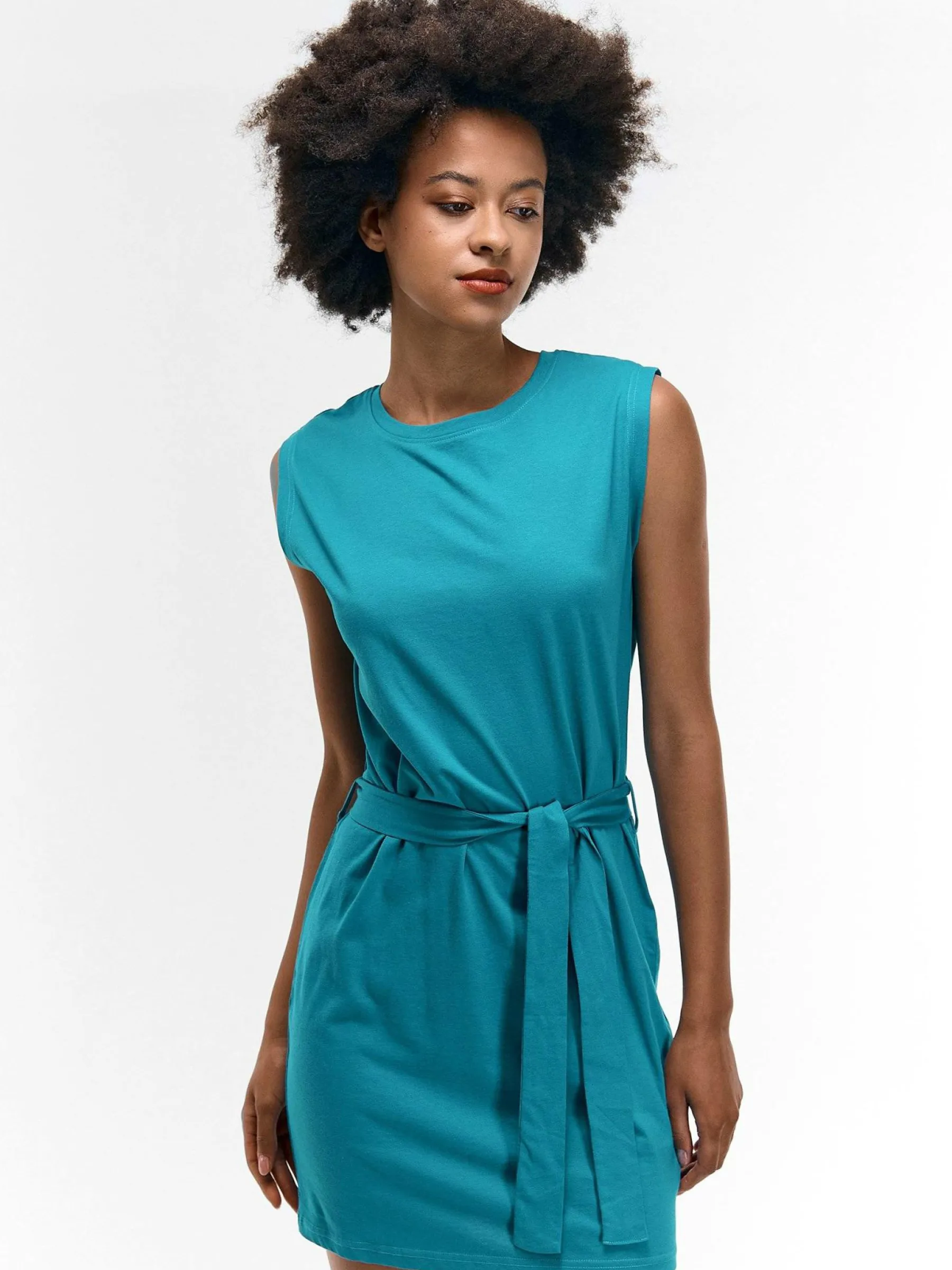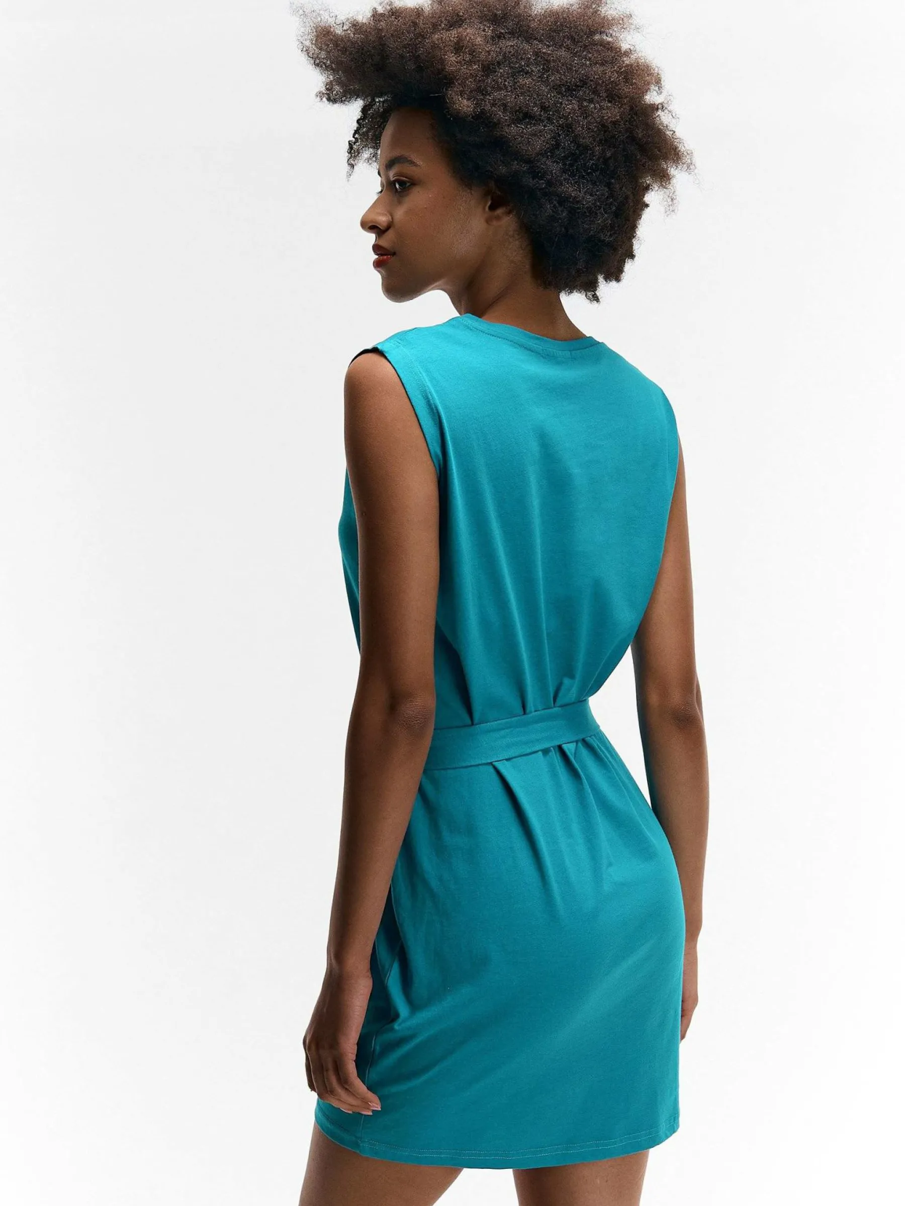 Kolor: niebieskiKrój: regularTyp: sukienkaRekaw: bez rękawówDługość: miniPattern style: pojedynczy kolorDetal: z p…