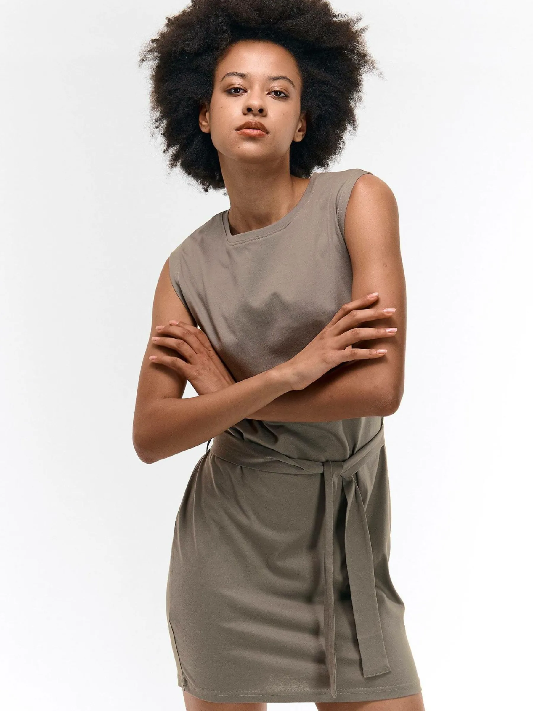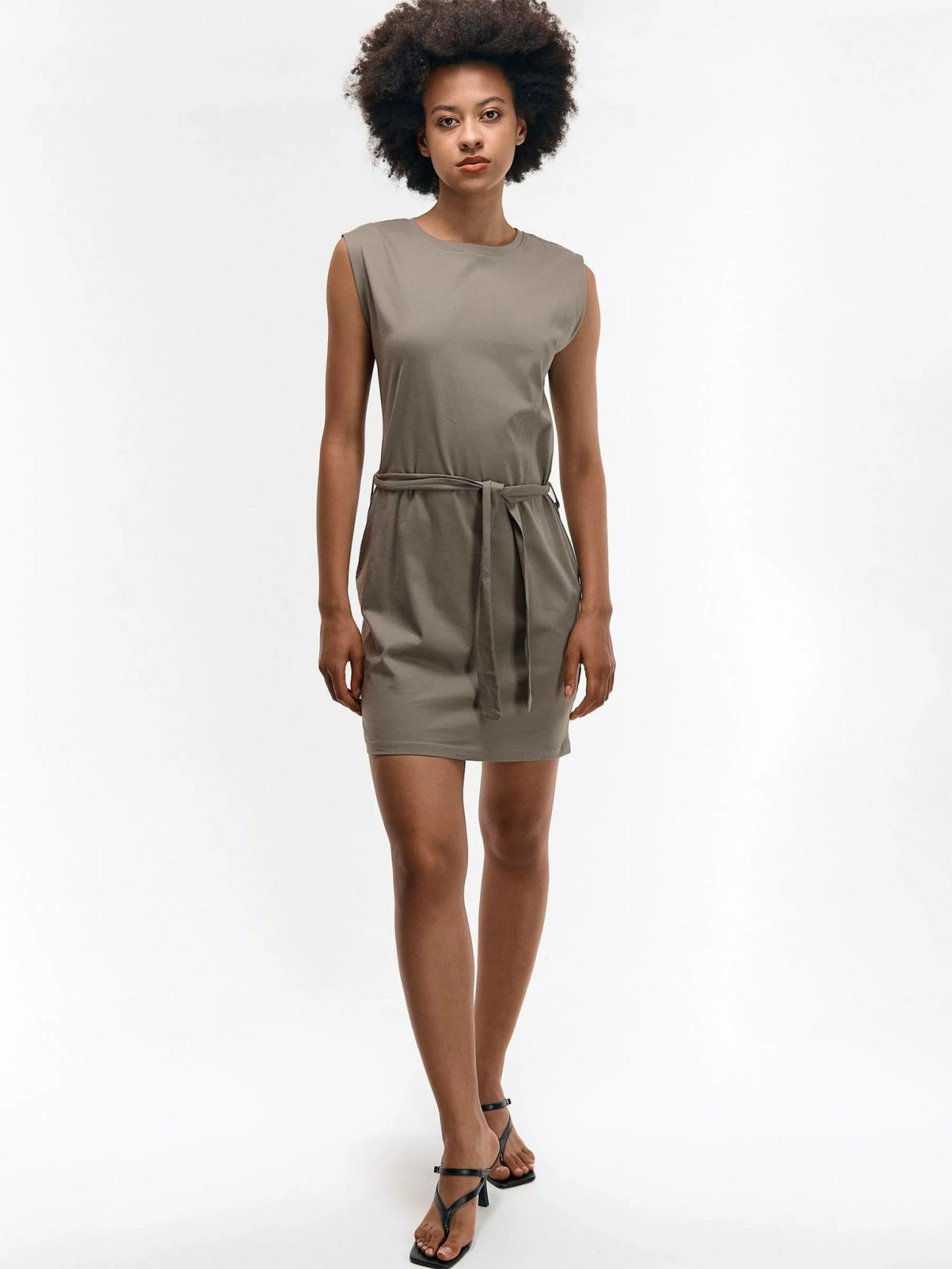 Kolor: brązowyKrój: regularTyp: sukienkaRekaw: bez rękawówDługość: miniPattern style: pojedynczy kolorDetal: z pa…