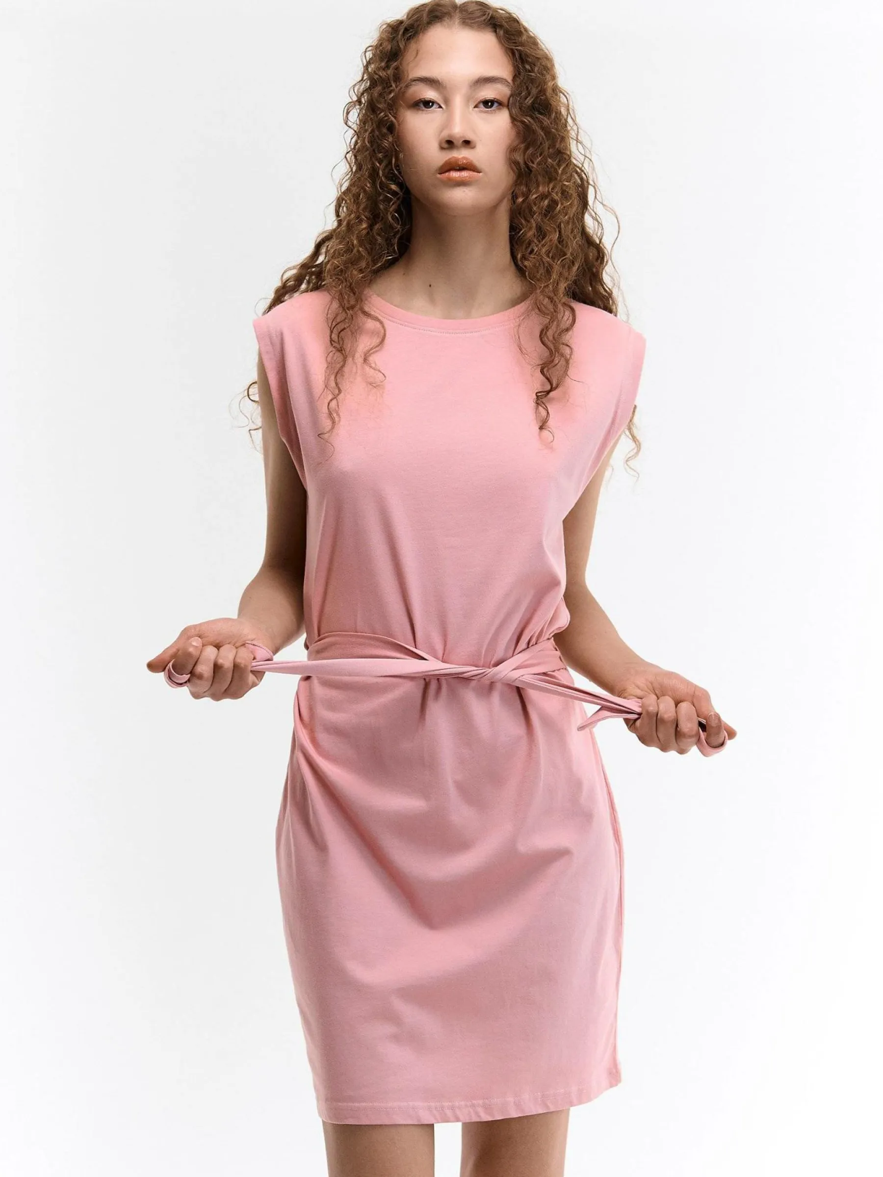 Kolor: różowyKrój: regularTyp: sukienkaRekaw: bez rękawówDługość: miniPattern style: pojedynczy kolorDetal: z pa…