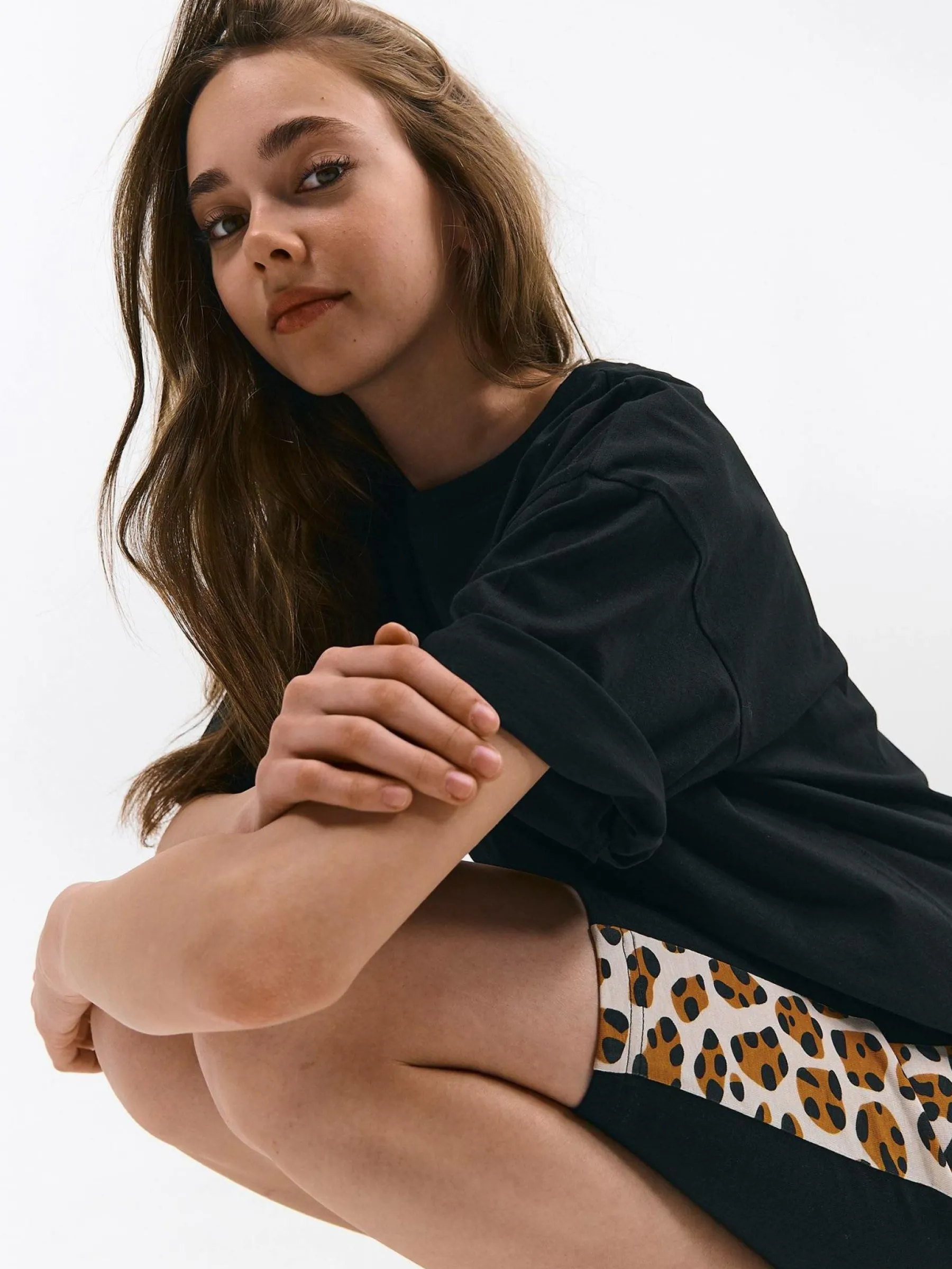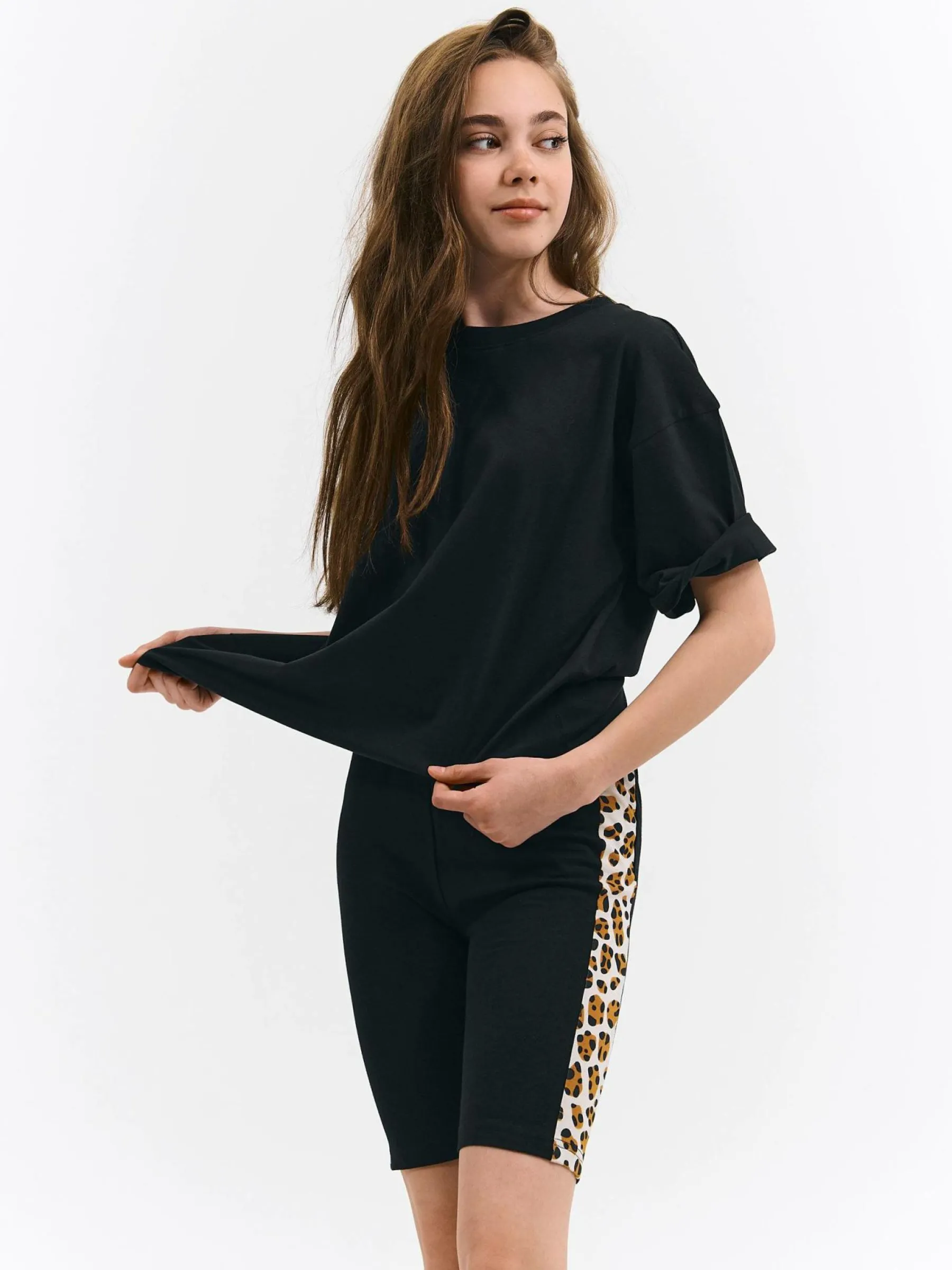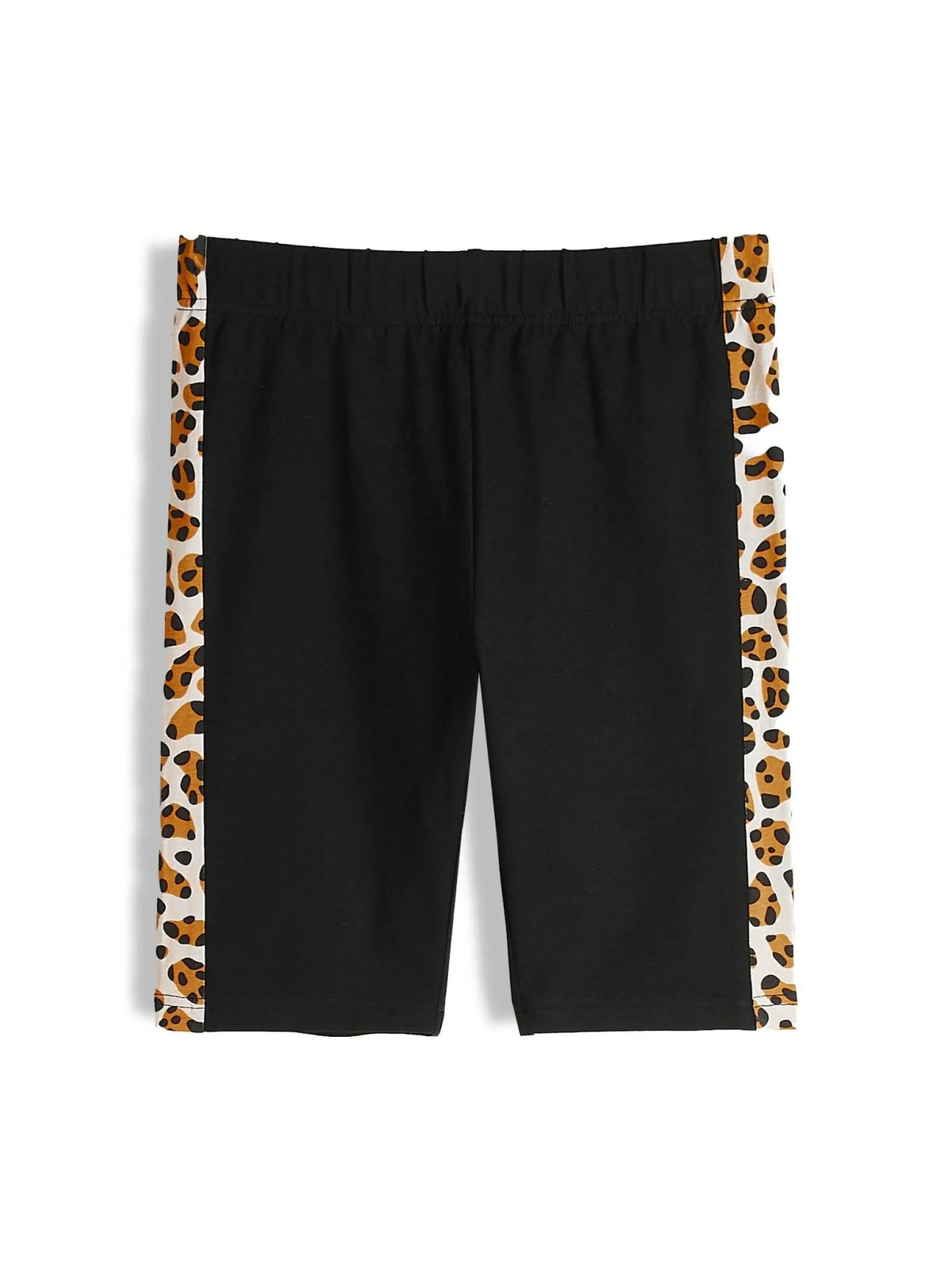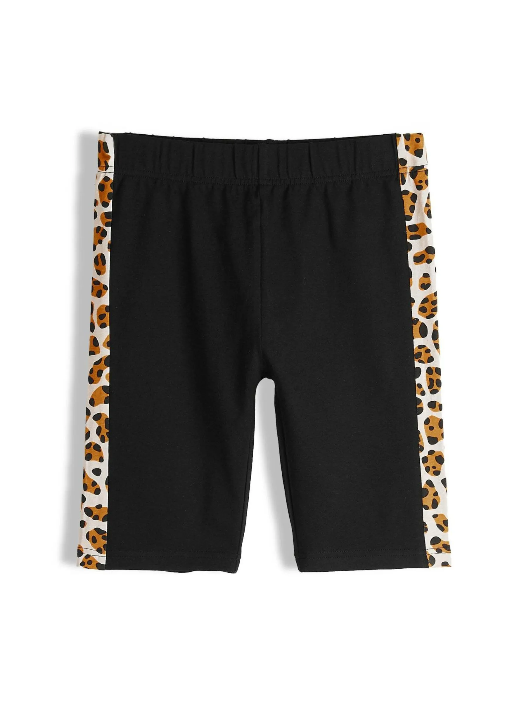 Kolor: czarnyKrój: bikerTyp: spodenkiDługość: krótkiPattern style: zwierzecyDetal: z elastyczną opaskąMateriał: …