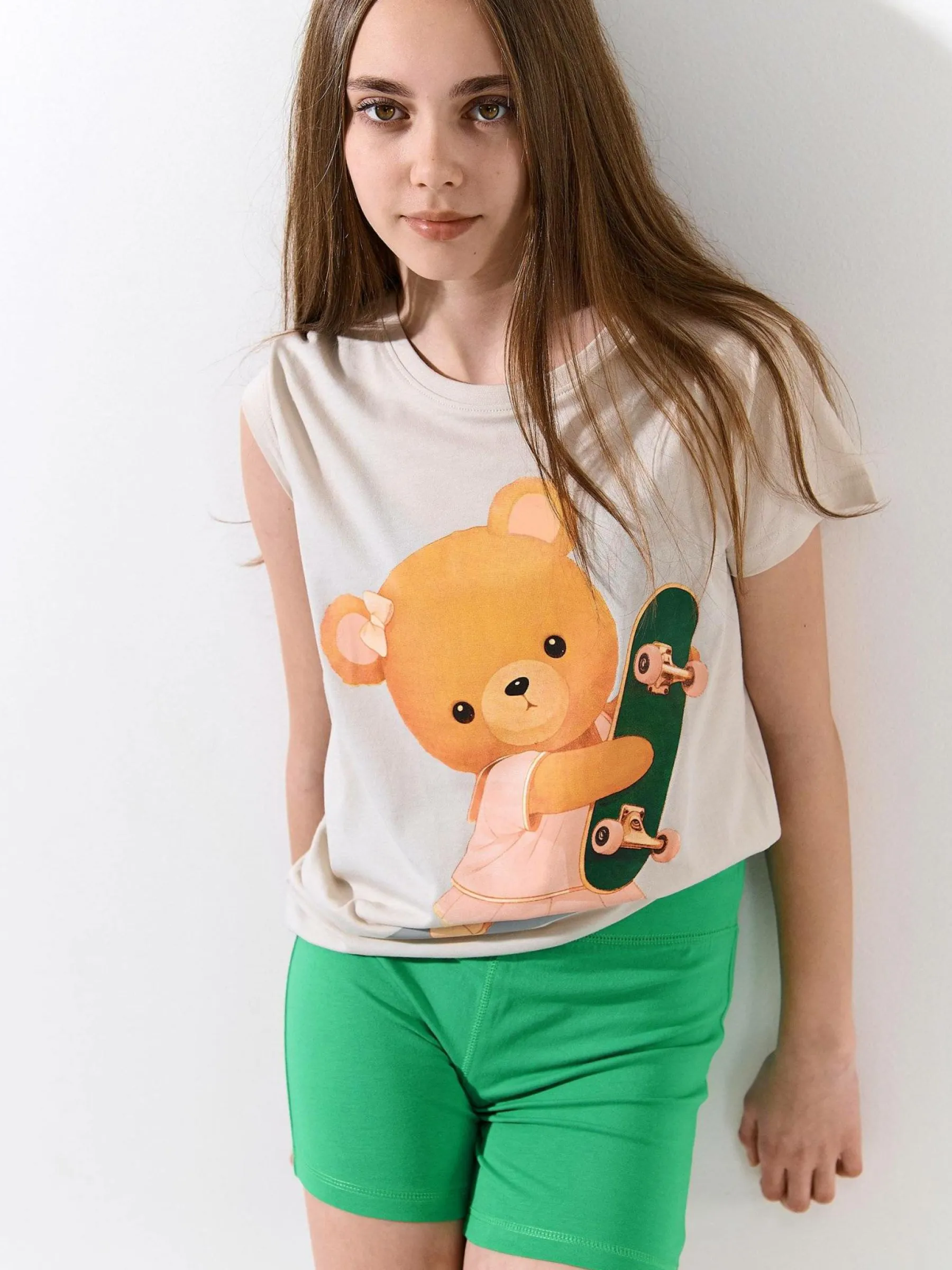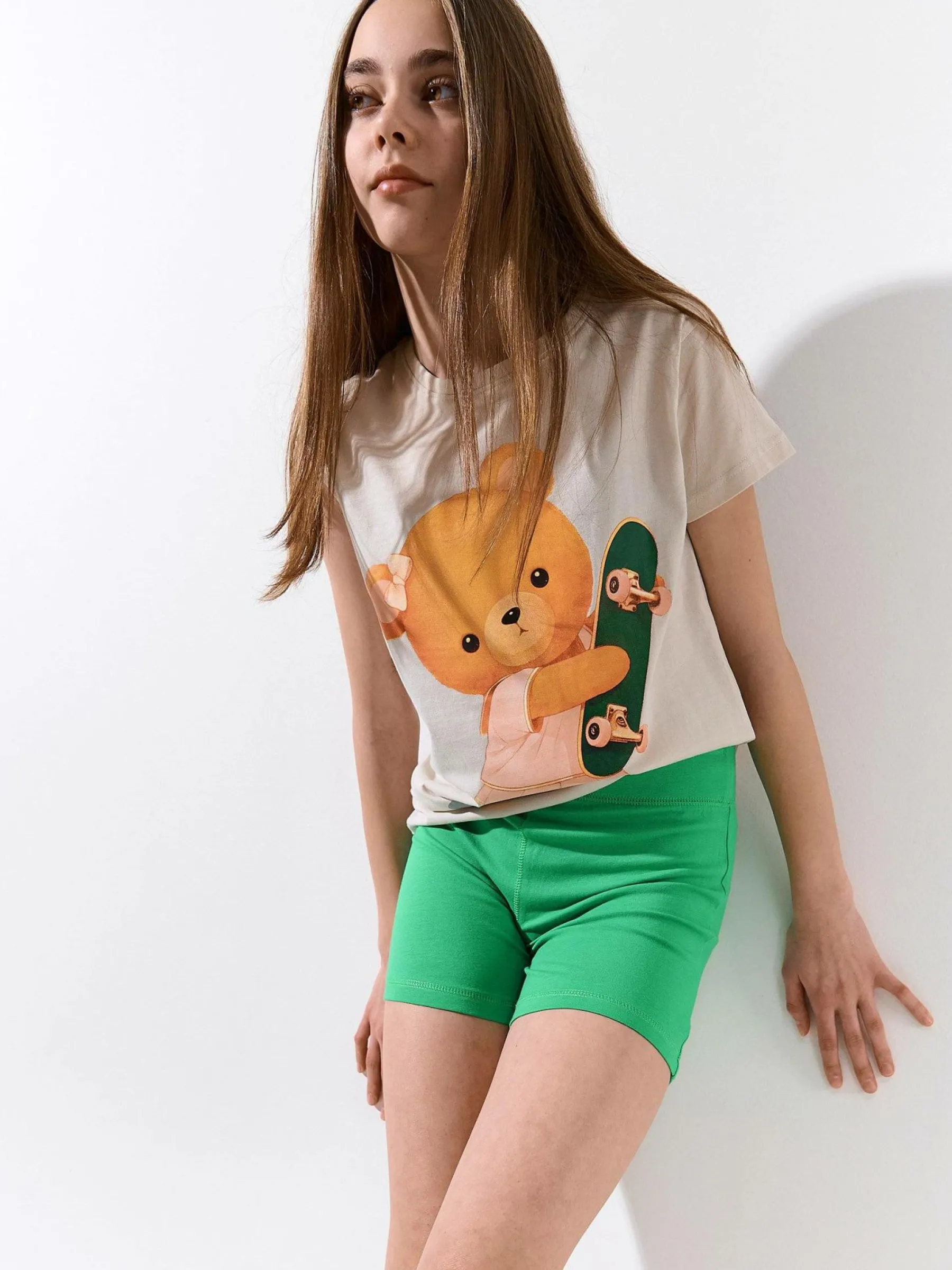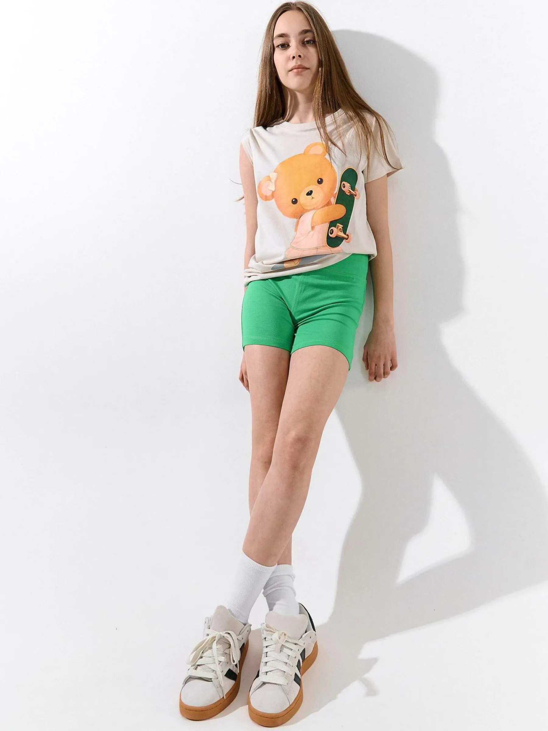 Kolor: zielonyKrój: bikerTyp: spodenkiDługość: krótkiPattern style: pojedynczy kolorDetal: z elastyczną opaskąMat…