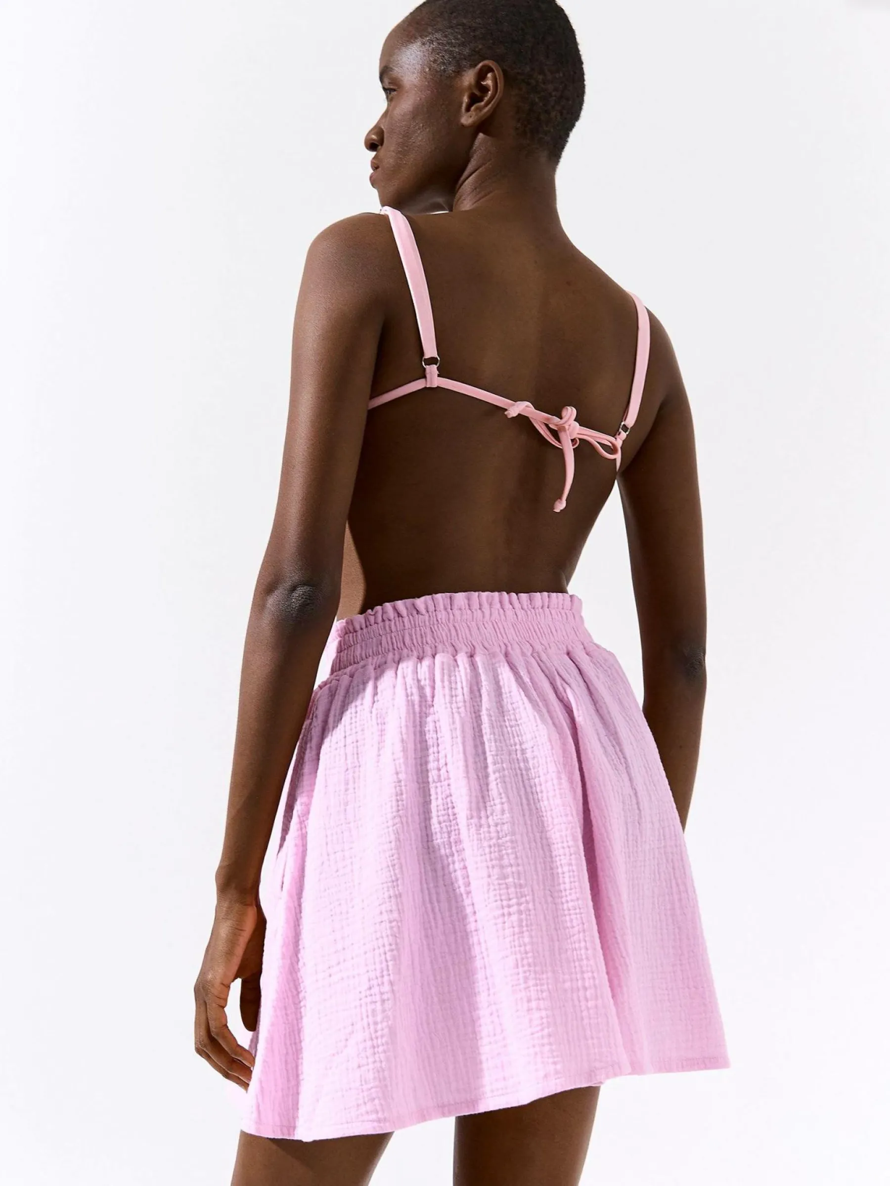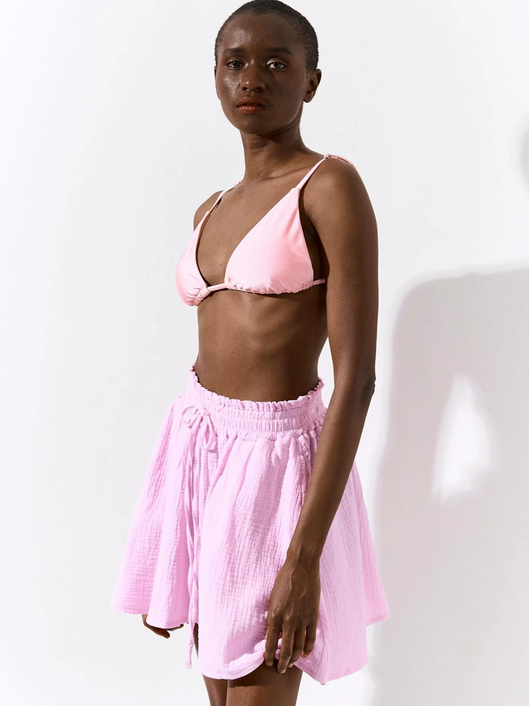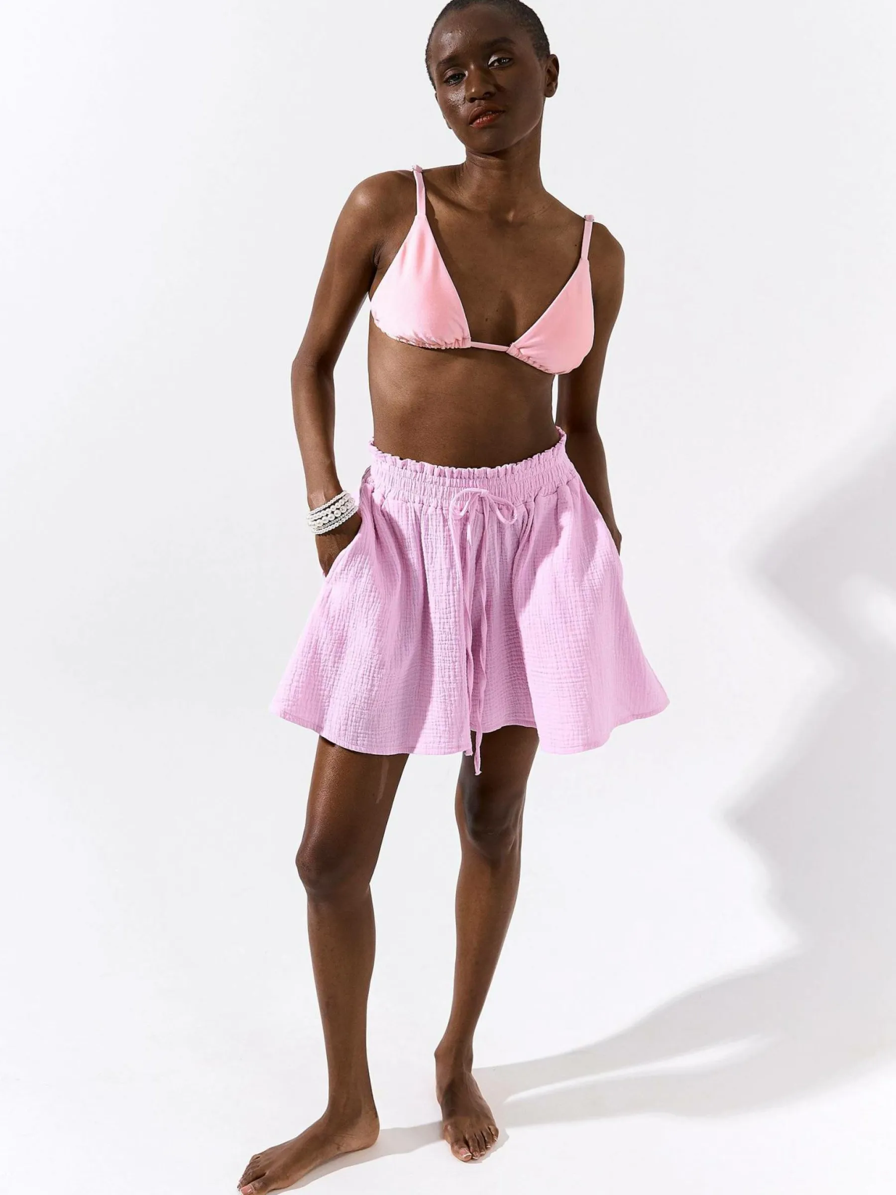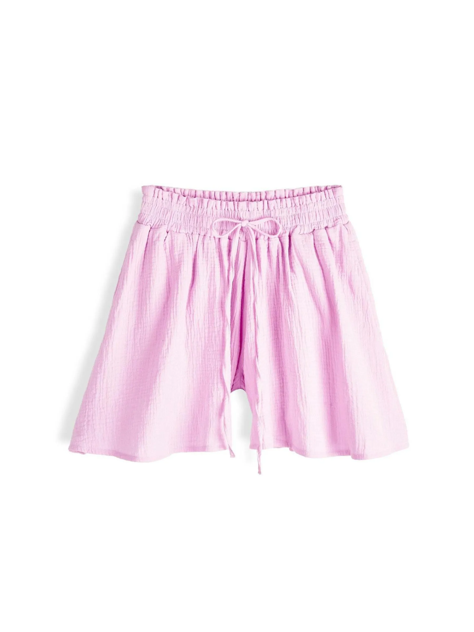 Kolor: różowyKrój: dzwon, z wysokim stanemTyp: spodenkiDługość: krótkiPattern style: pojedynczy kolor, strukturow…