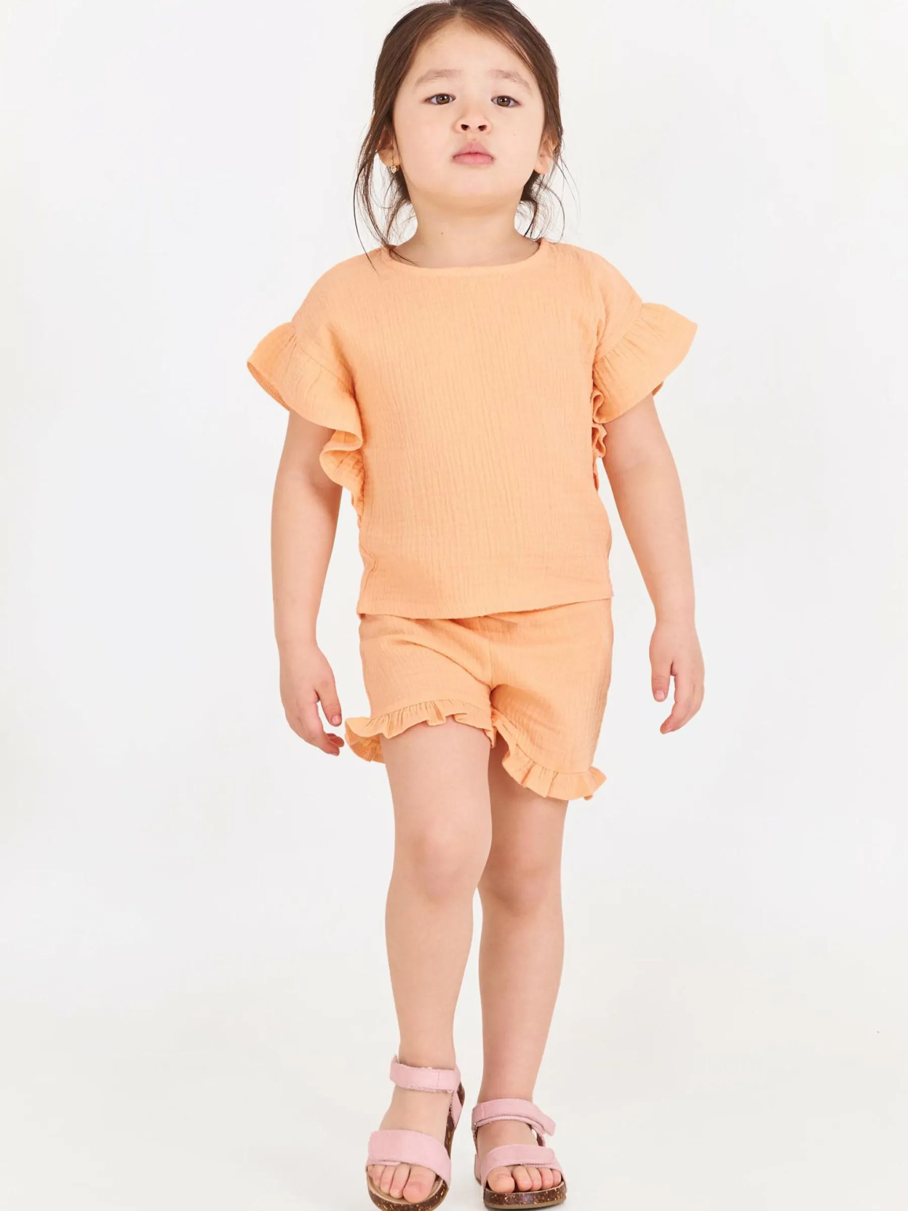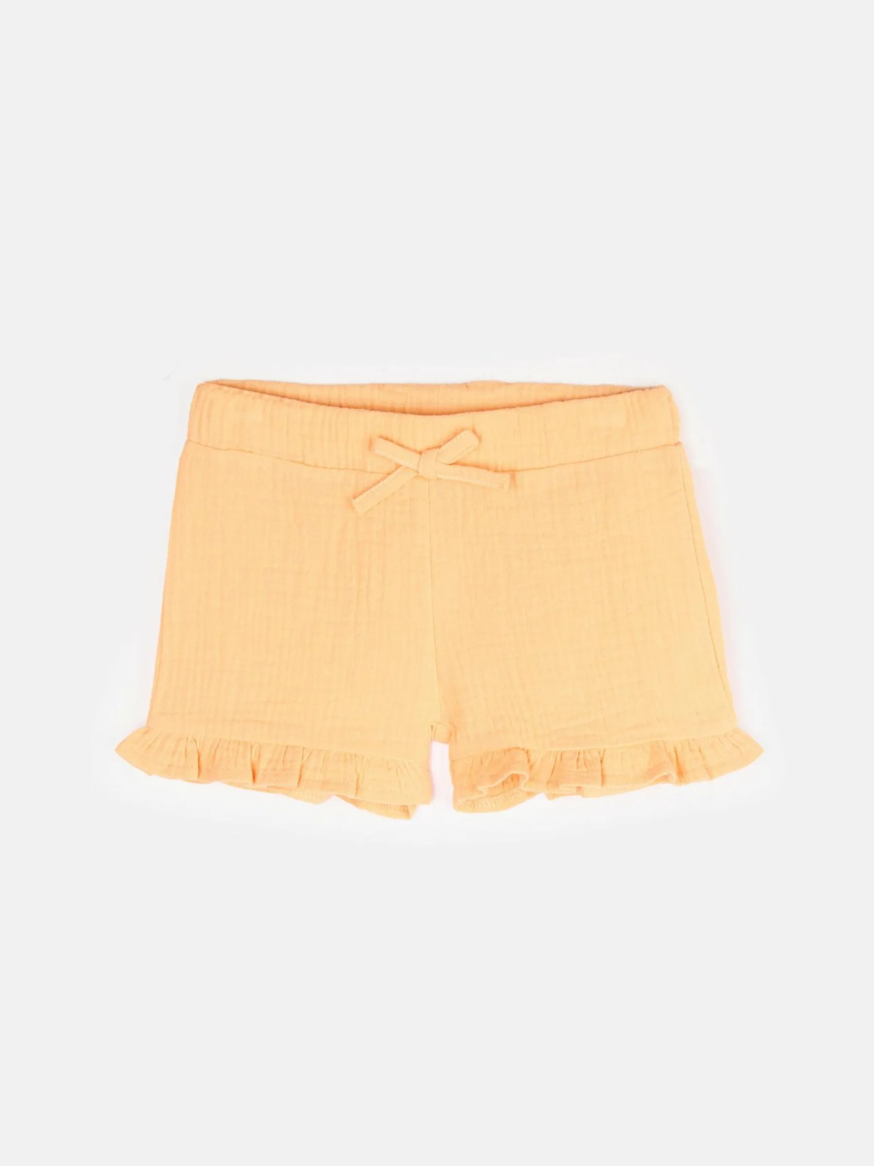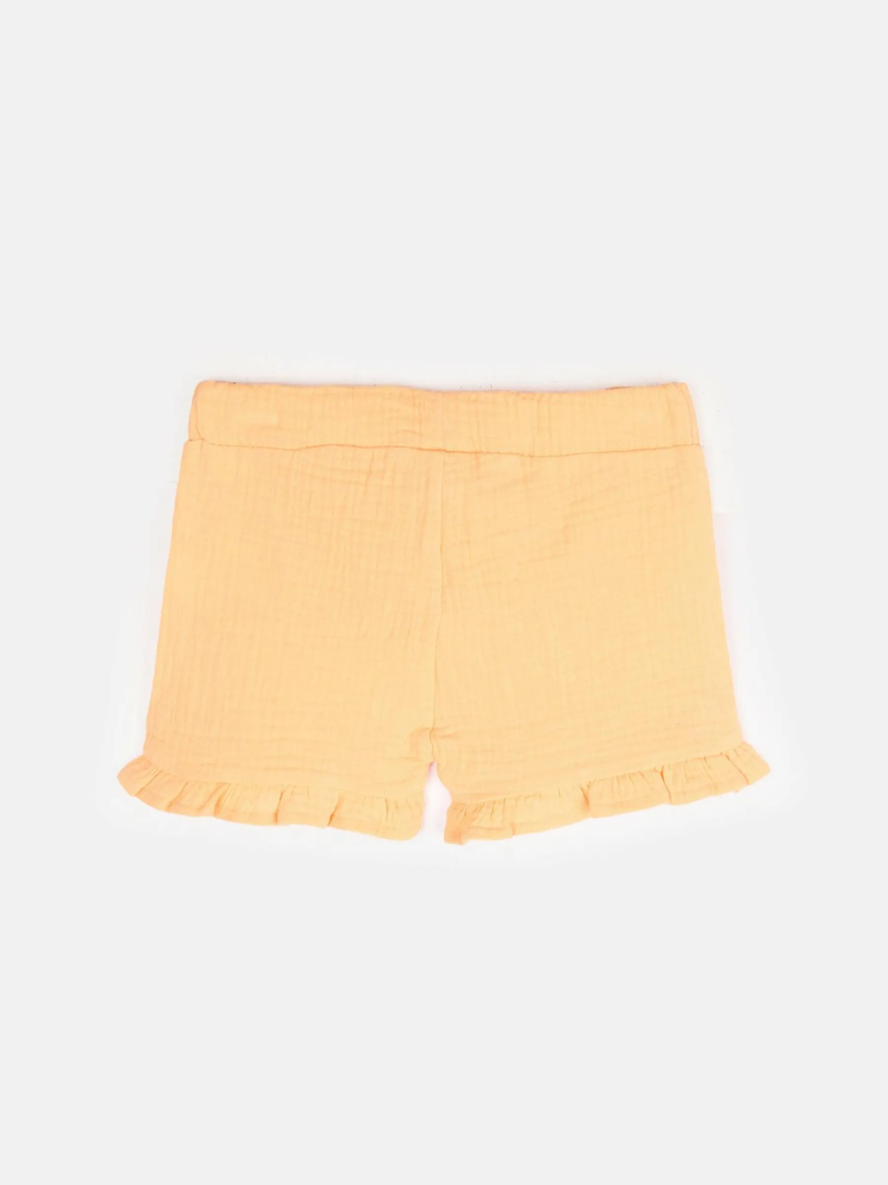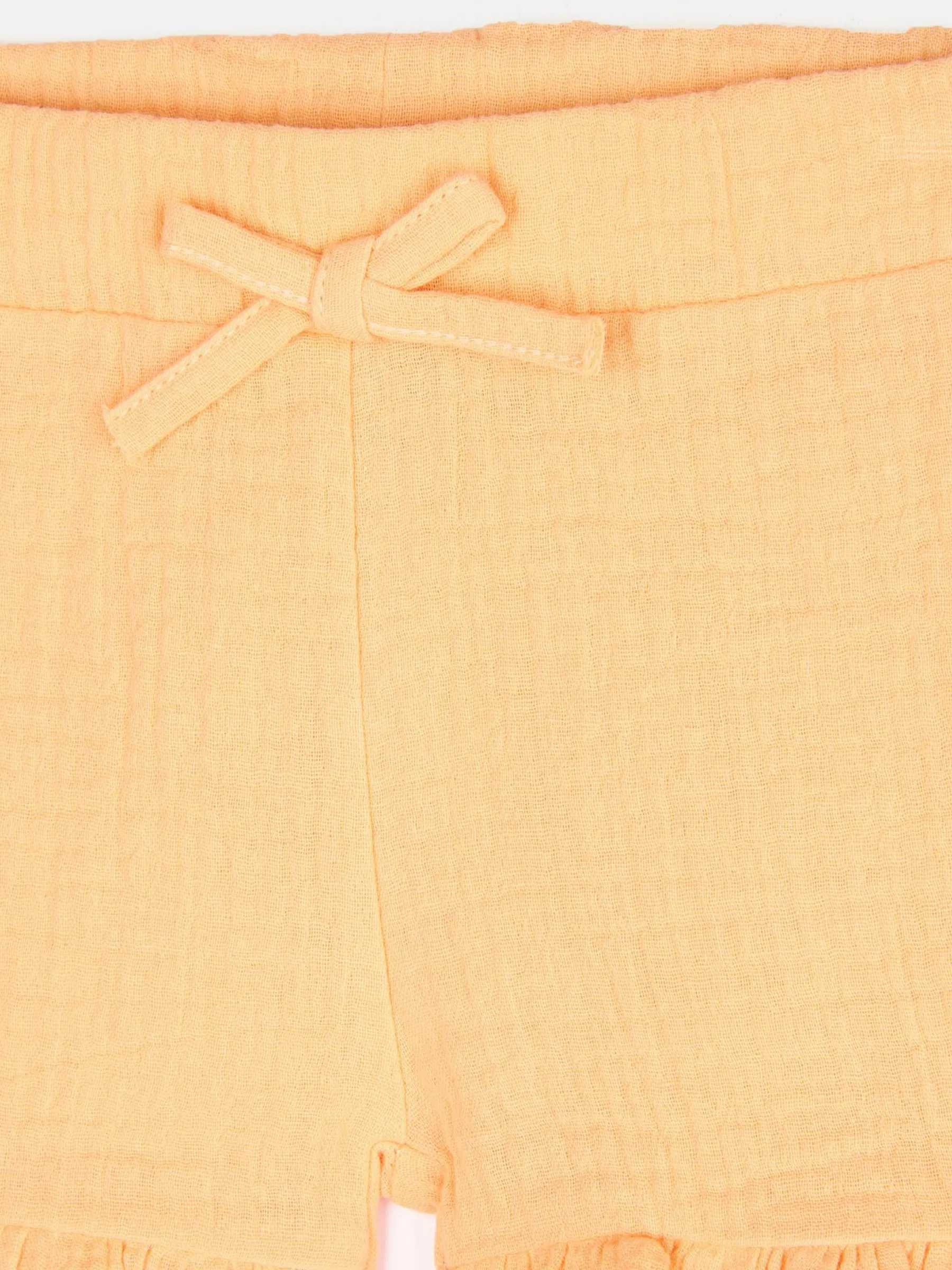 Kolor: beżowy, pomarańczowyKrój: z falbanąTyp: spodenkiDługość: krótkiPattern style: pojedynczy kolorDetal: ze s…