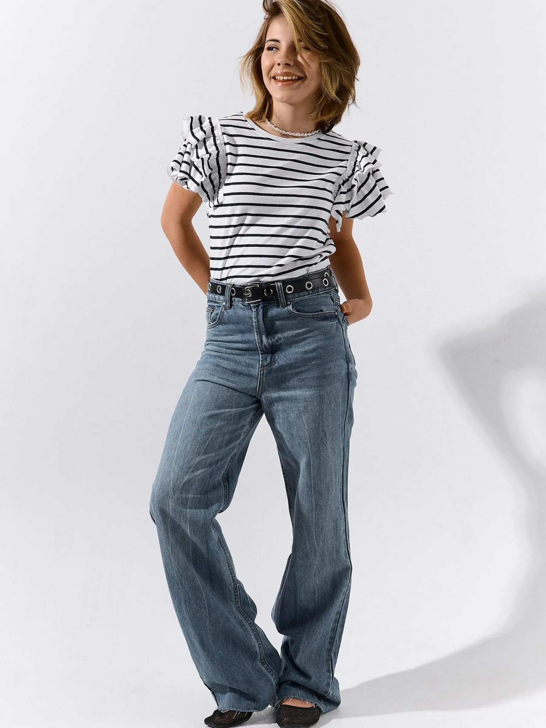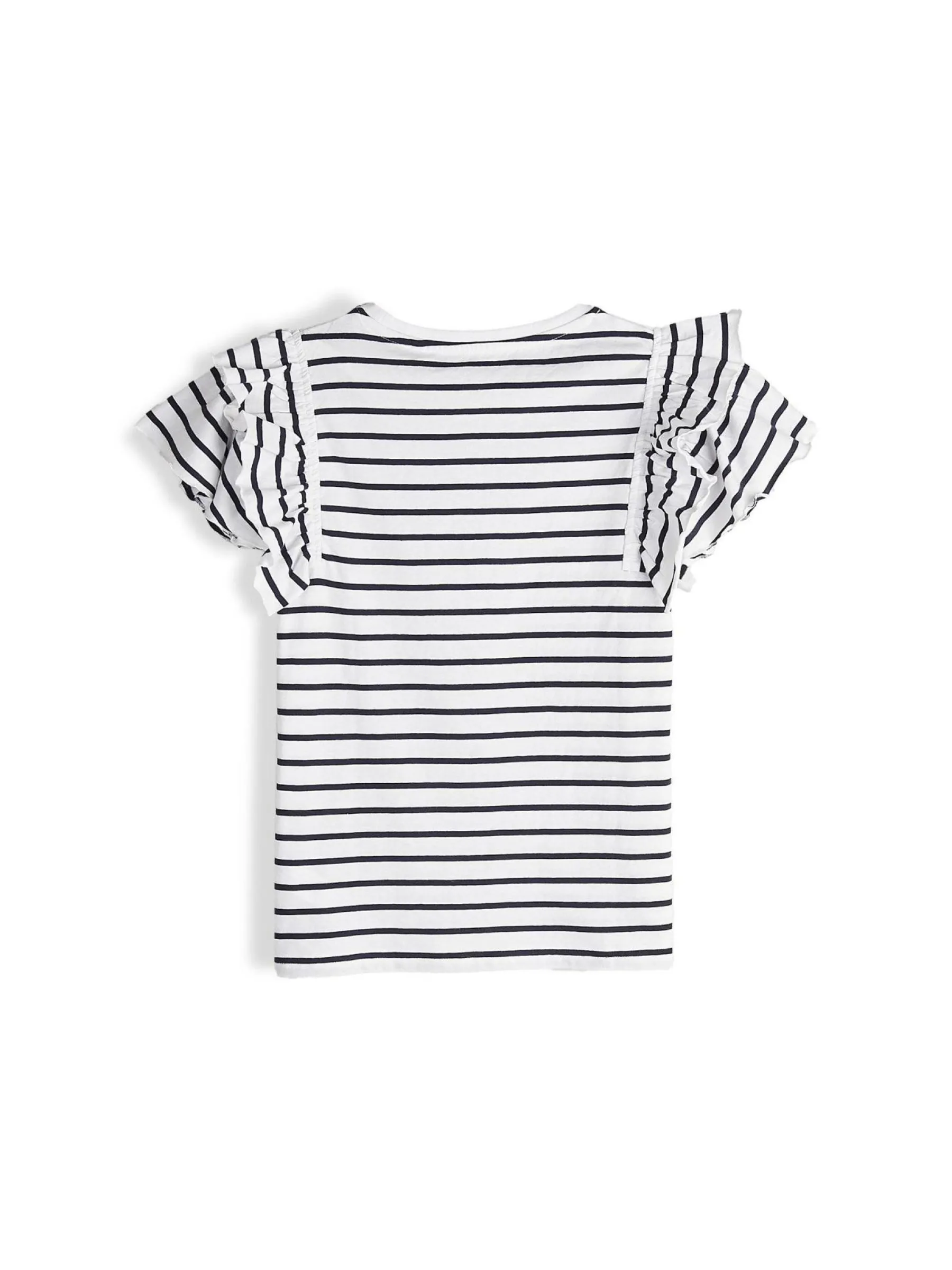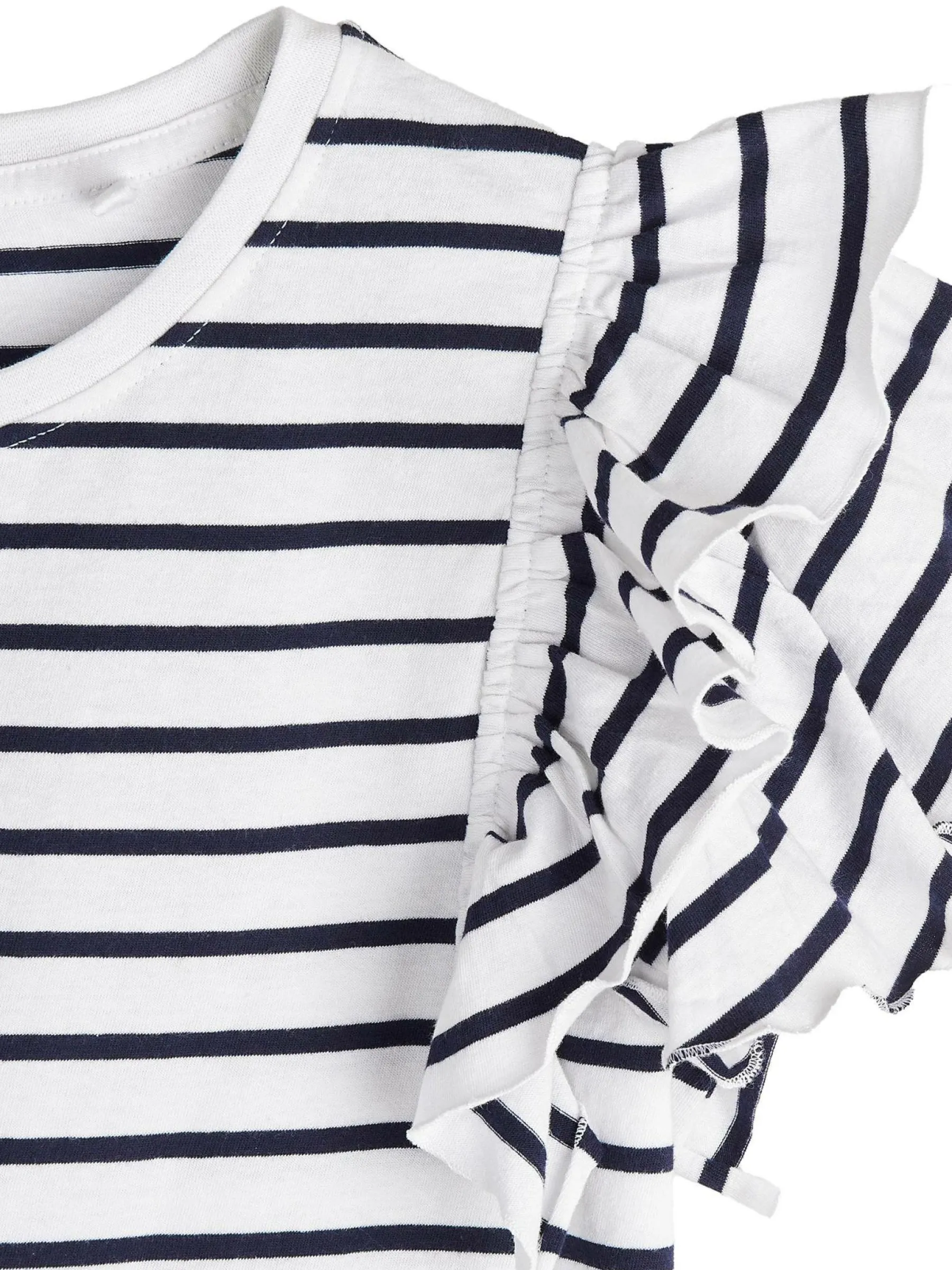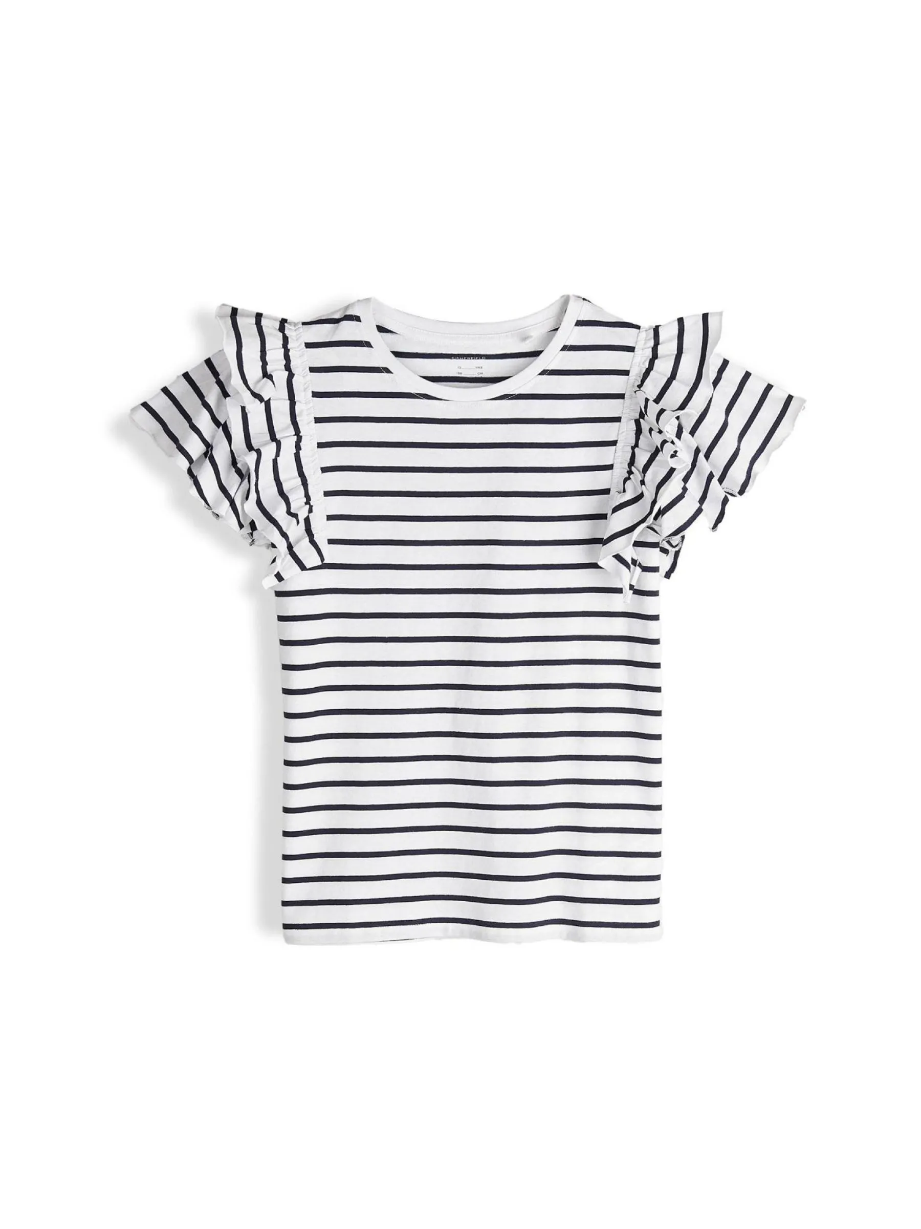 Kolor: granatowyKrój: z falbanąTyp: koszulkaRekaw: krótki rękawDługość: krótkiPattern style: w prążkiDetal: na…