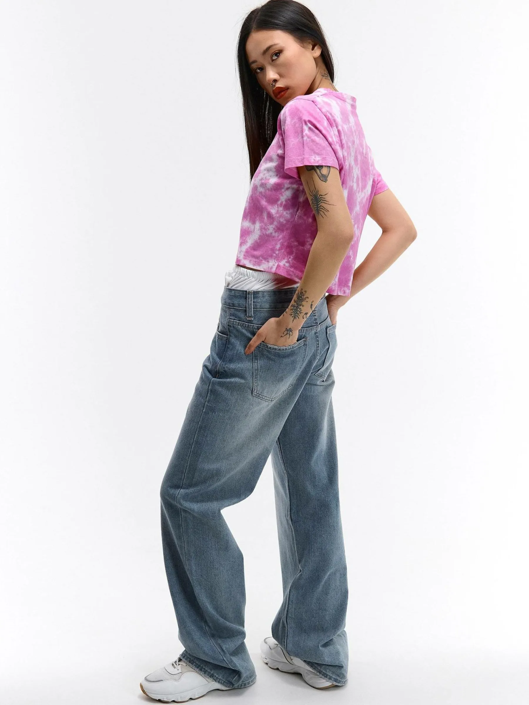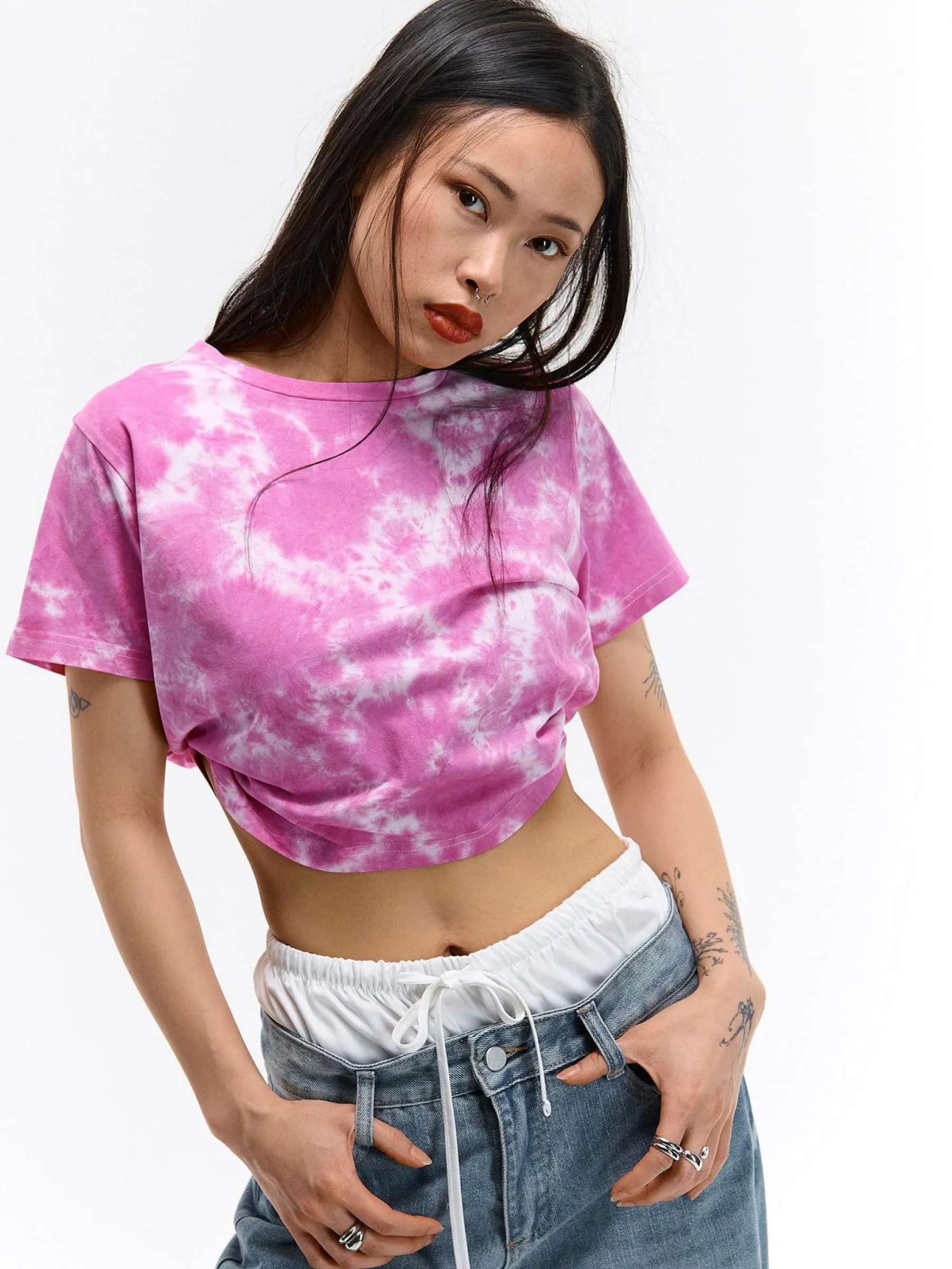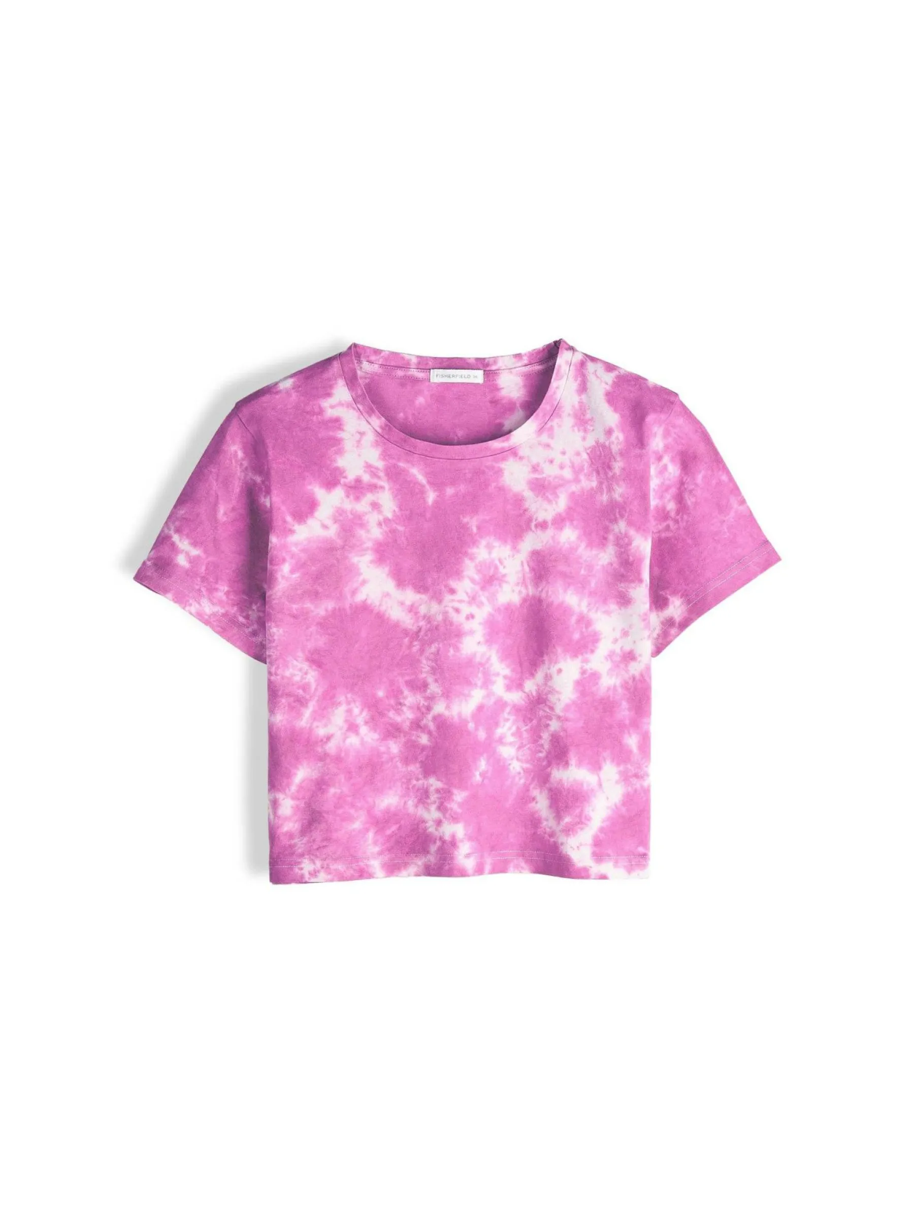 Kolor: różowyKrój: regularTyp: koszulkaRekaw: krótki rękawDługość: krótki topPattern style: tie dyeDetal: nad g…