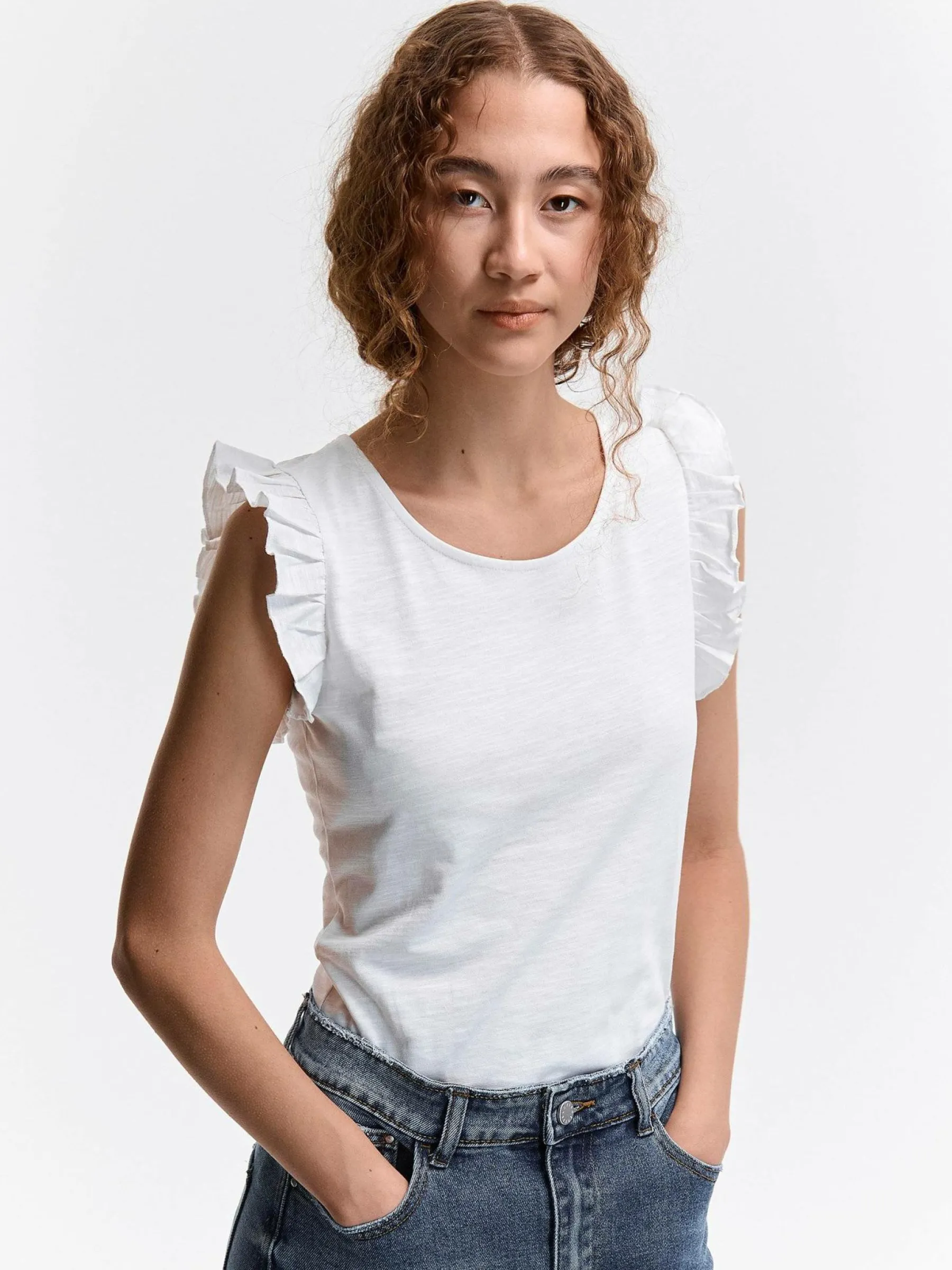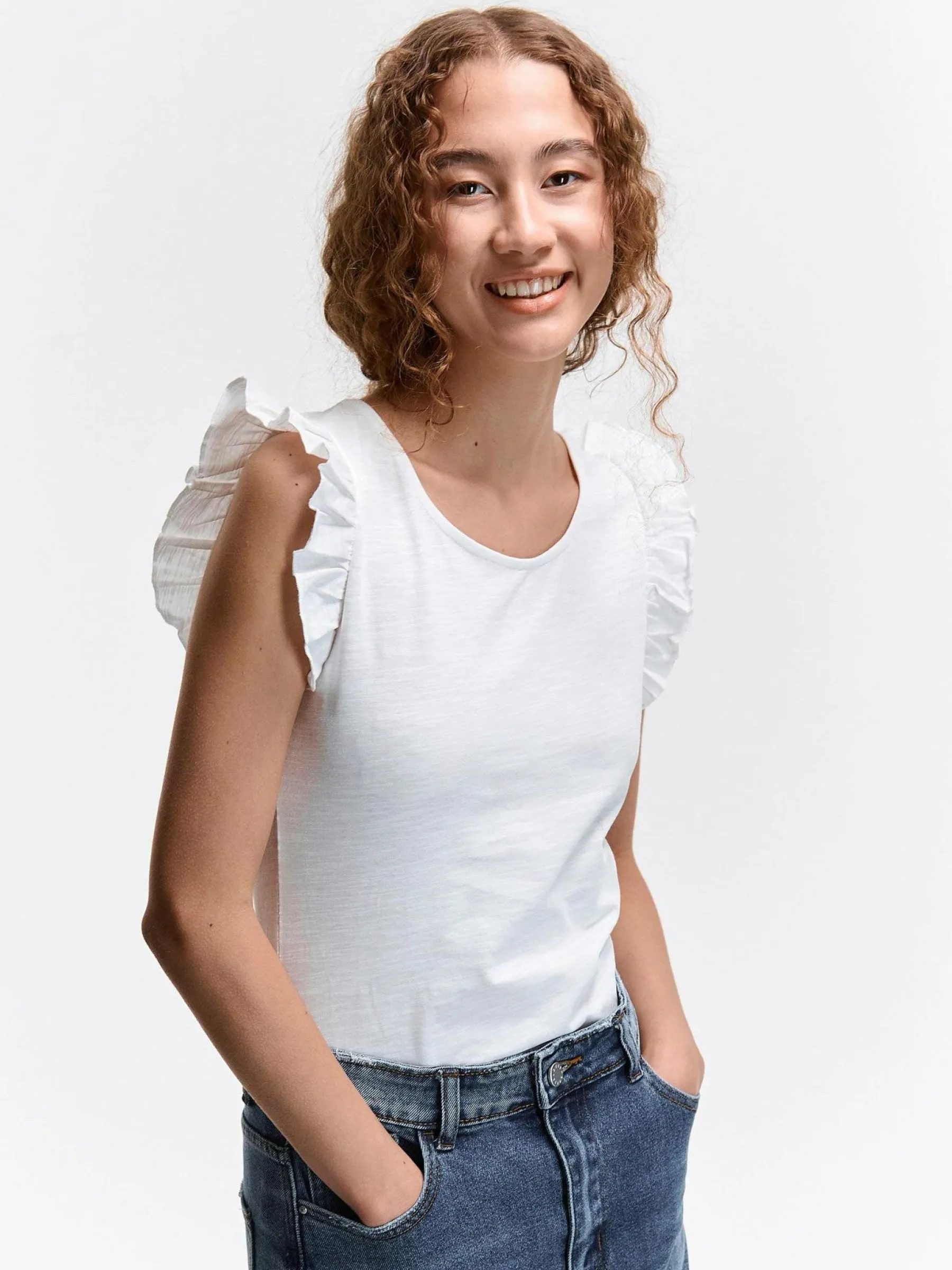 Kolor: białyKrój: z falbanąTyp: podkoszulekRekaw: bez rękawówDługość: krótkiPattern style: pojedynczy kolorDeta…