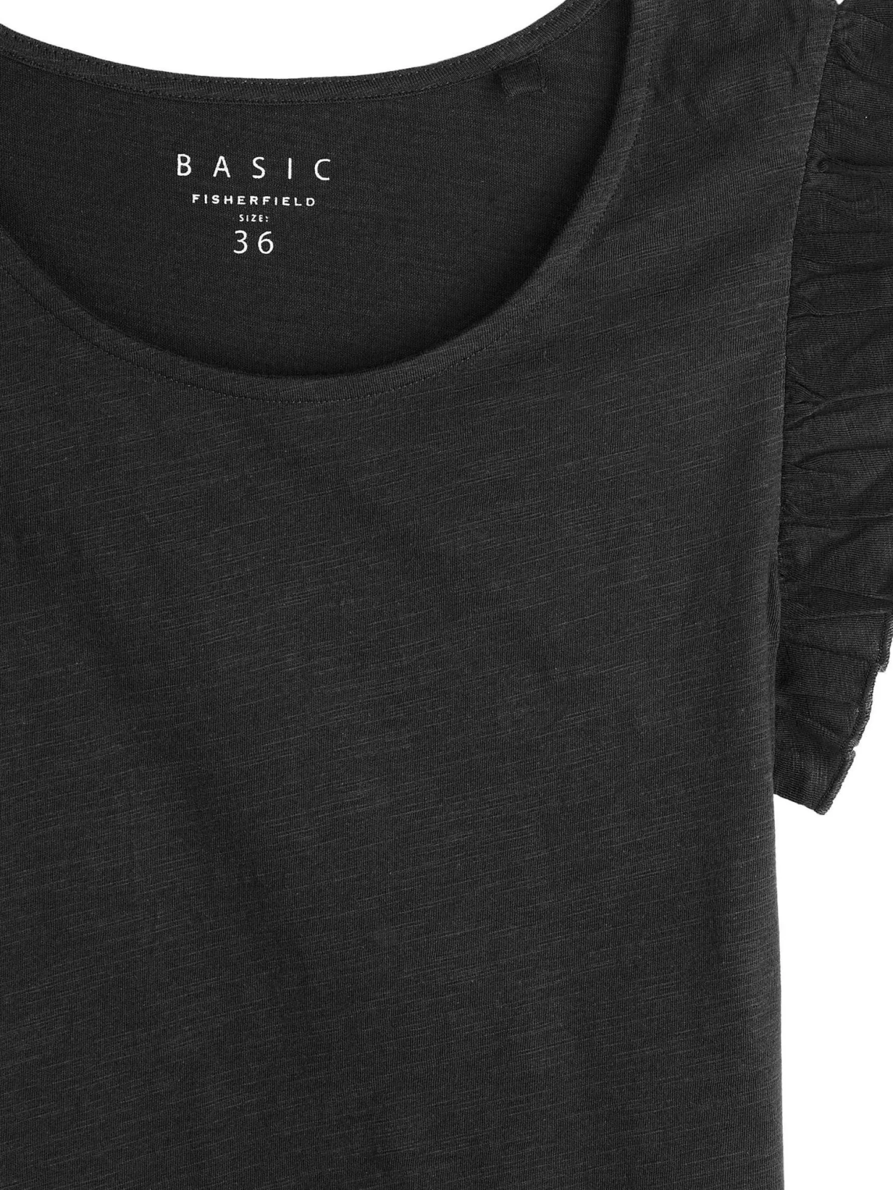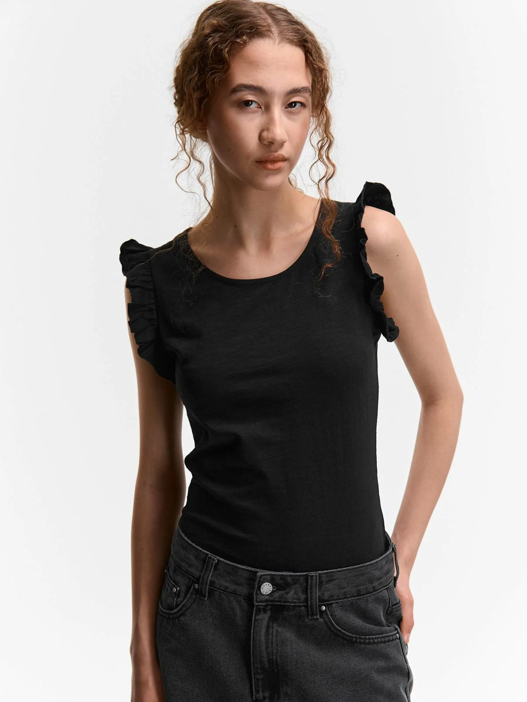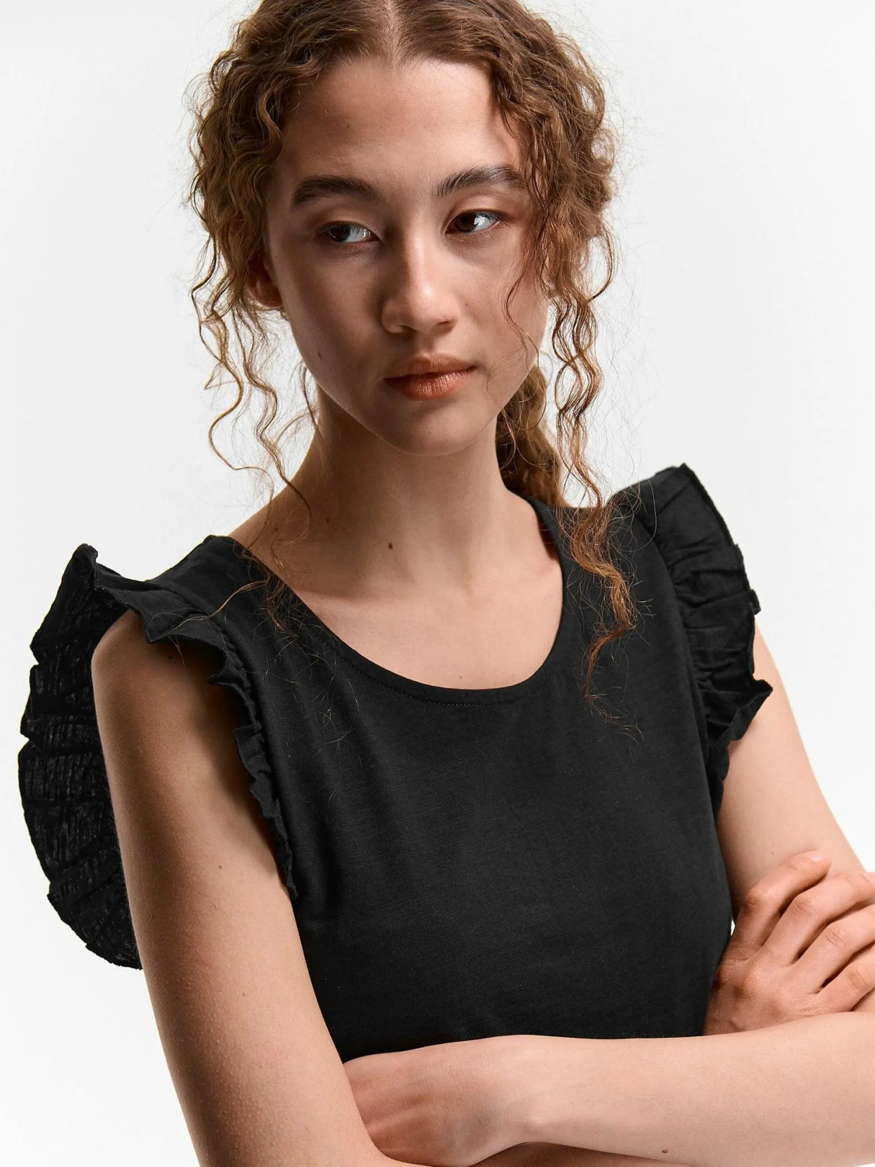 Kolor: czarnyKrój: z falbanąTyp: podkoszulekRekaw: bez rękawówDługość: krótkiPattern style: pojedynczy kolorMate…