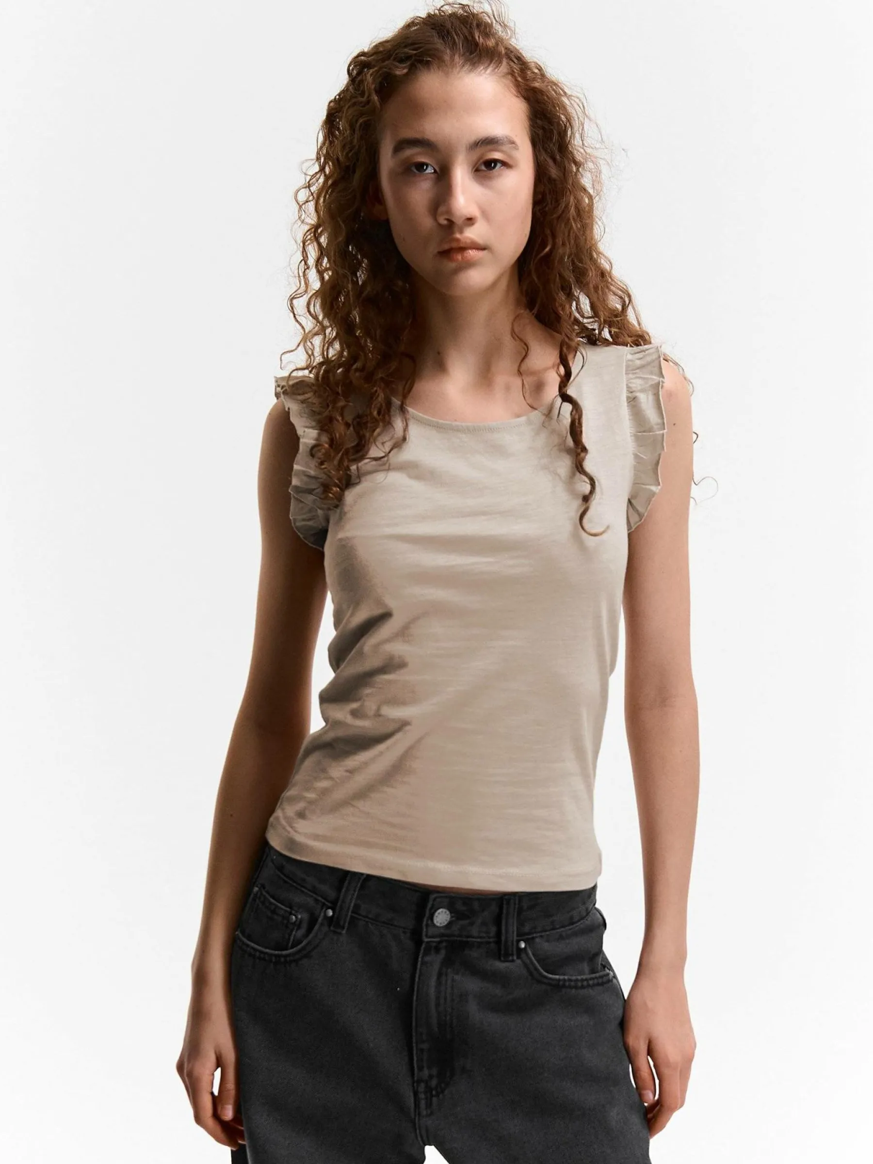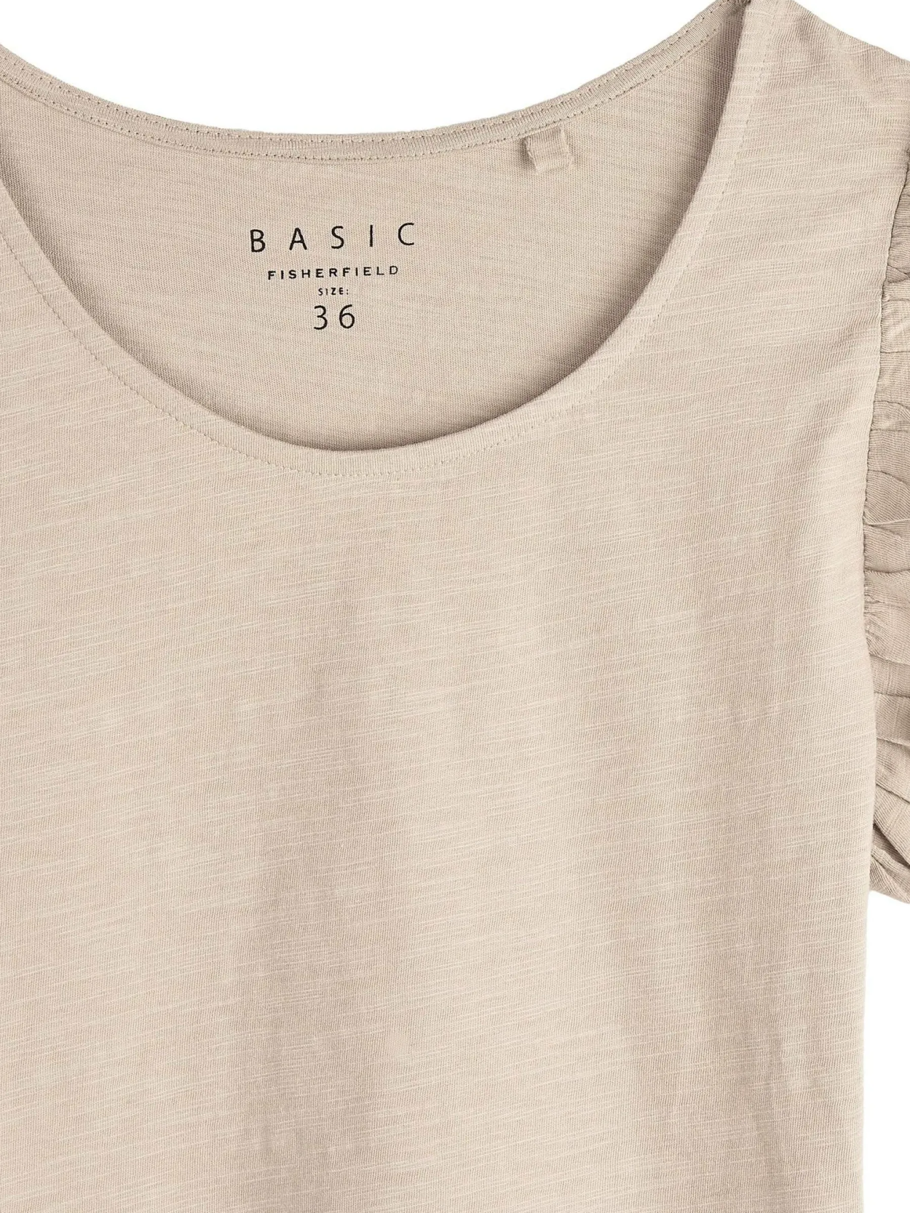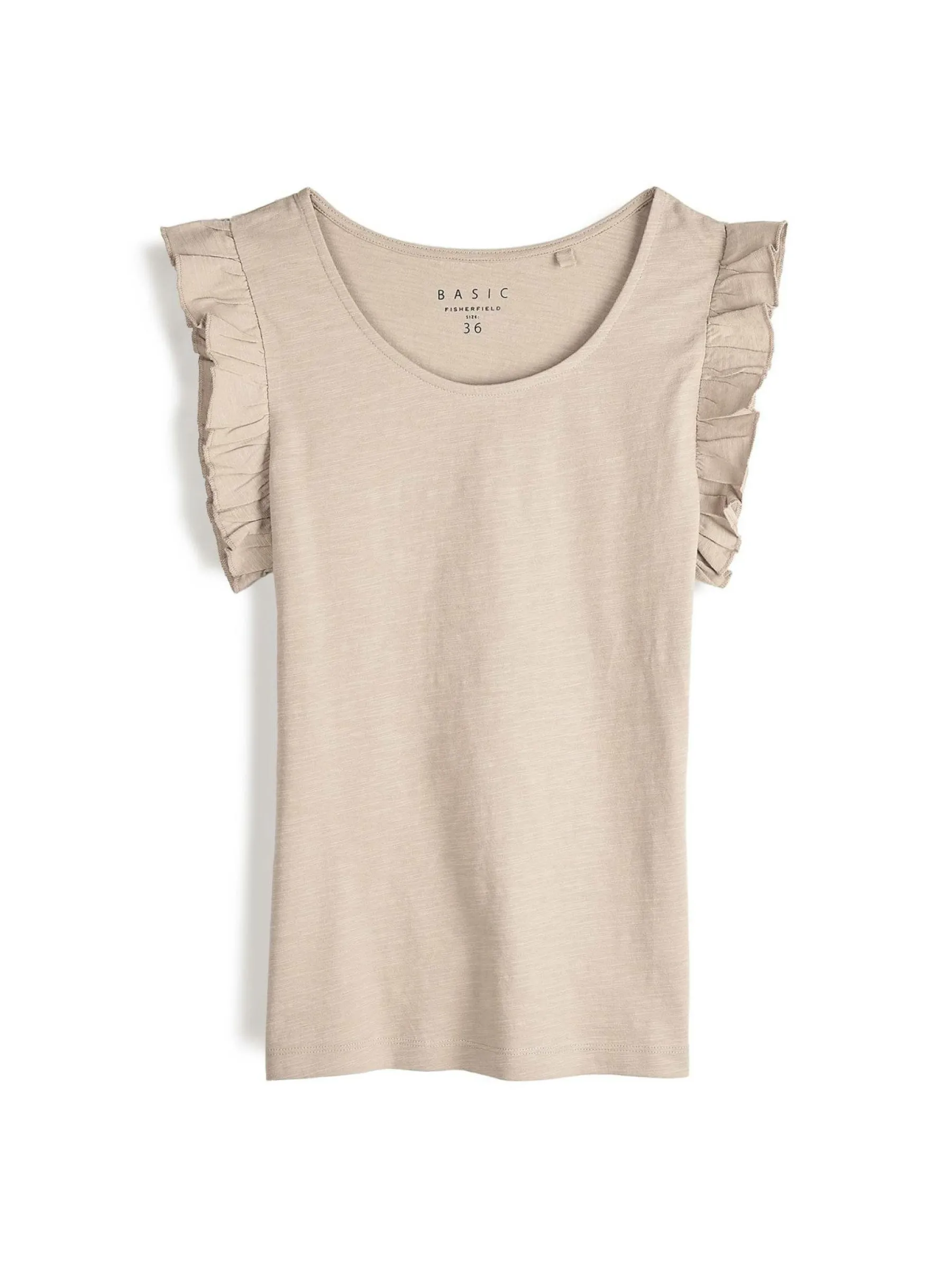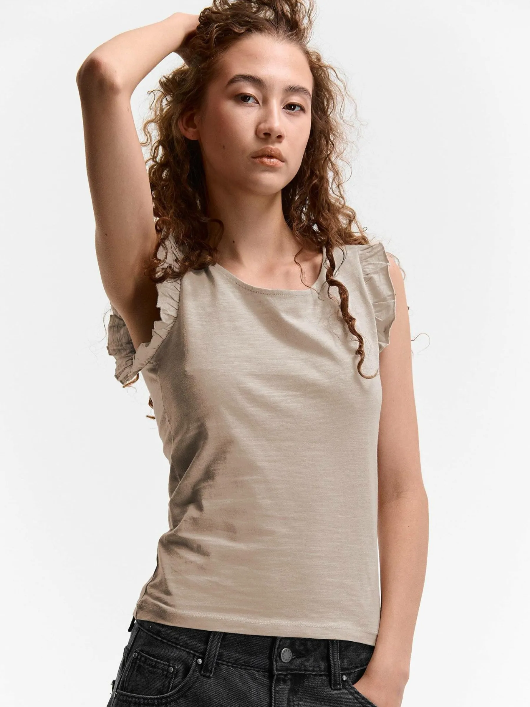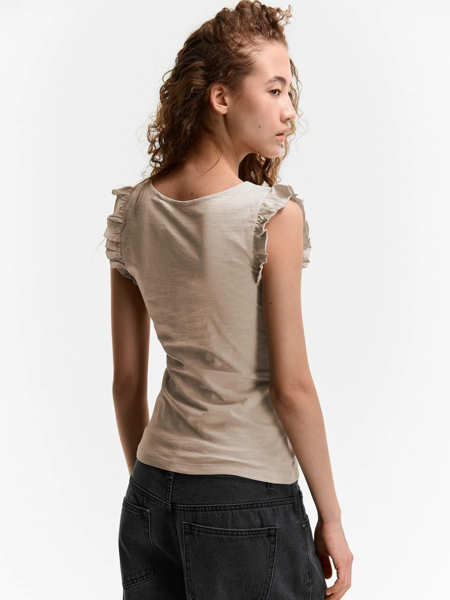 Kolor: beżowyKrój: z falbanąTyp: koszulkaRekaw: krótki rękawDługość: krótkiPattern style: pojedynczy kolorDetal…