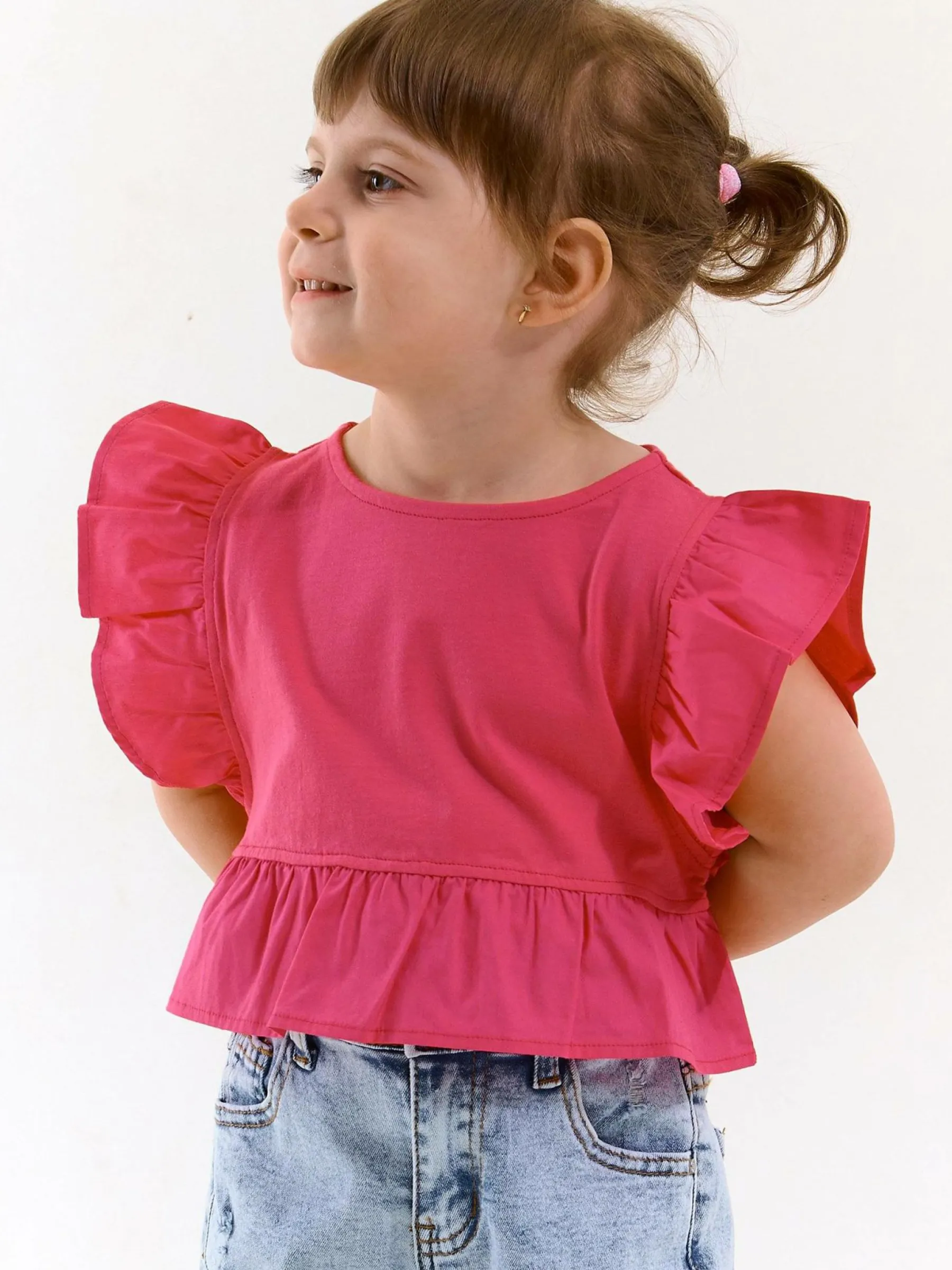 Kolor: różowyKrój: z falbanąTyp: topRekaw: krótki rękawDługość: krótkiPattern style: pojedynczy kolorDetal: na…
