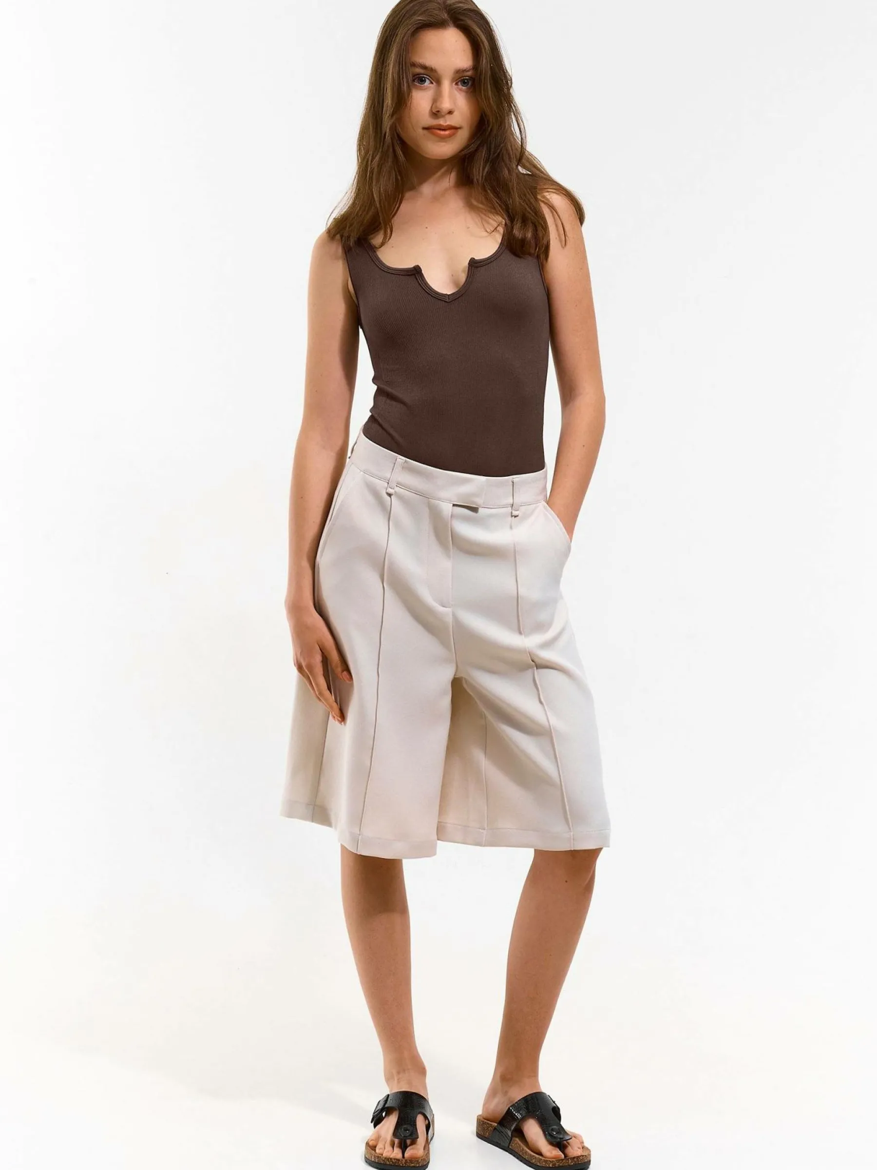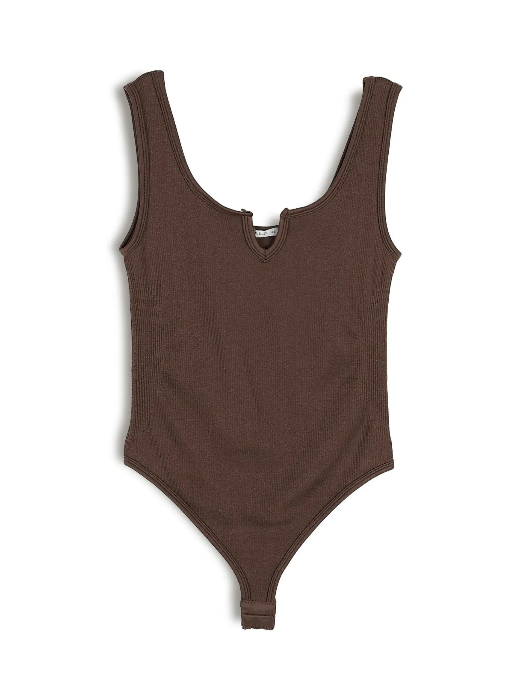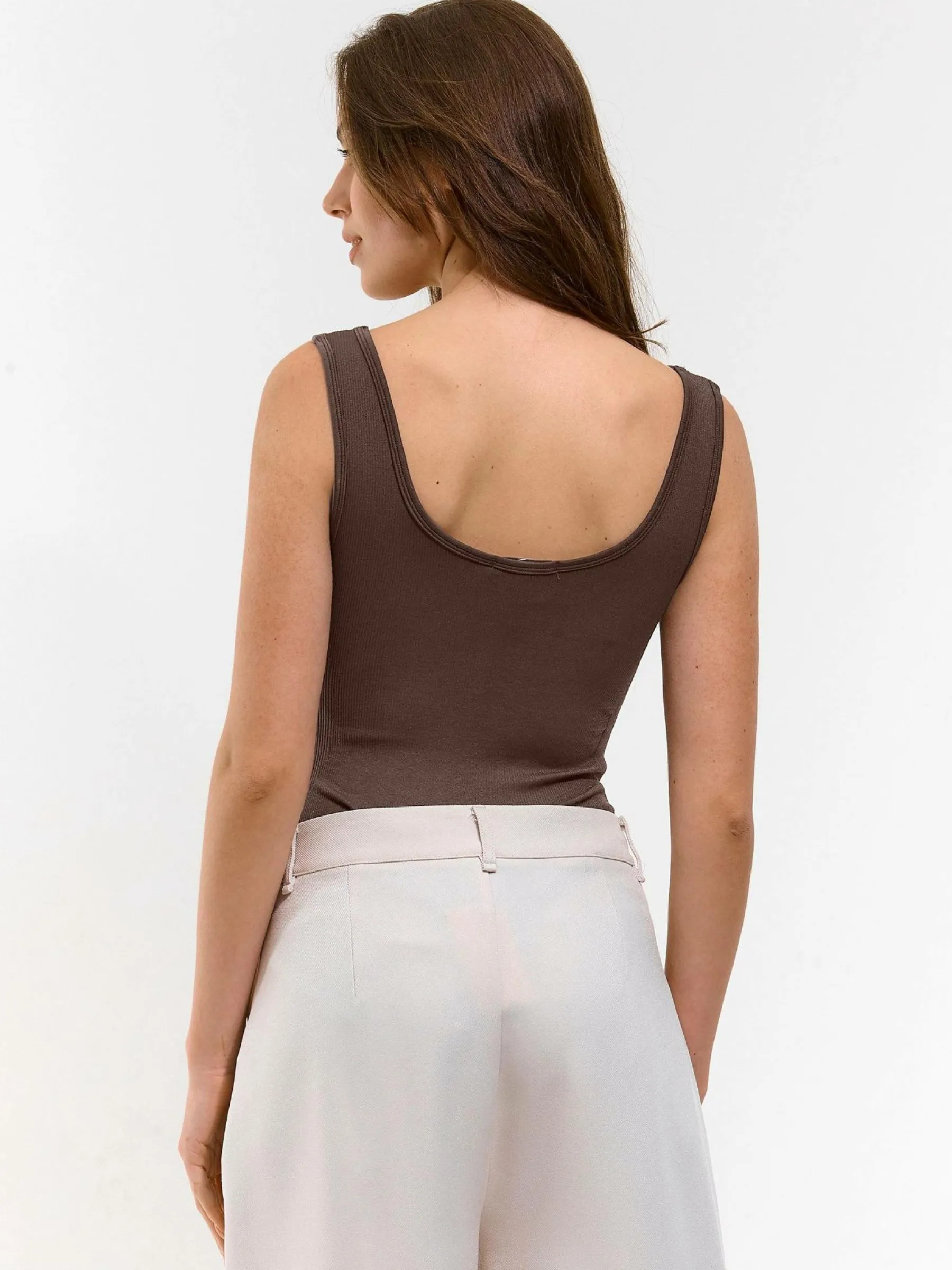 Kolor: brązowyKrój: slimTyp: bodyRekaw: bez rękawówDługość: krótkiPattern style: pojedynczy kolor, żebrowanyDet…