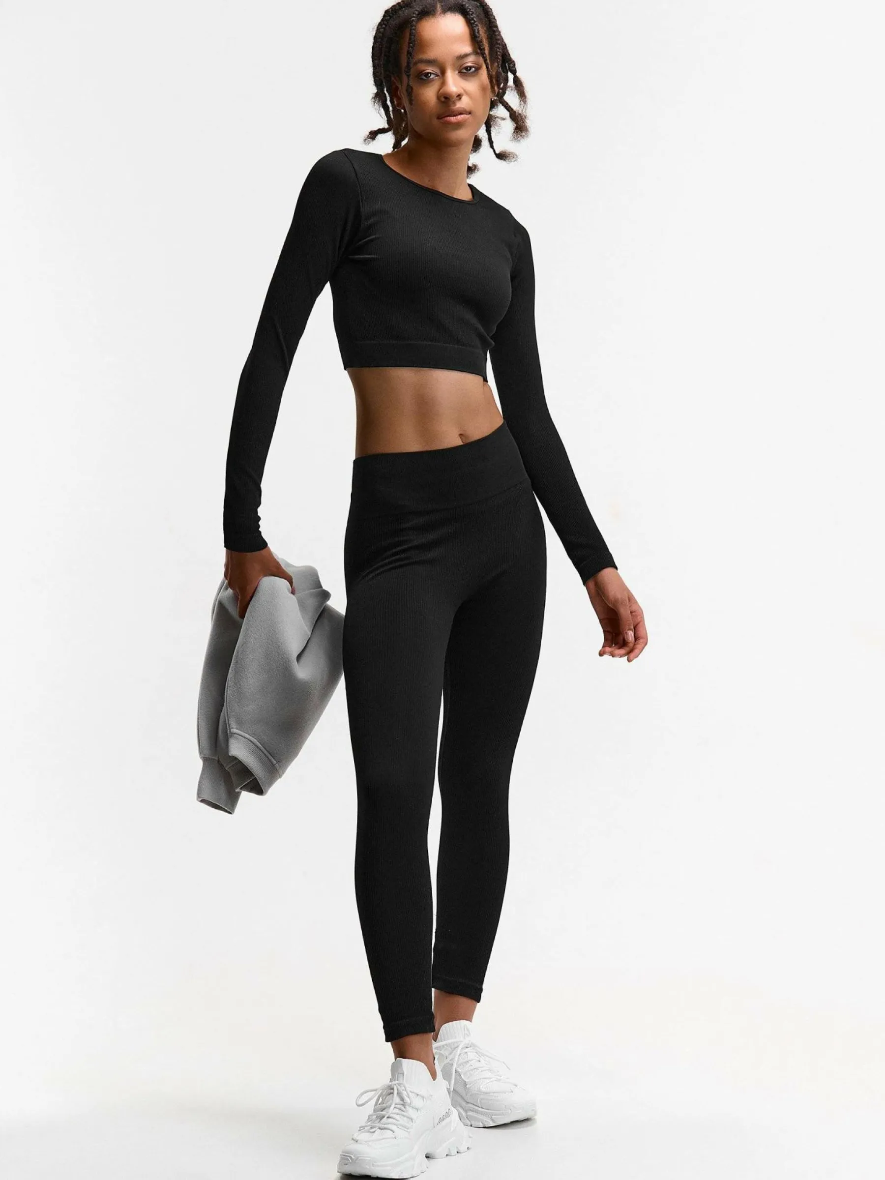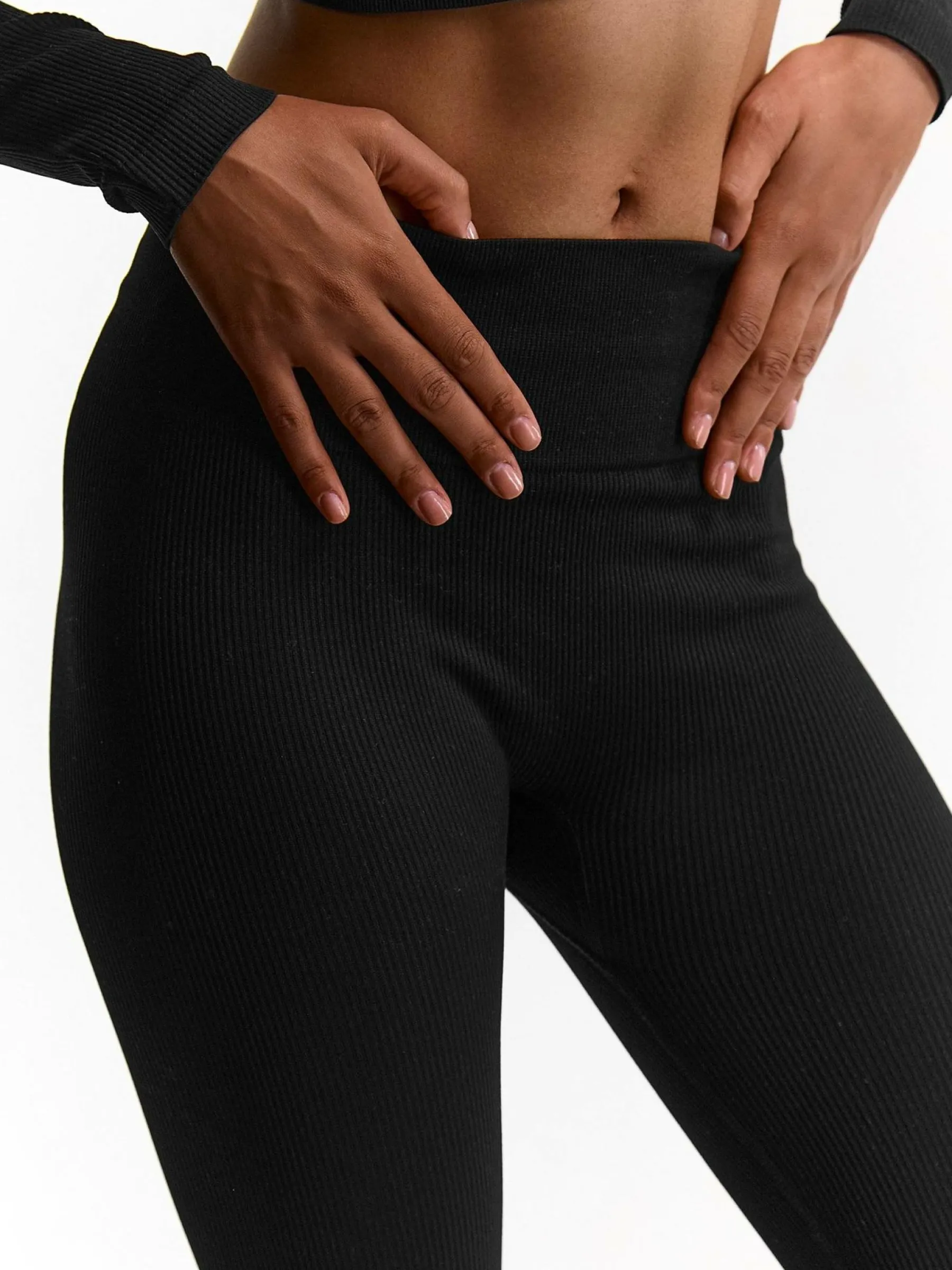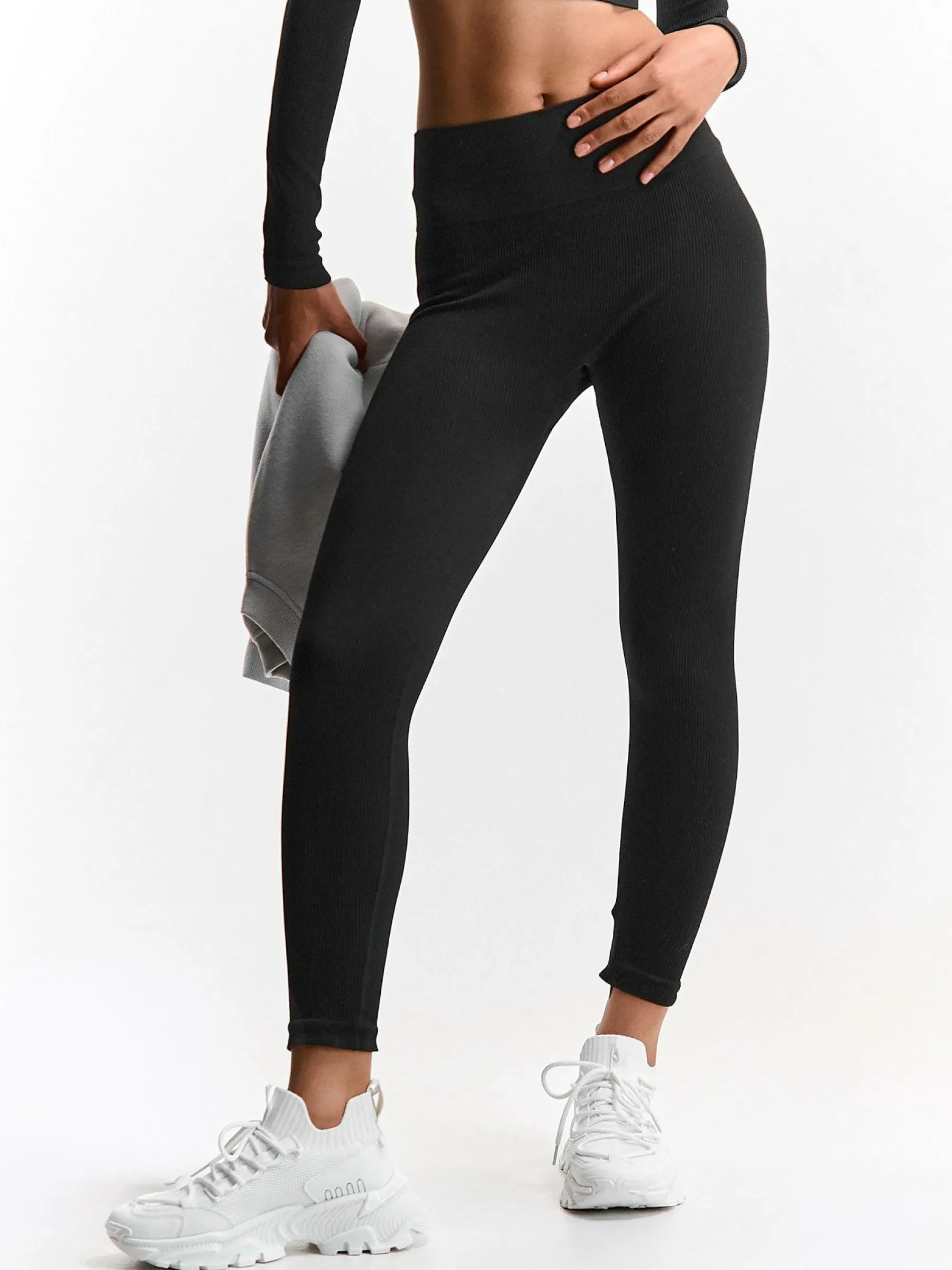 Kolor: czarnyKrój: slim, bezszwowyTyp: legginsyDługość: dlugiePattern style: żebrowany, pojedynczy kolorDetal: z el…