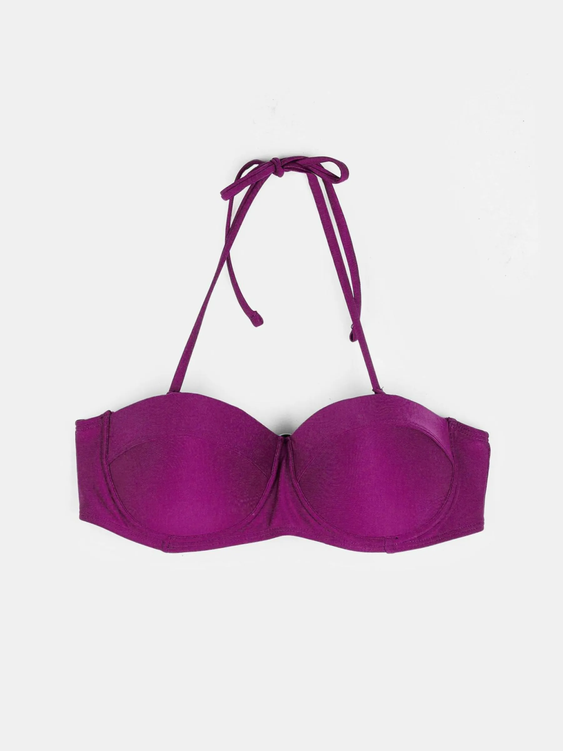 Kolor: purpurowyKrój: bikiniTyp: góra od bikiniPattern style: pojedynczy kolorDetal: z wiązaniem na szyi, wzmocnionyM…