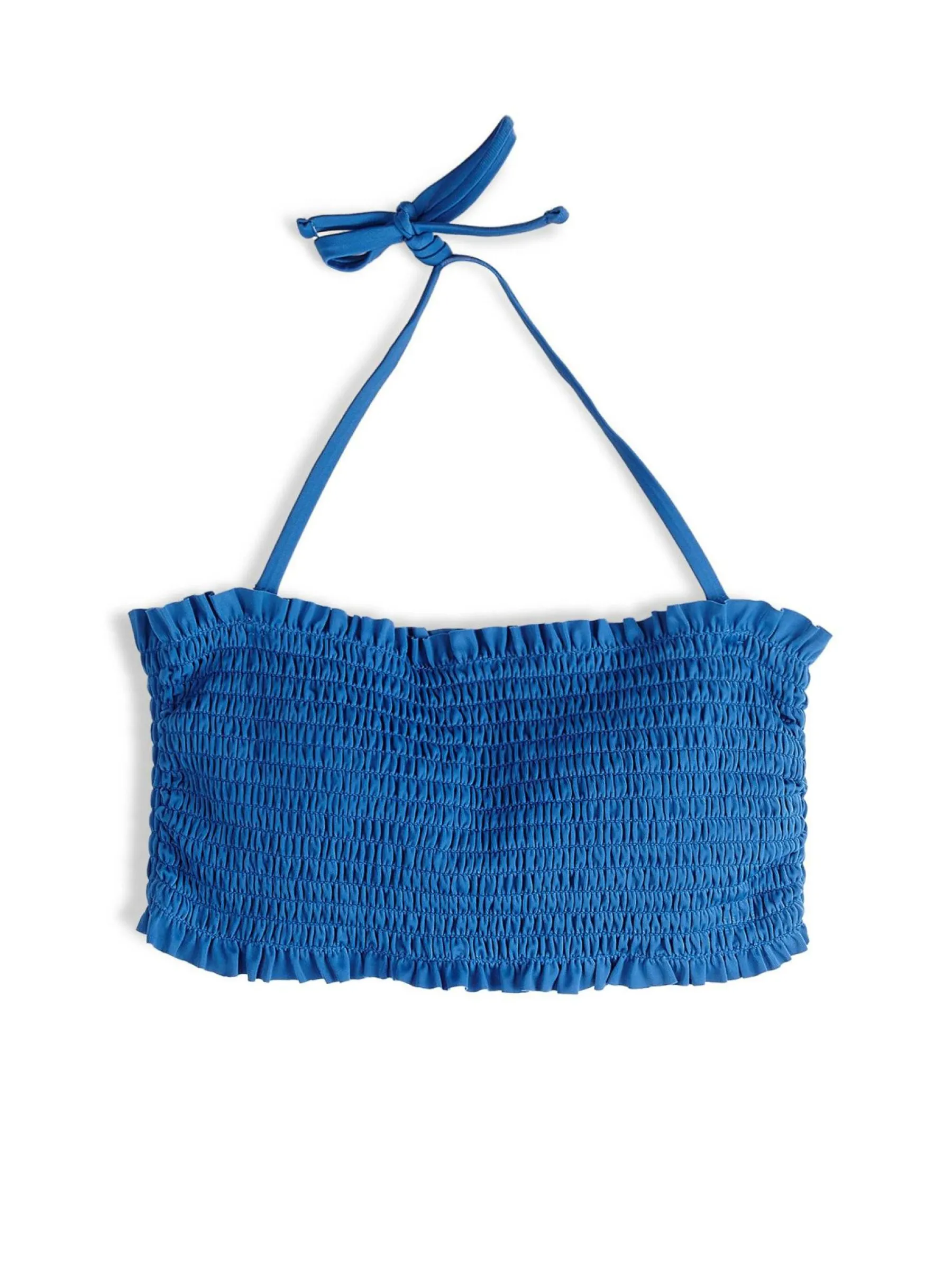 Kolor: niebieskiKrój: z marszczeniemTyp: góra od bikiniPattern style: pojedynczy kolorDetal: z wiązaniem na szyi, wyj…