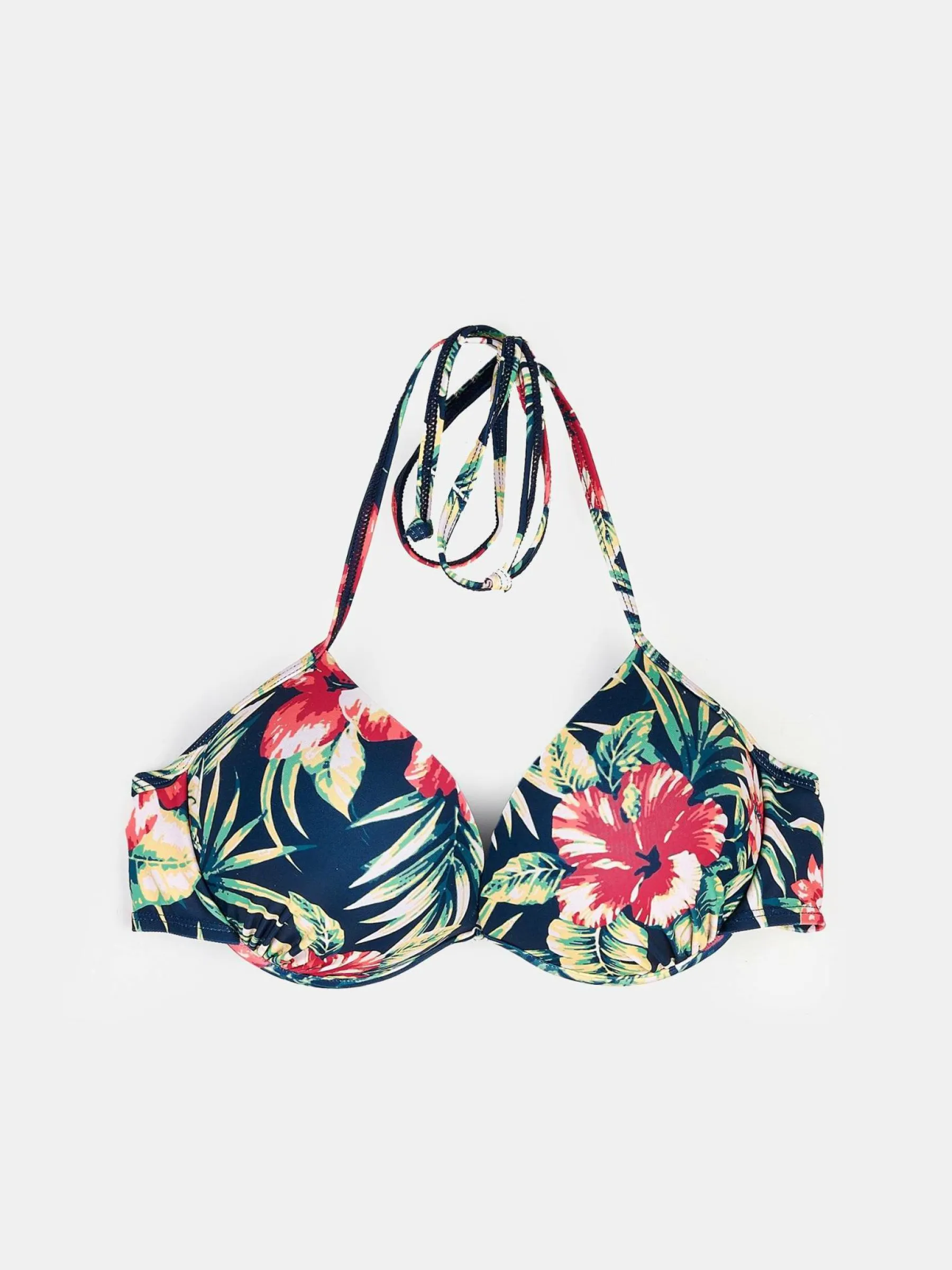 Kolor: granatowyKrój: bikiniTyp: góra od bikiniPattern style: z nadrukiem, kwiatoweDetal: z wiązaniem na szyi, z koś…