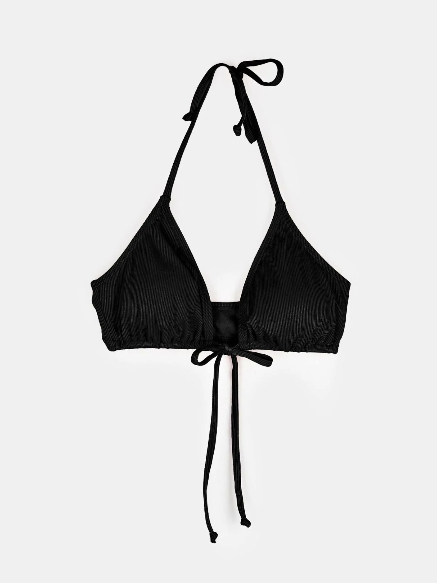 Kolor: czarnyKrój: bikiniTyp: góra od bikiniPattern style: pojedynczy kolor, żebrowanyDetal: z wiązaniem na szyi, wy…