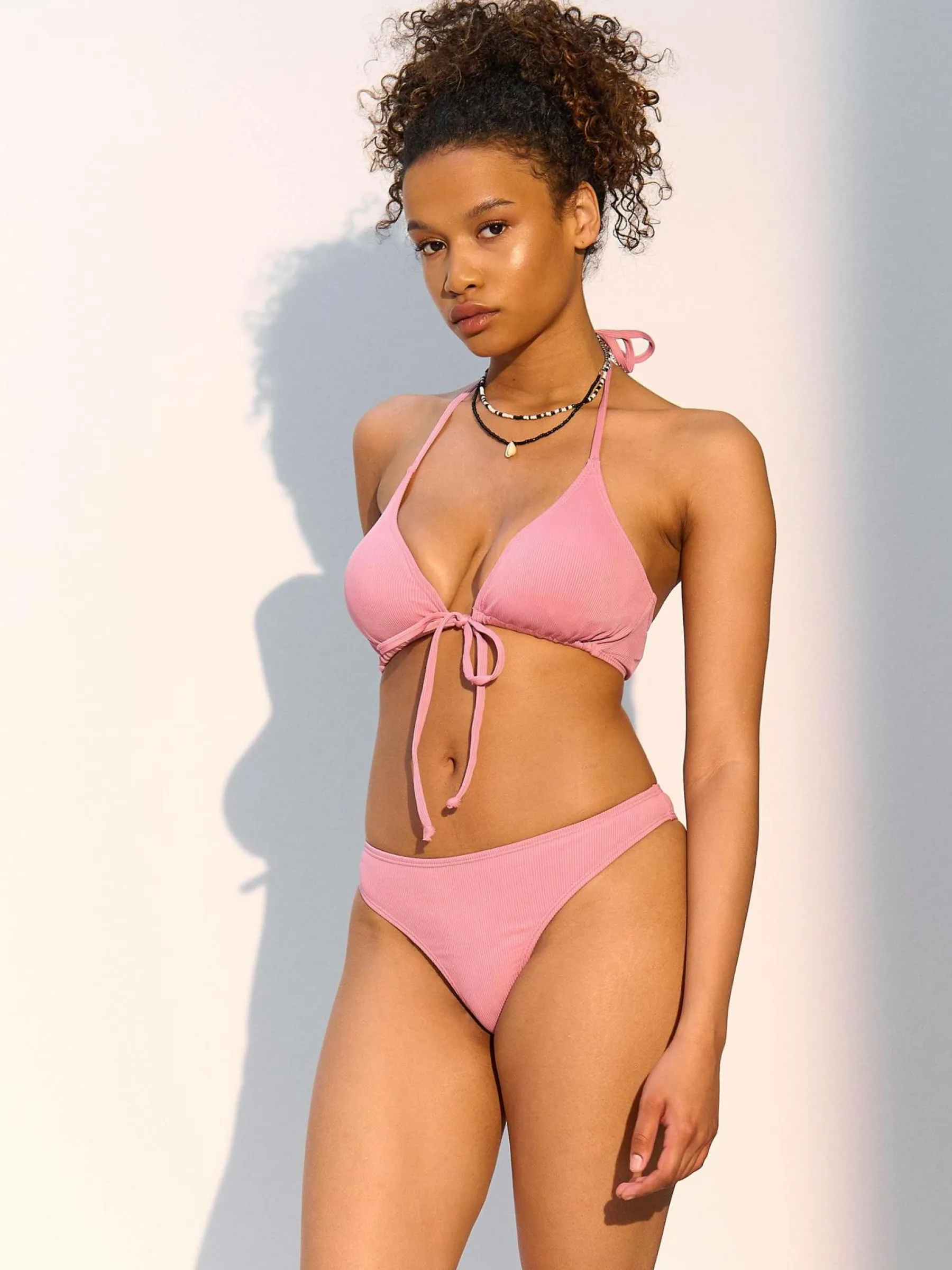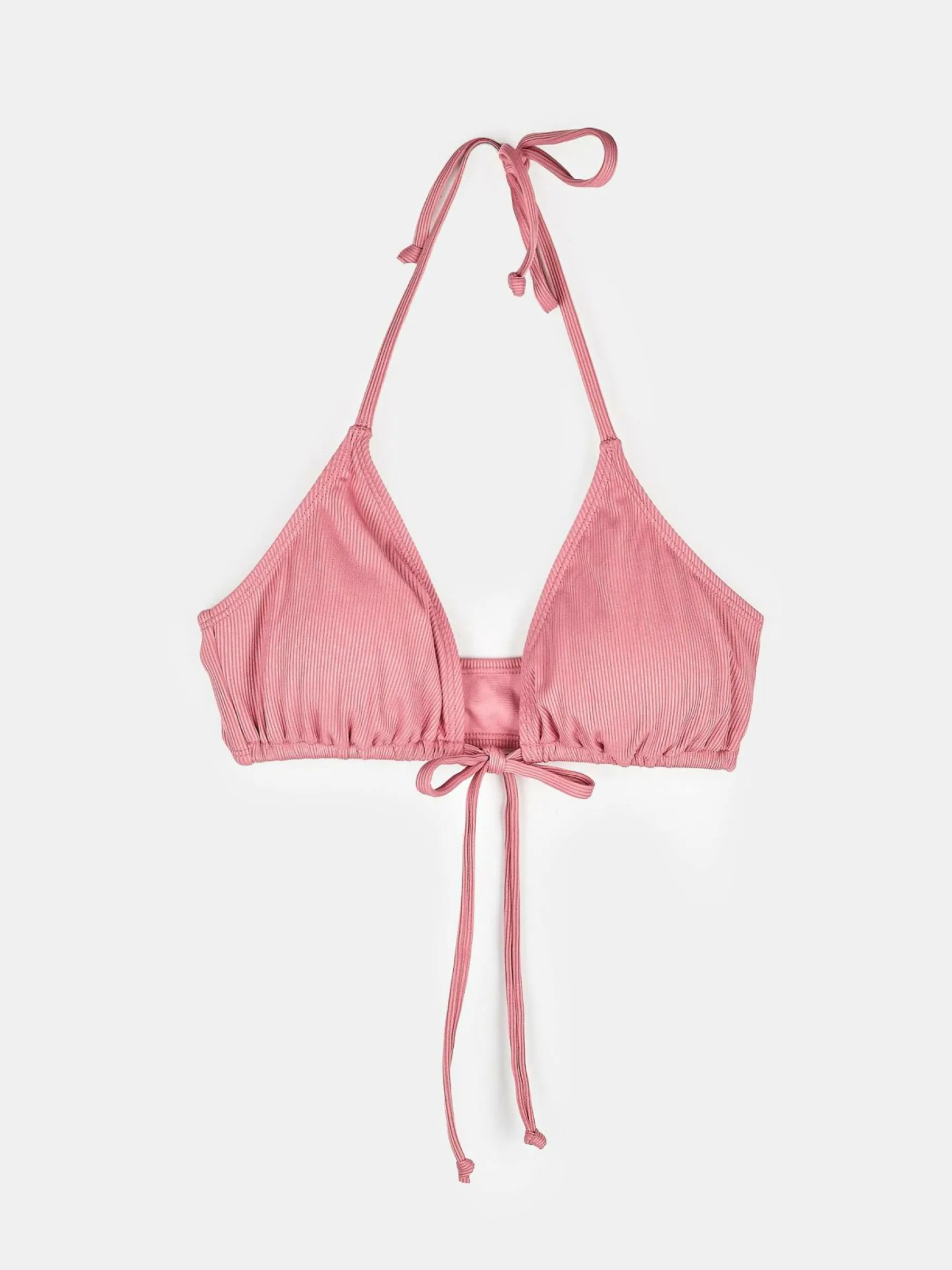 Kolor: różowyKrój: bikiniTyp: góra od bikiniPattern style: pojedynczy kolor, żebrowanyDetal: z wiązaniem na szyi, …