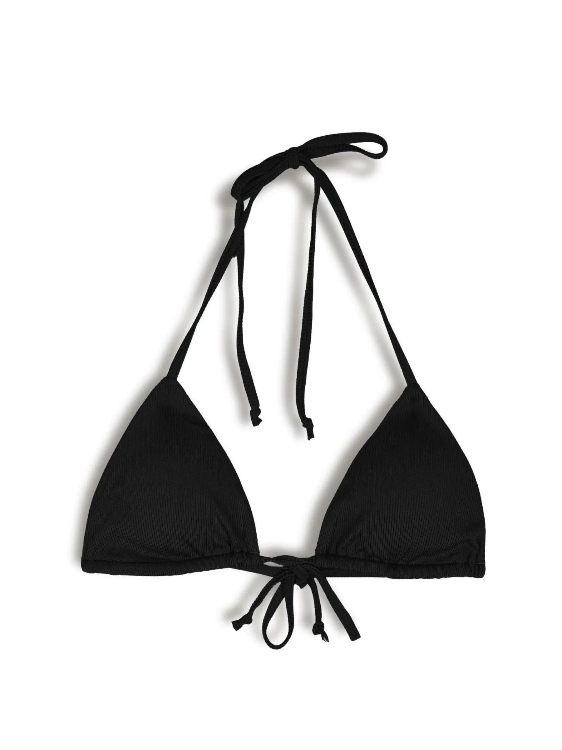 Kolor: czarnyKrój: bikiniTyp: góra od bikiniPattern style: pojedynczy kolor, żebrowanyDetal: z wiązaniem na szyi, tr…