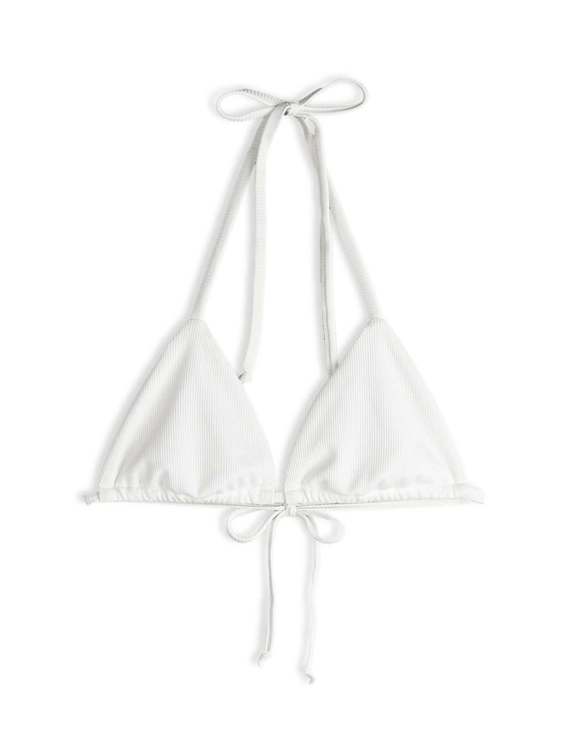 Kolor: białyKrój: bikiniTyp: góra od bikiniPattern style: pojedynczy kolor, żebrowanyDetal: z wiązaniem na szyi, tr…