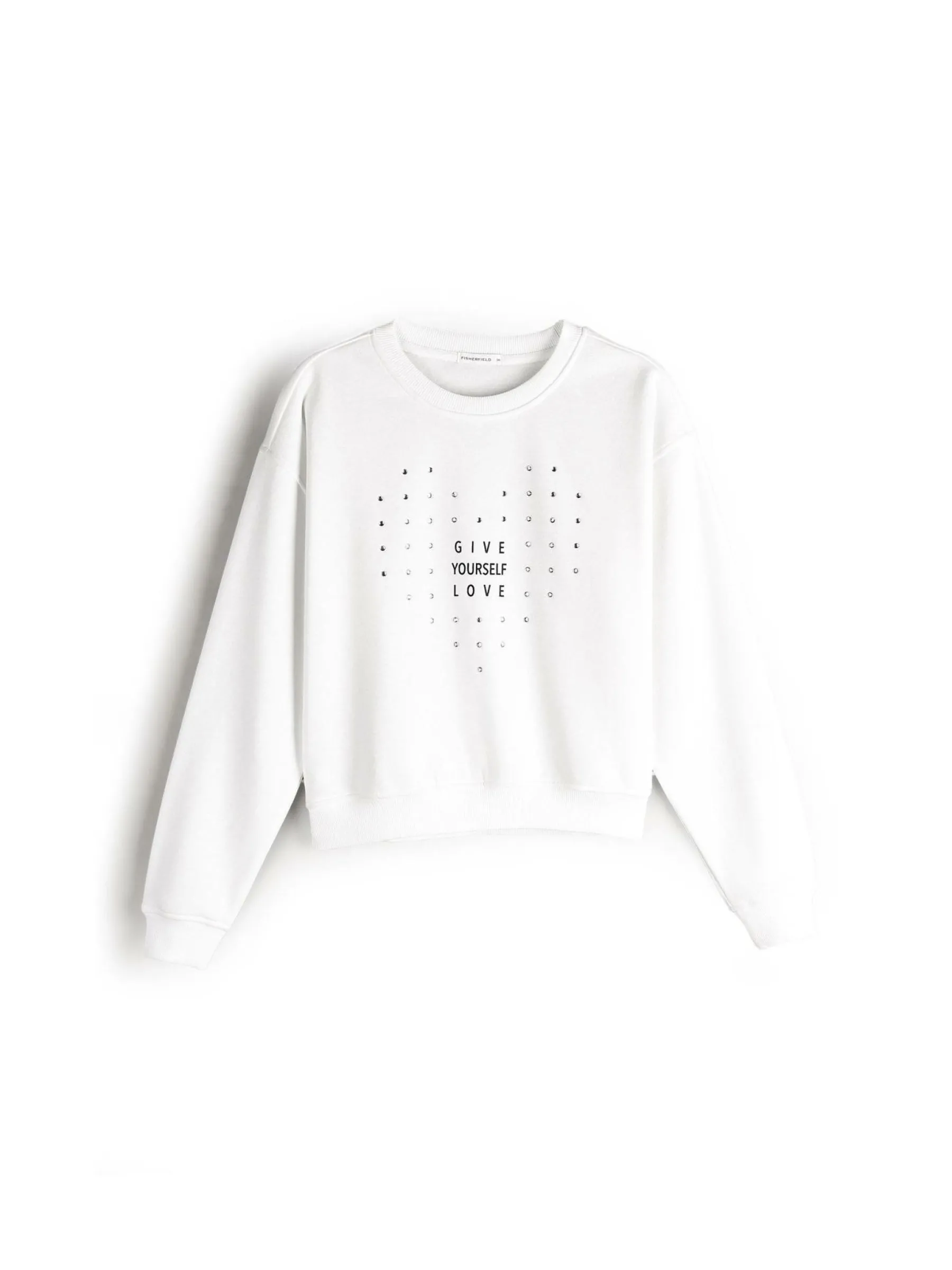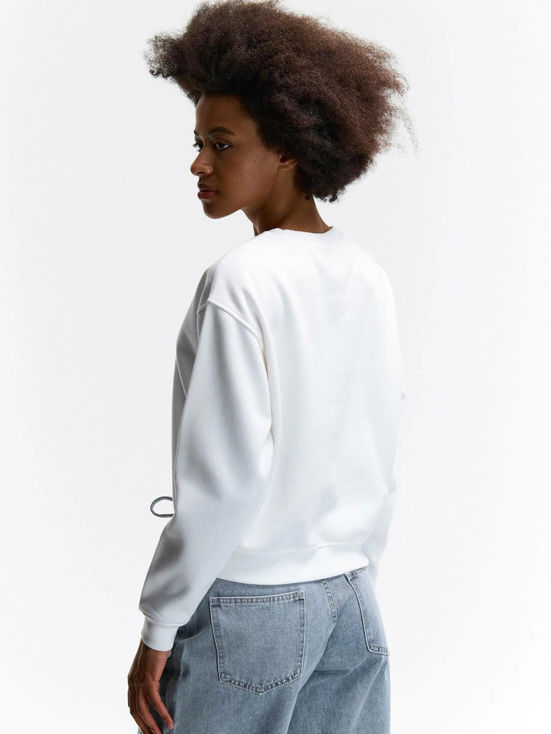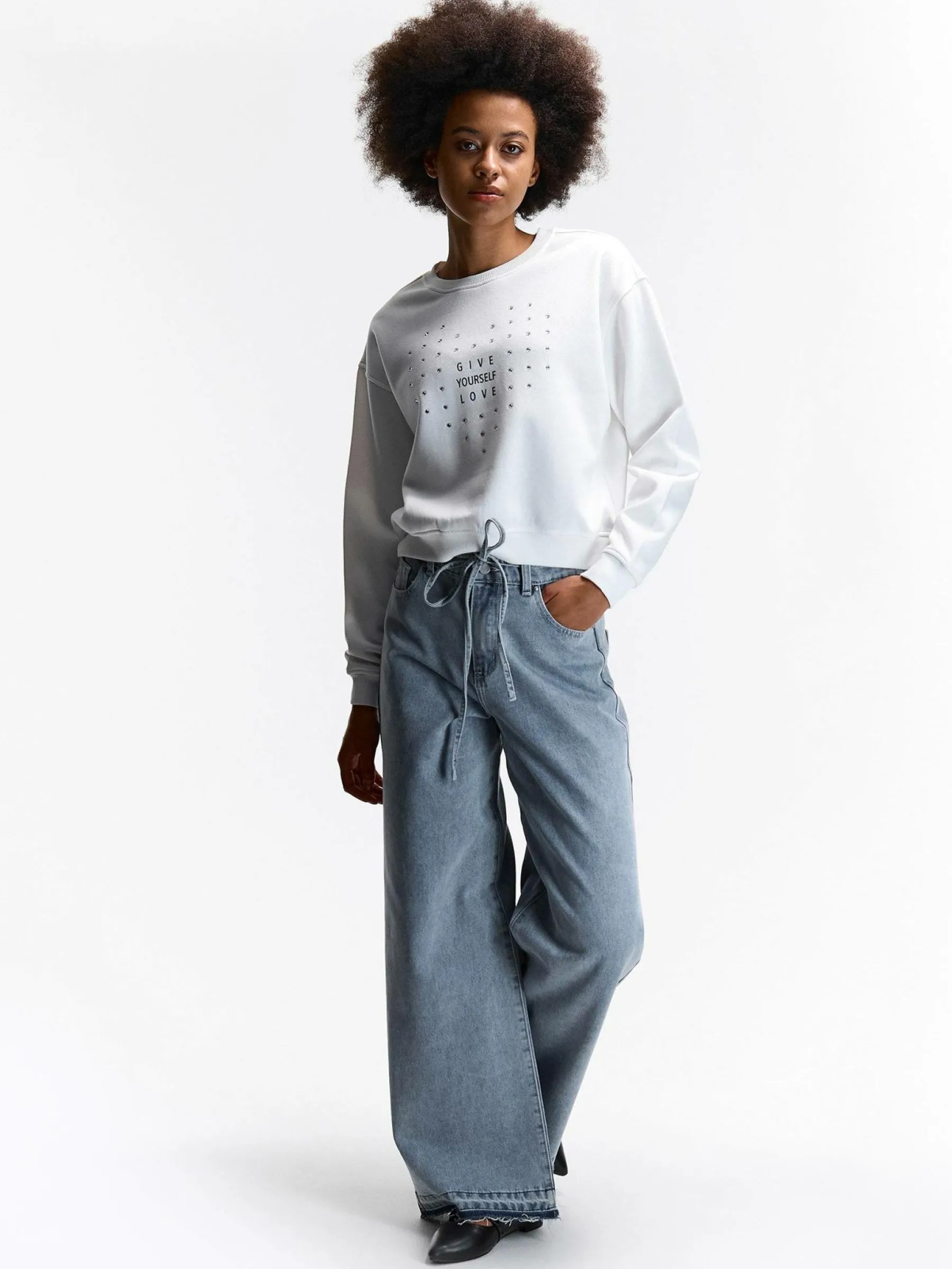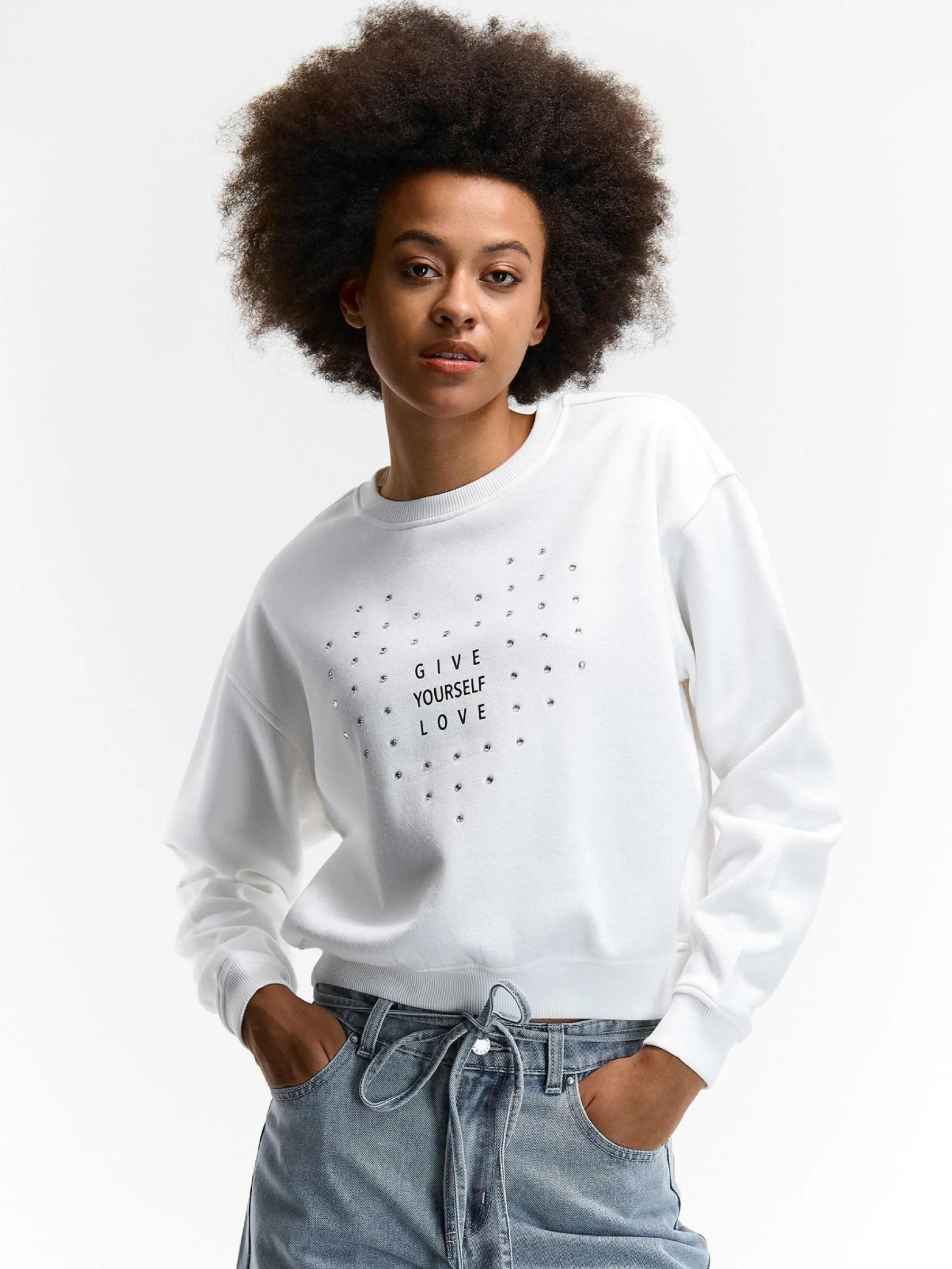 Kolor: białyKrój: regularTyp: bluzaRekaw: długi rękawDługość: krótkiPattern style: z napisemDetal: z kamieniami,…