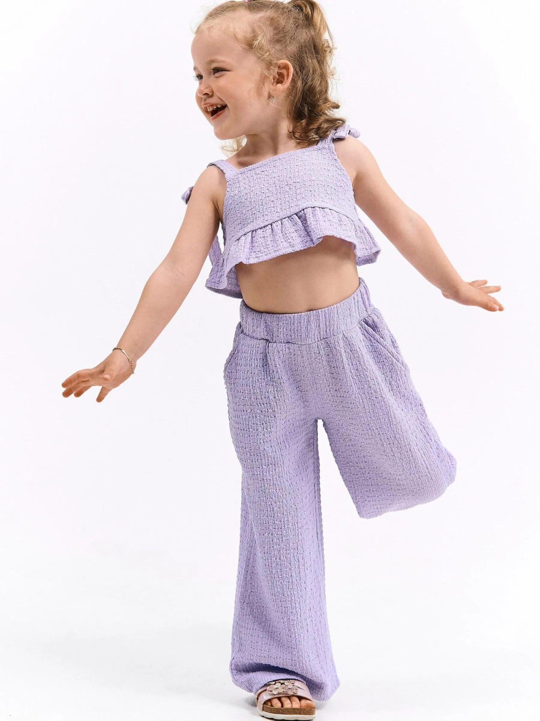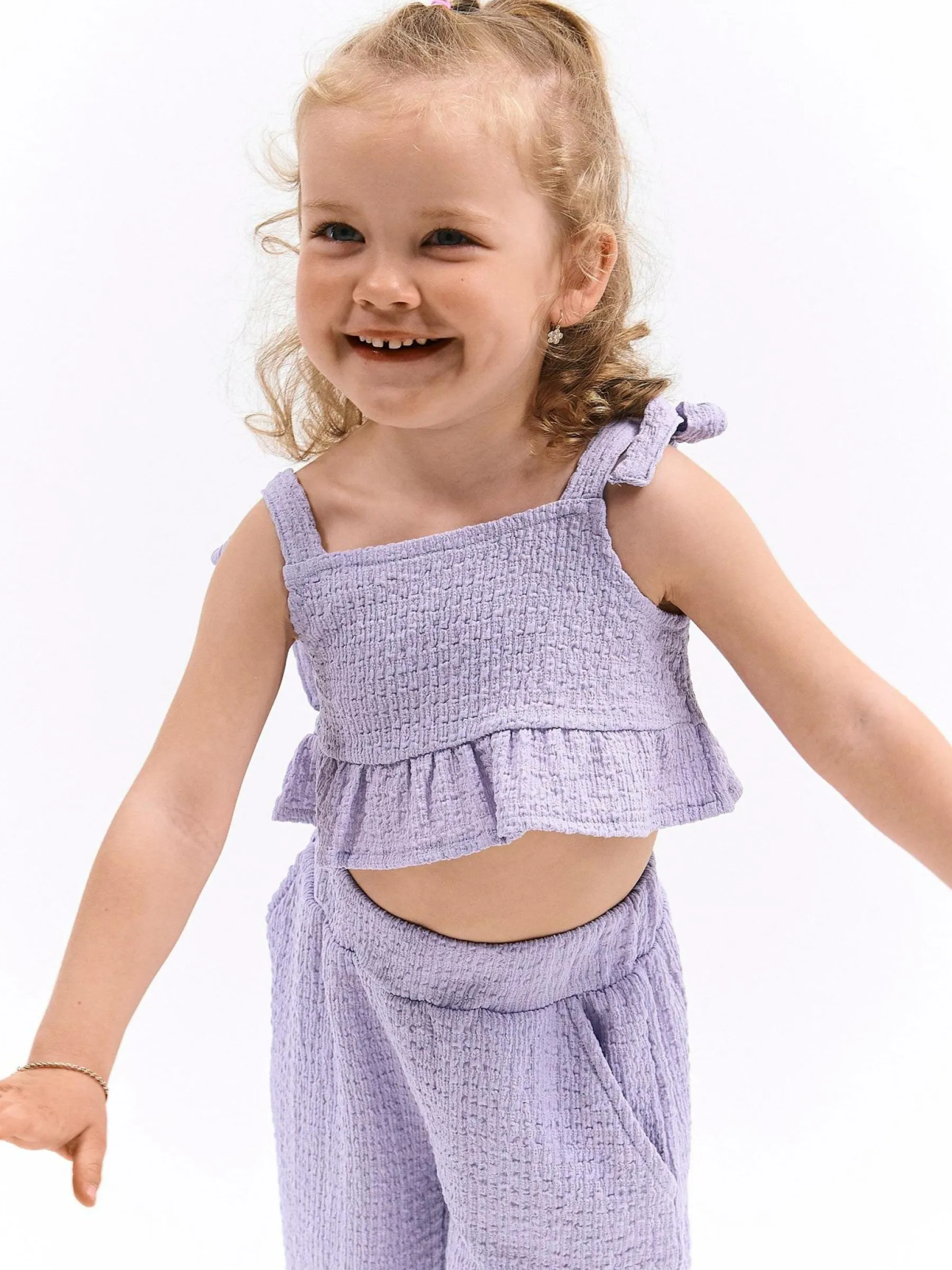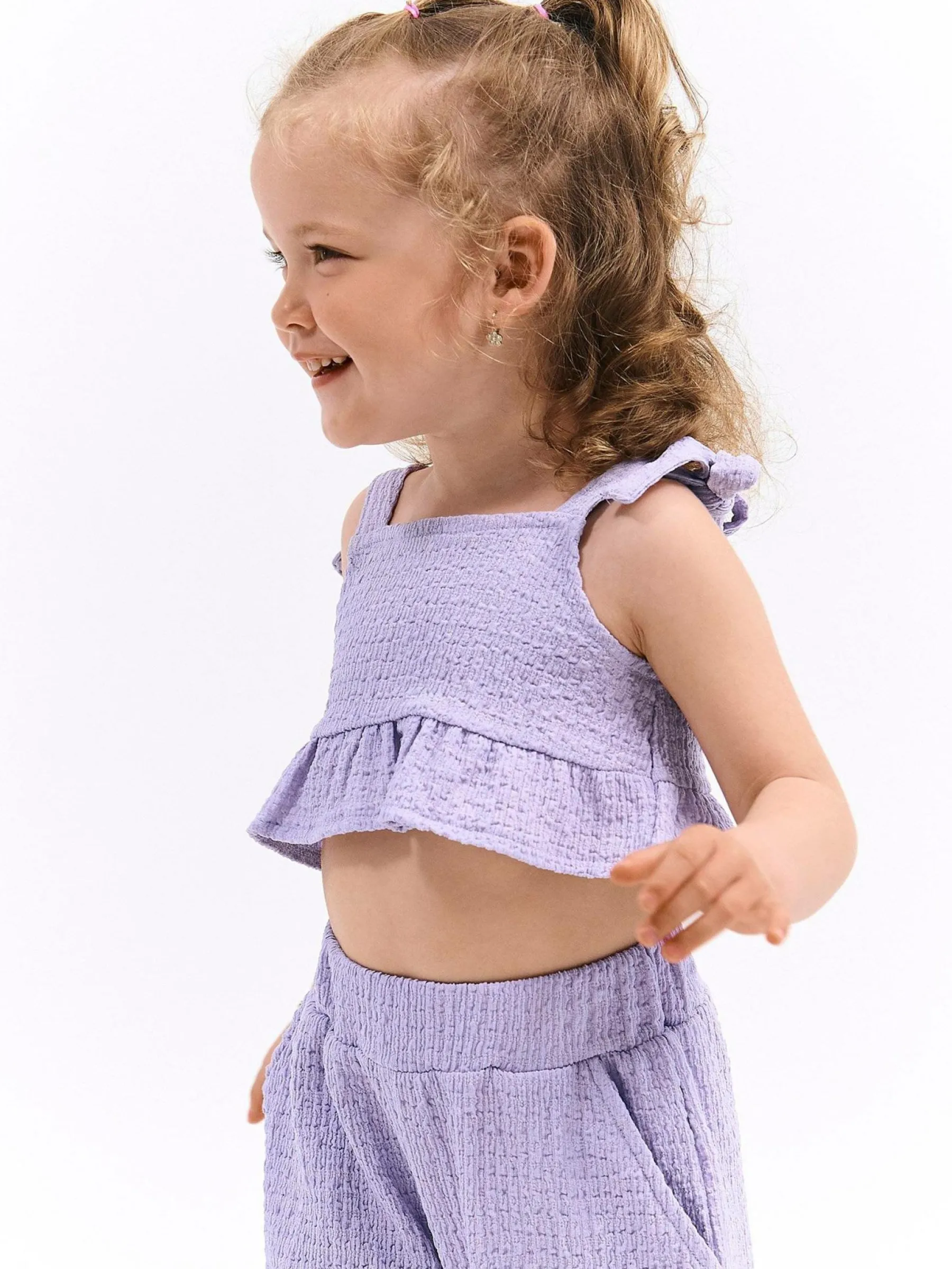 Kolor: purpurowyKrój: z falbanąTyp: top, bluzkaRekaw: bez rękawówDługość: krótki topPattern style: pojedynczy ko…