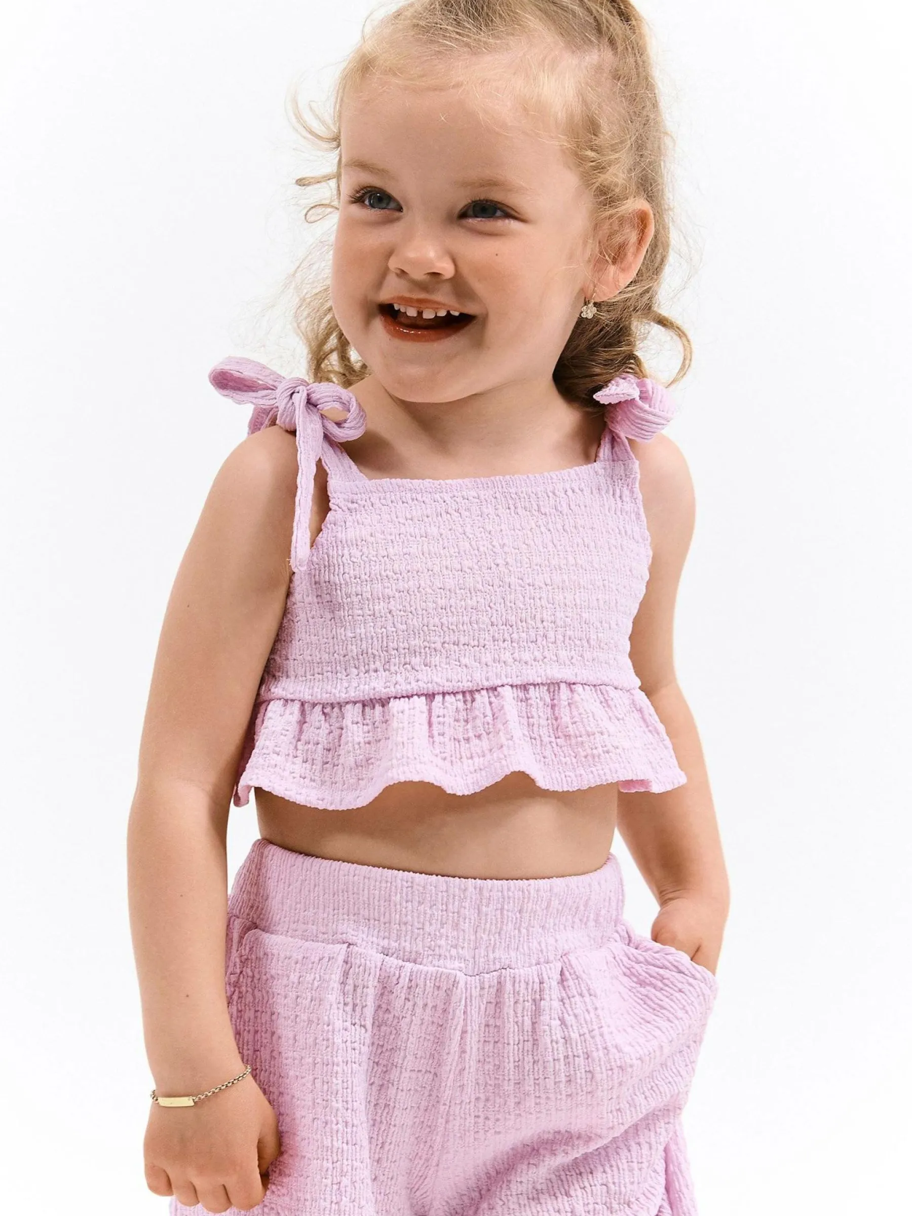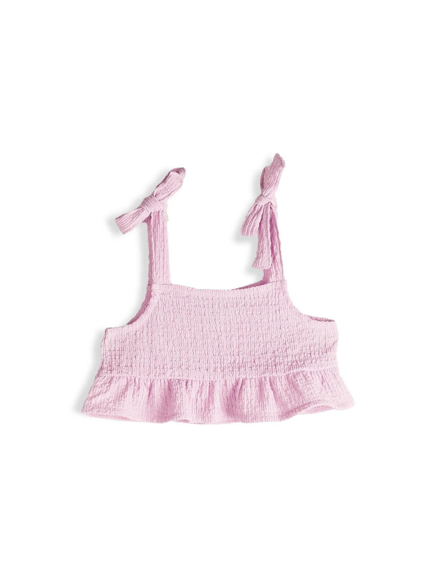 Kolor: różowyKrój: z falbanąTyp: top, bluzkaRekaw: bez rękawówDługość: krótki topPattern style: pojedynczy kol…