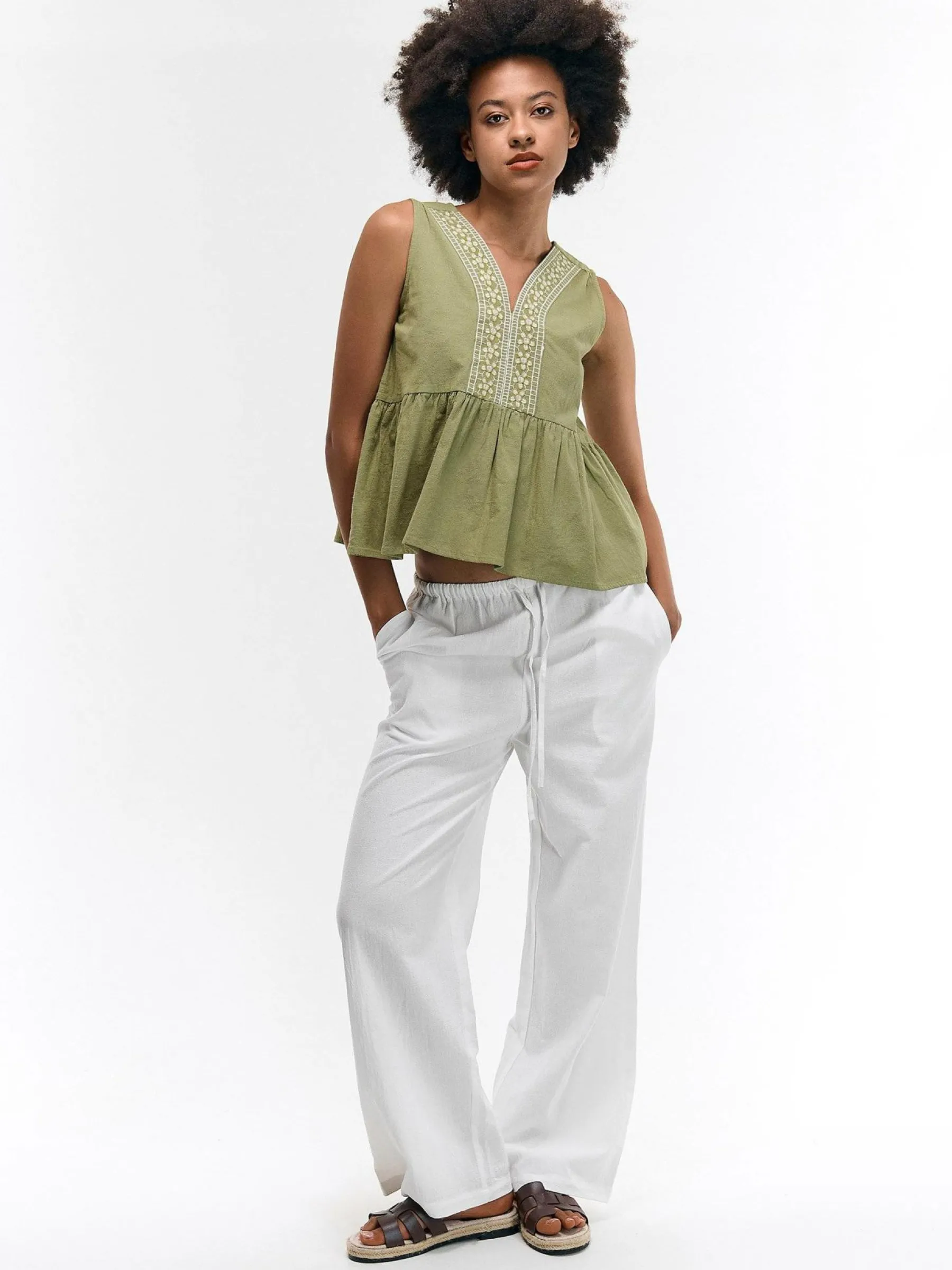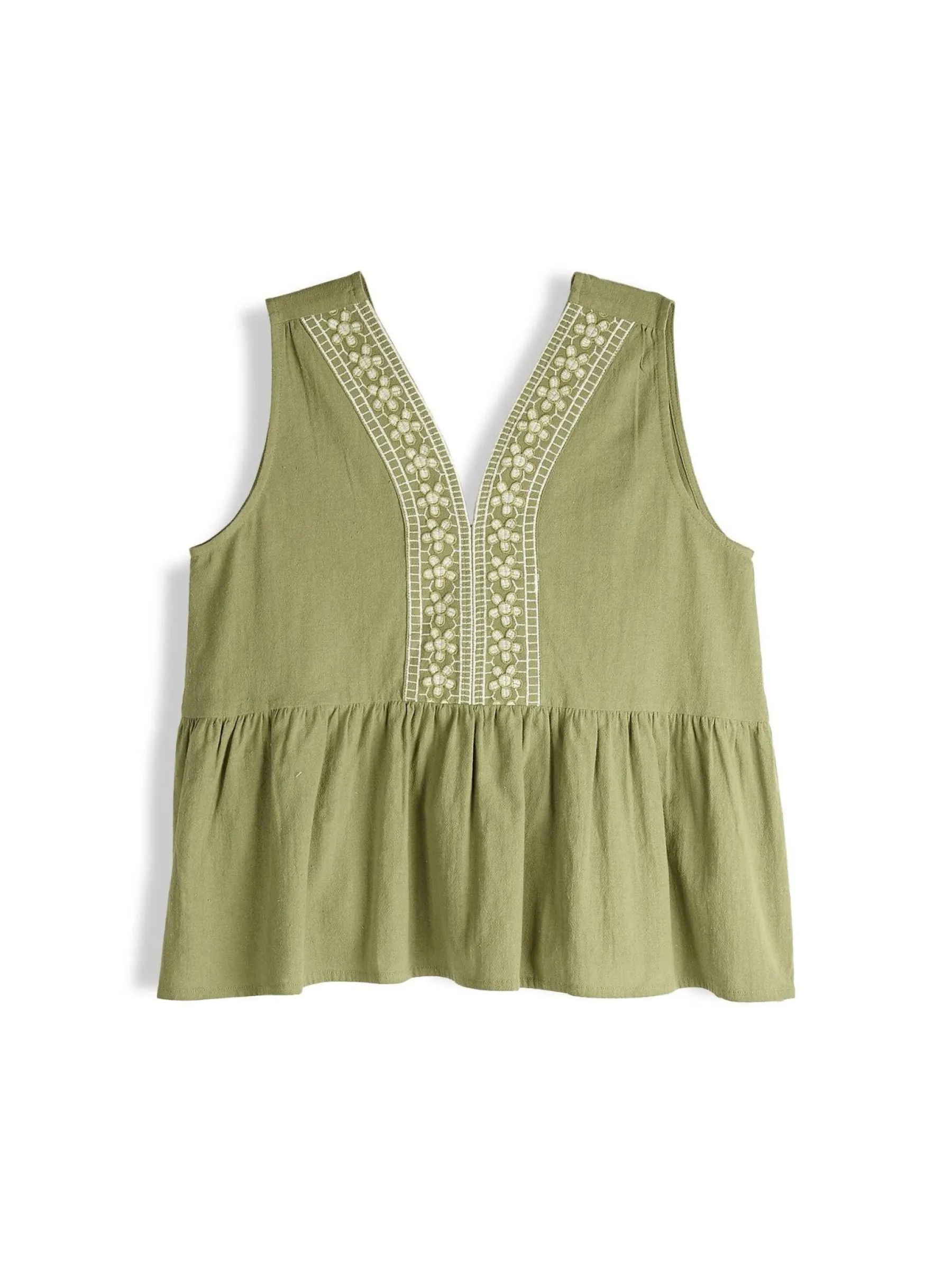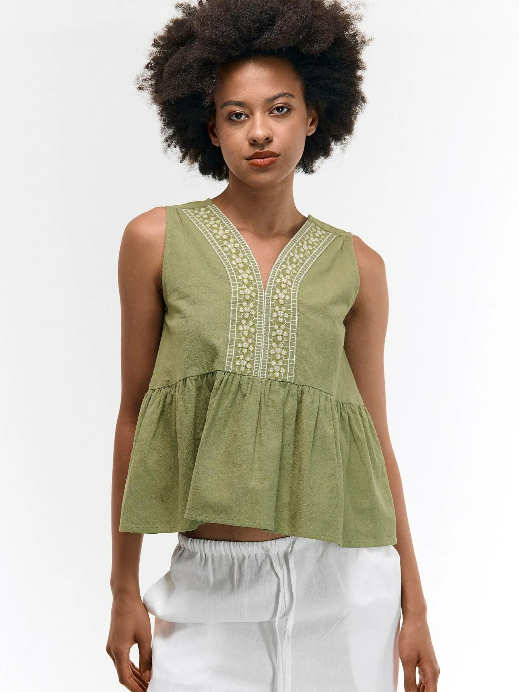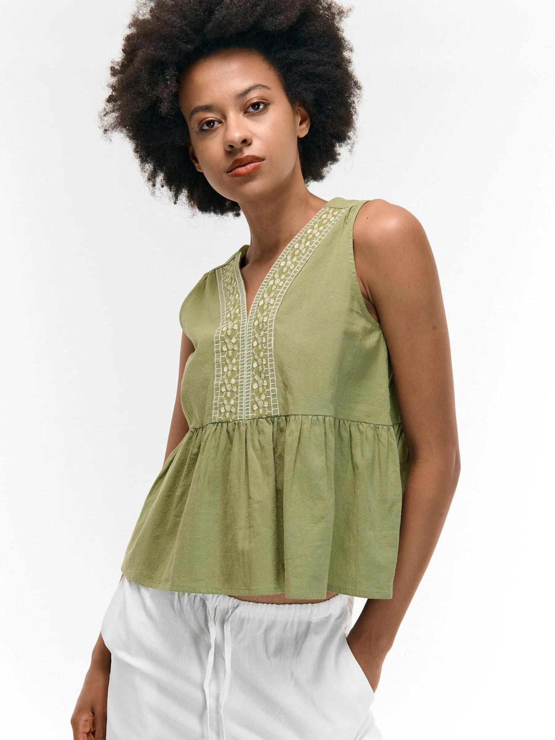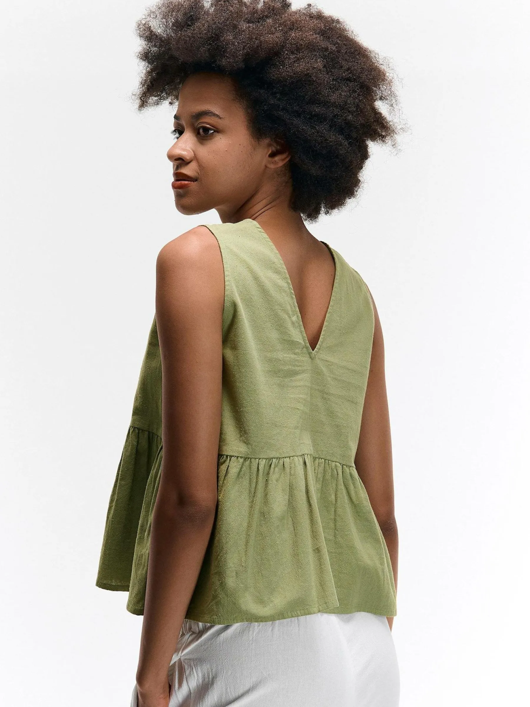 Kolor: zielonyKrój: z falbanąTyp: bluzka, topRekaw: bez rękawówDługość: krótkiPattern style: pojedynczy kolorDet…