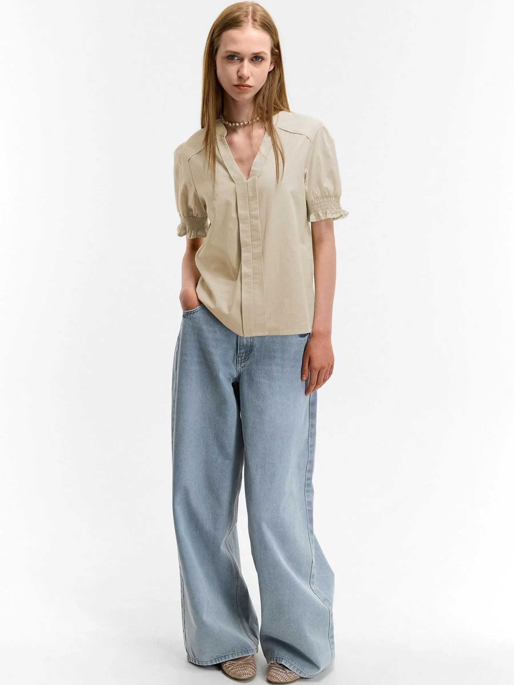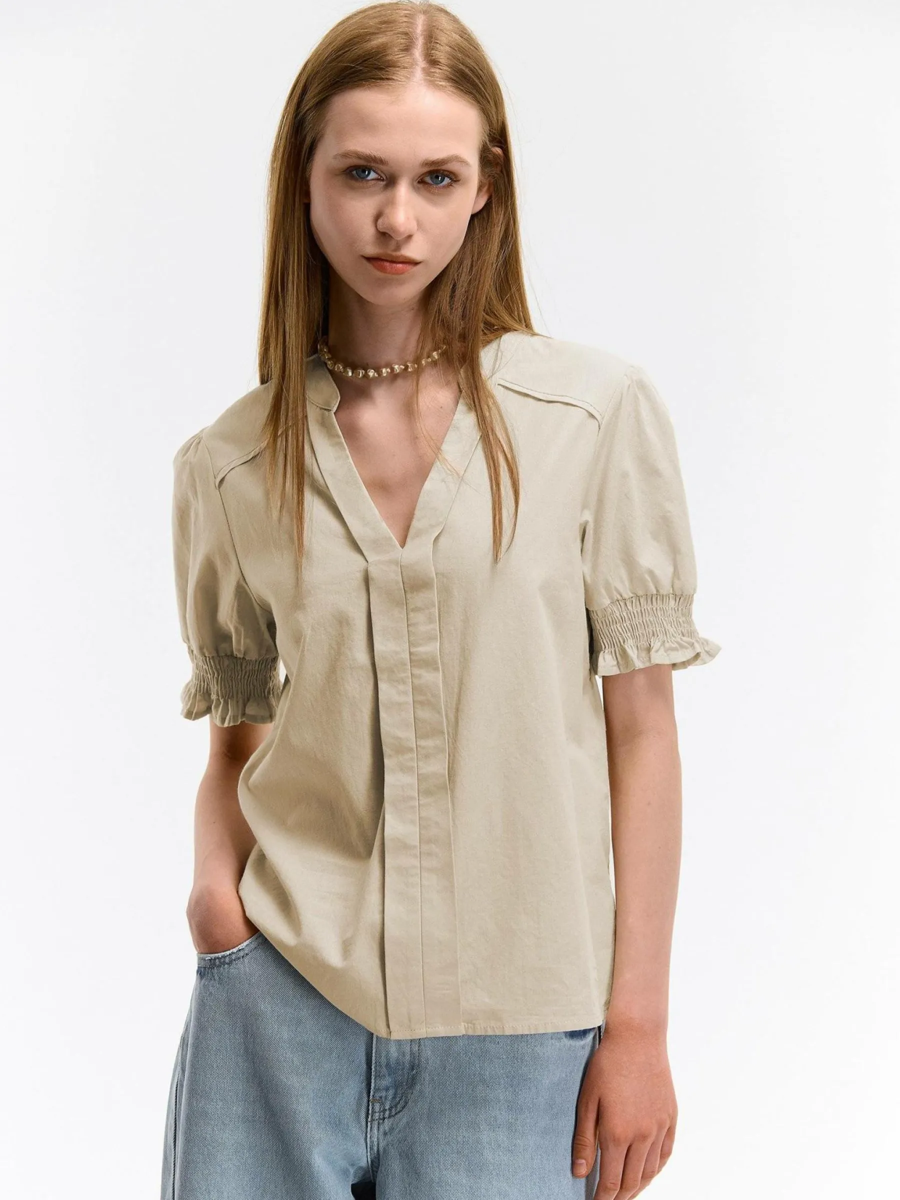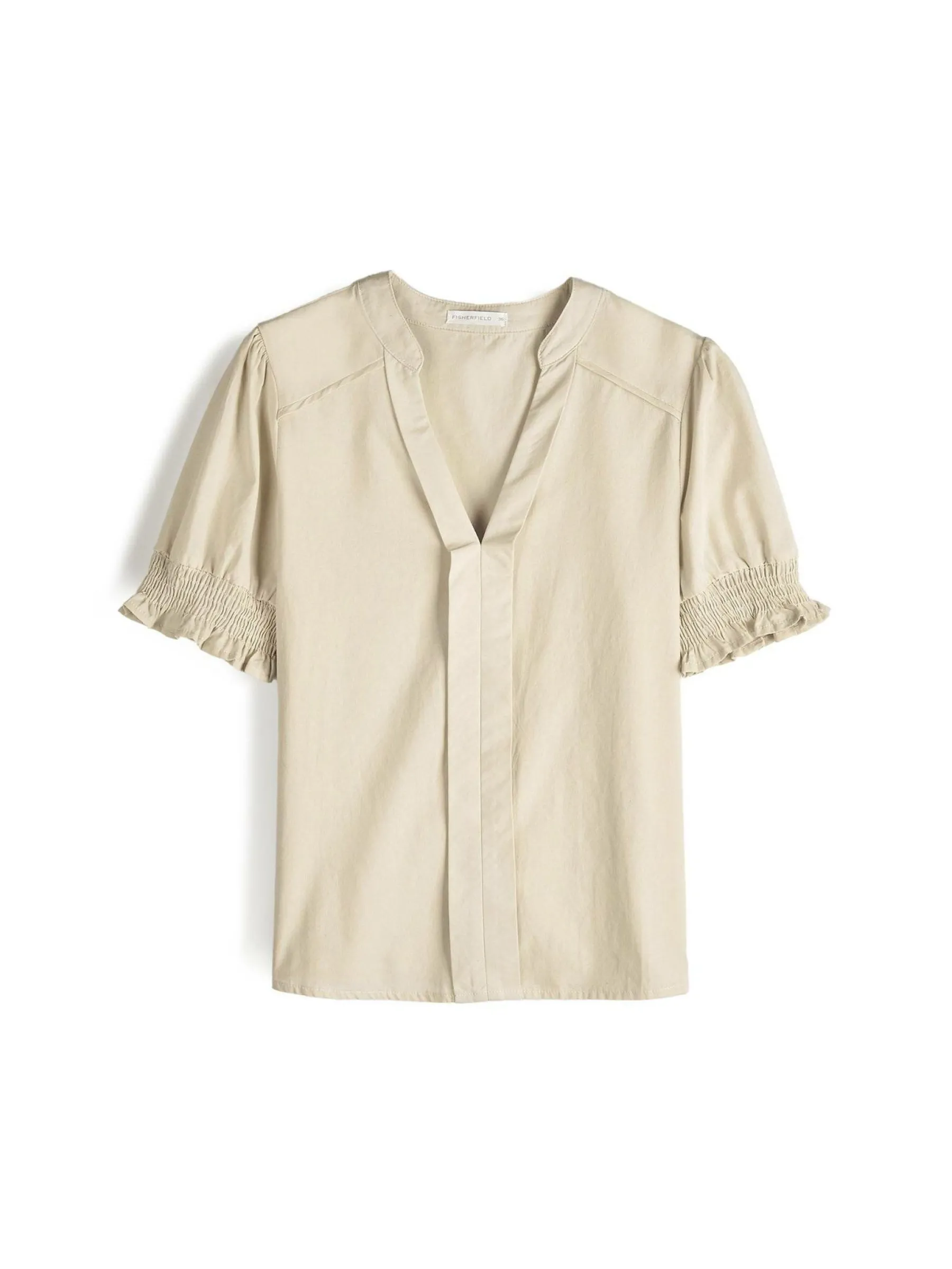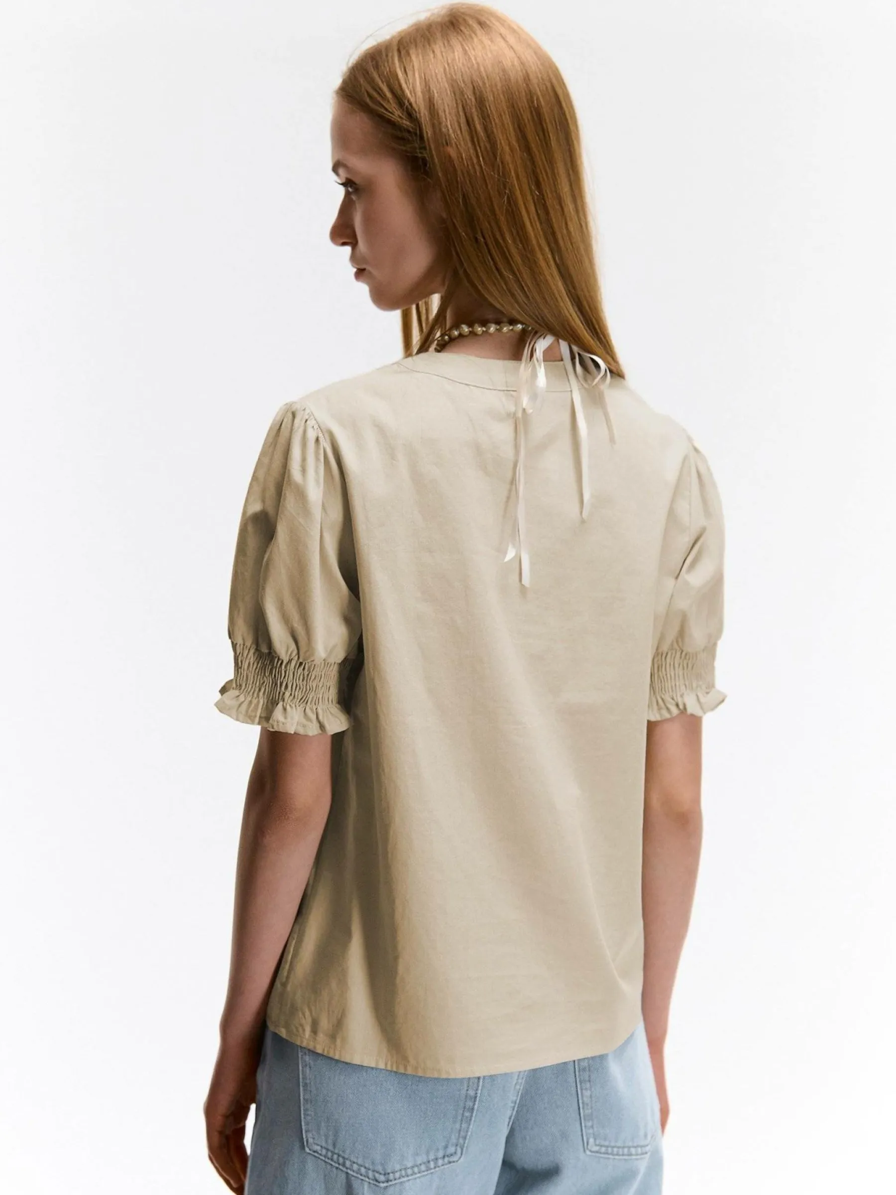 Kolor: beżowyKrój: regularTyp: bluzkaRekaw: krótki rękawDługość: krótkiPattern style: pojedynczy kolorDetal: nad…