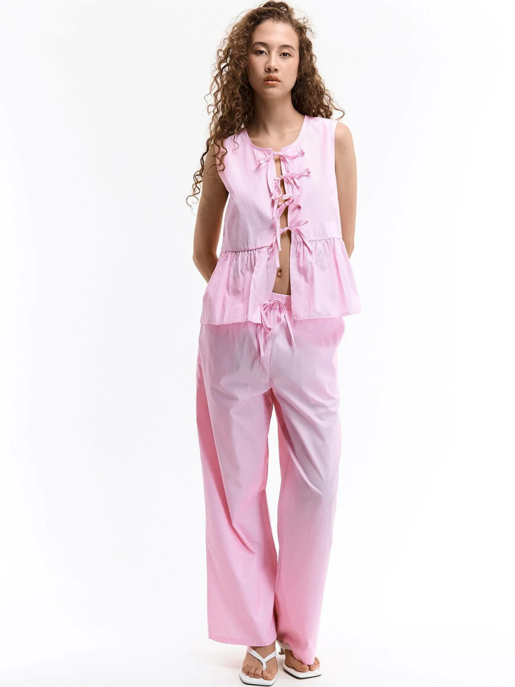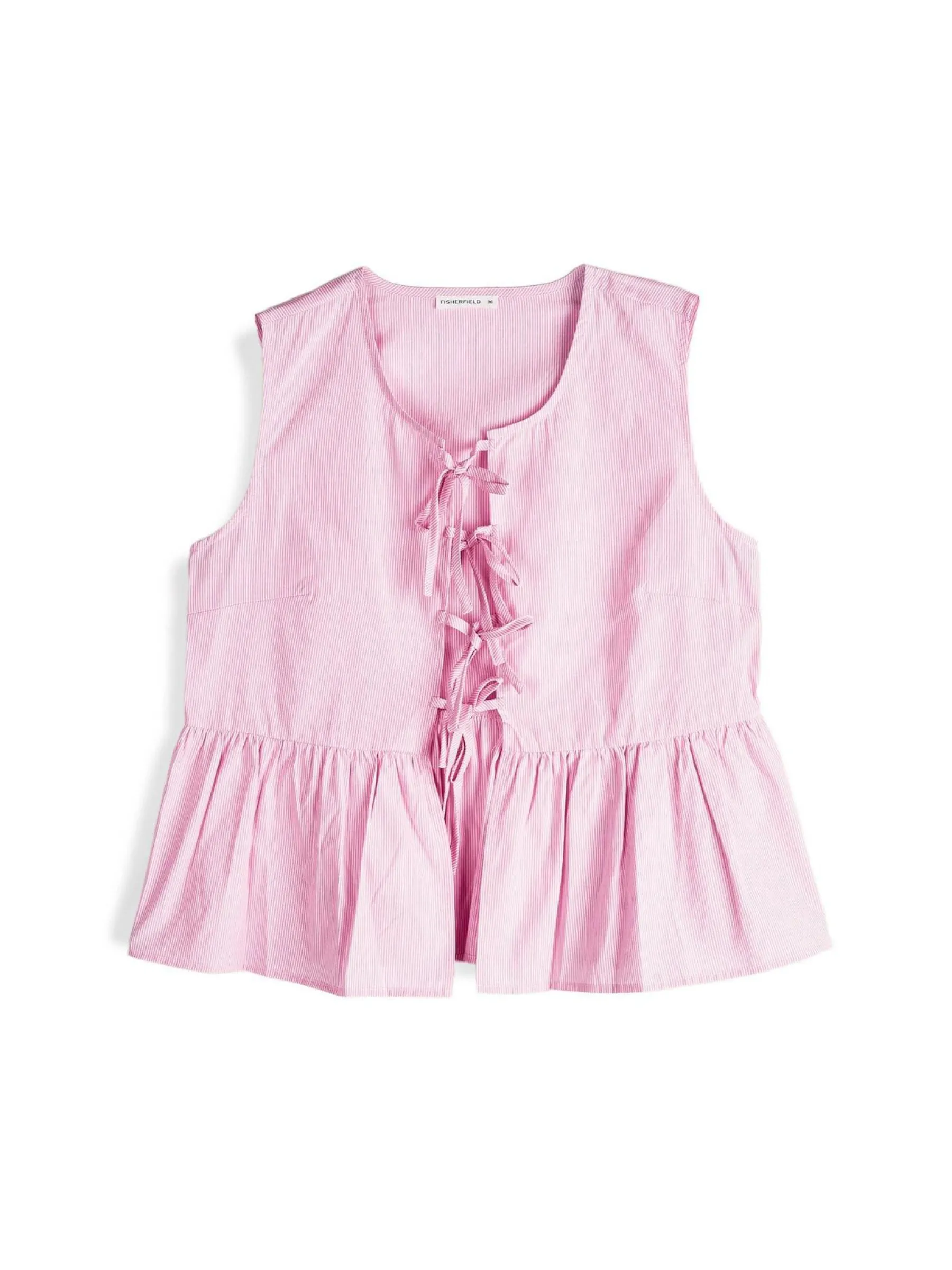 Kolor: różowyKrój: z falbanąTyp: bluzkaRekaw: bez rękawówDługość: krótkiPattern style: w prążkiDetal: ze szn…