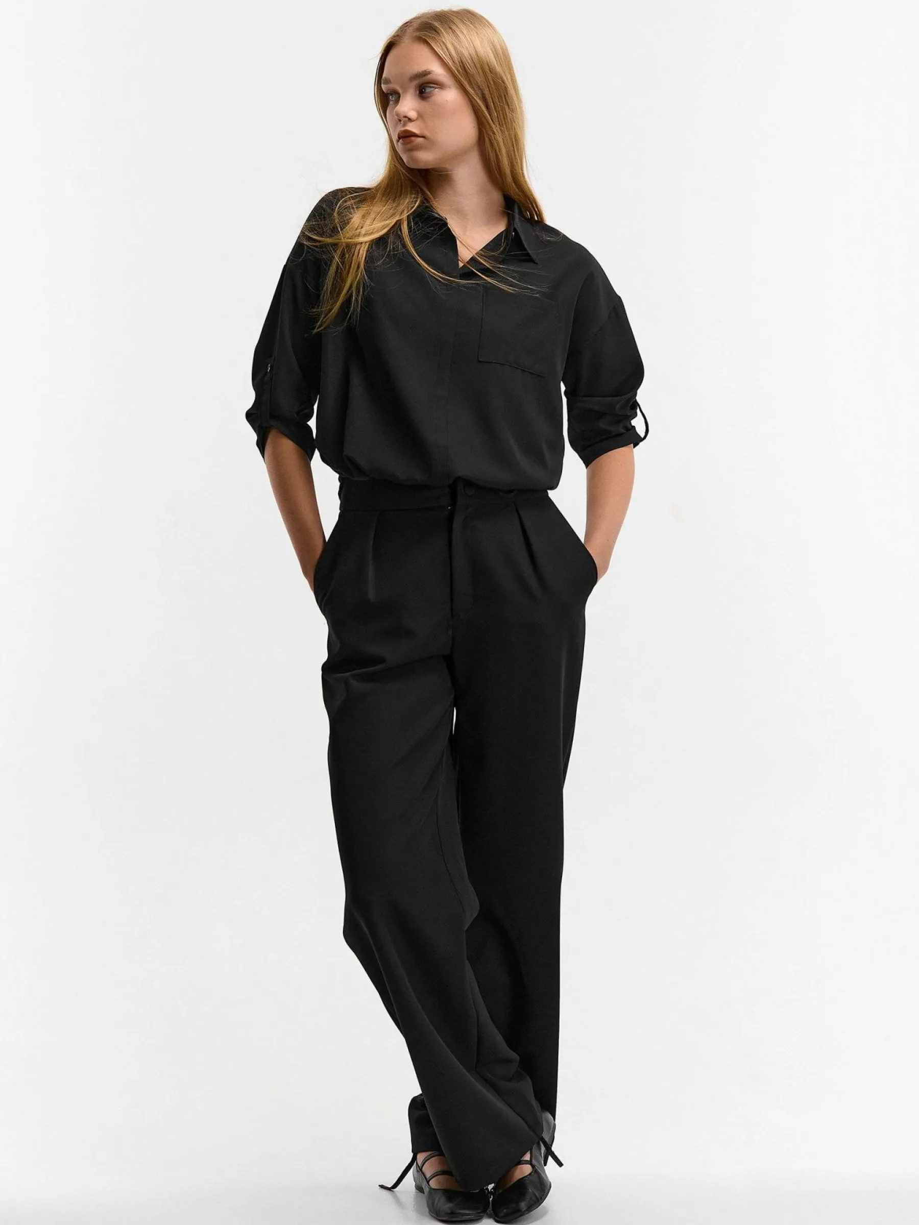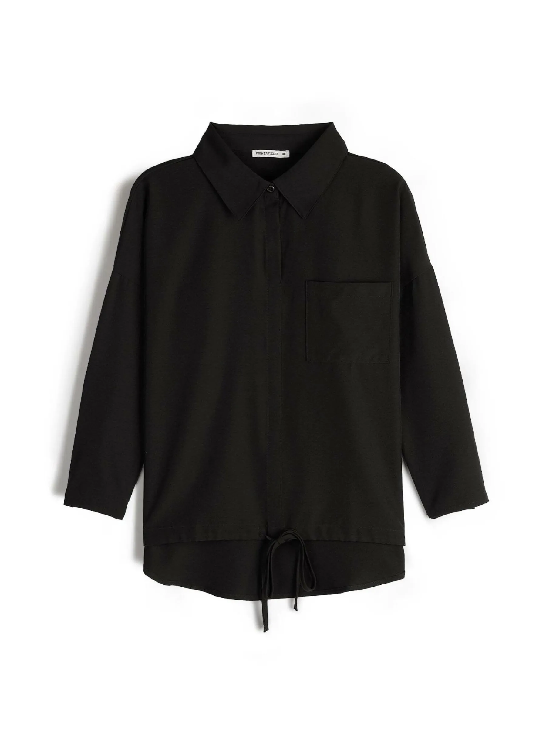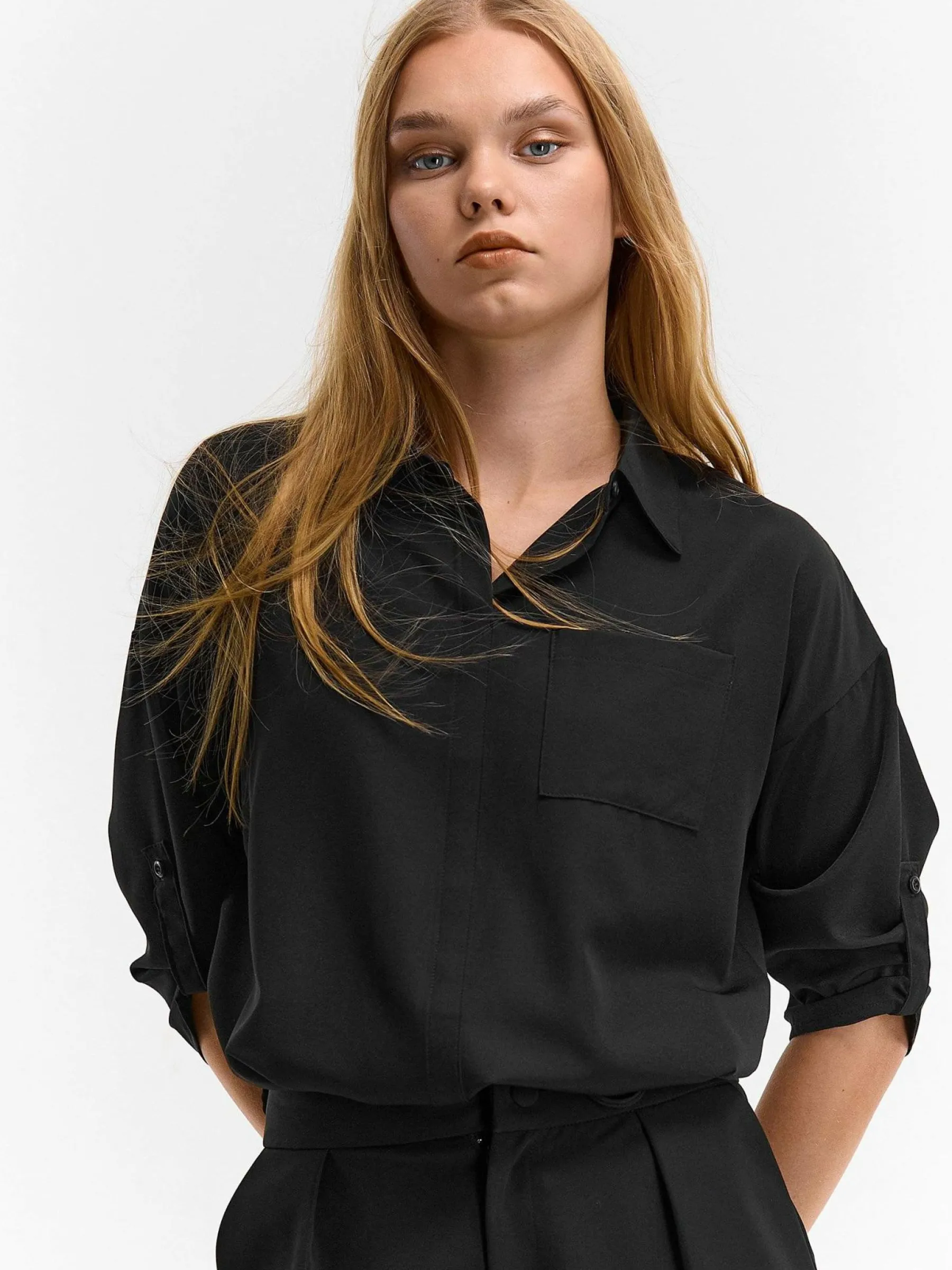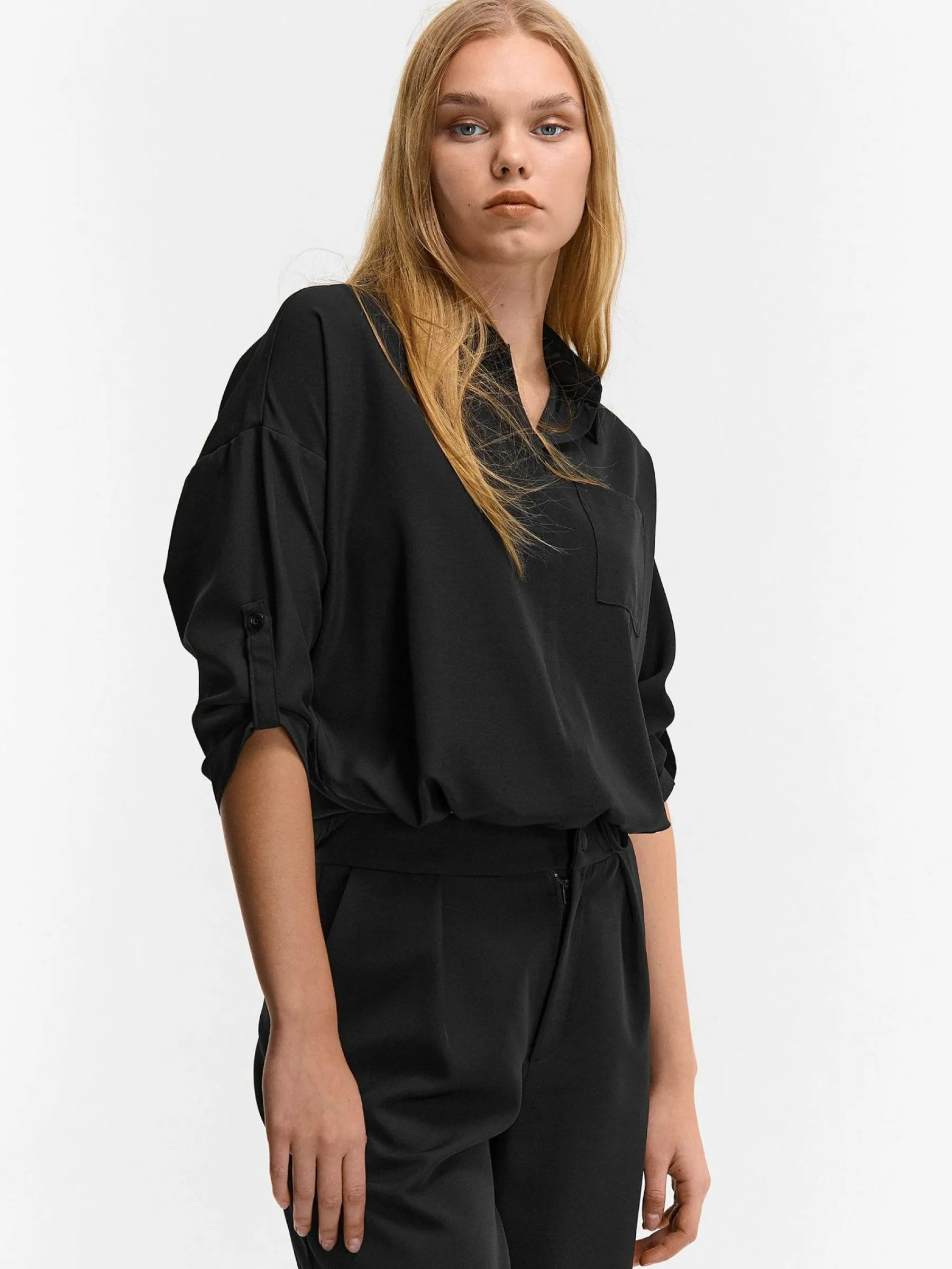 Kolor: czarnyKrój: regularTyp: bluzkaRekaw: rękaw 3/4Długość: krótkiPattern style: pojedynczy kolorDetal: ze sznur…