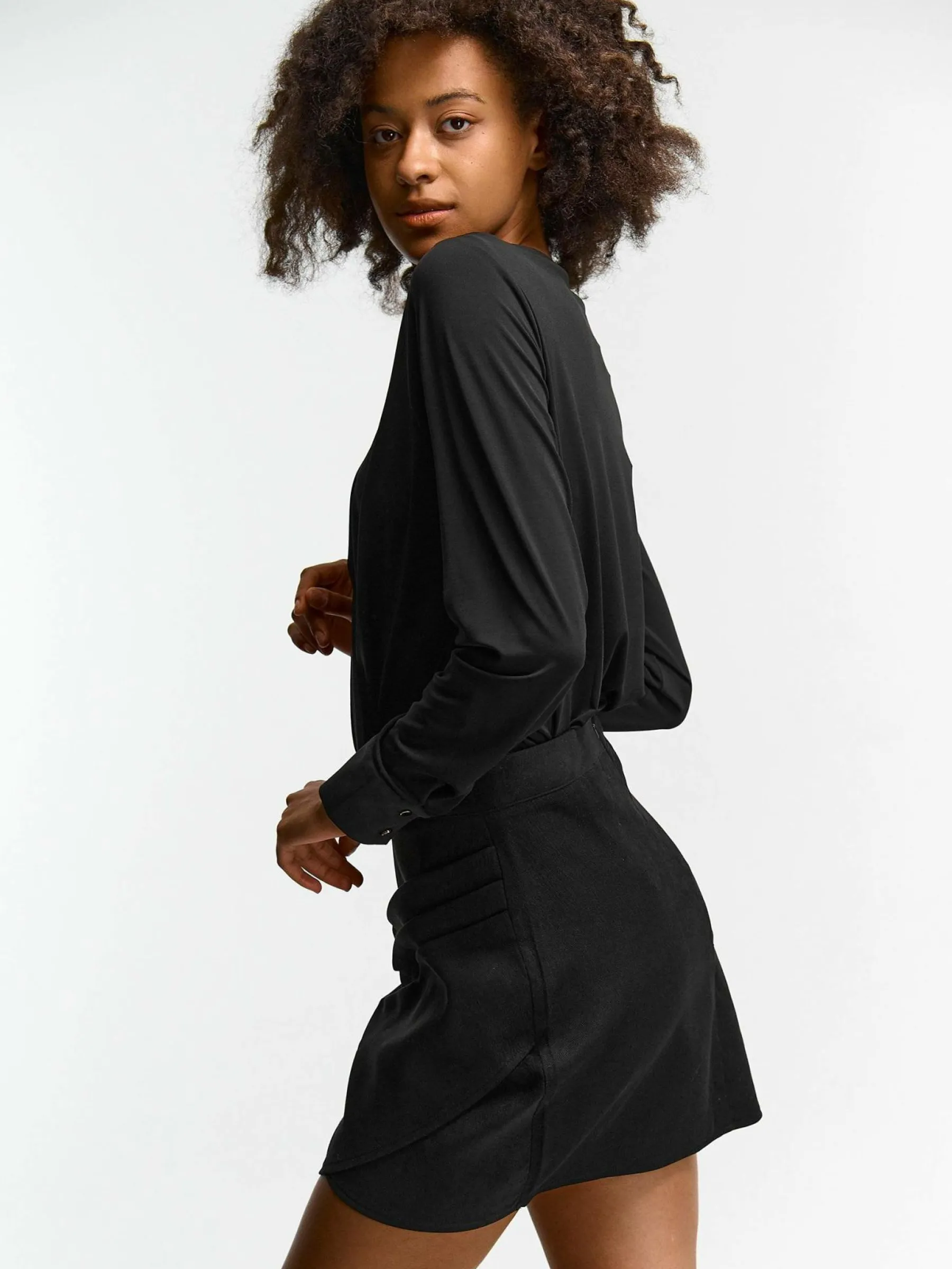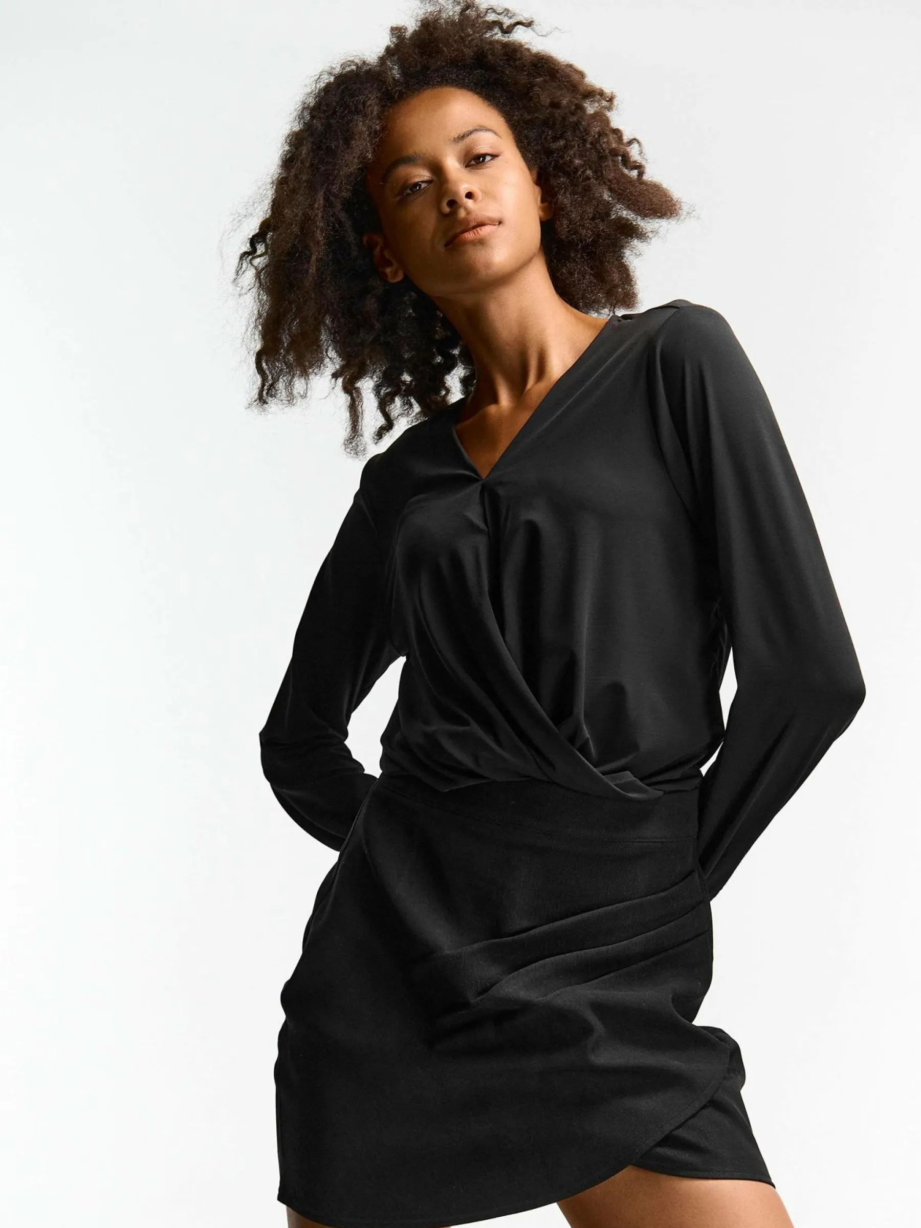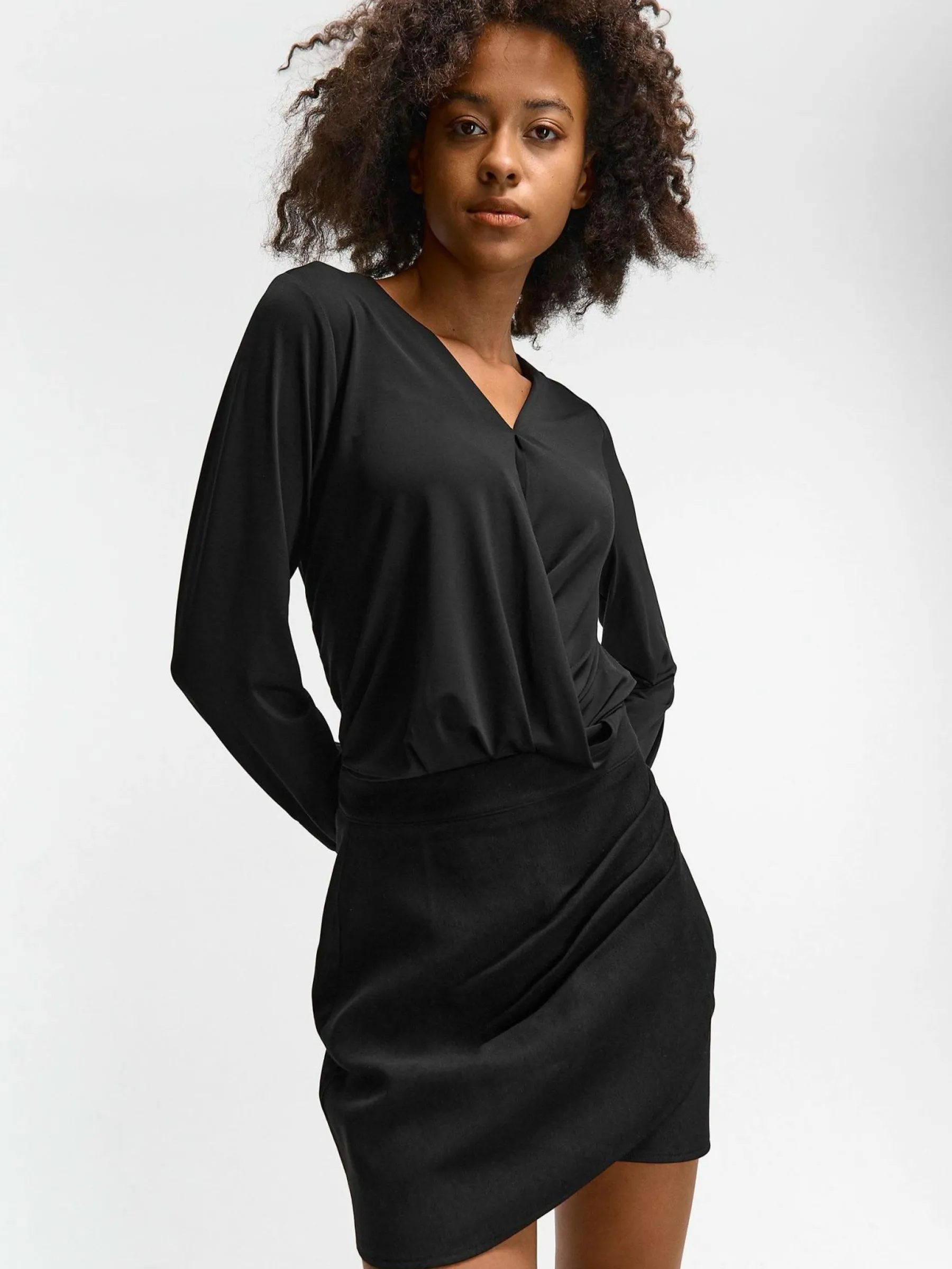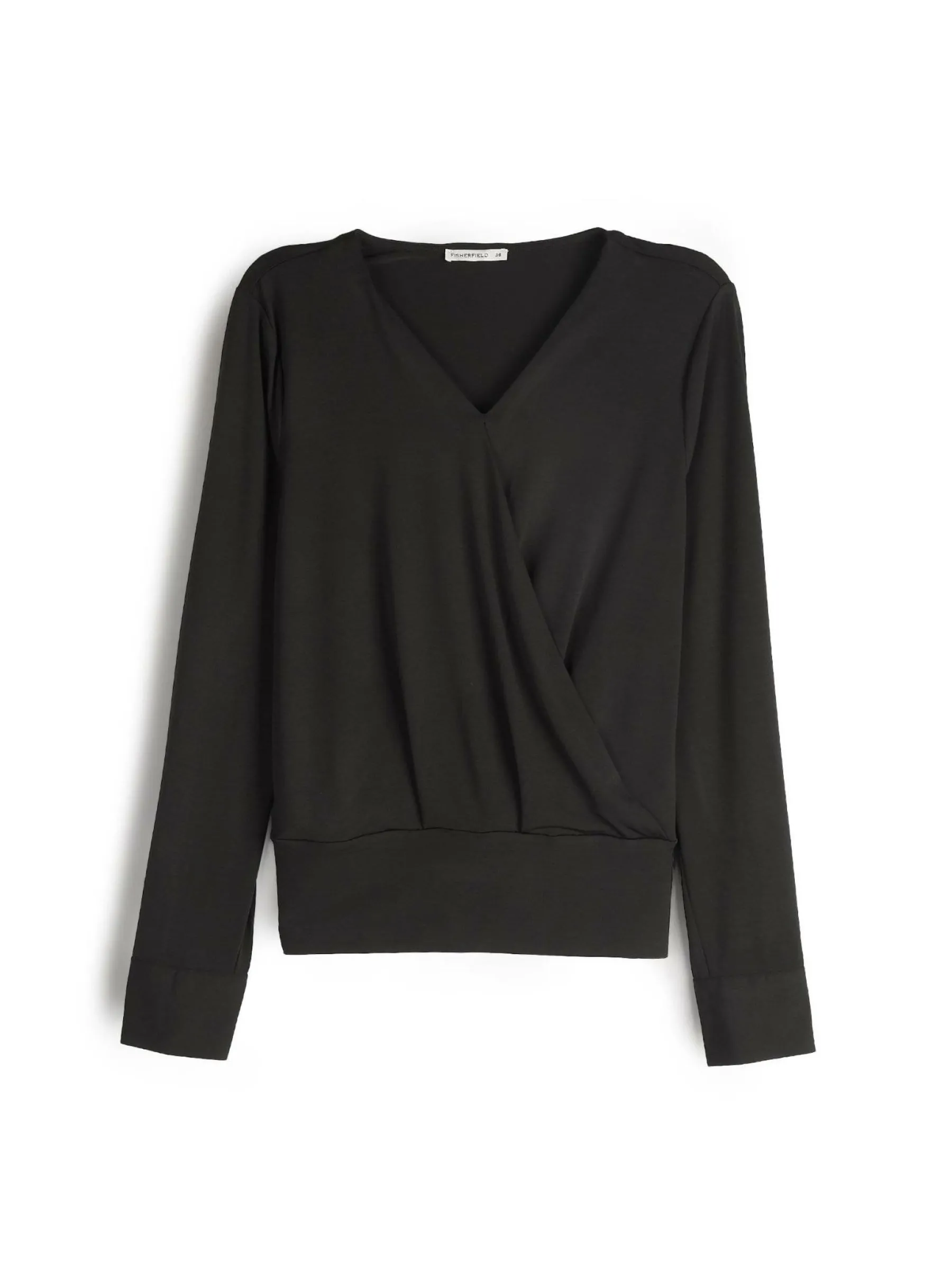 Kolor: czarnyKrój: kopertówkiTyp: bluzkaRekaw: długi rękawDługość: krótkiPattern style: pojedynczy kolorDetal: v…