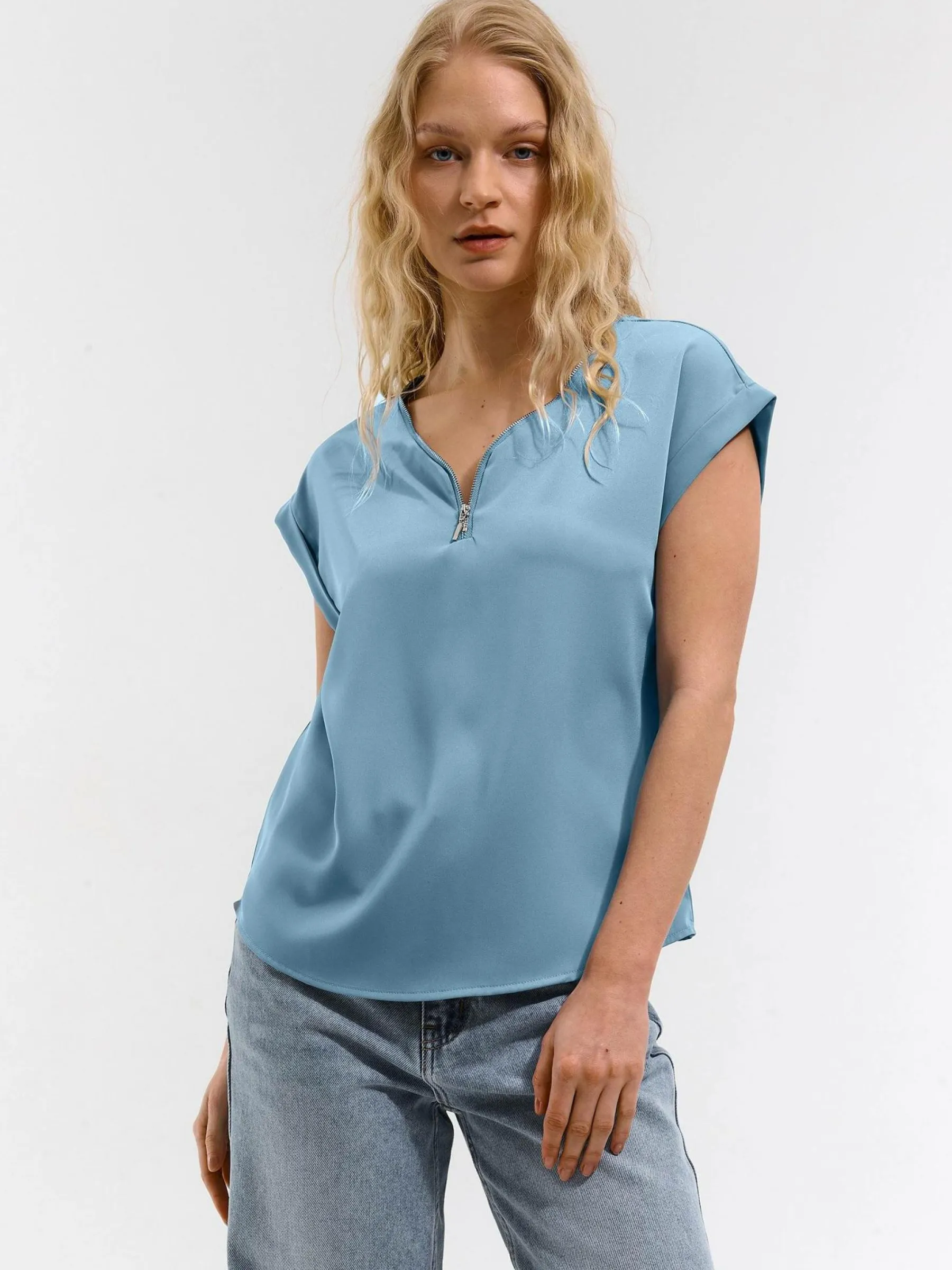 Kolor: niebieskiKrój: regularTyp: bluzka, topRekaw: krótki rękawDługość: krótkiPattern style: pojedynczy kolorDet…
