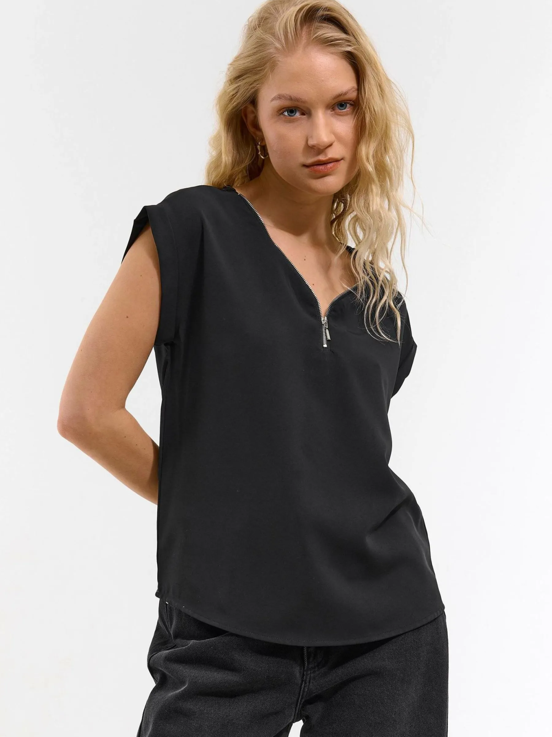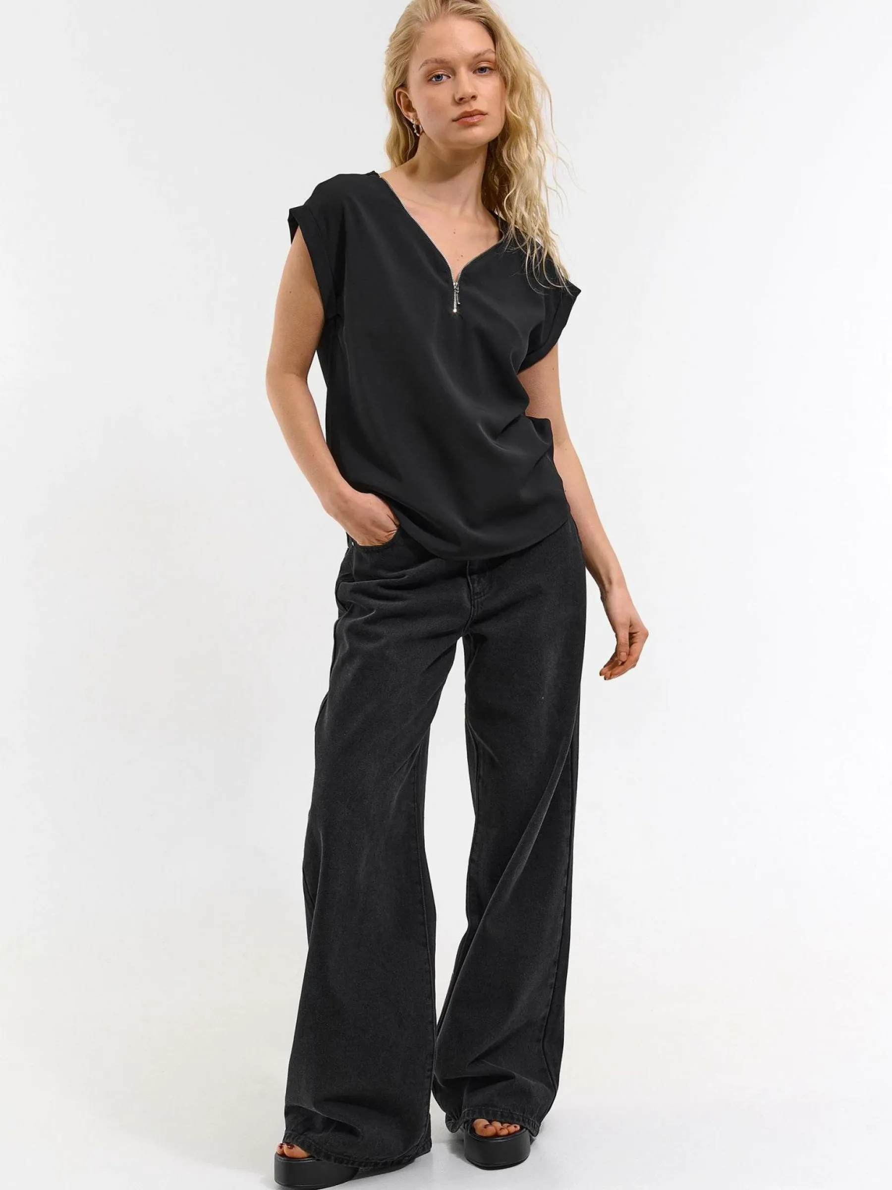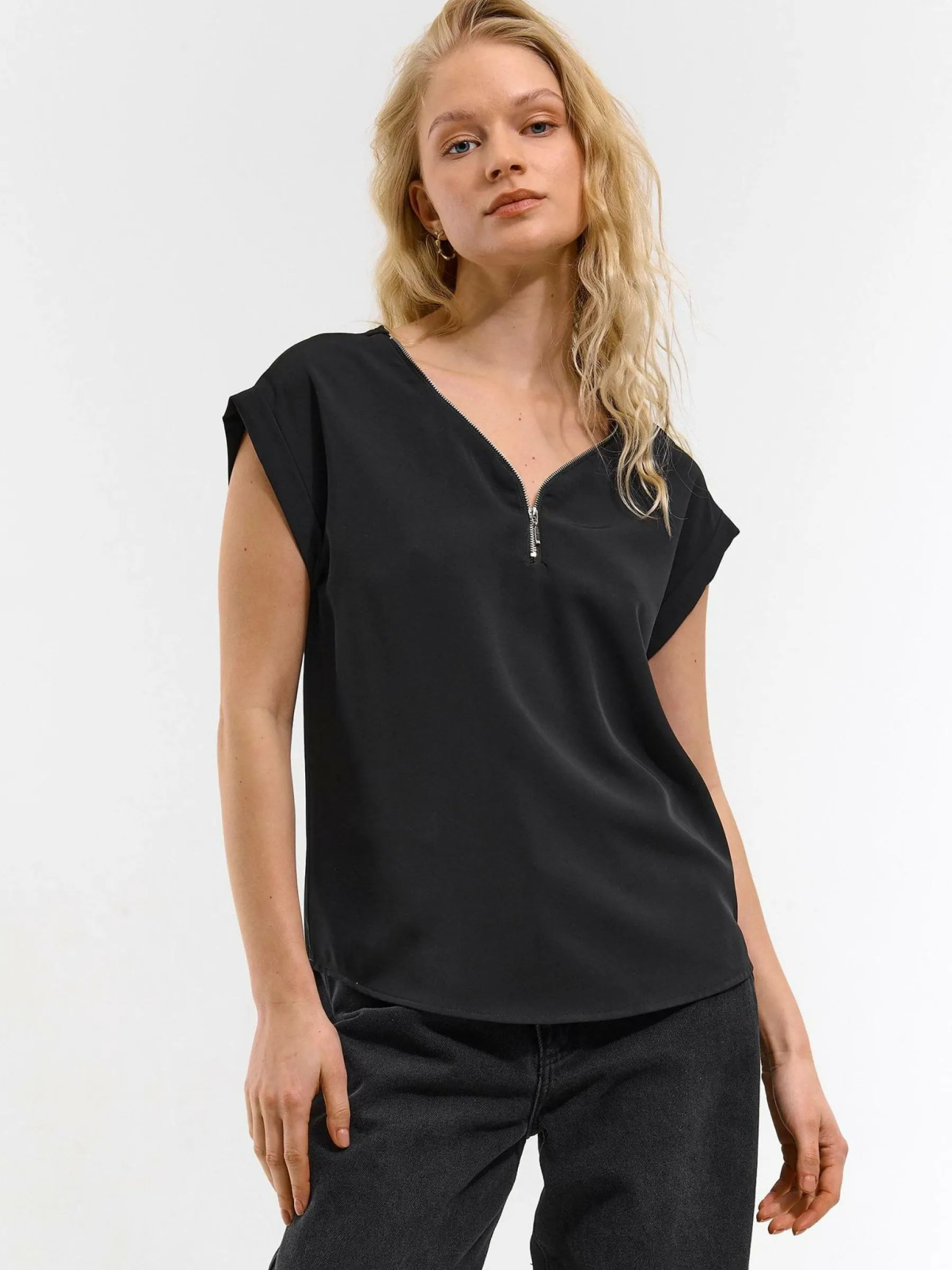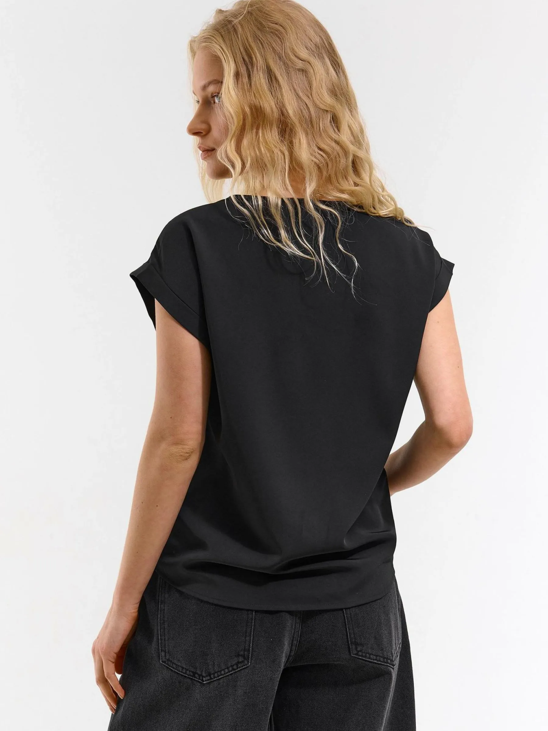 Kolor: czarnyKrój: regularTyp: bluzka, topRekaw: krótki rękawDługość: krótkiPattern style: pojedynczy kolorDetal:…