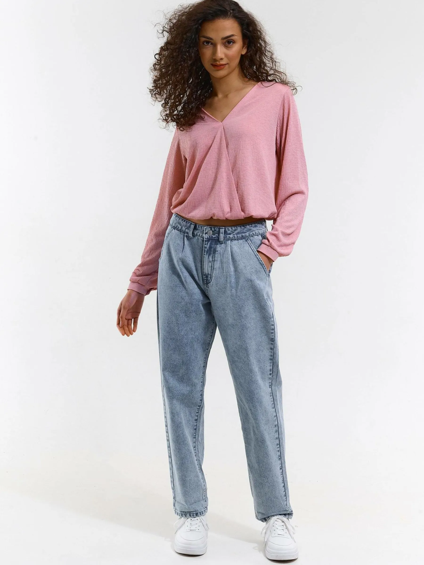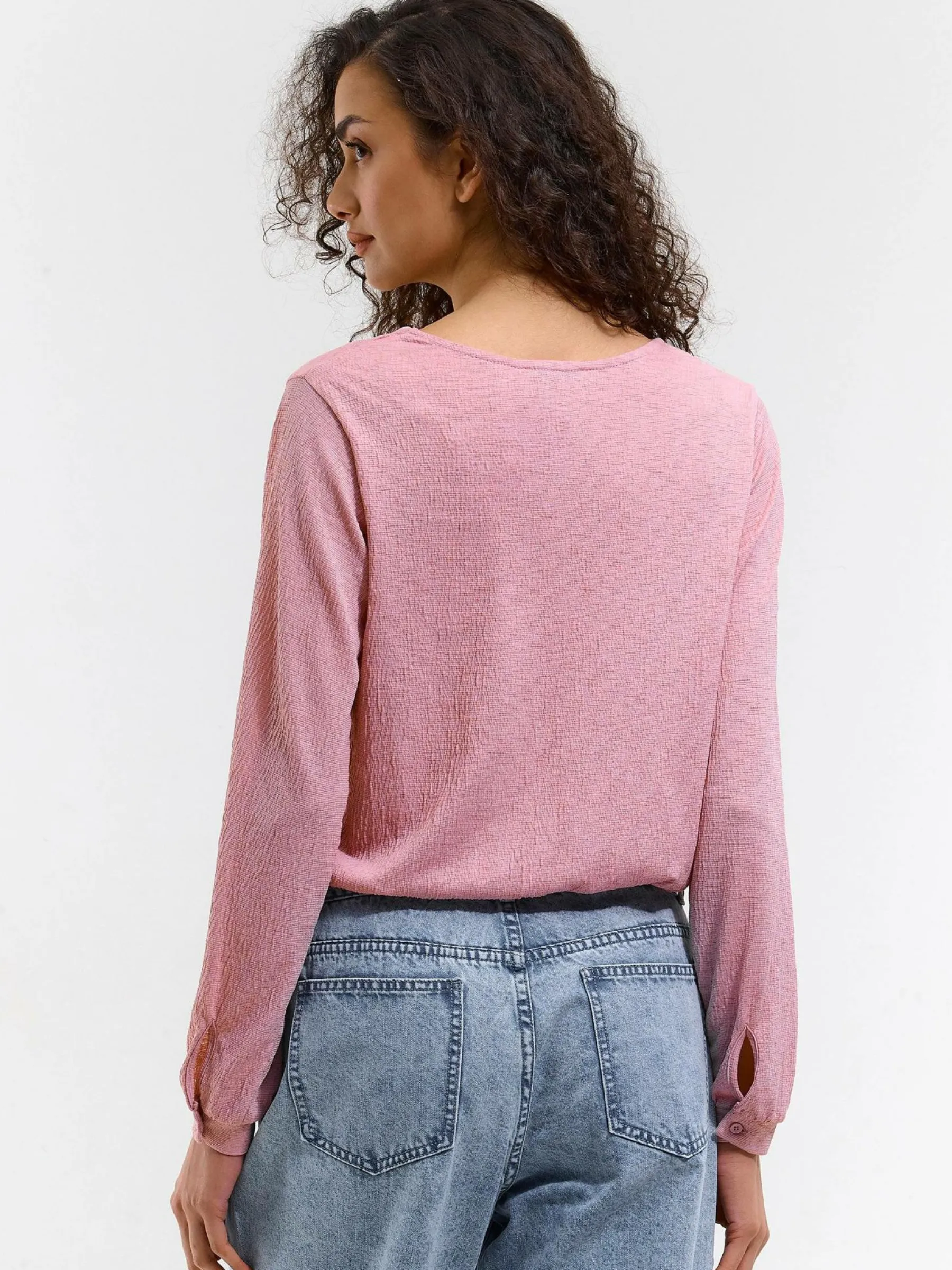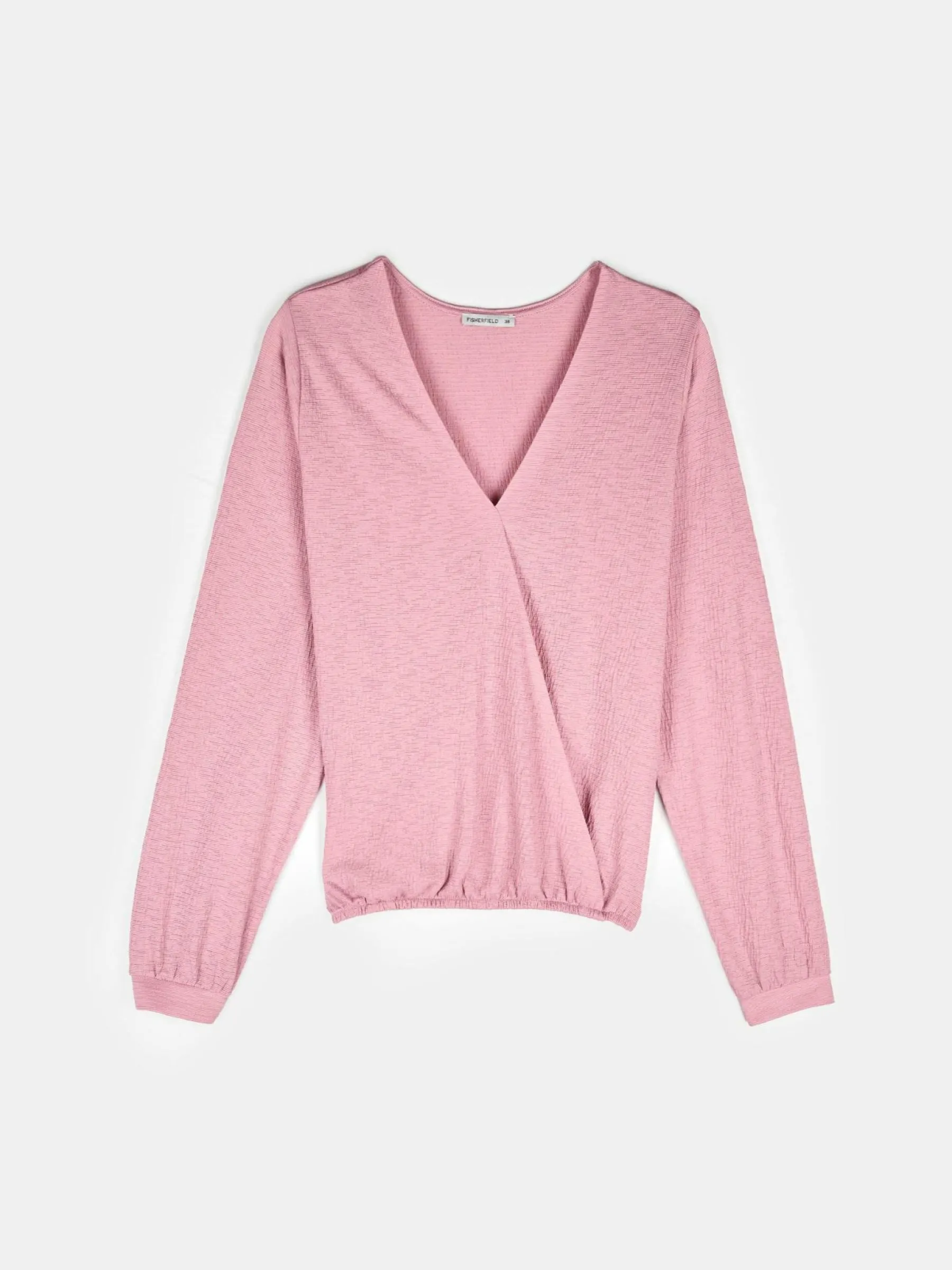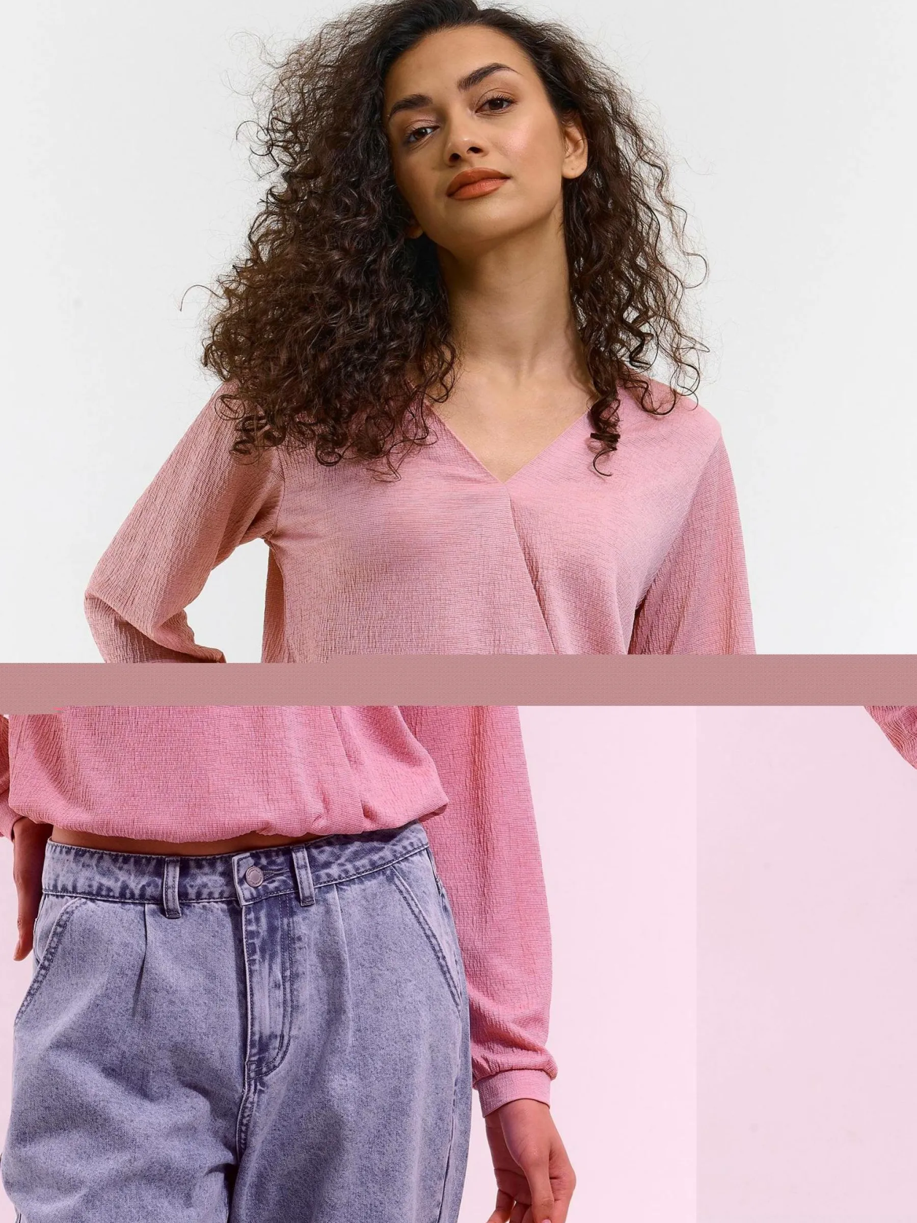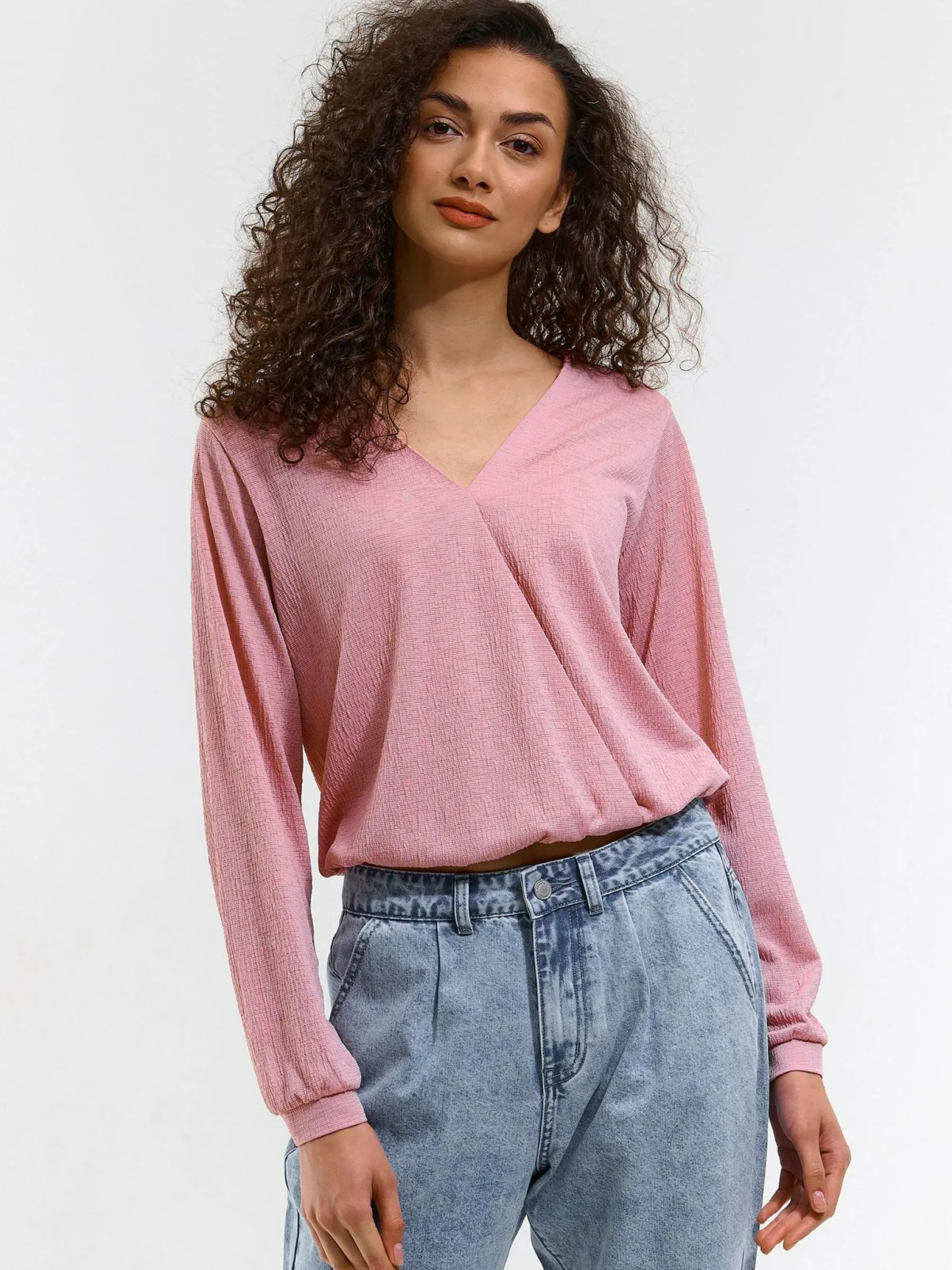 Kolor: różowyKrój: kopertówkiTyp: bluzka, topRekaw: rękaw raglanowyDługość: krótkiPattern style: pojedynczy kol…