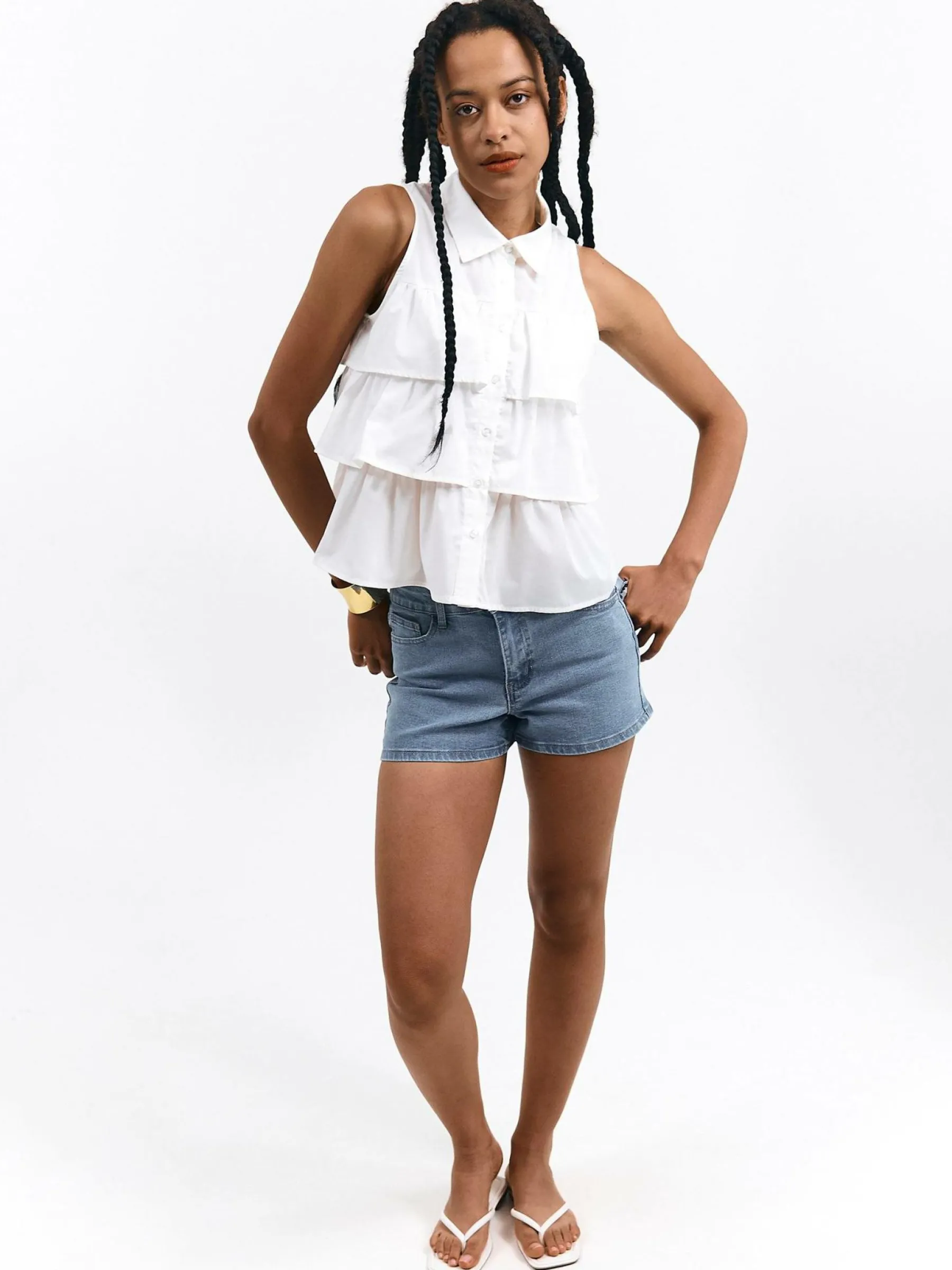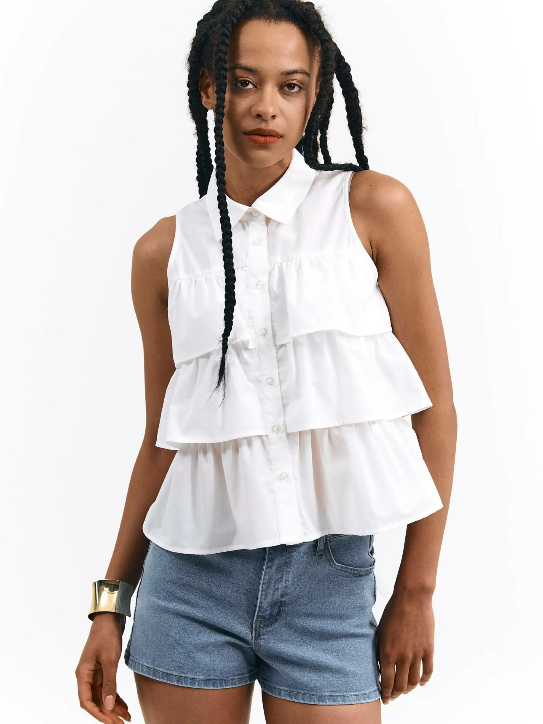 Kolor: białyKrój: z falbanąTyp: top, bluzkaRekaw: bez rękawówDługość: krótkiPattern style: pojedynczy kolorDeta…