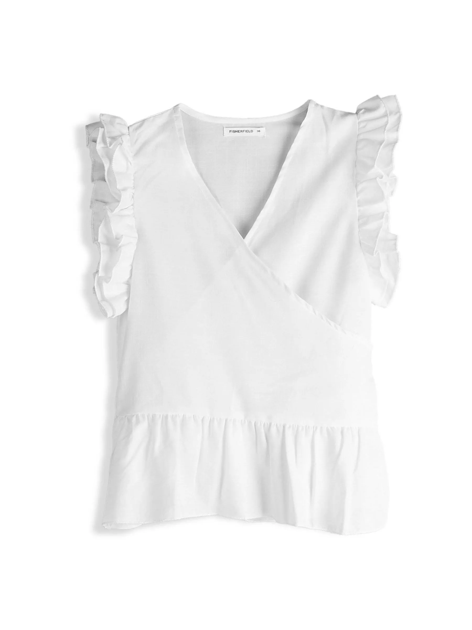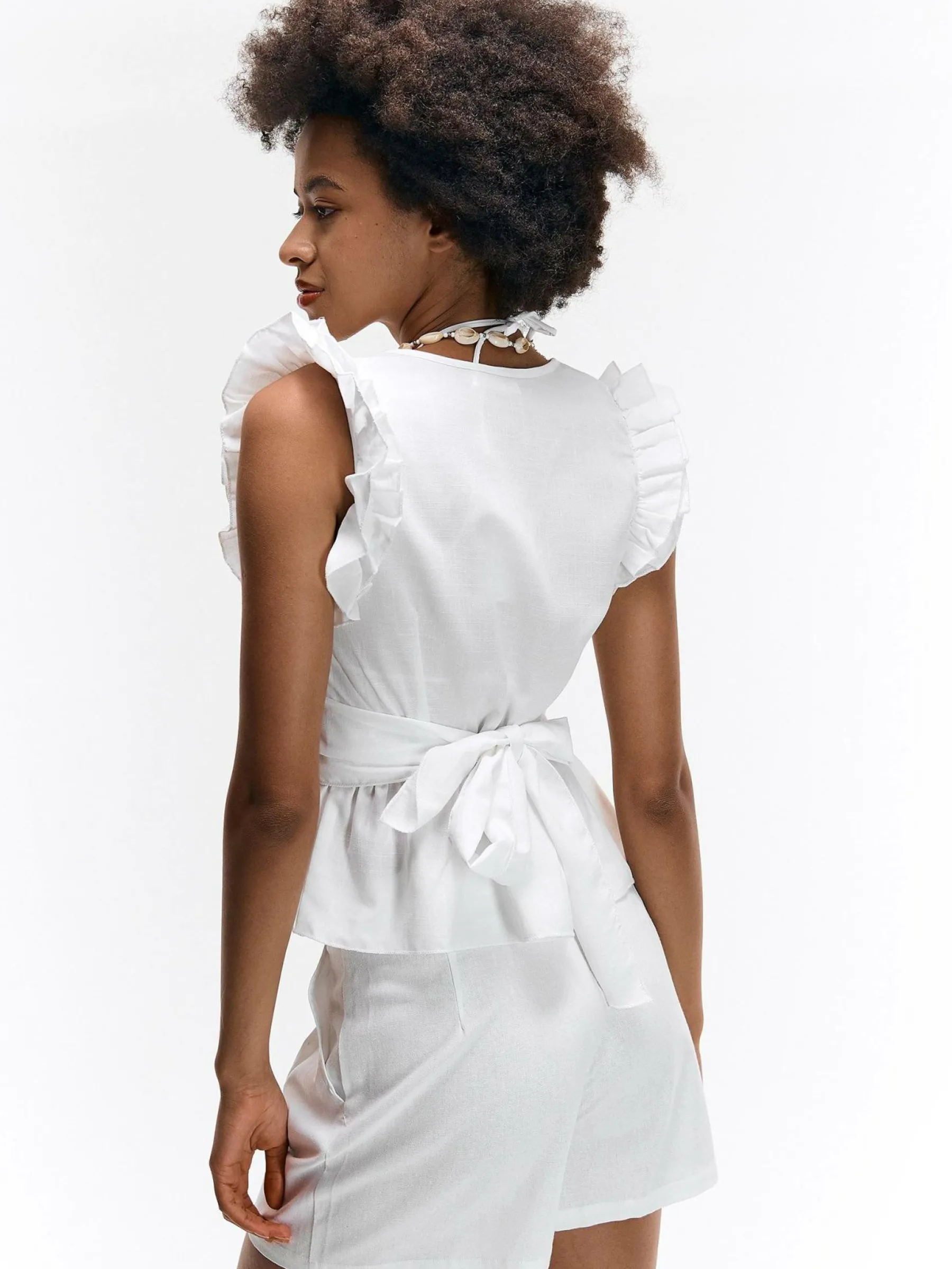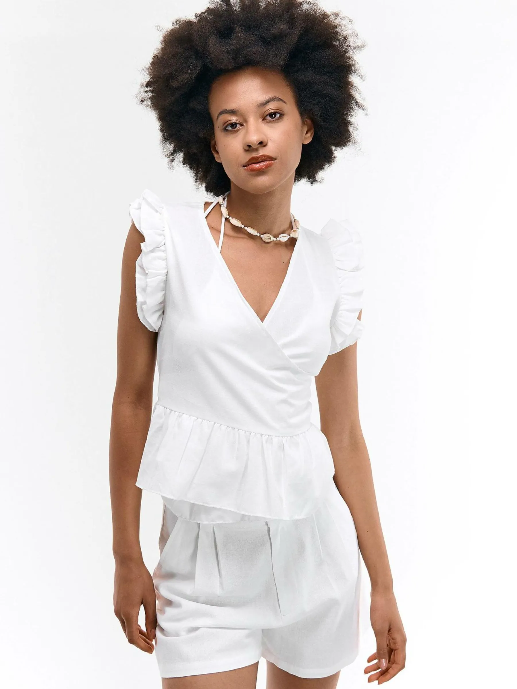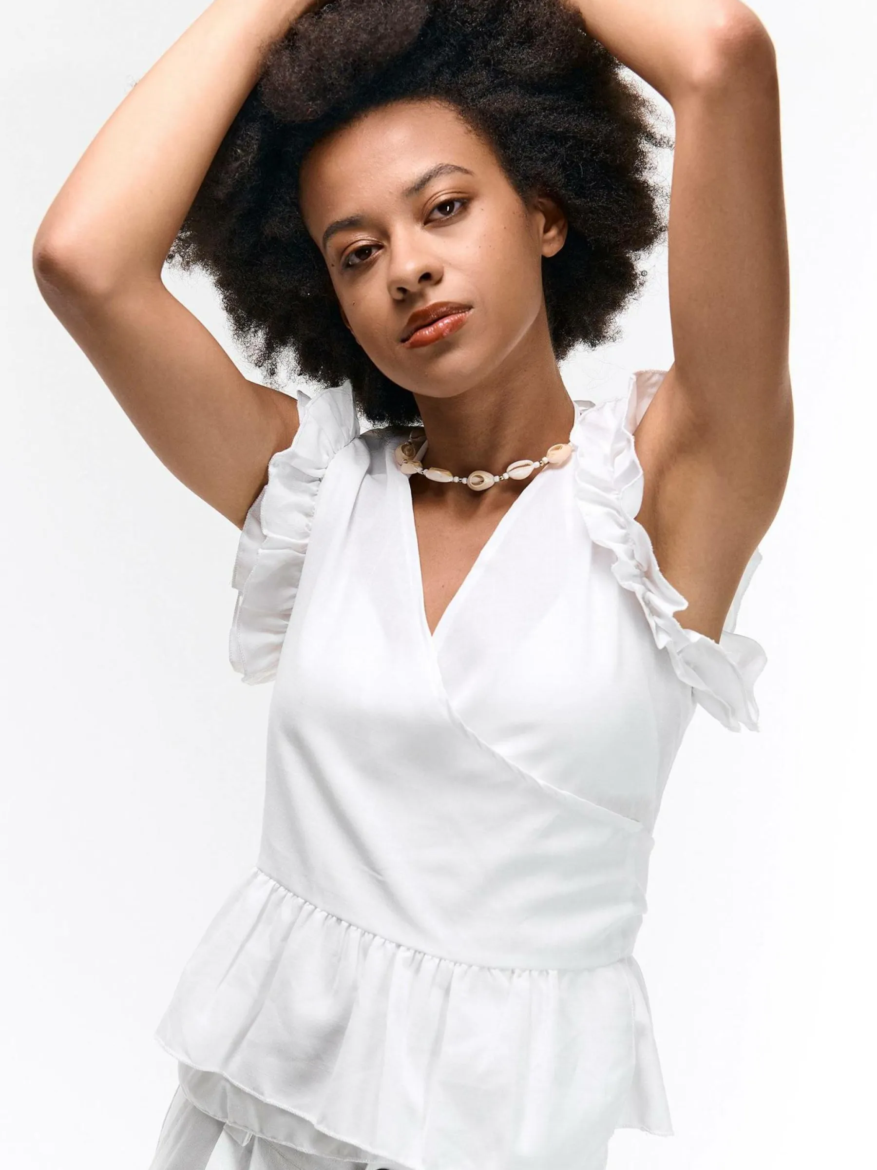 Kolor: białyKrój: kopertówkiTyp: top, bluzkaRekaw: bez rękawówDługość: krótkiPattern style: pojedynczy kolorDet…