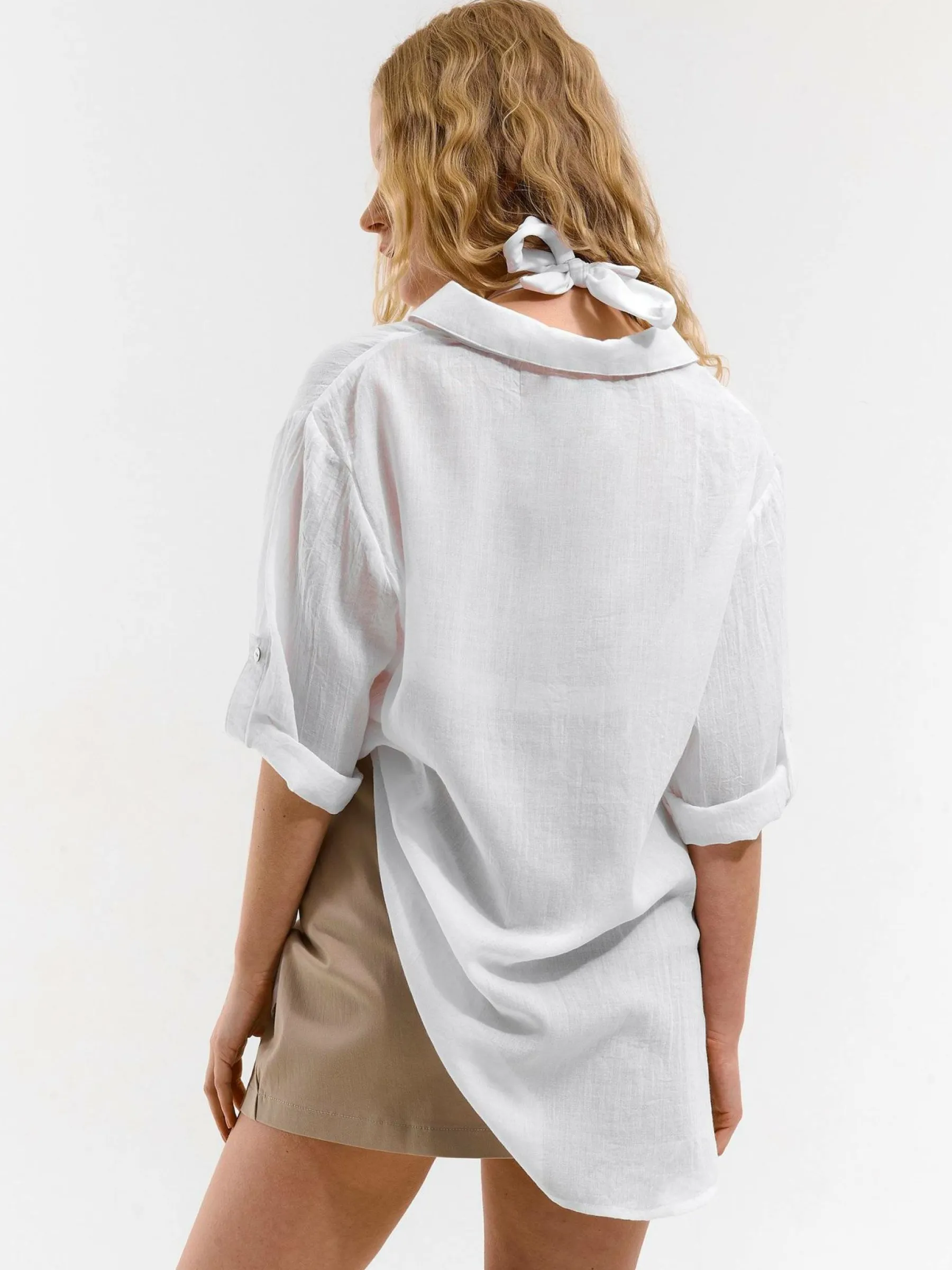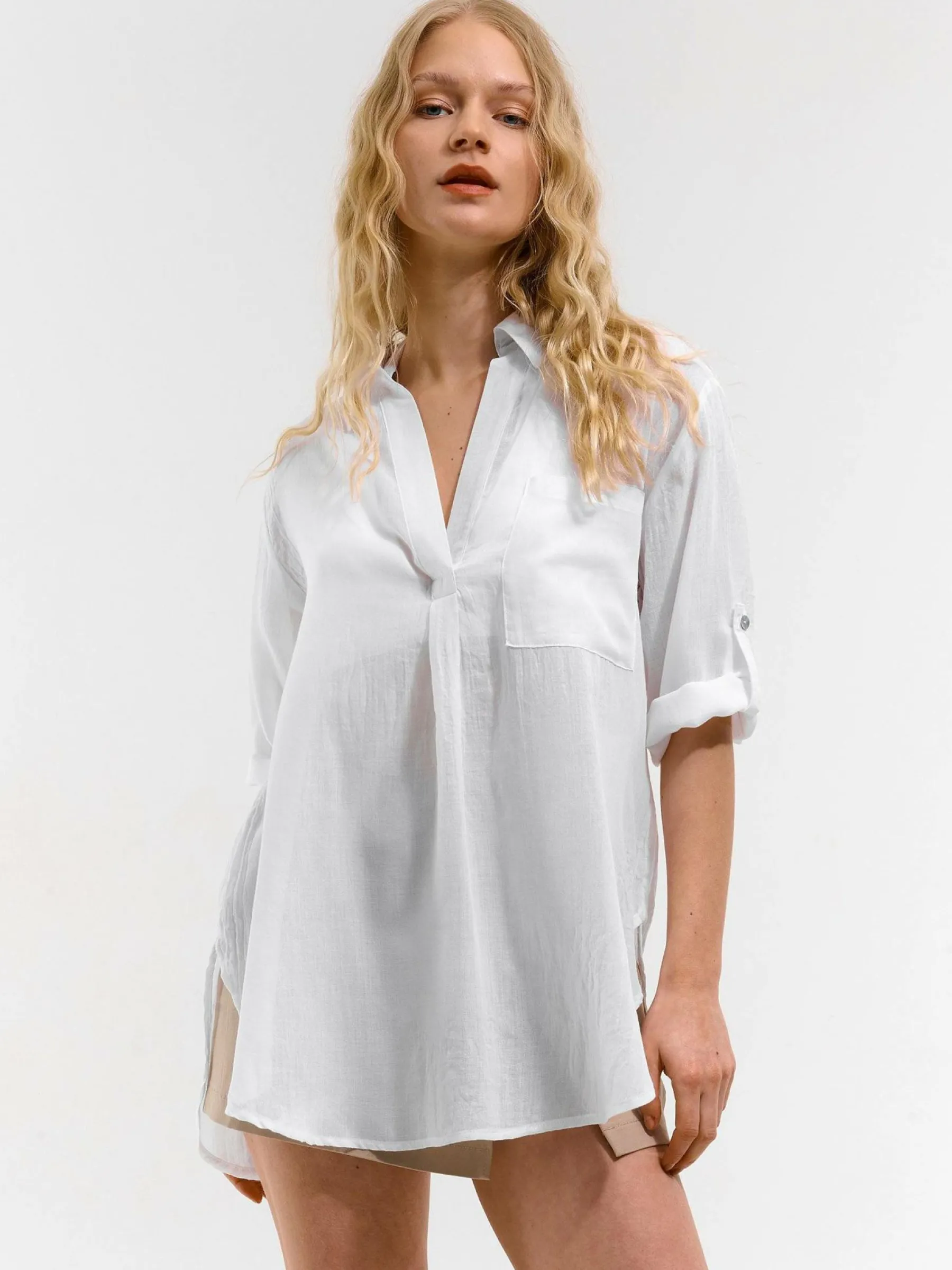Kolor: białyKrój: asymetryczneTyp: bluzkaRekaw: rękaw 3/4Długość: dlugiePattern style: pojedynczy kolorDetal: nad …
