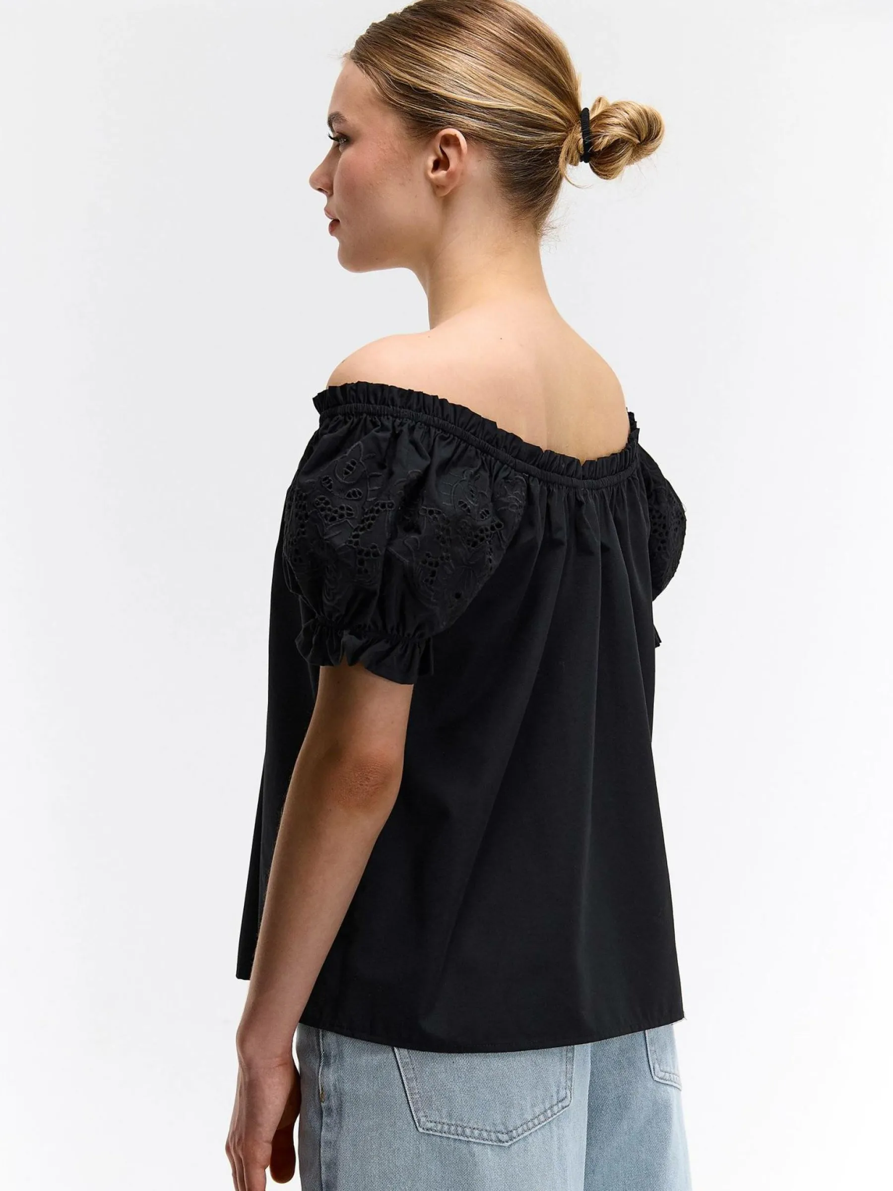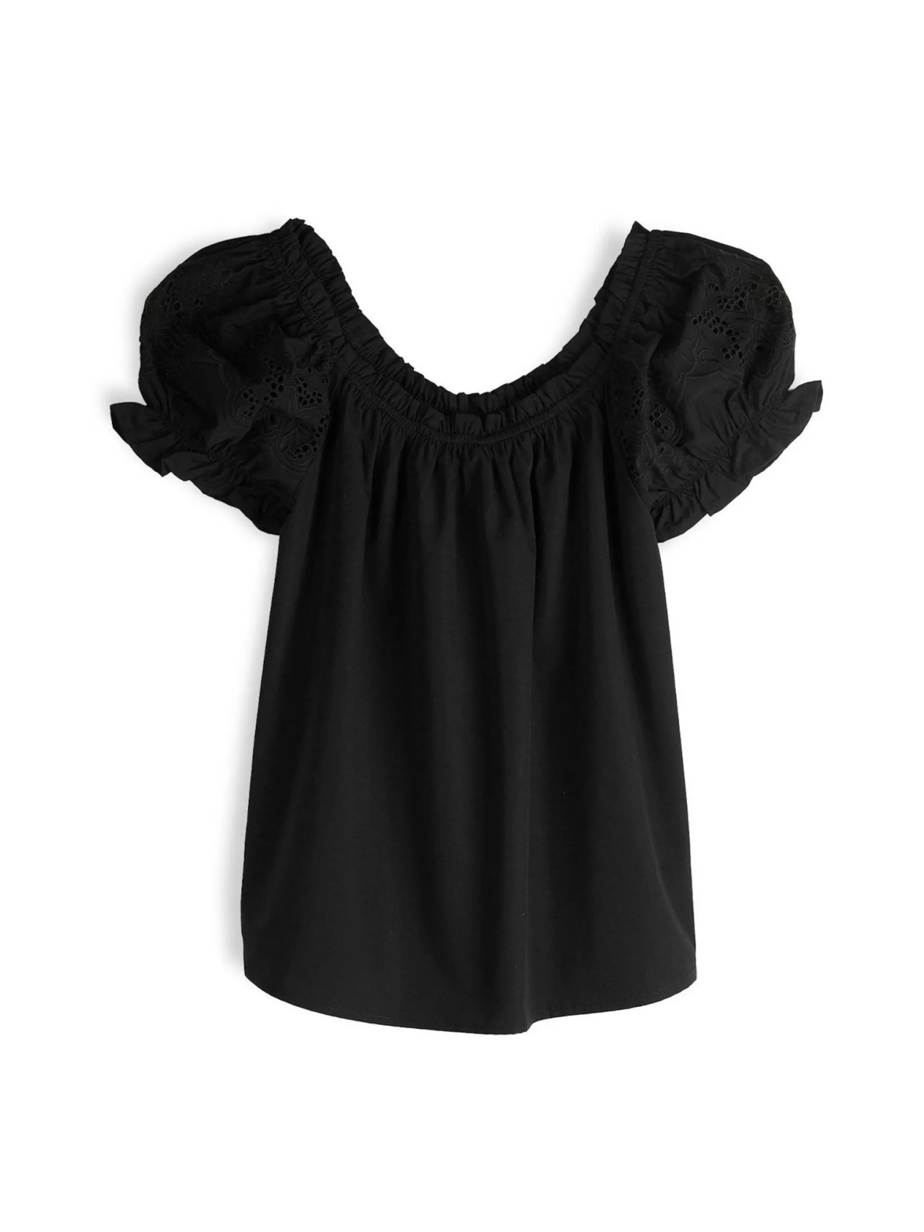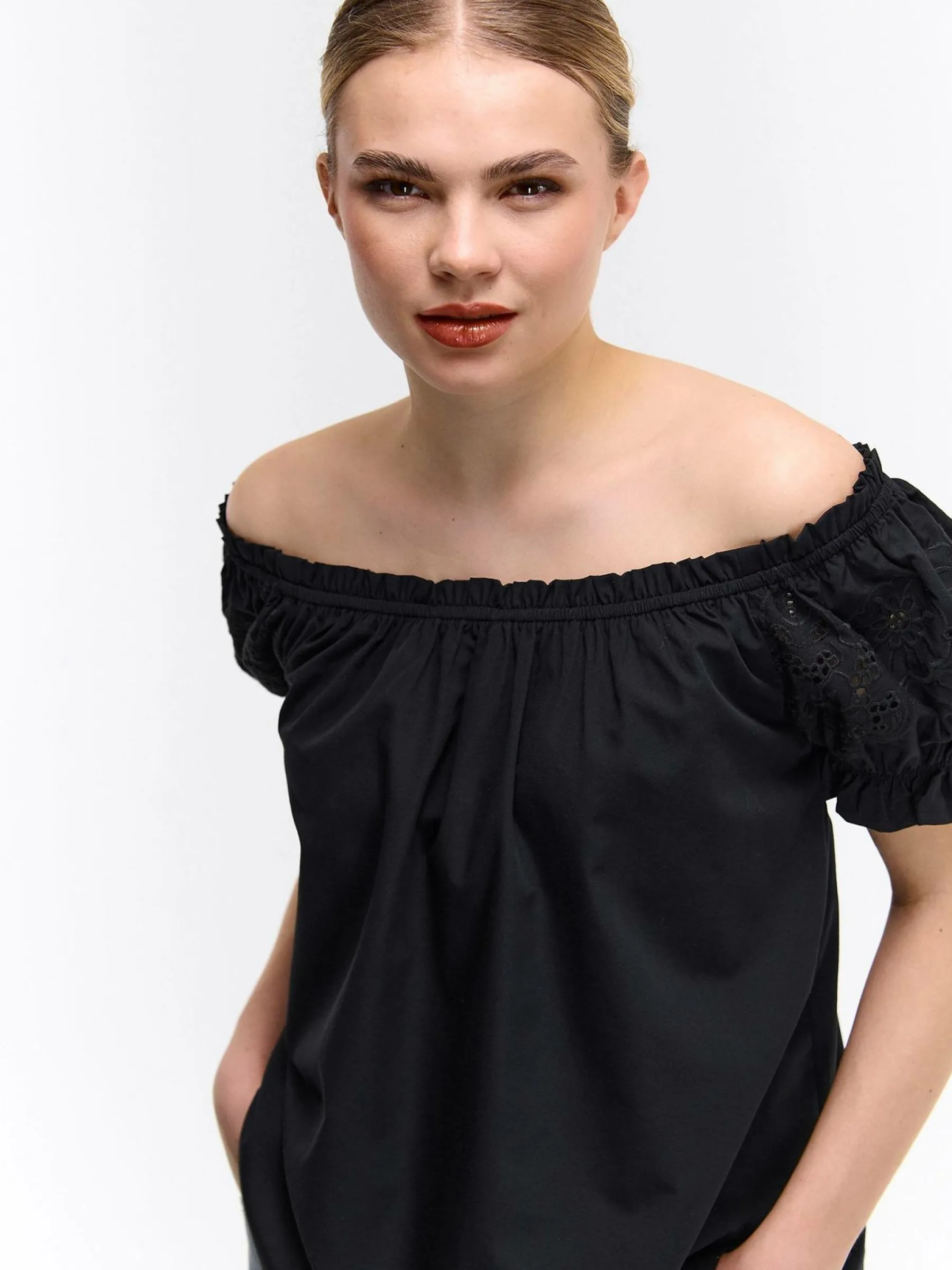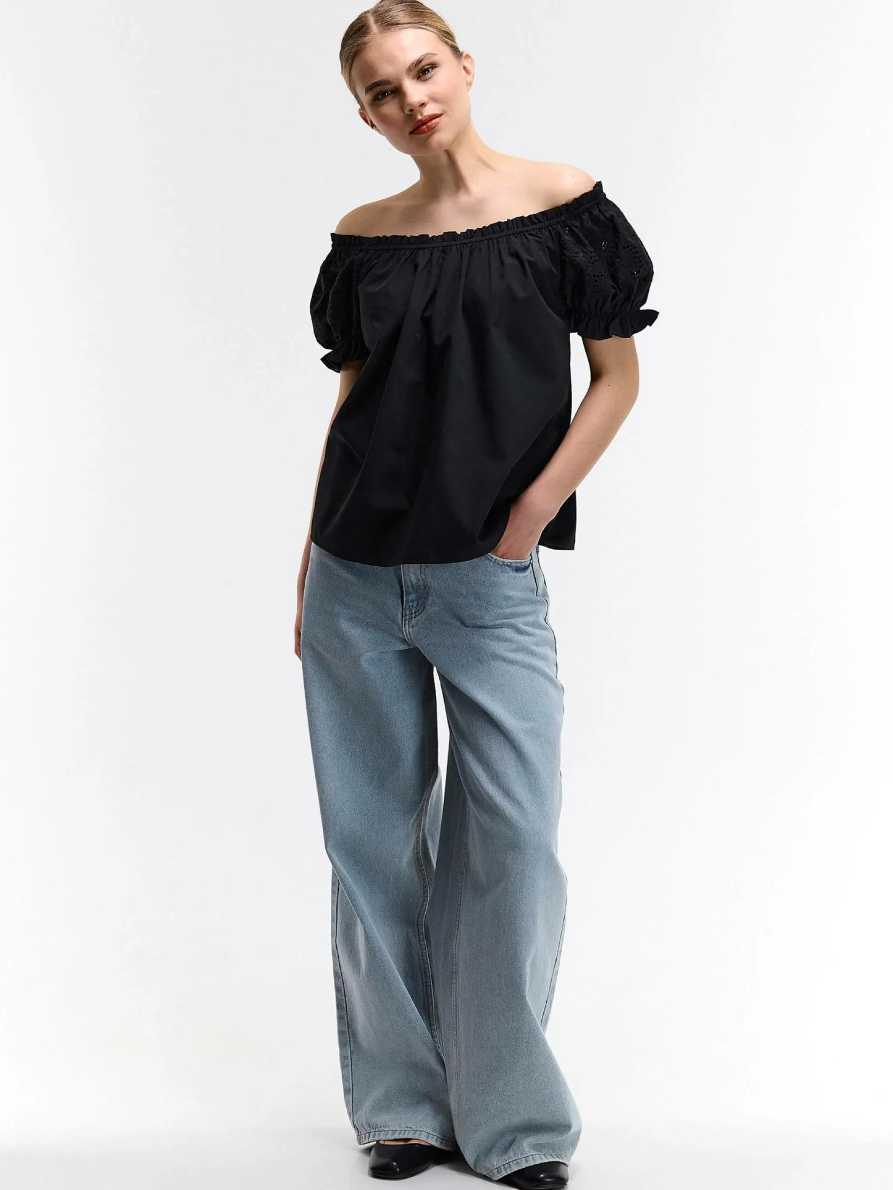 Kolor: czarnyKrój: z marszczeniemTyp: top, bluzkaRekaw: krótki rękawDługość: krótkiPattern style: pojedynczy kolo…