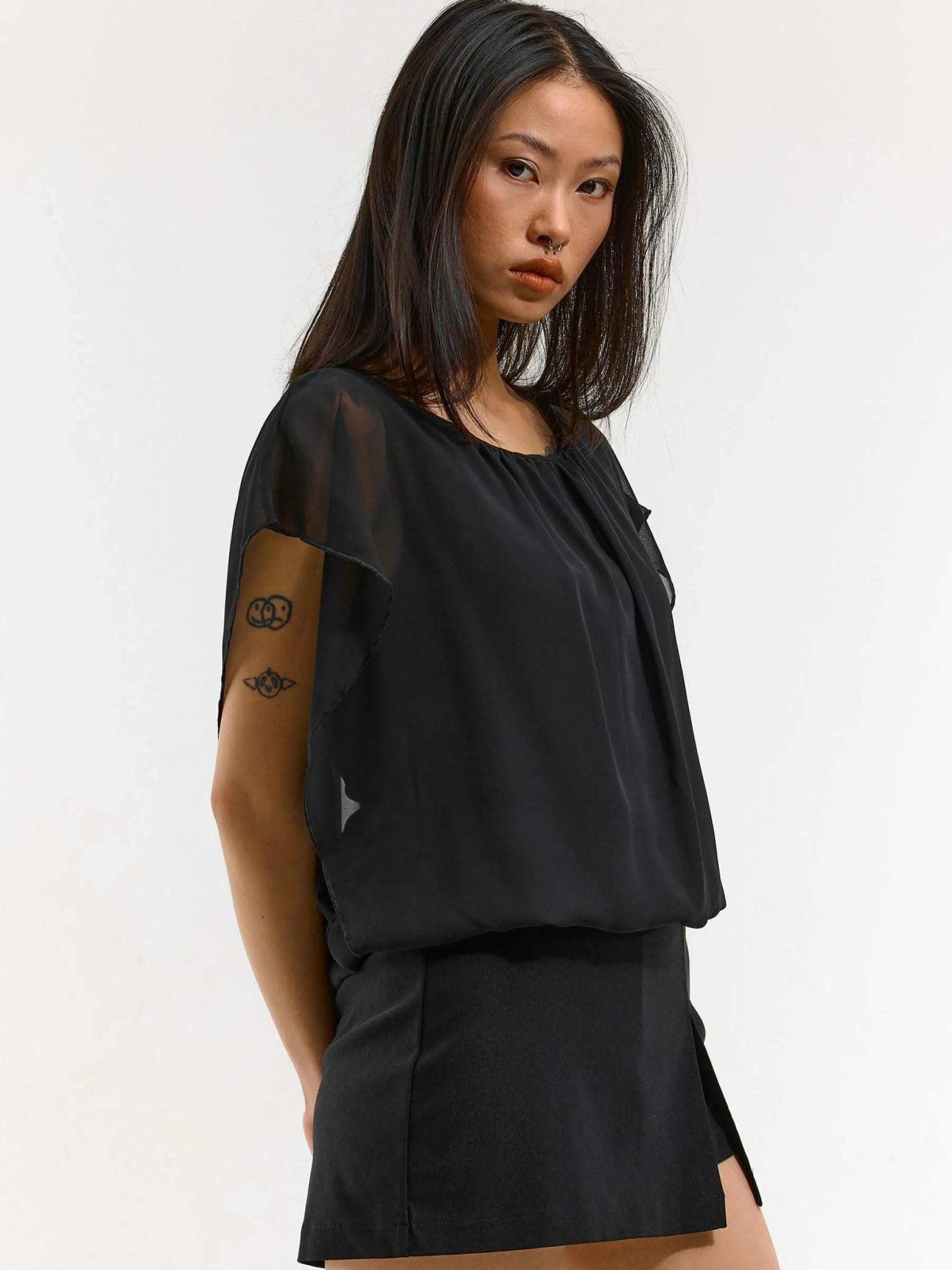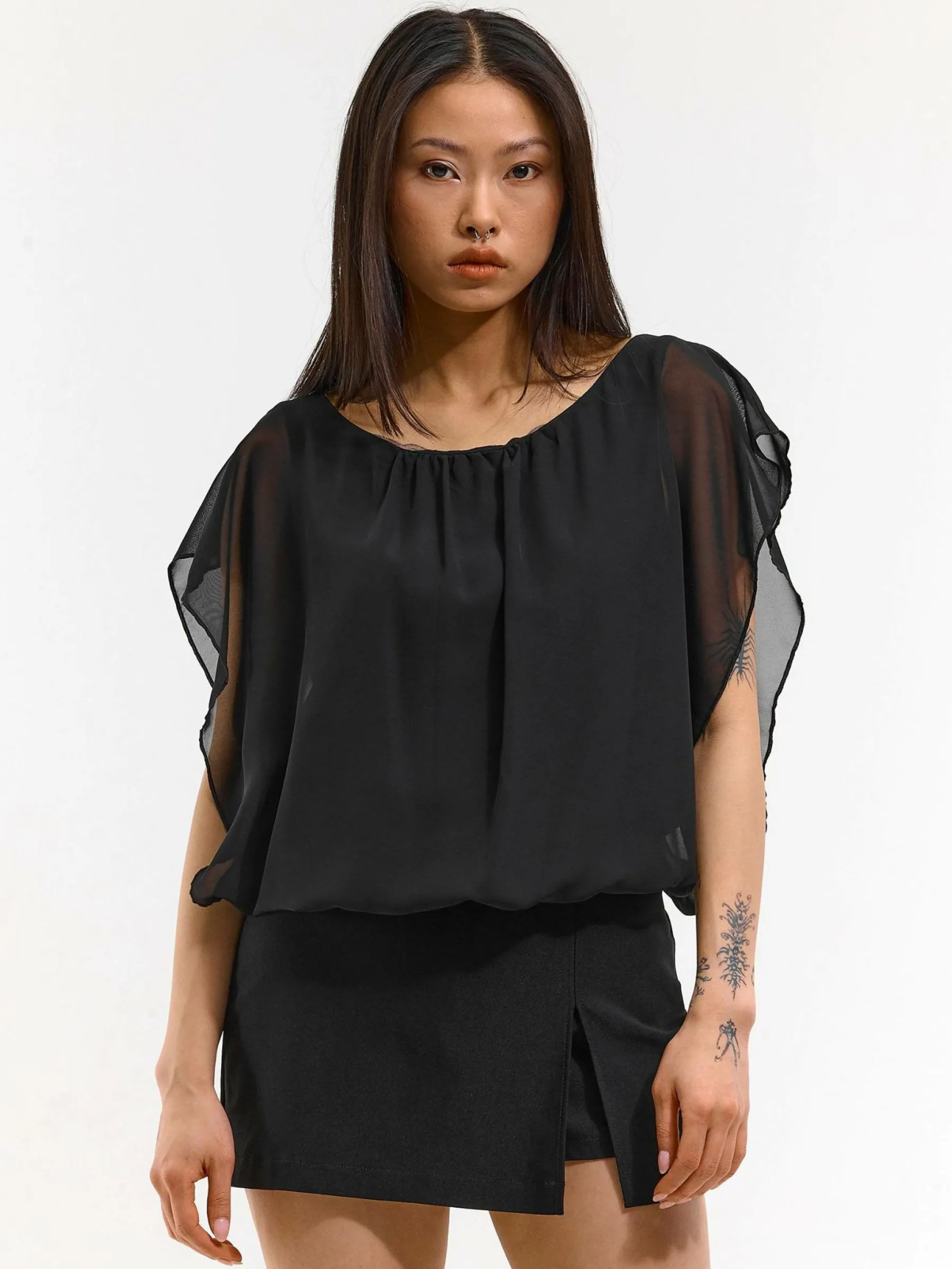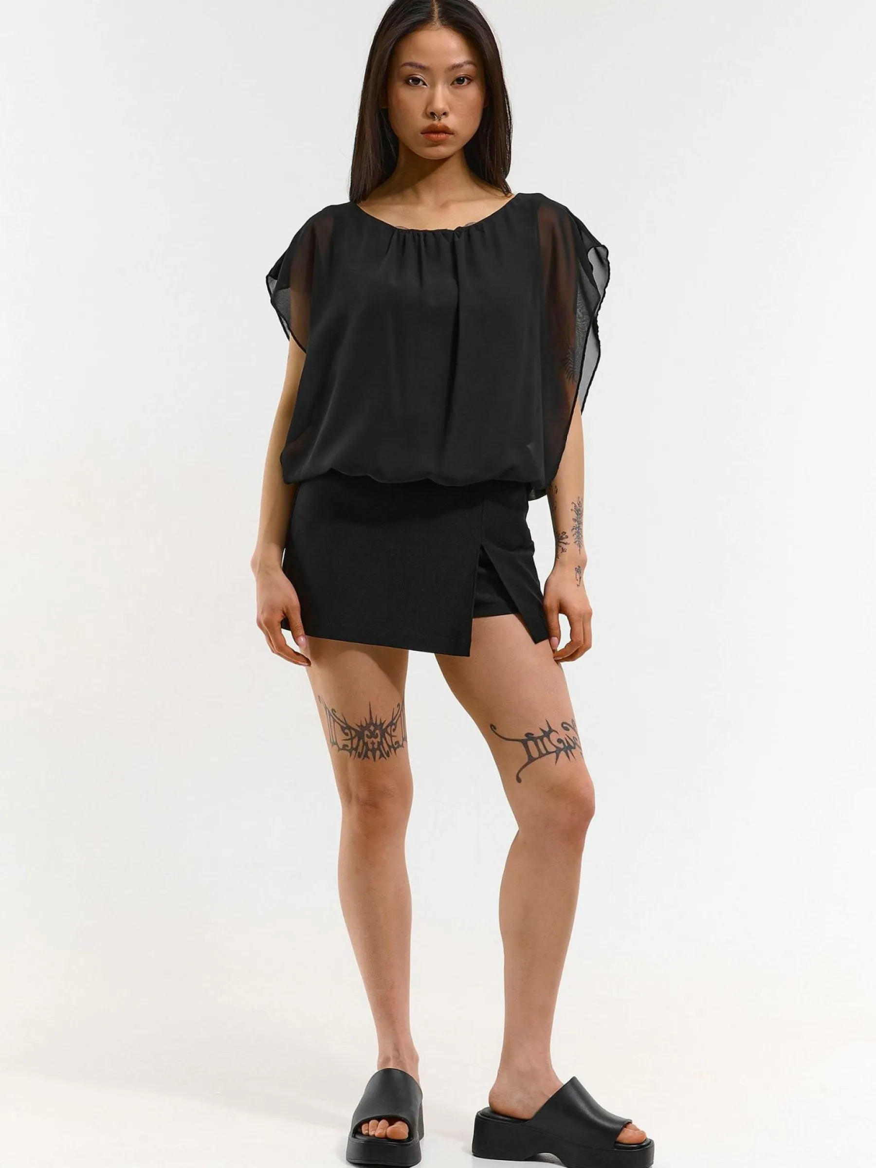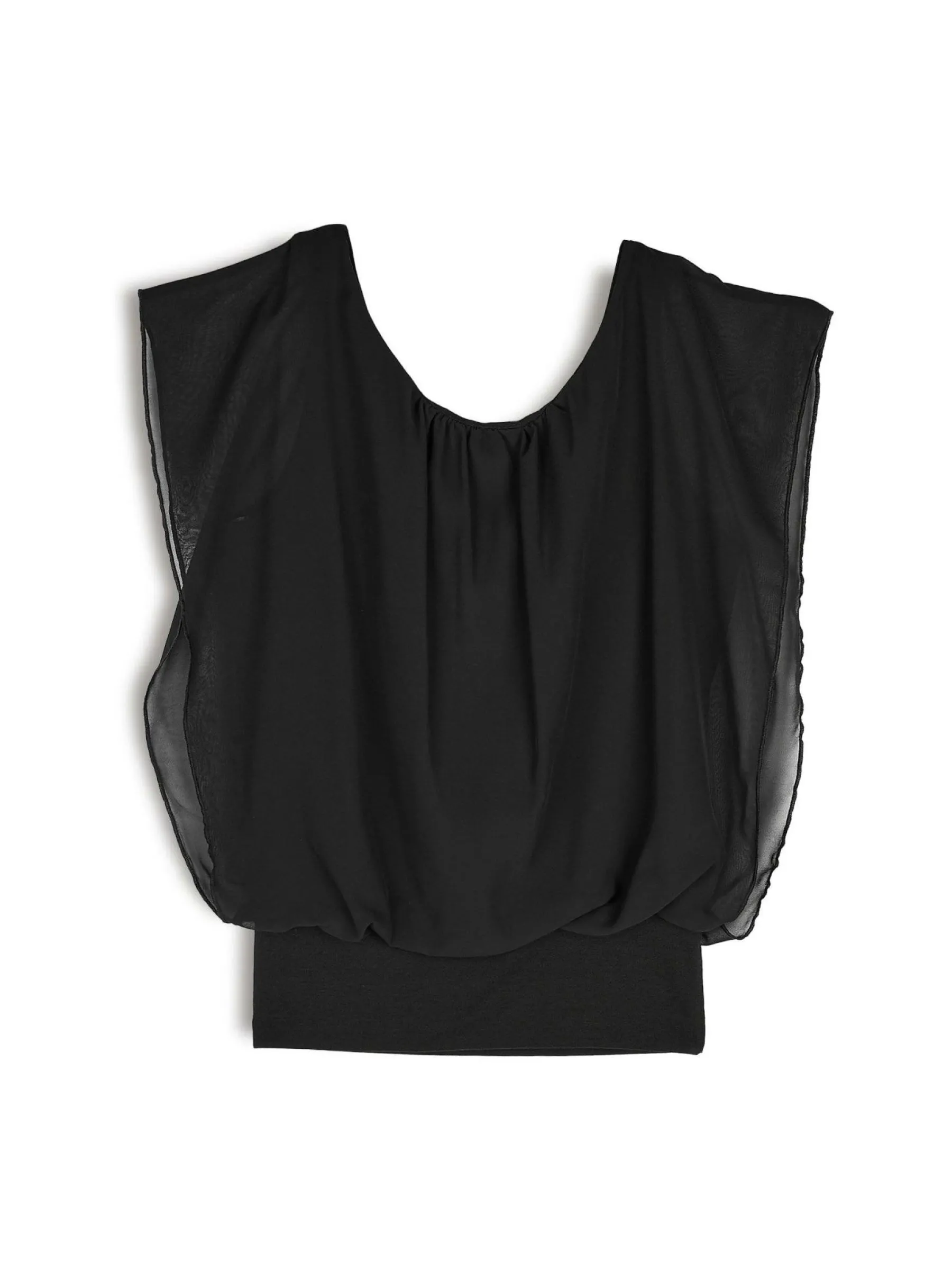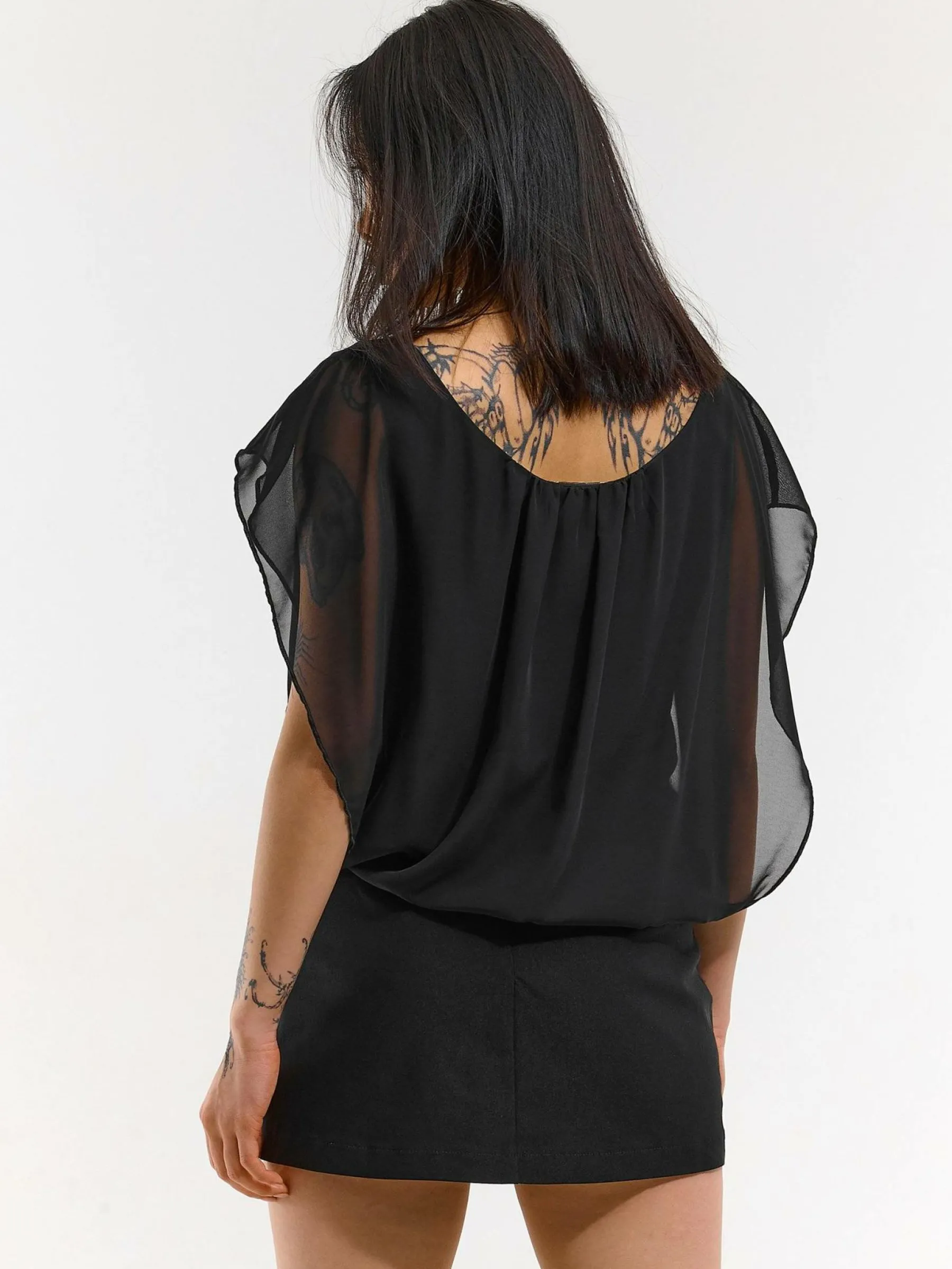 Kolor: czarnyKrój: z marszczeniemTyp: bluzka, topRekaw: bez rękawówDługość: krótkiPattern style: pojedynczy kolor…