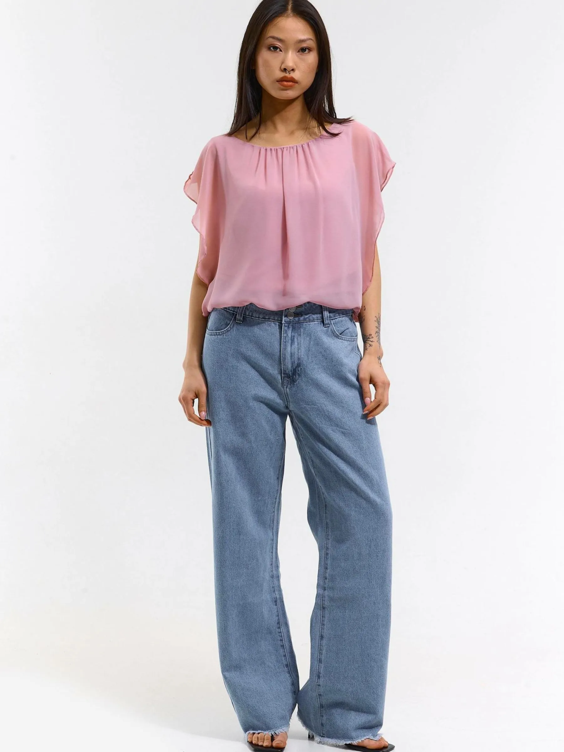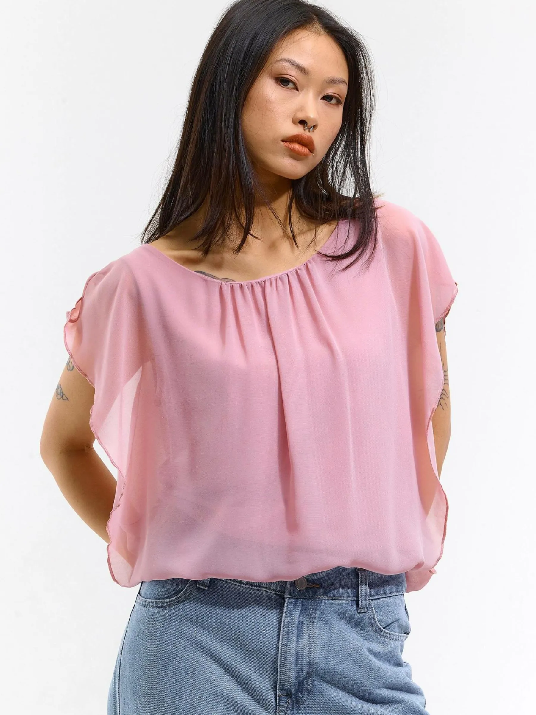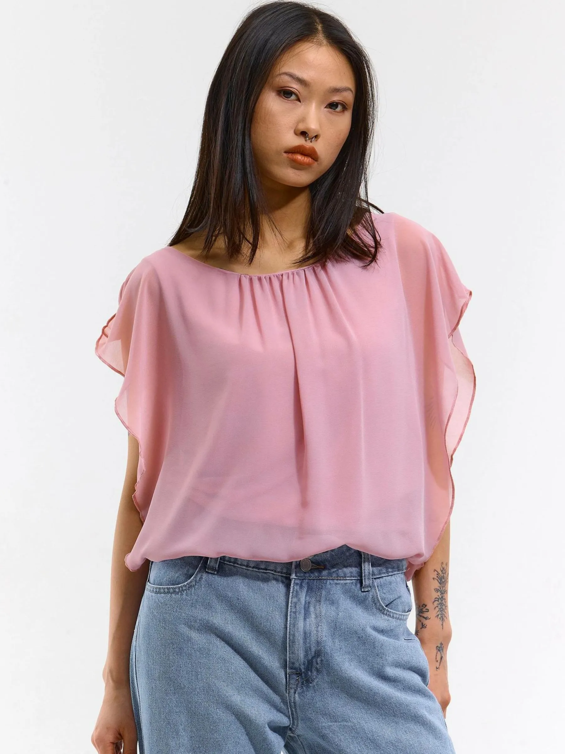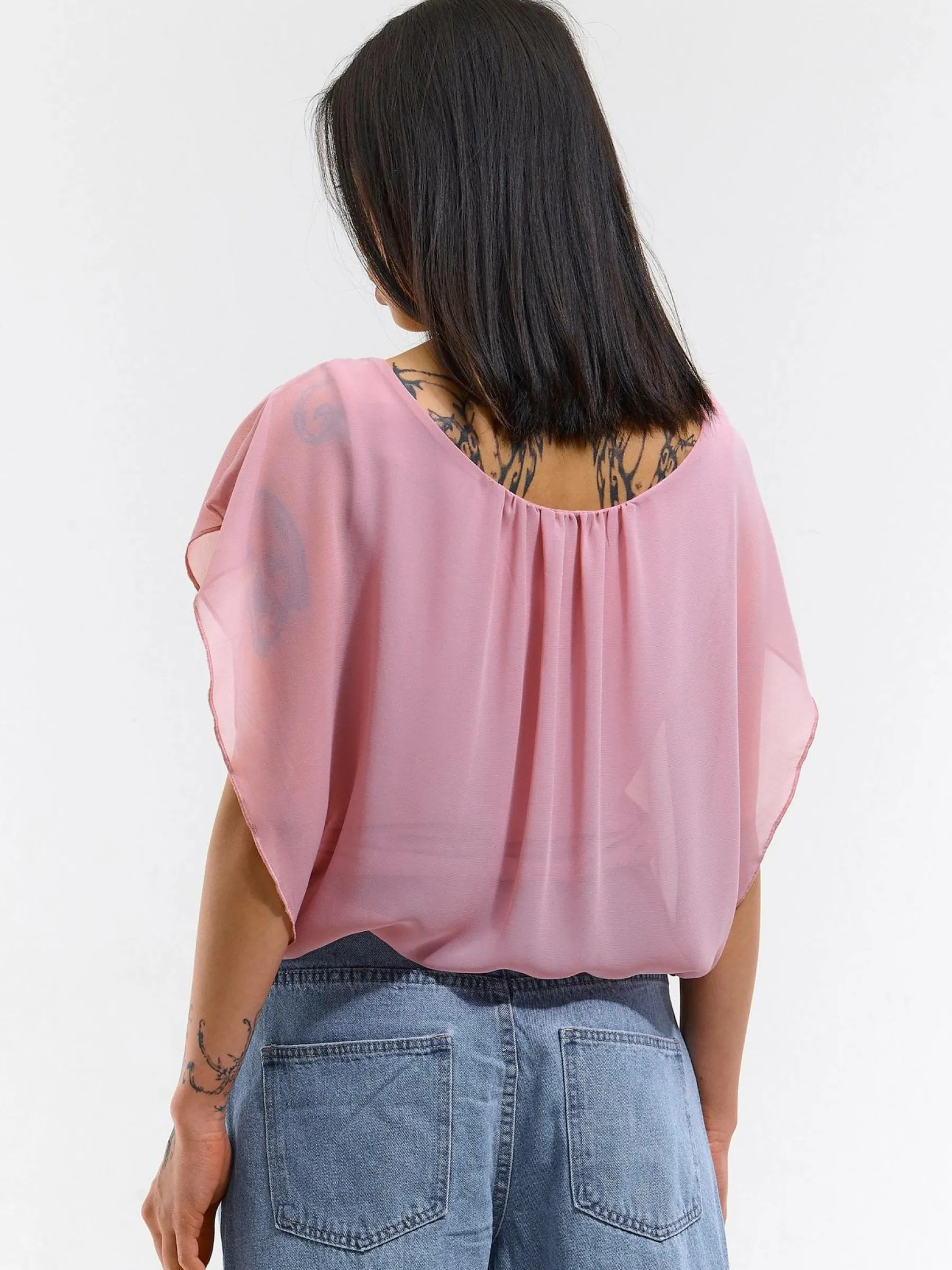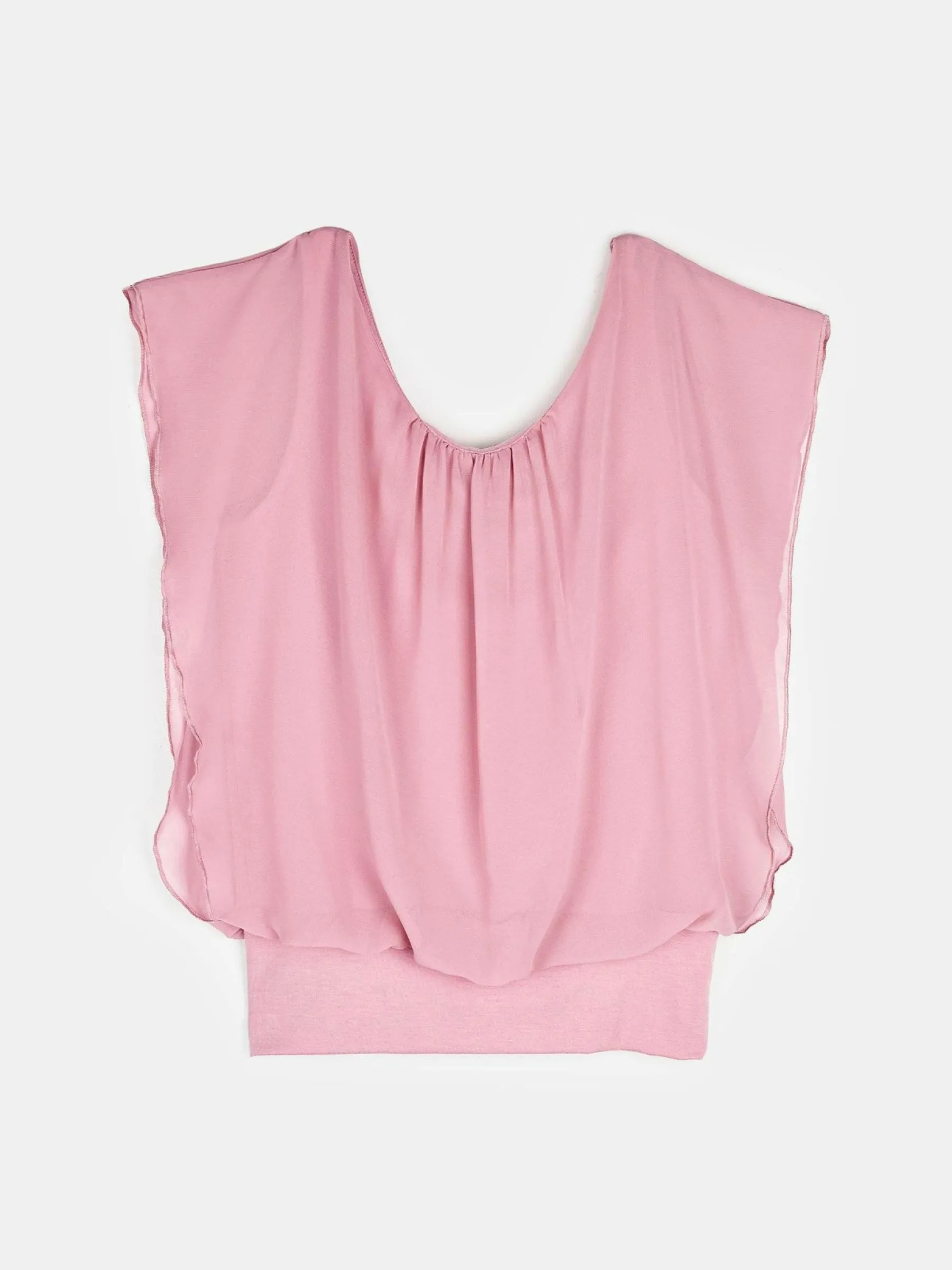Kolor: różowyKrój: z marszczeniemTyp: bluzka, topRekaw: bez rękawówDługość: krótkiPattern style: pojedynczy kol…