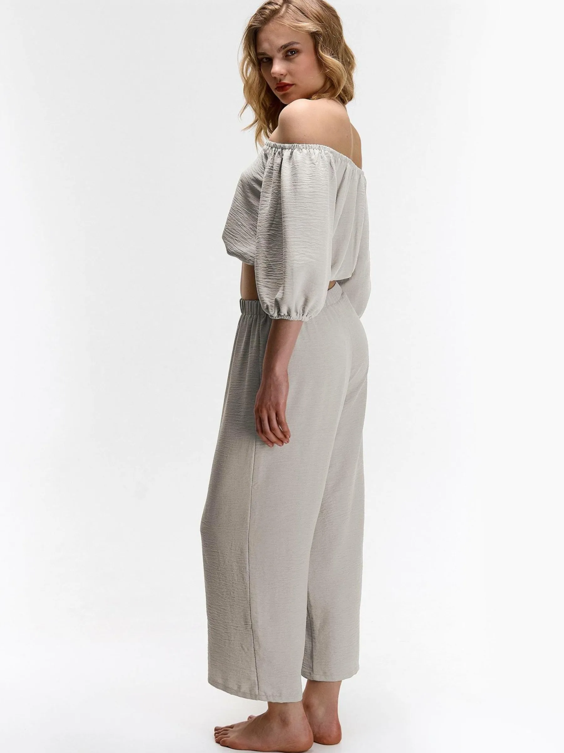Kolor: beżowyKrój: z marszczeniemTyp: topRekaw: krótki rękawDługość: krótki topPattern style: pojedynczy kolorDe…