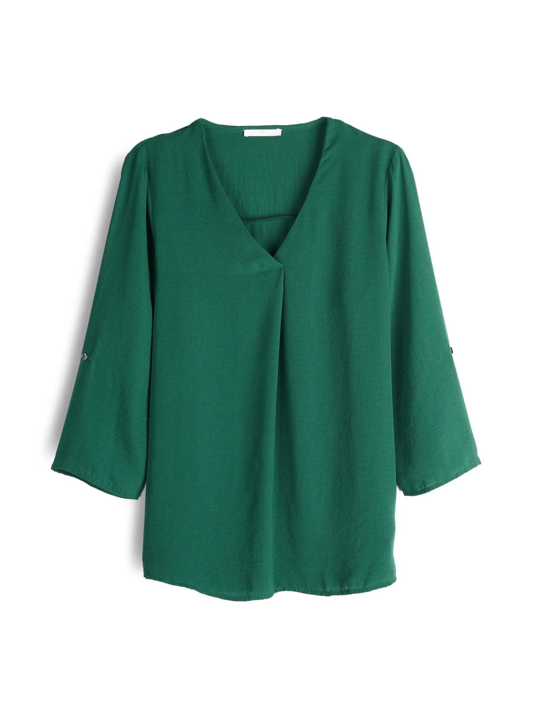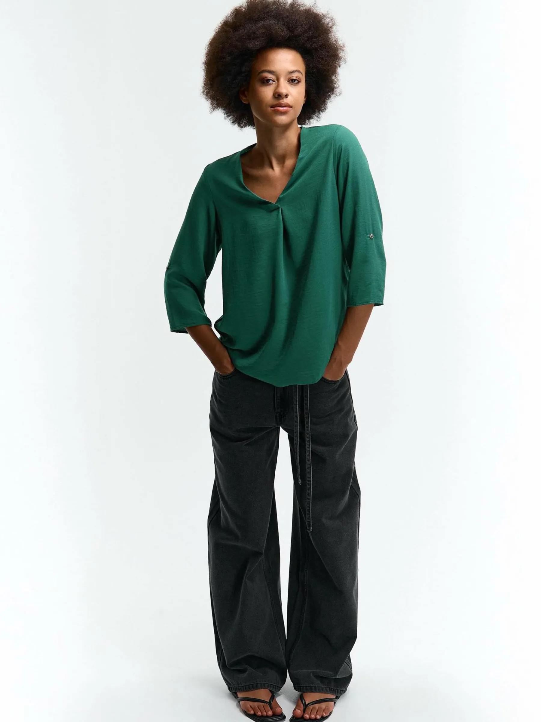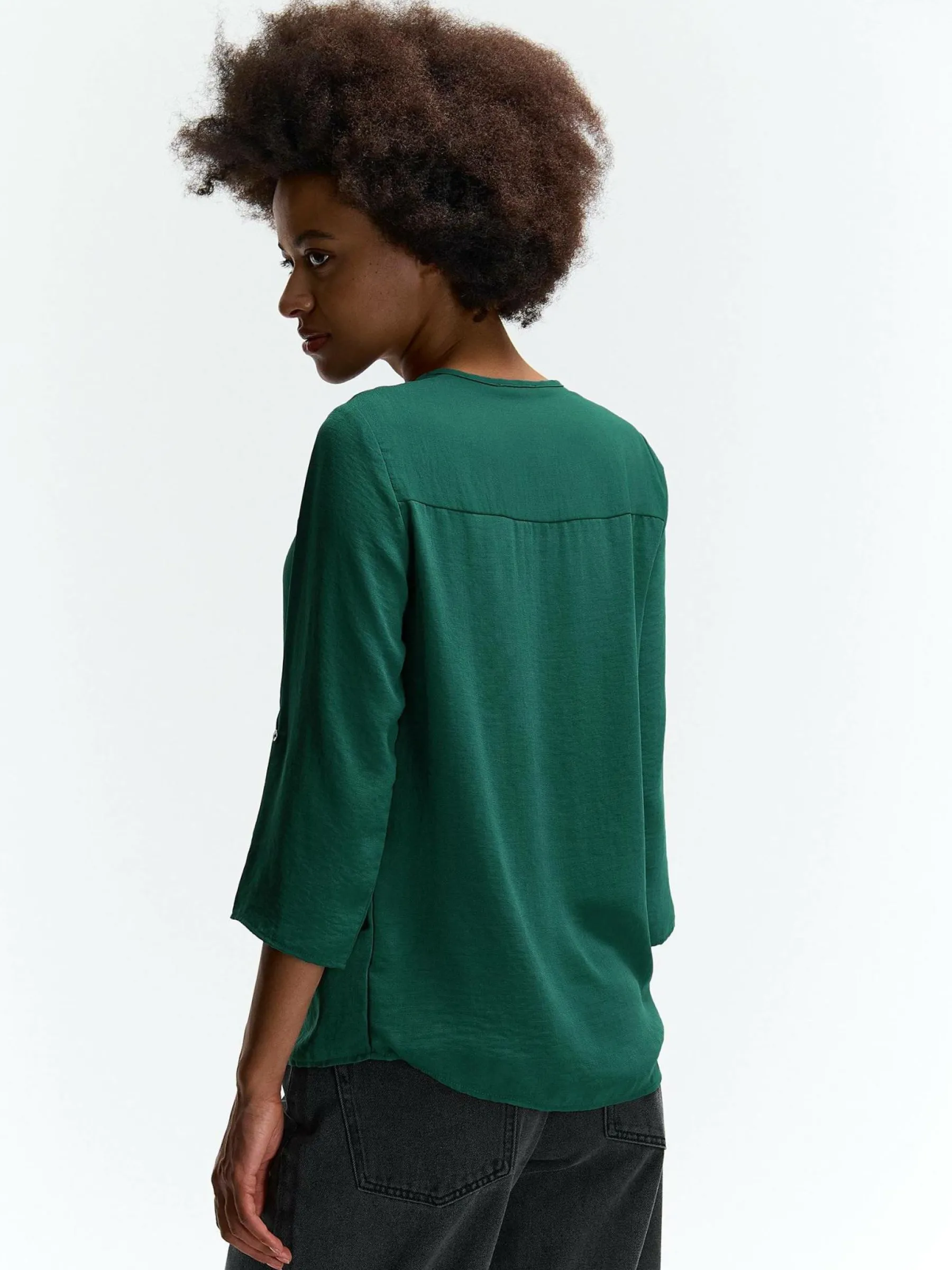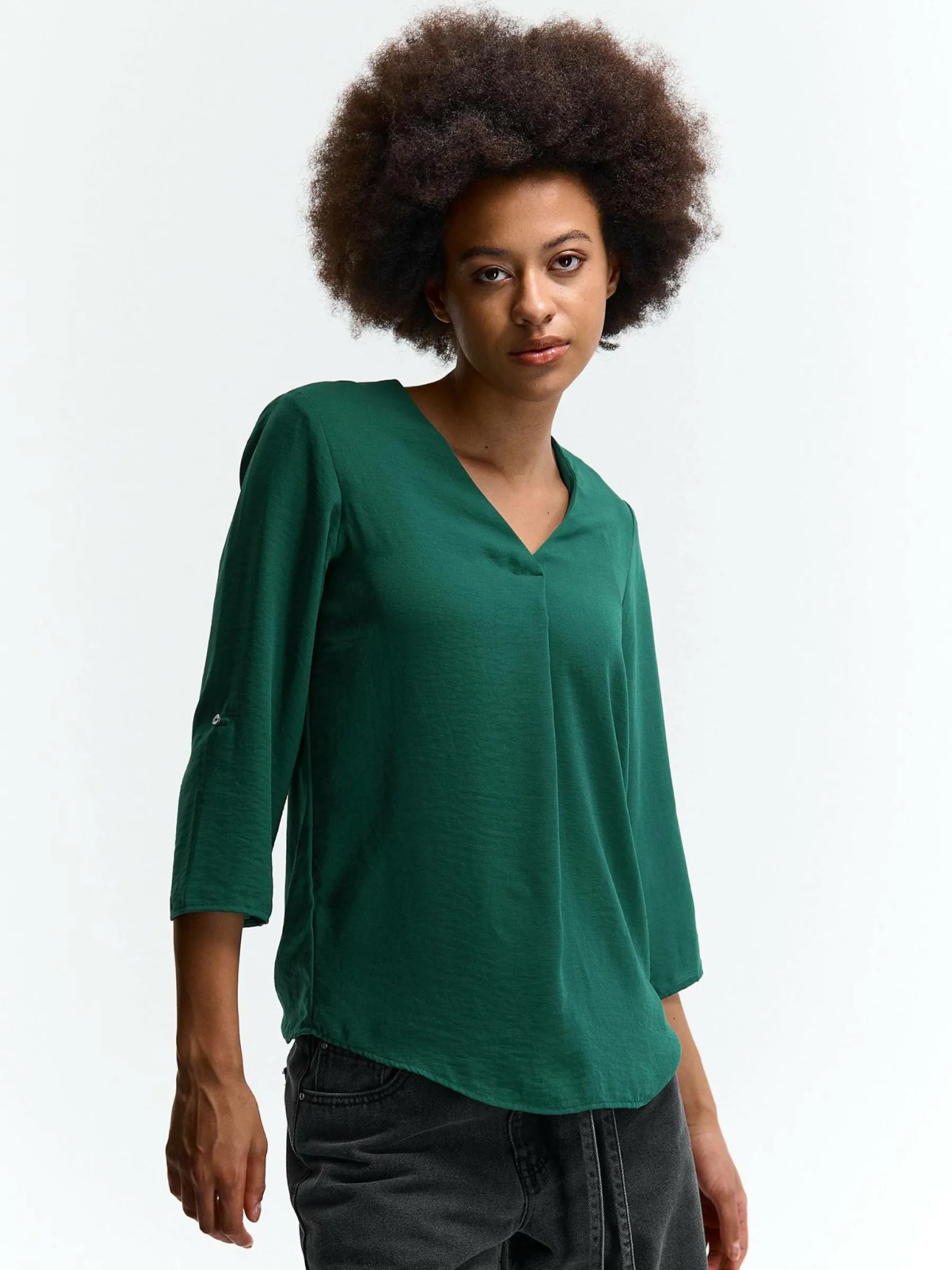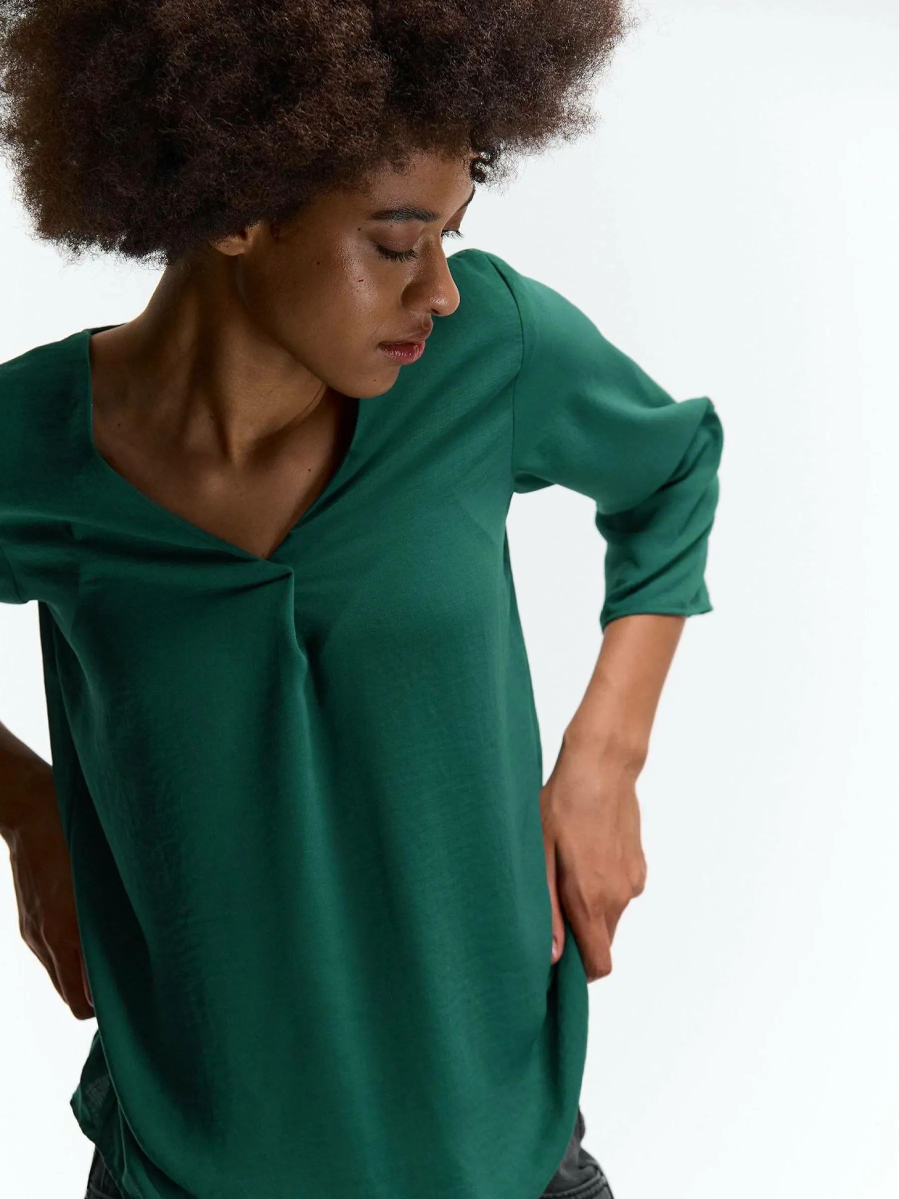 Kolor: zielonyKrój: regularTyp: bluzkaRekaw: rękaw 3/4Długość: krótkiPattern style: pojedynczy kolorDetal: v-neck,…