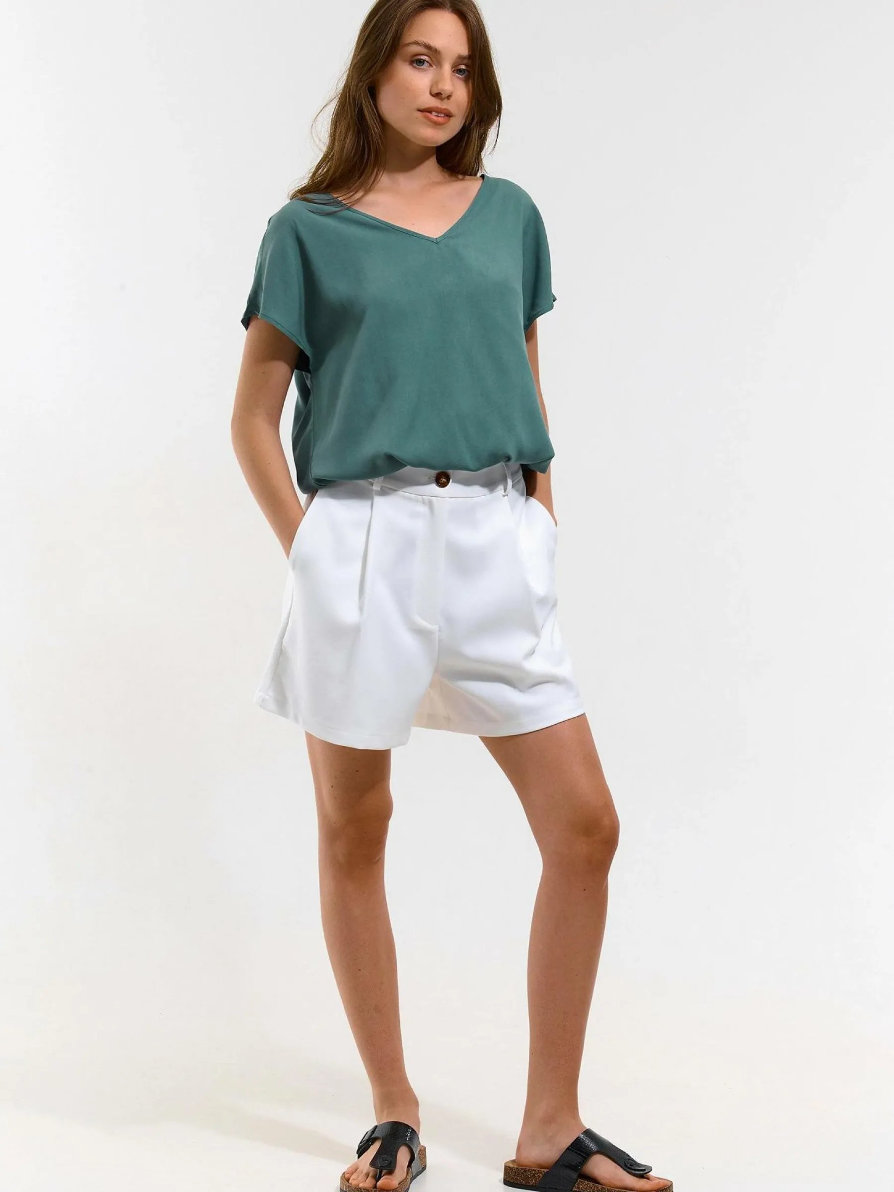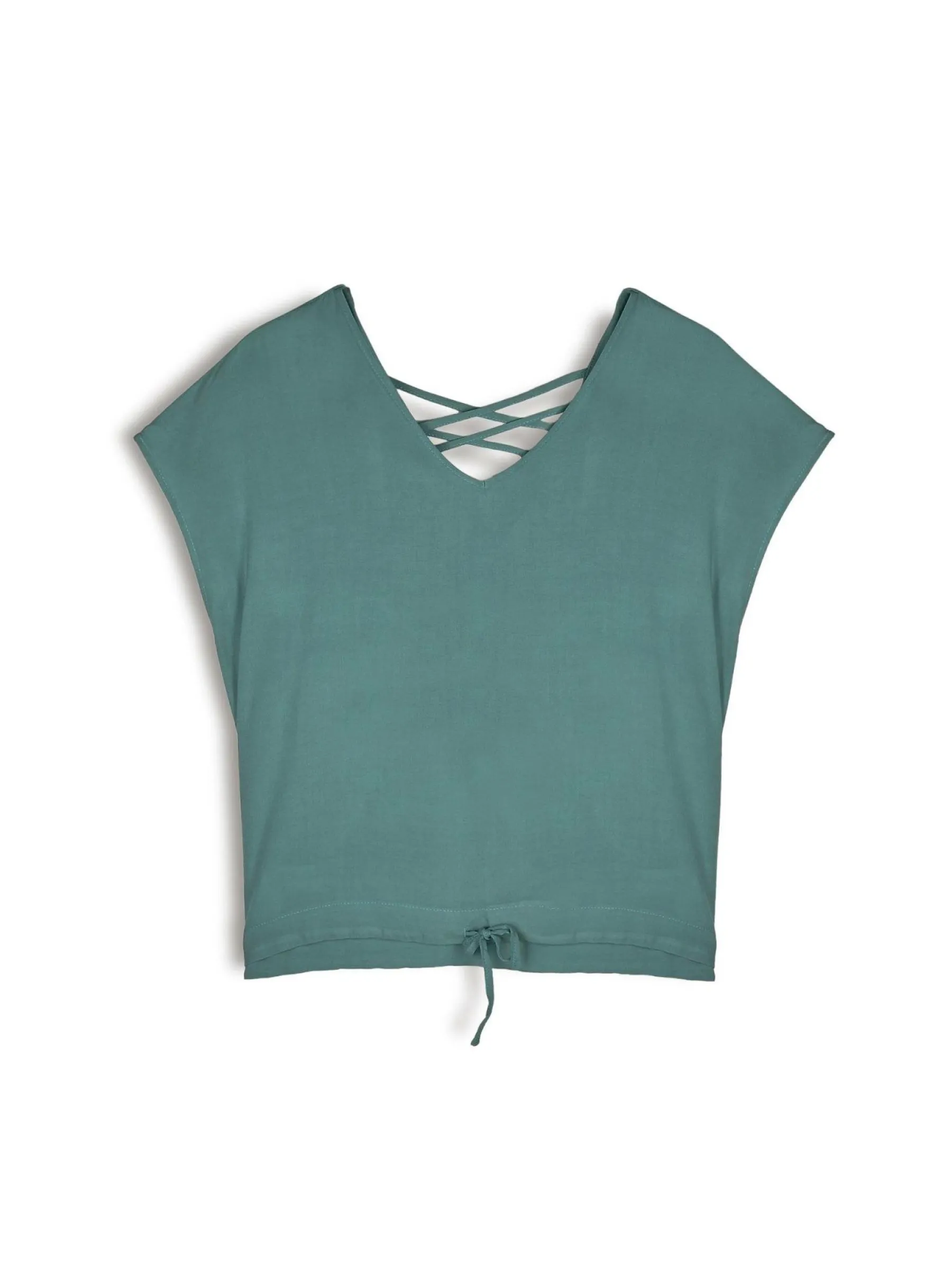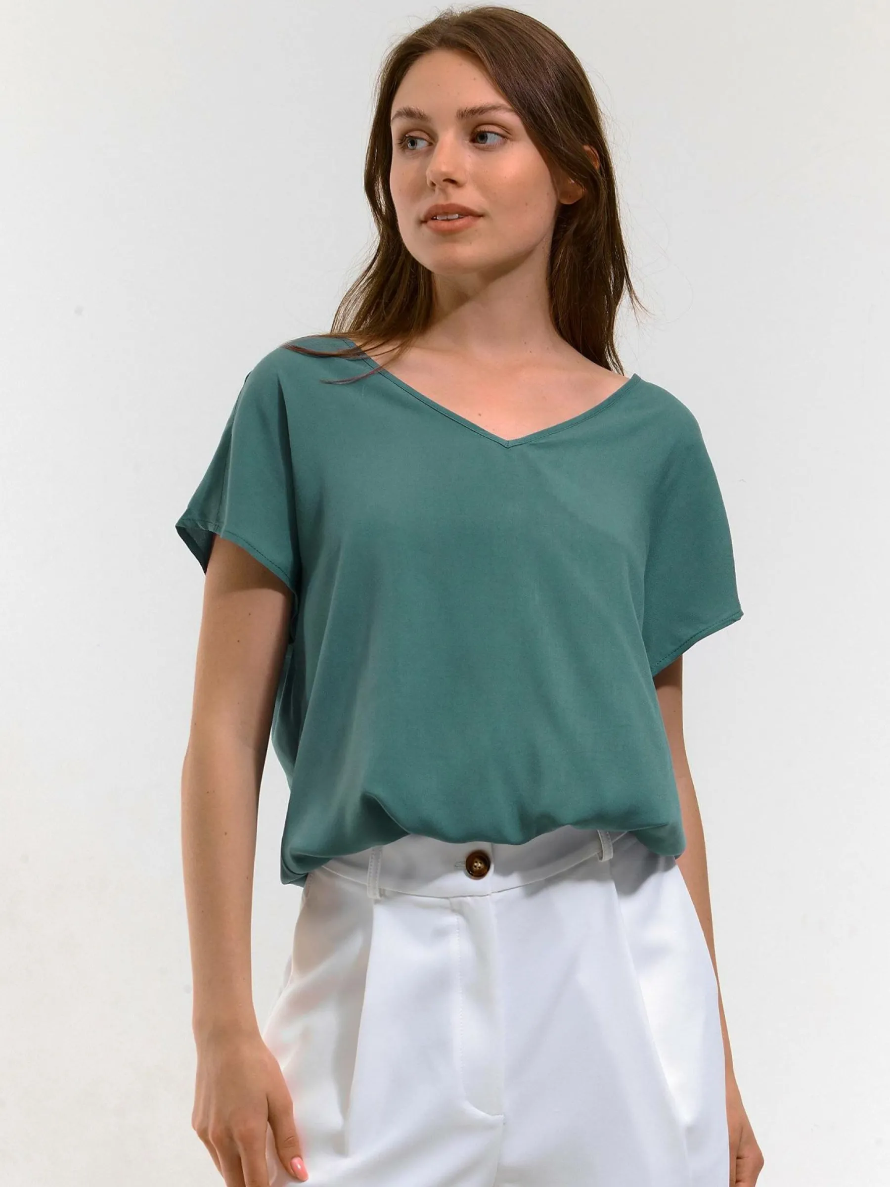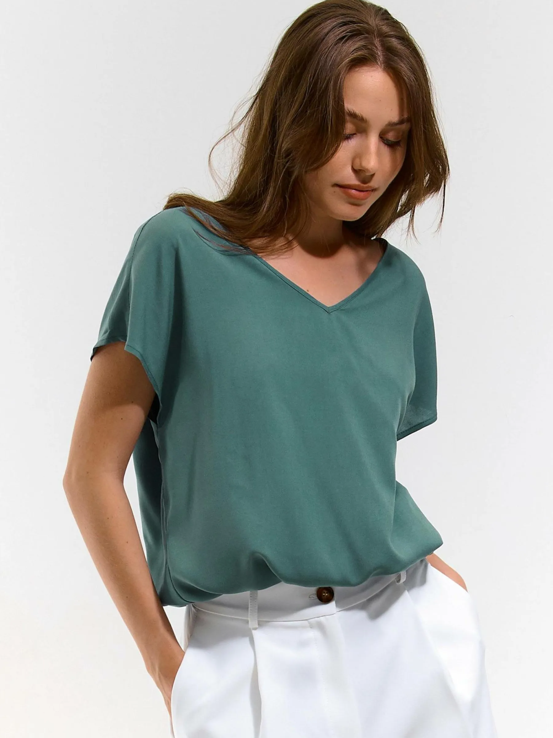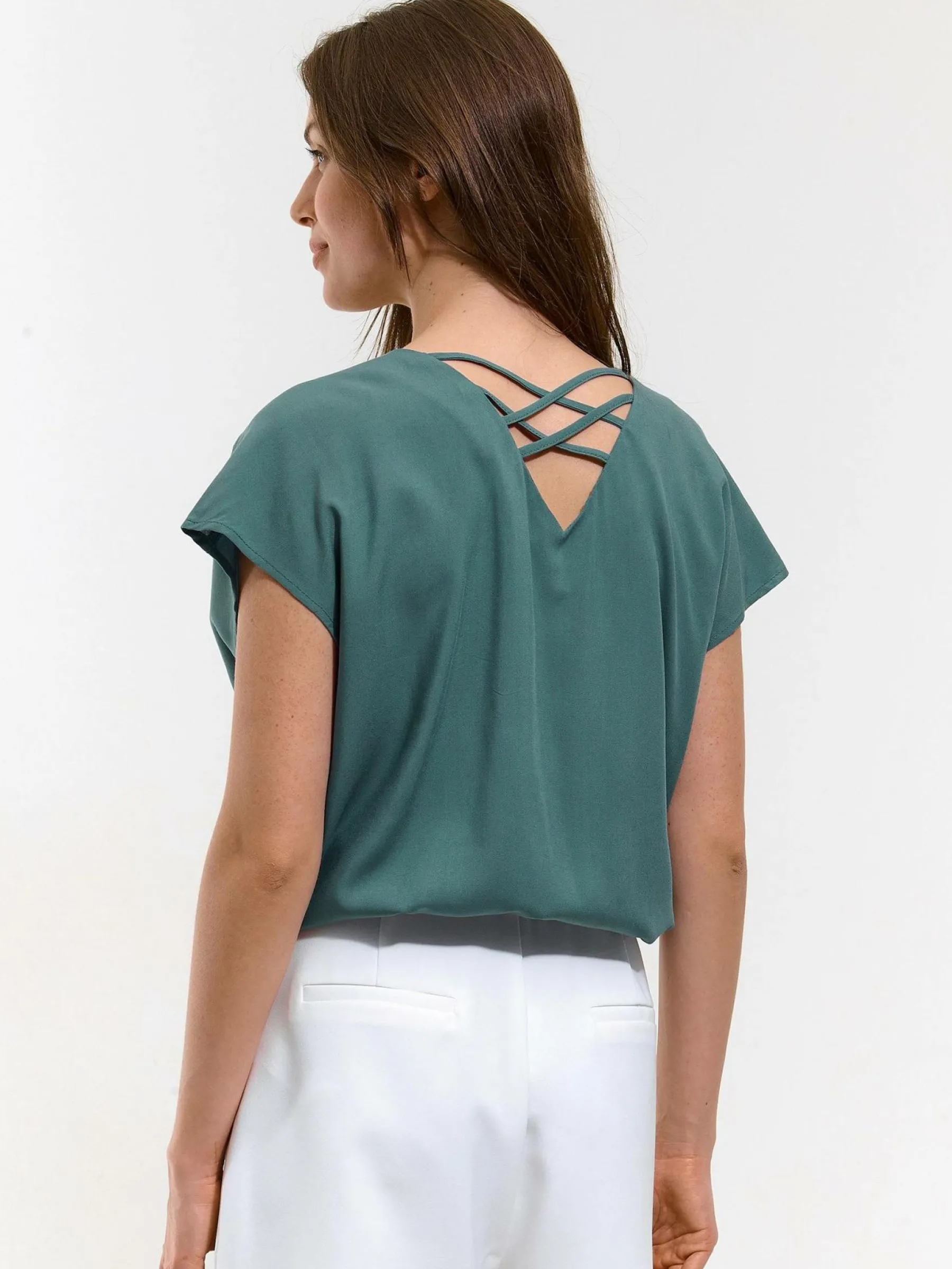 Kolor: zielonyKrój: regularTyp: bluzka, topRekaw: krótki rękawDługość: krótkiPattern style: pojedynczy kolorDetal…