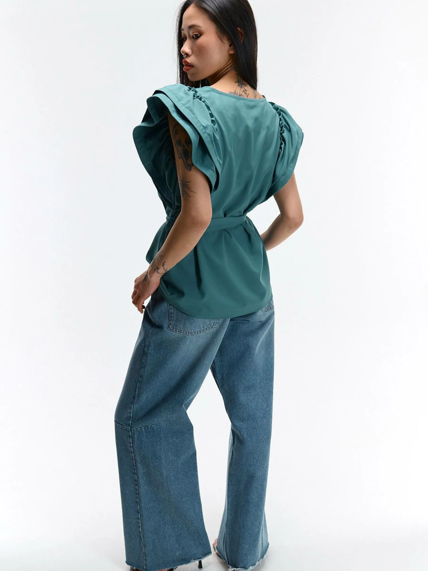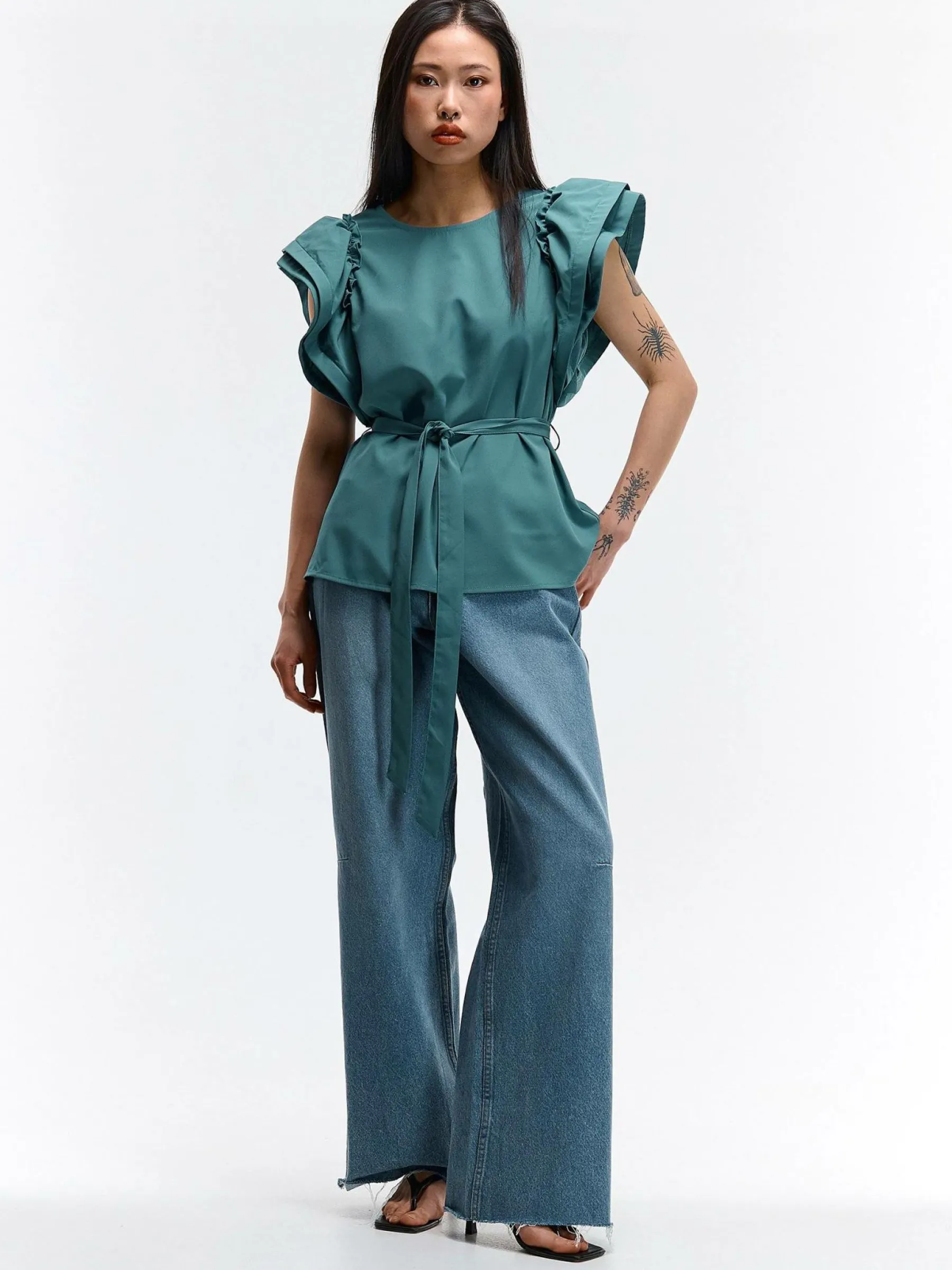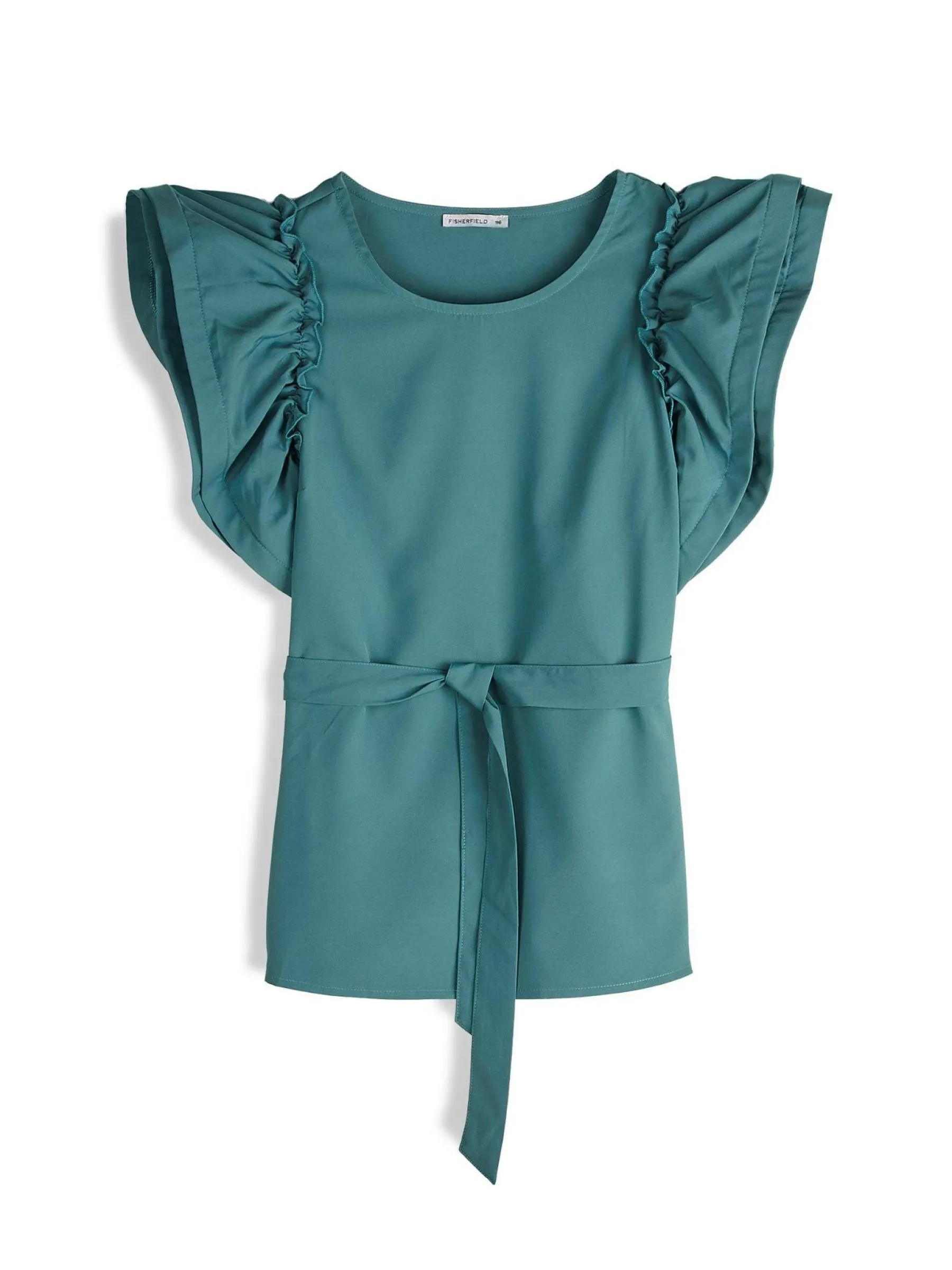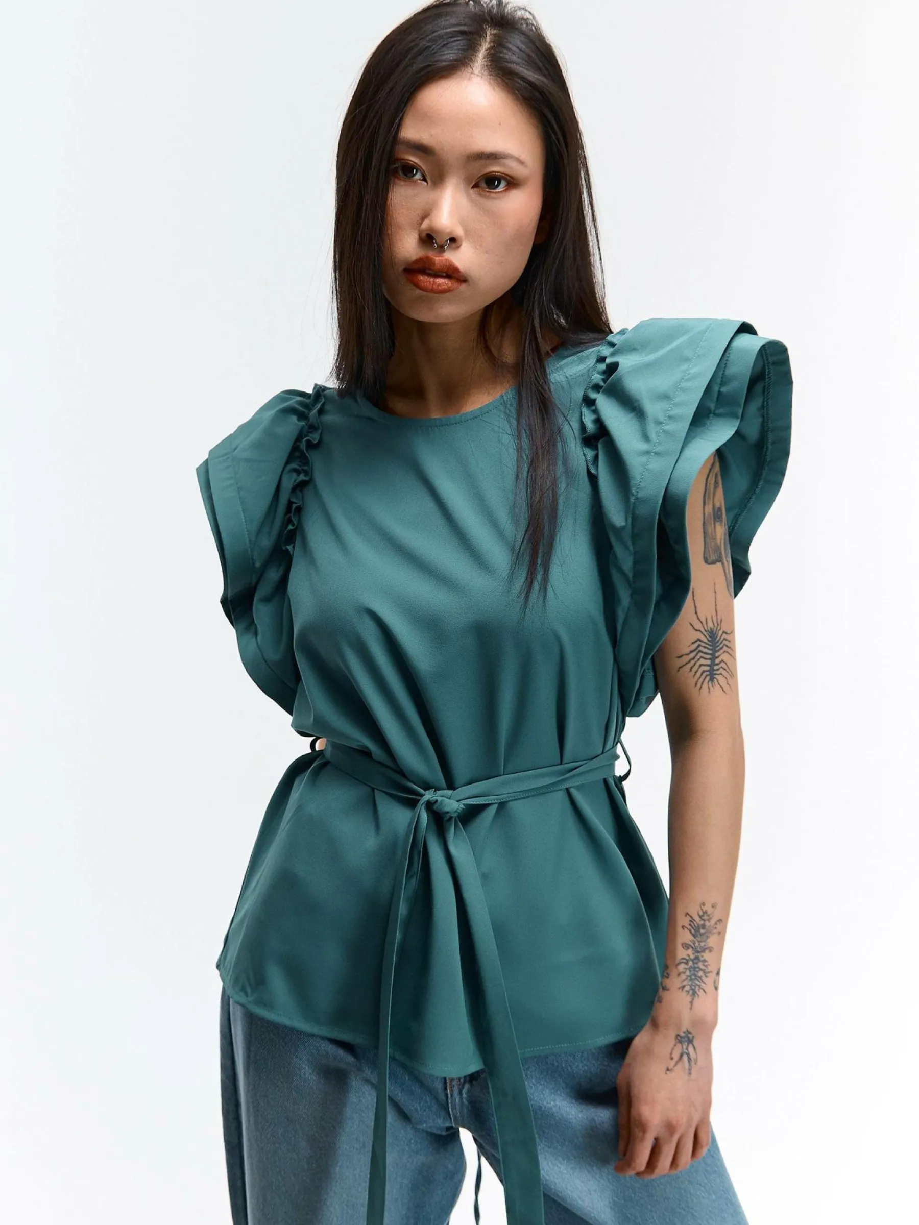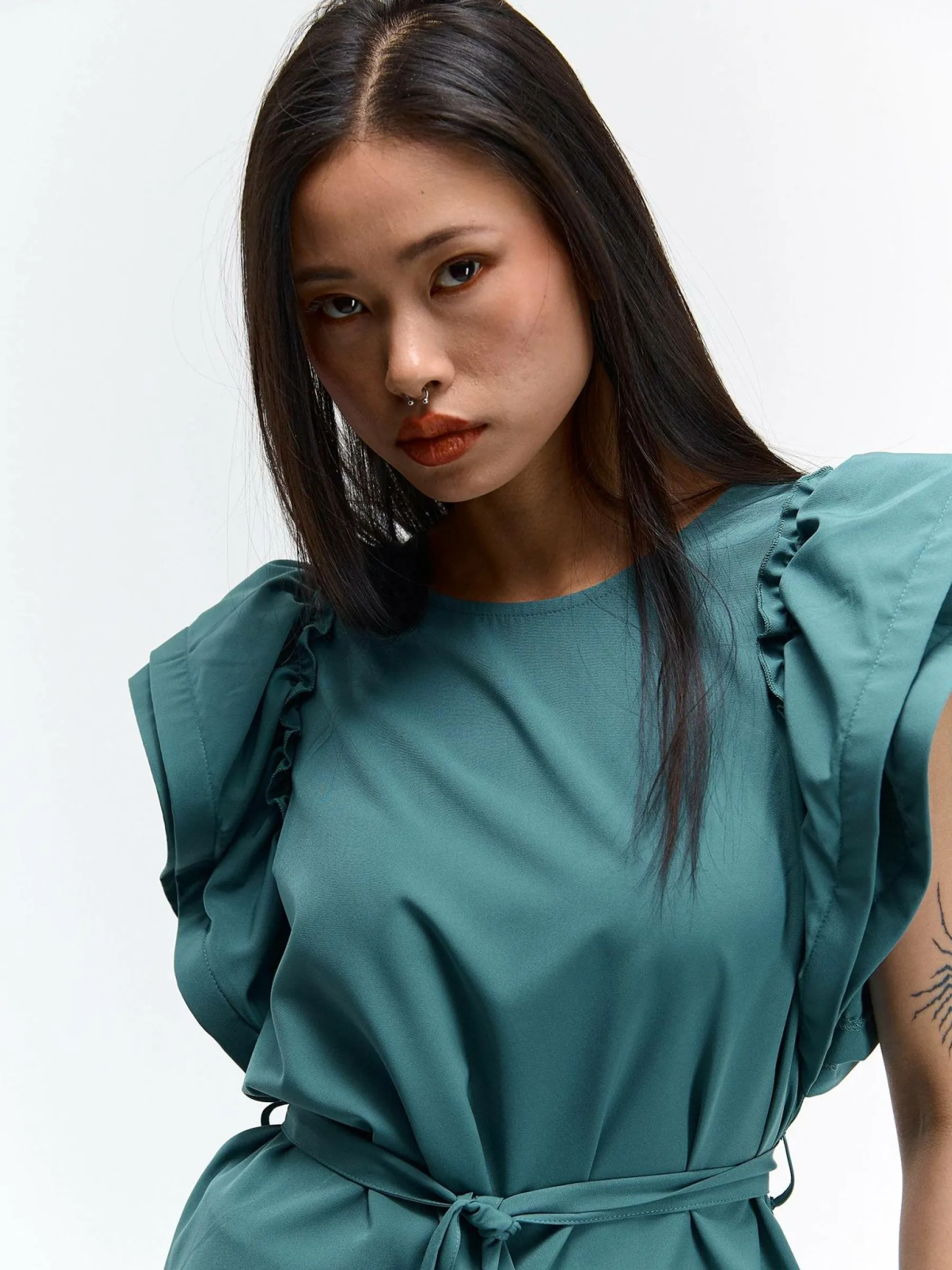Kolor: zielonyKrój: z falbanąTyp: topRekaw: krótki rękawDługość: krótkiPattern style: pojedynczy kolorDetal: nad…