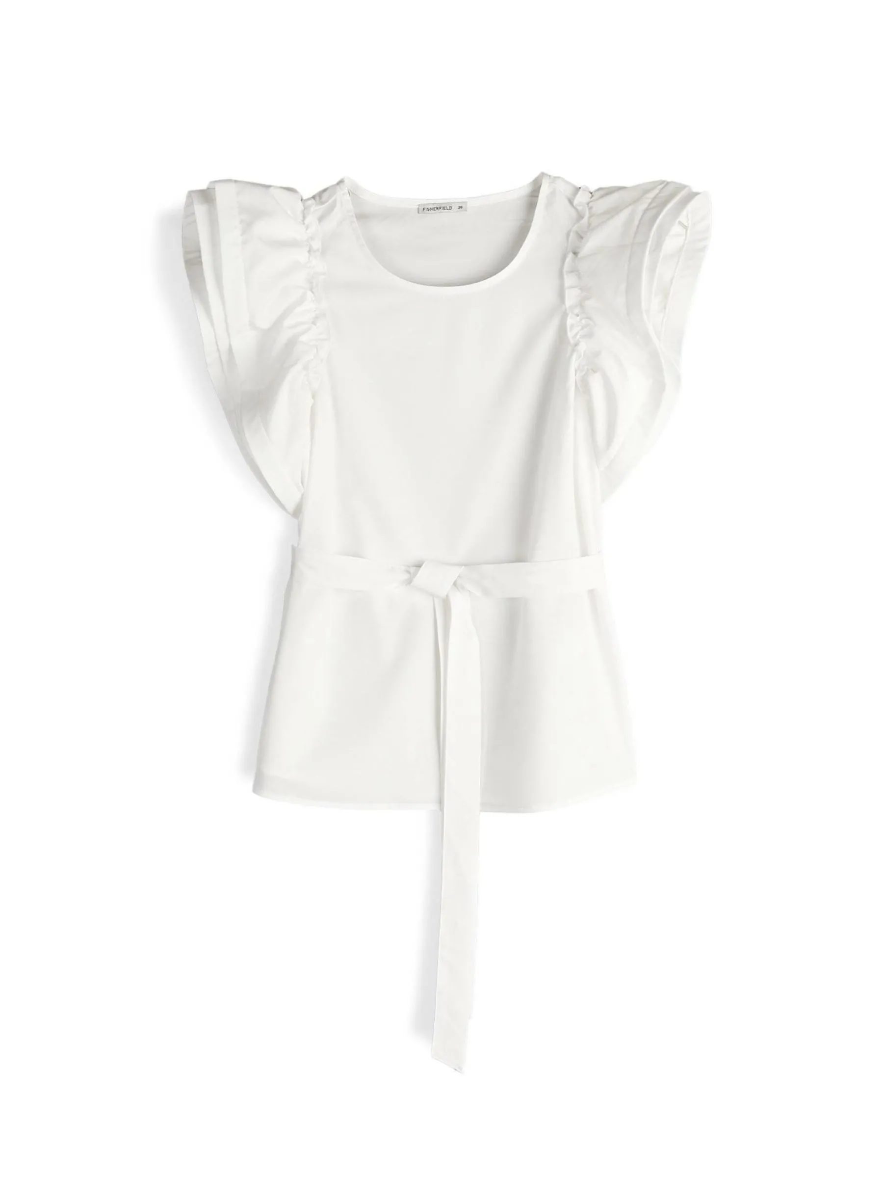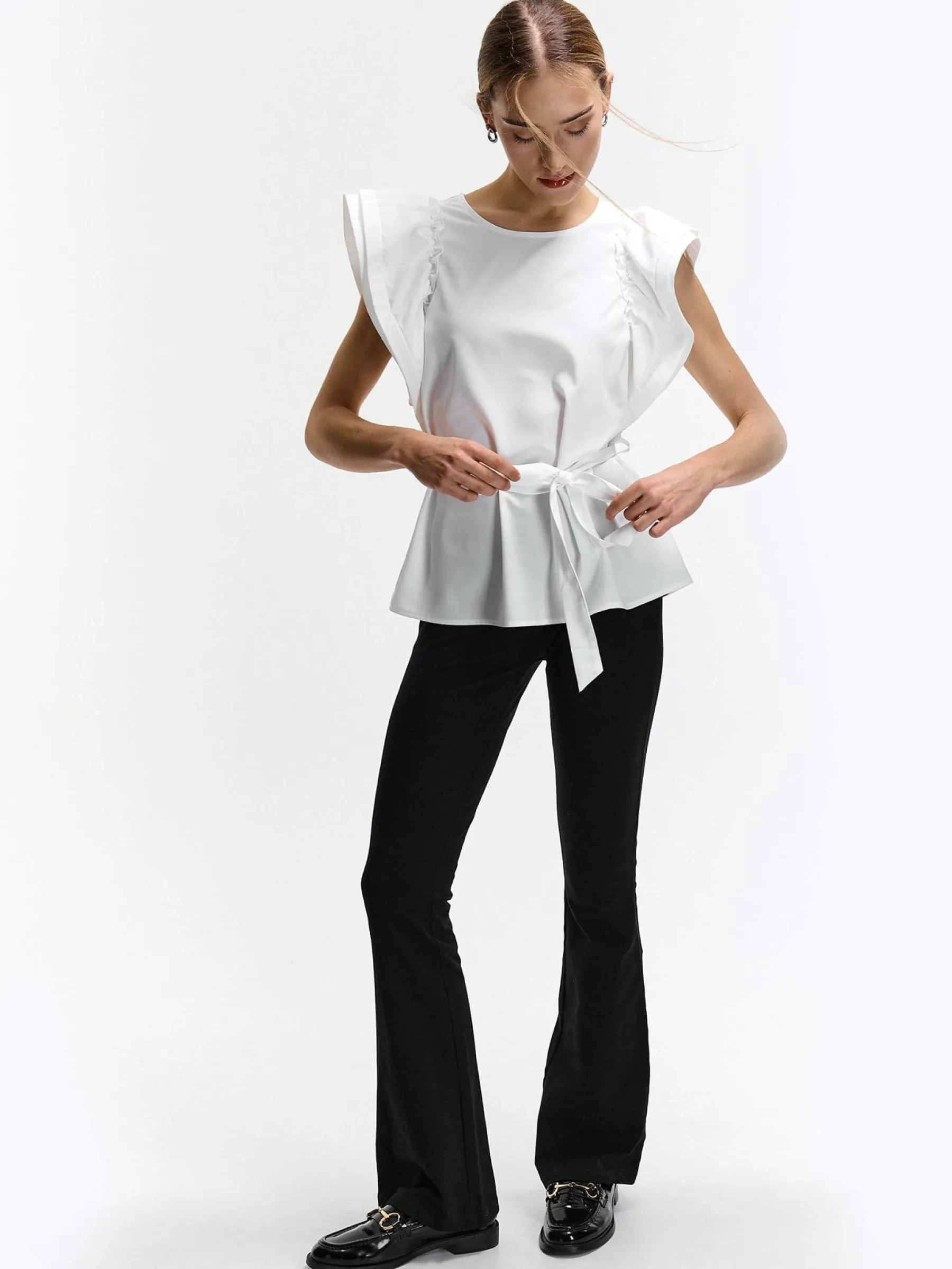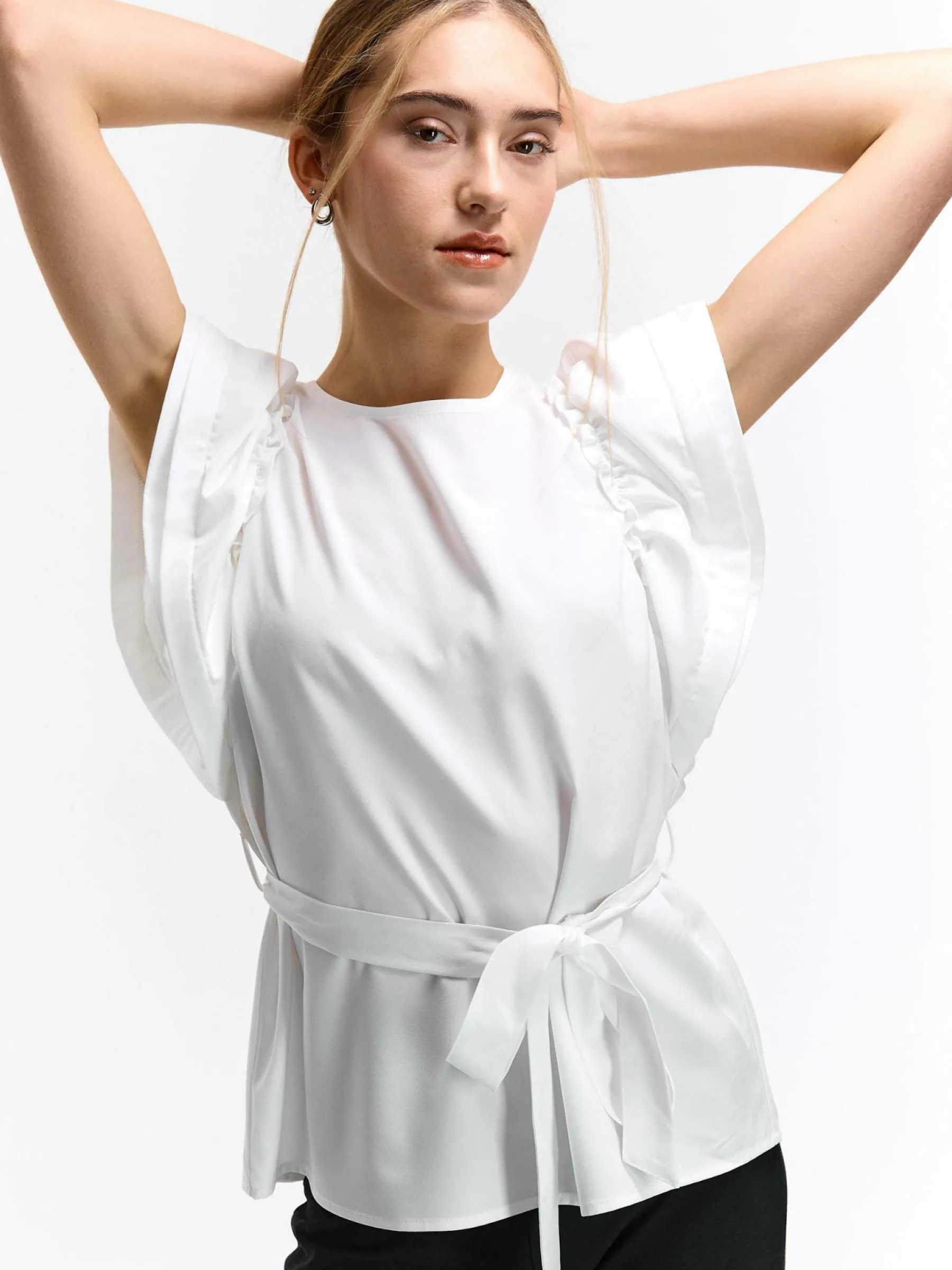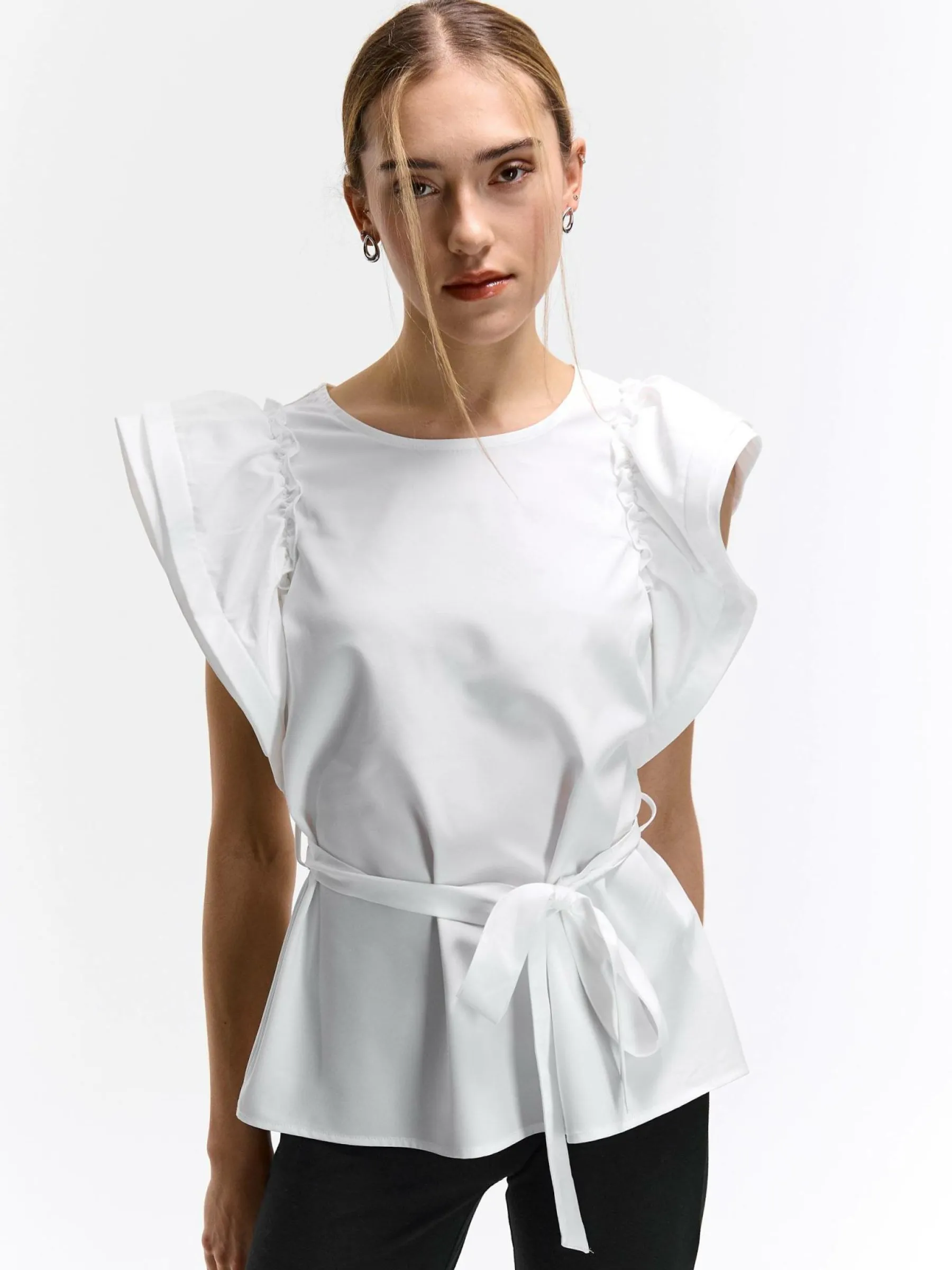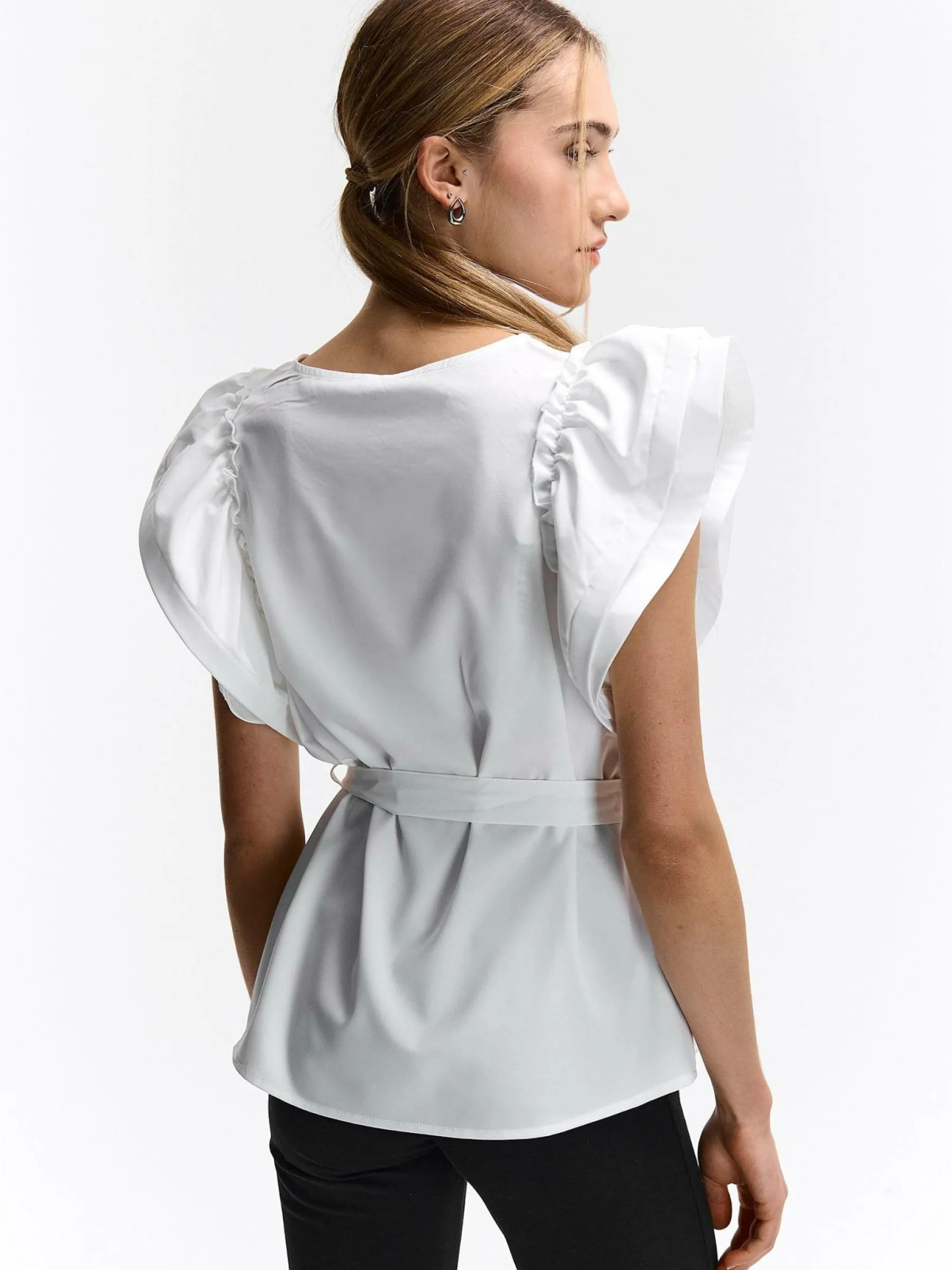 Kolor: białyKrój: z falbanąTyp: topRekaw: krótki rękawDługość: krótkiPattern style: pojedynczy kolorDetal: z pa…